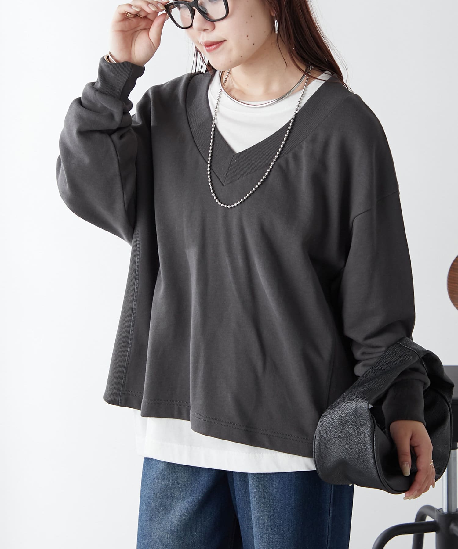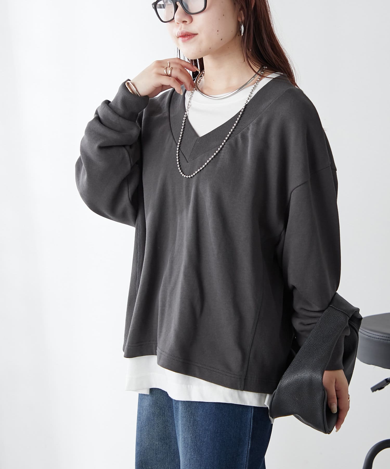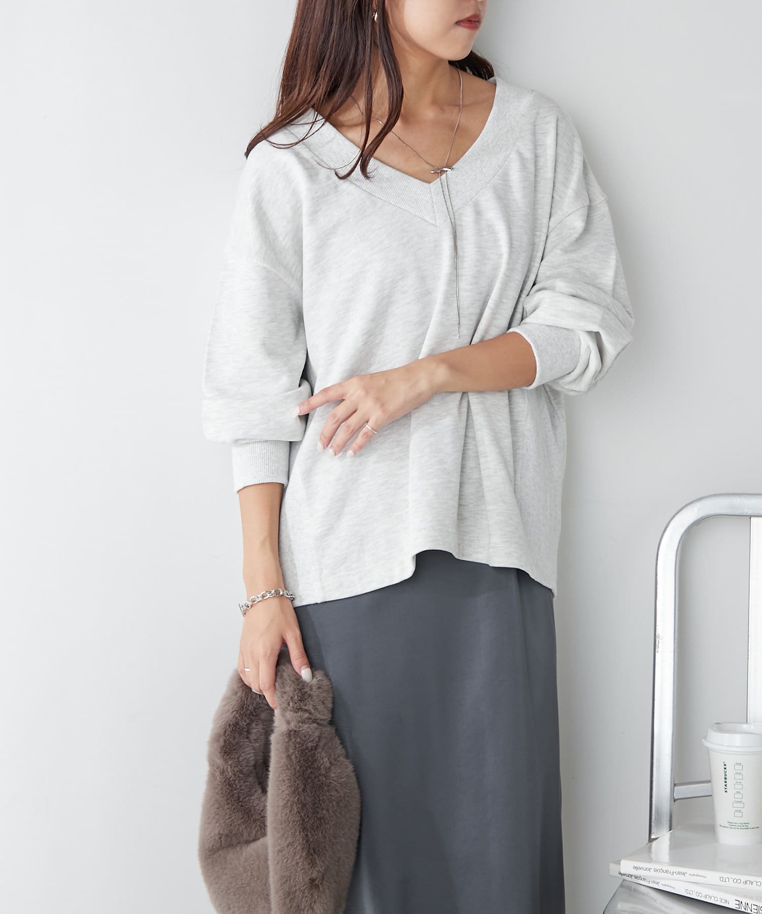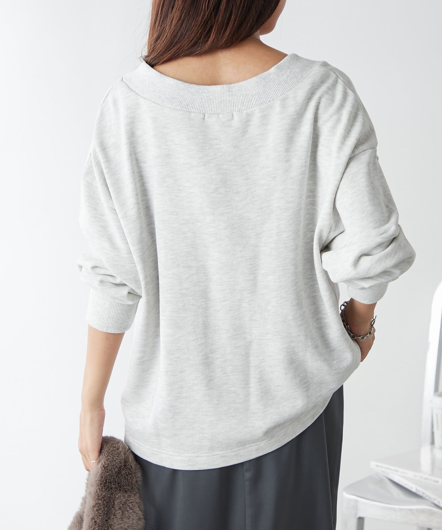 ・Vネックデザインが首周りをすっきりとした印象に見せてくれるプルオーバー