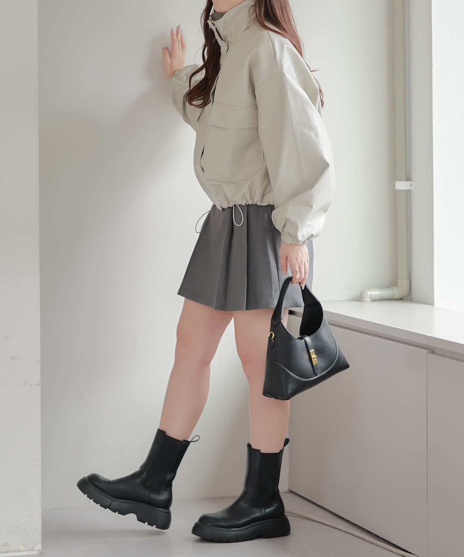 ・衿を立てて着るとハイネックのようなシルエットも楽しめます。