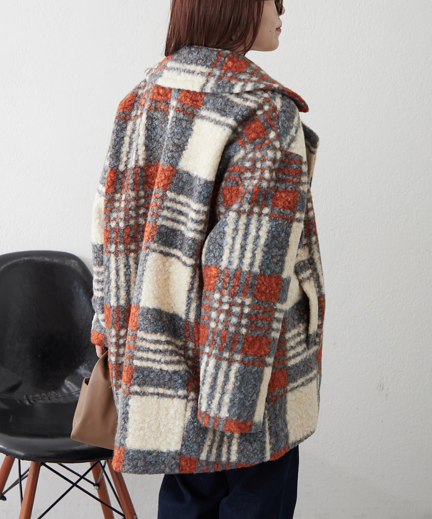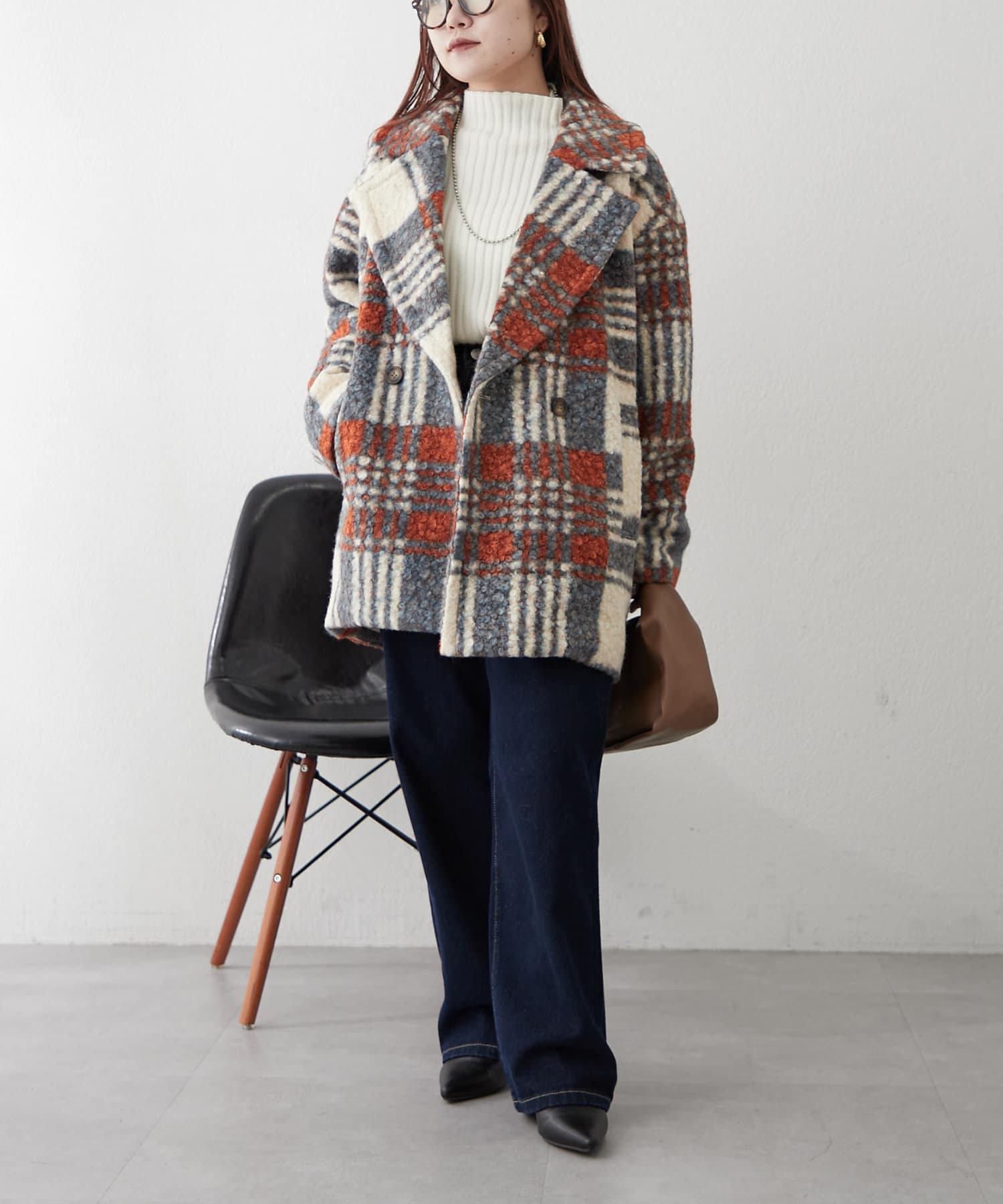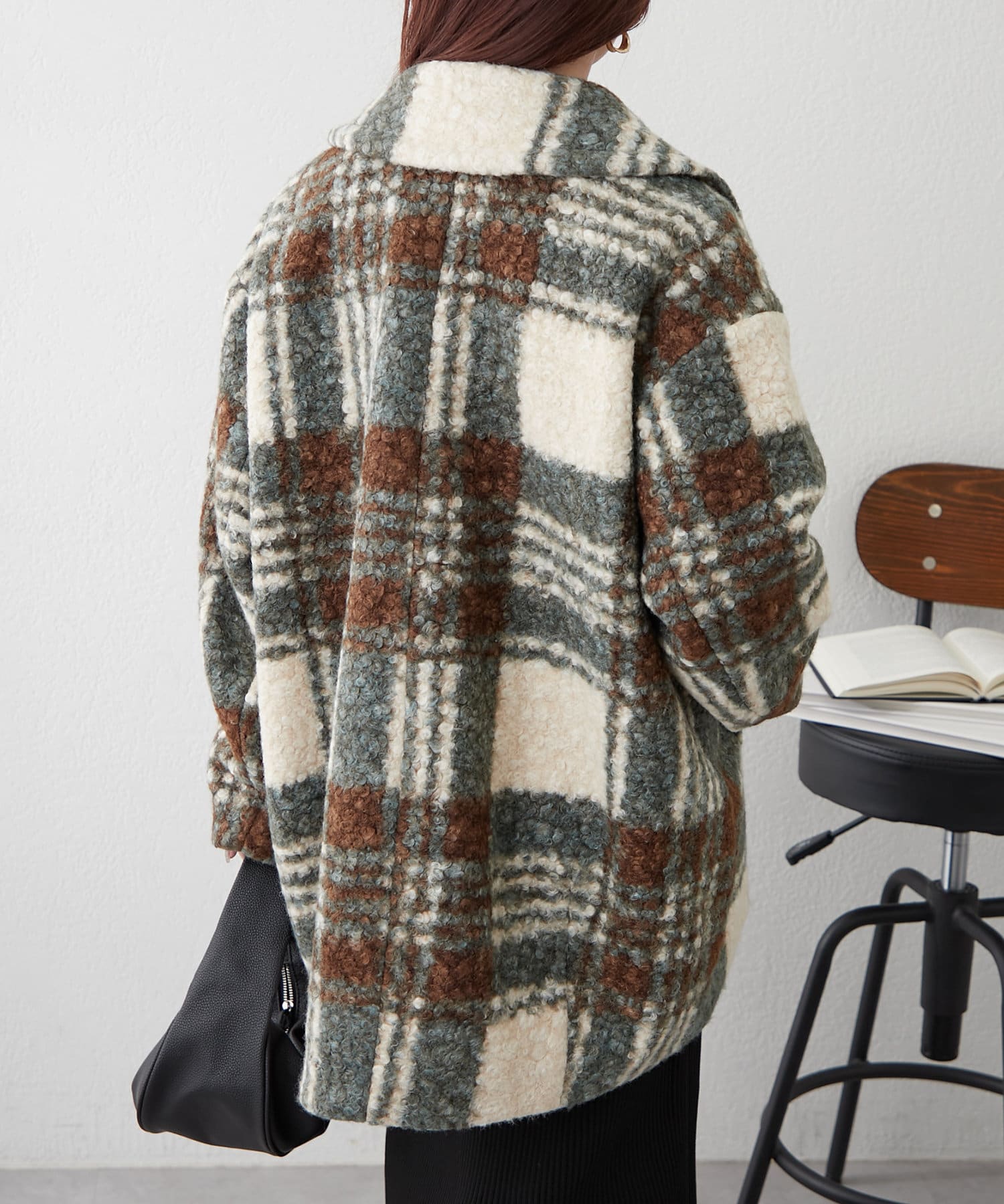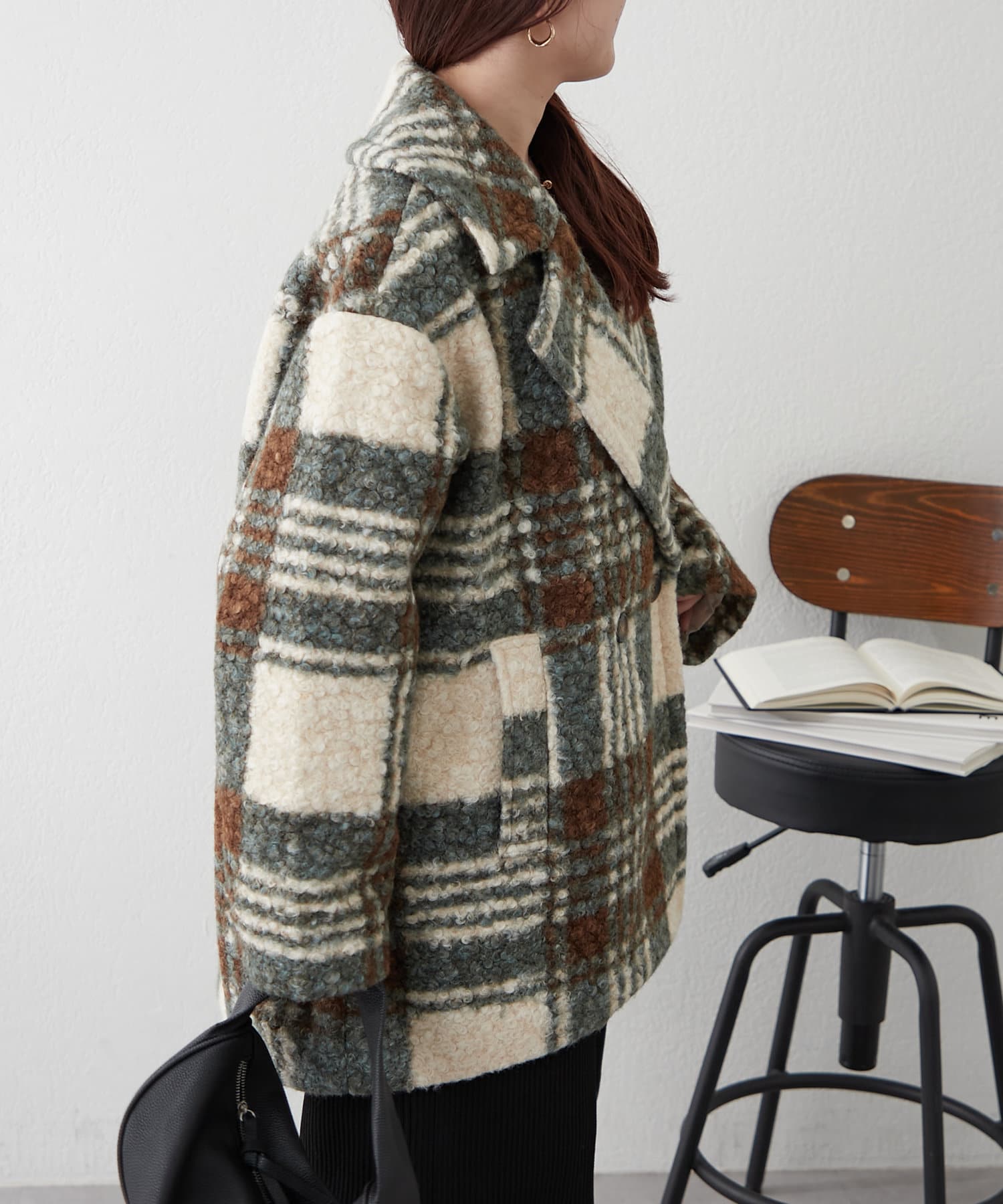 ・ブークレ生地と大きめなチェック柄がコーデの主役になるジャケット。