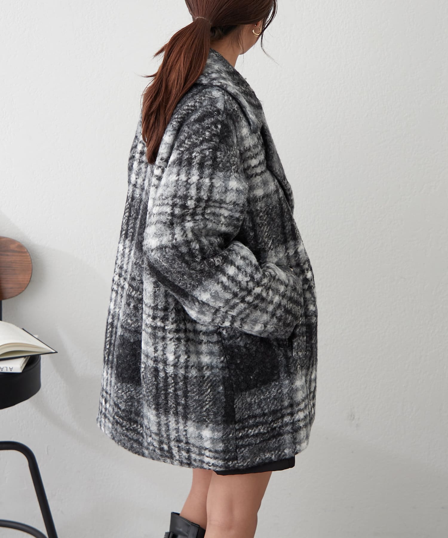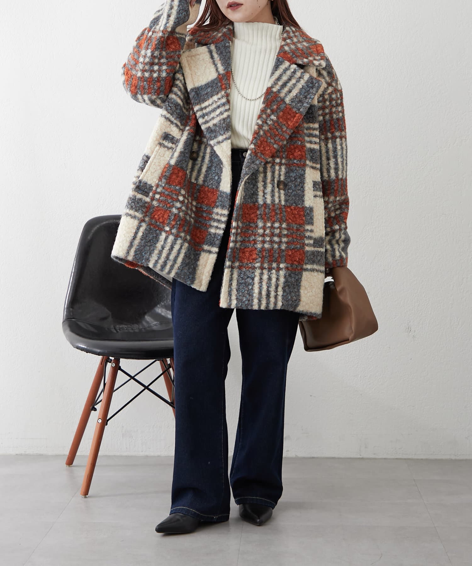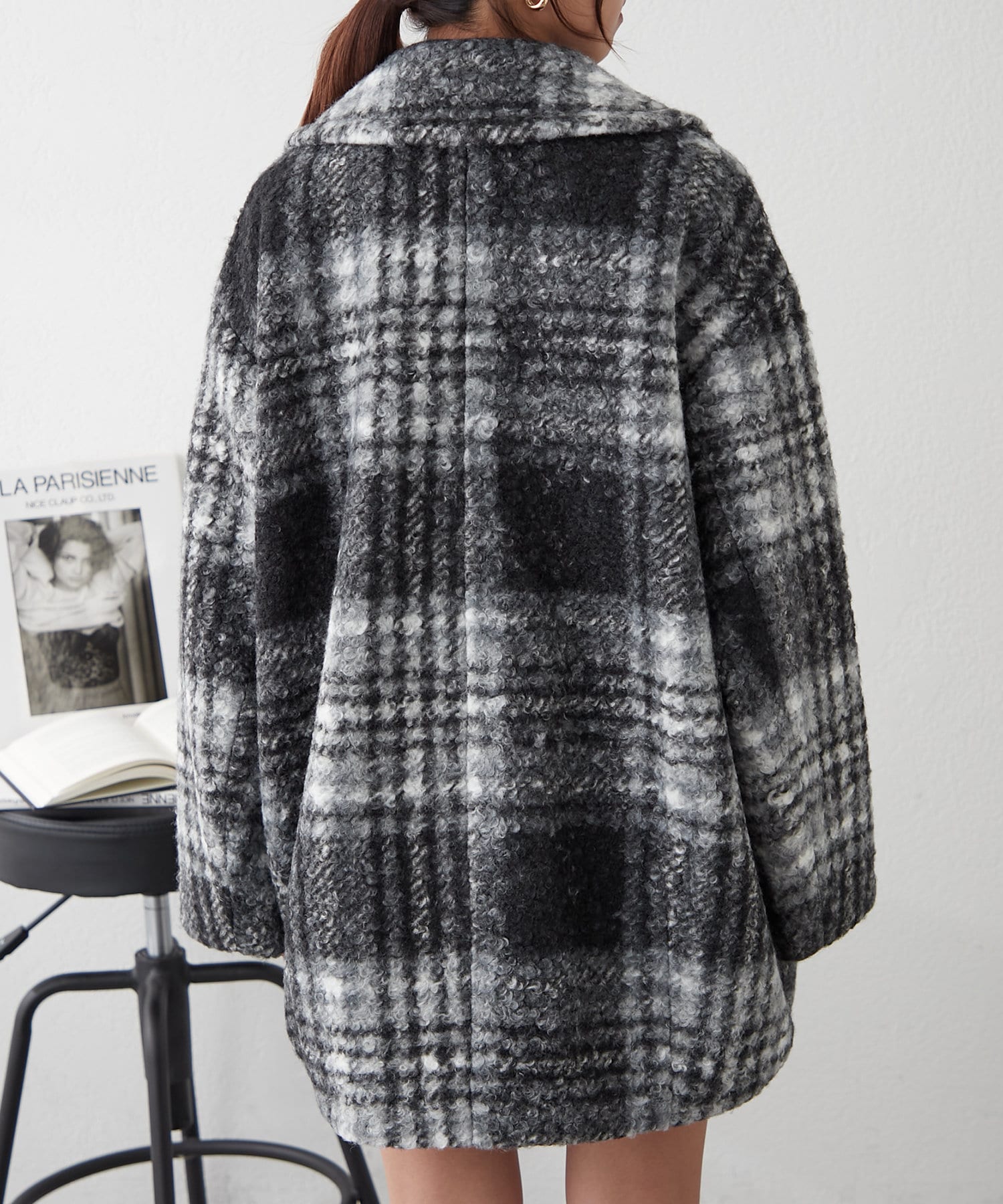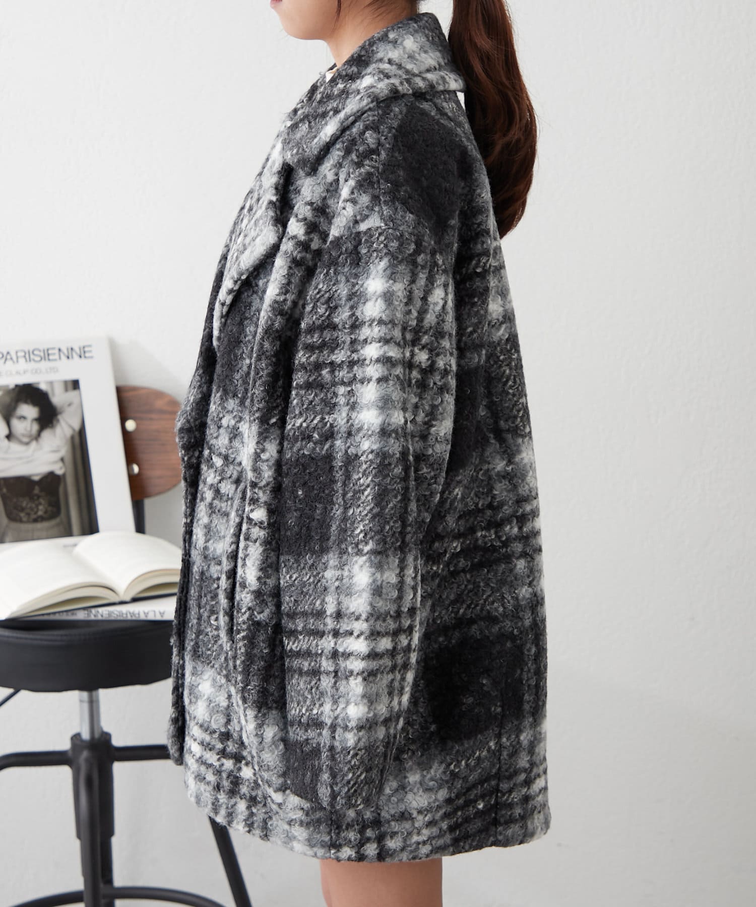 ・ブークレ生地と大きめなチェック柄がコーデの主役になるジャケット。