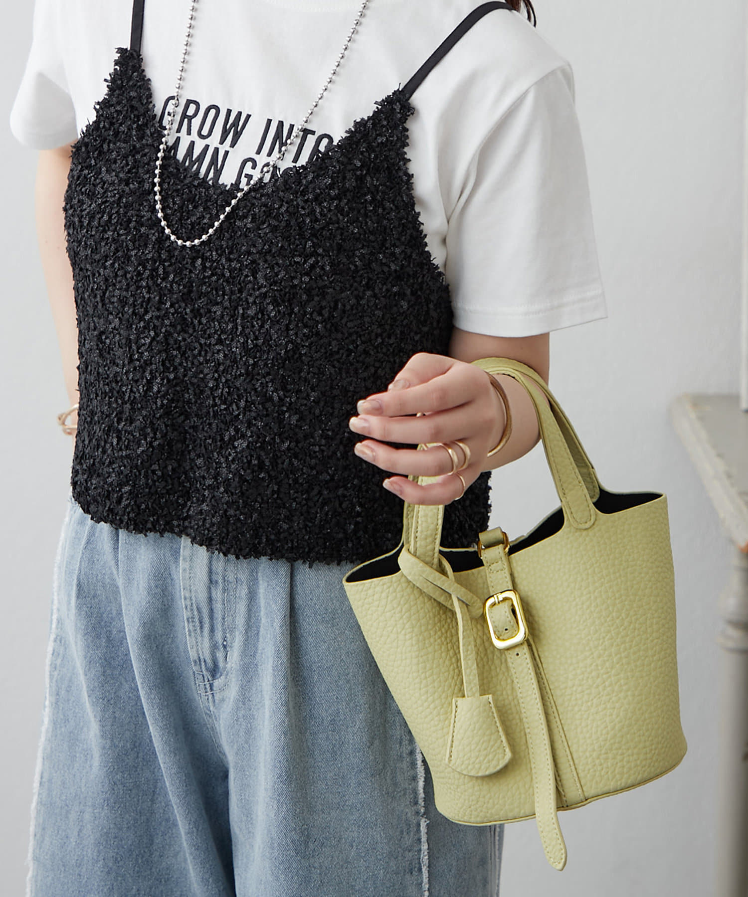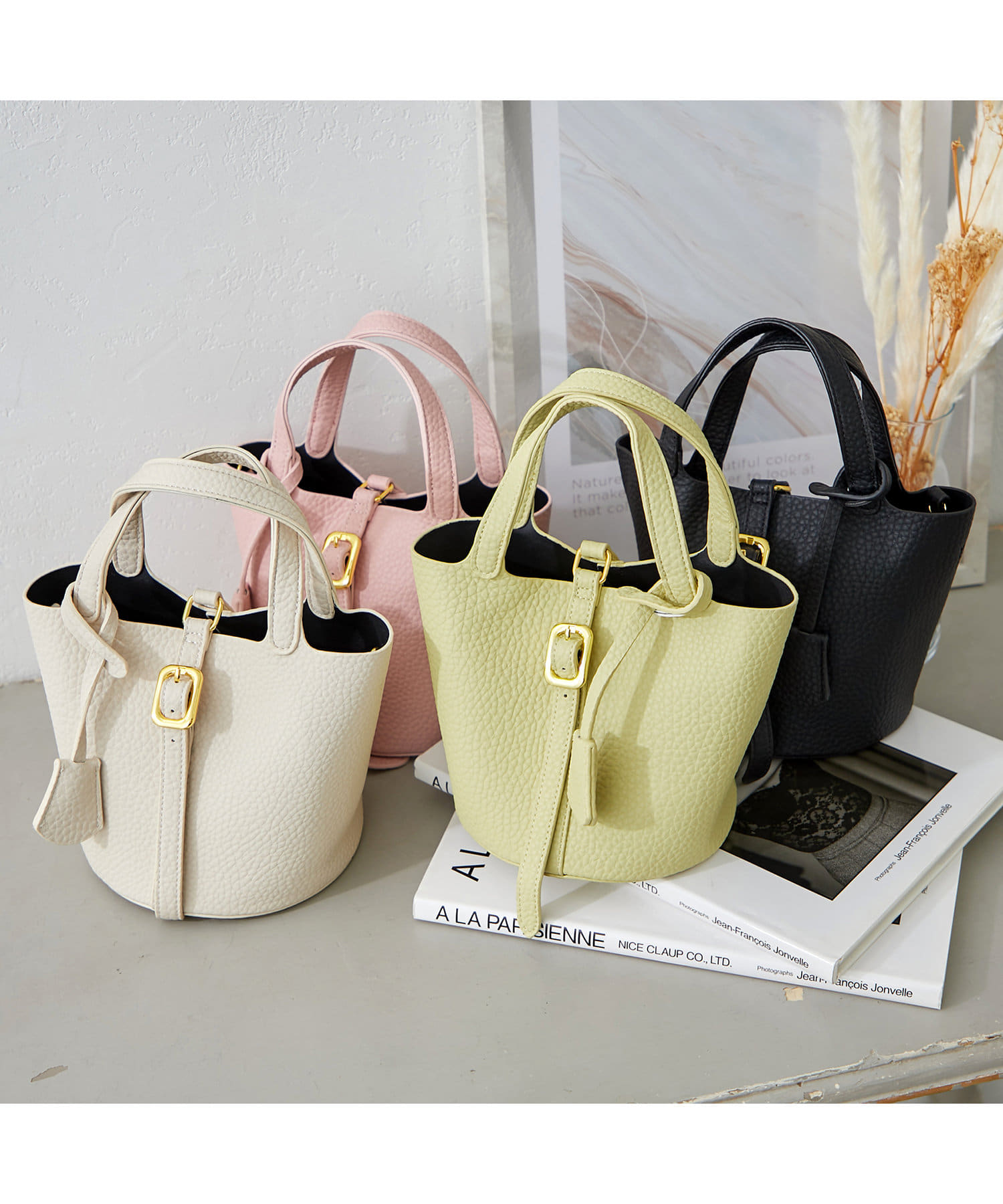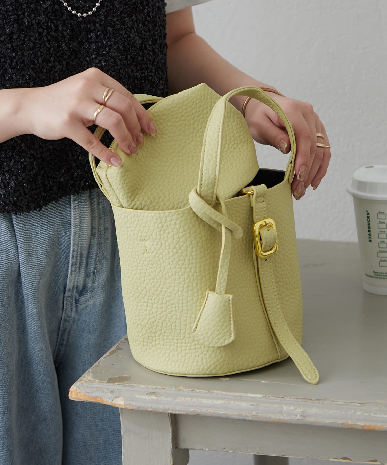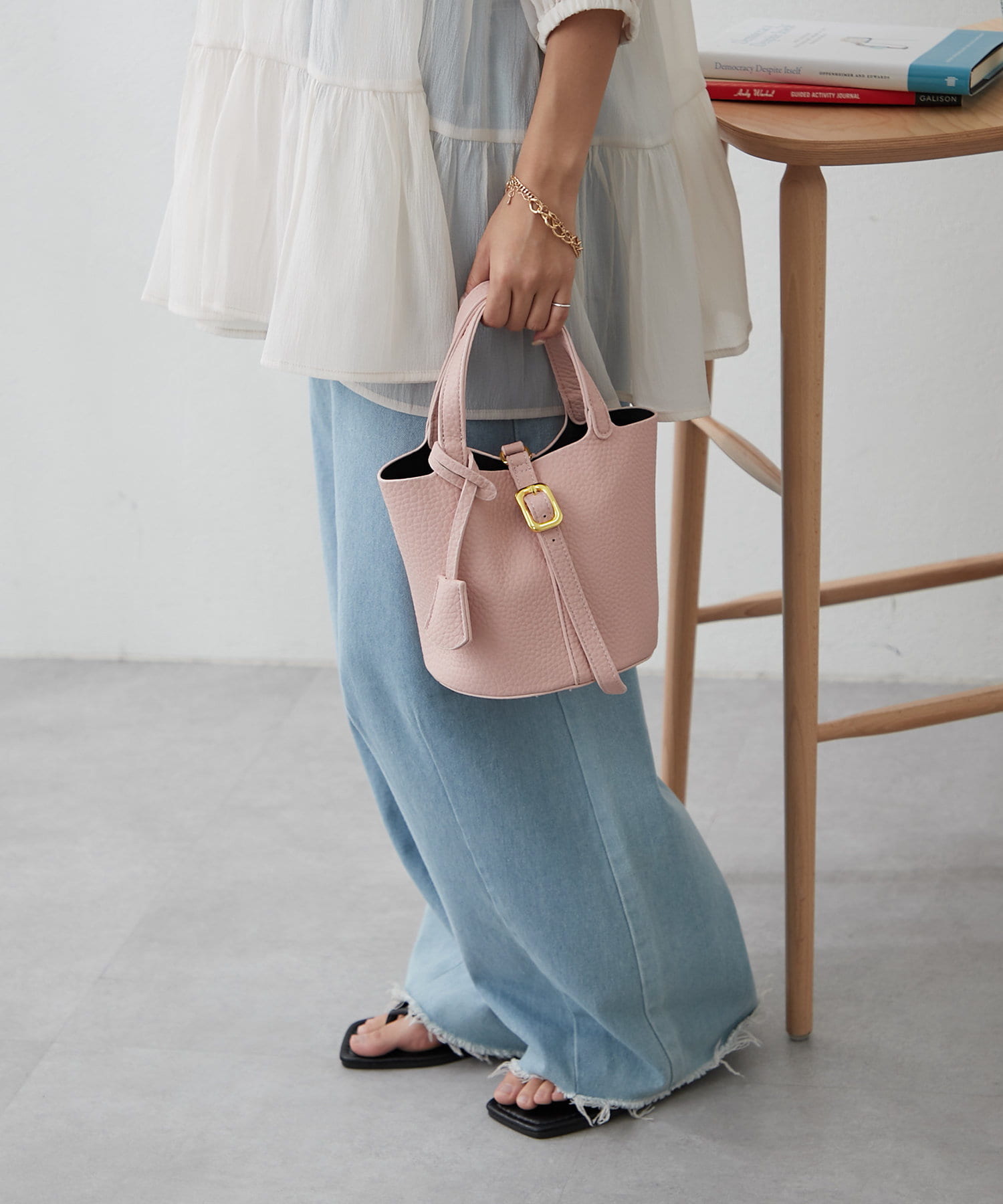 ・収納力の高いマチが広さと、中身も見やすいバケツ型バッグ