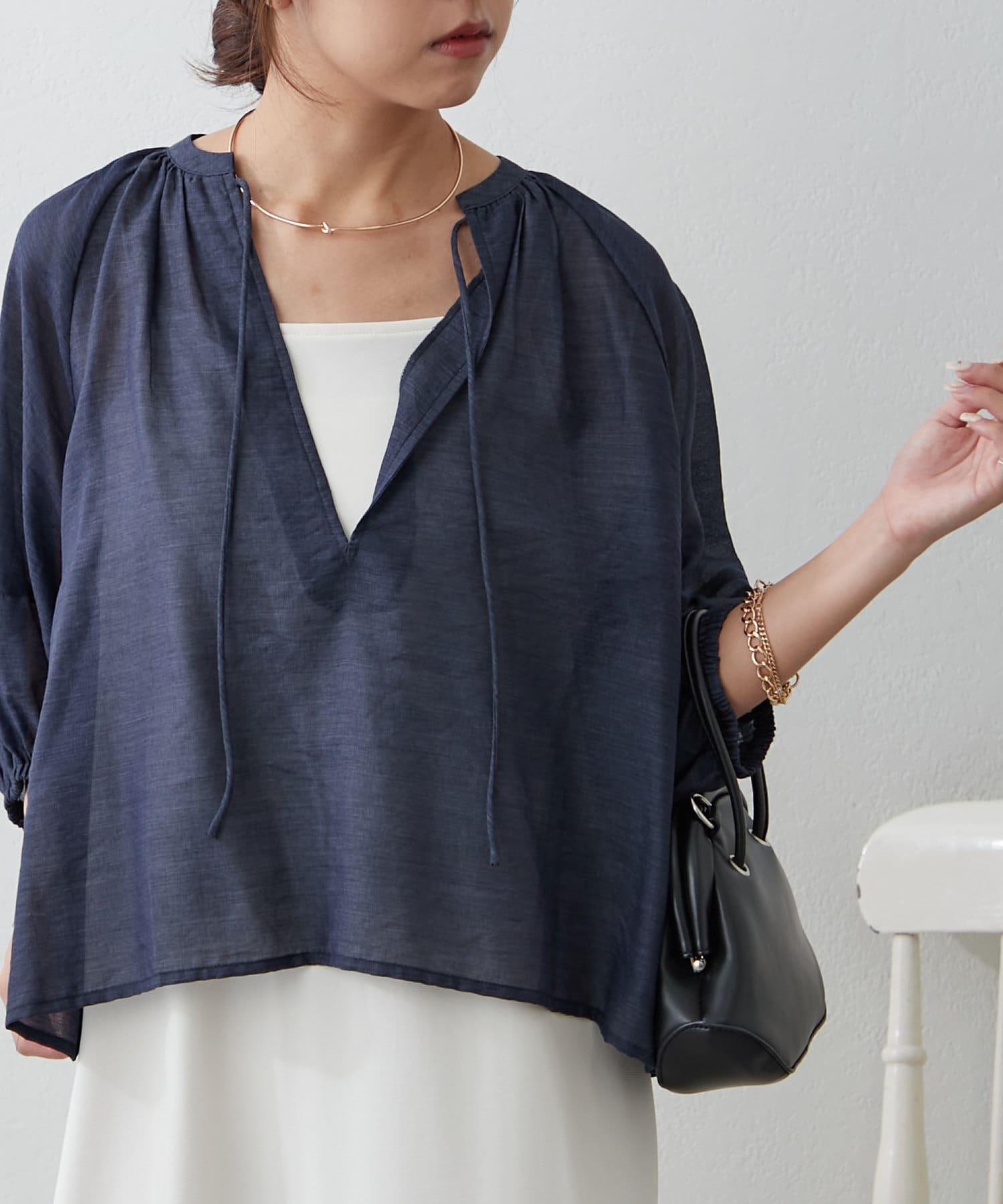 ・フロント部分も深めのVネックで顔周りがすっきり見えるデザイン。