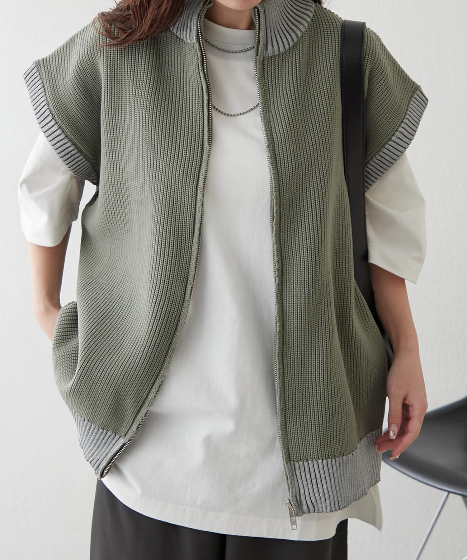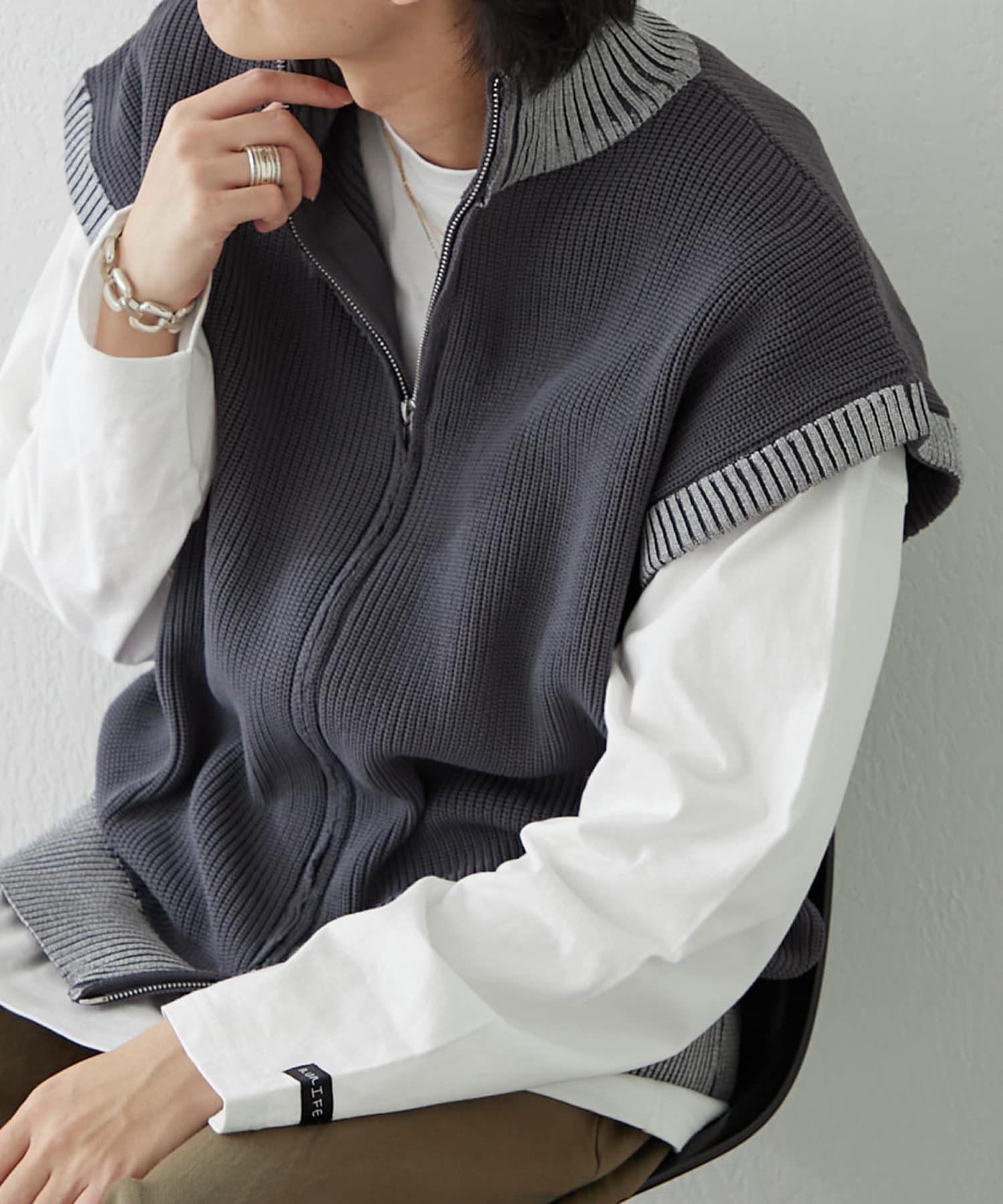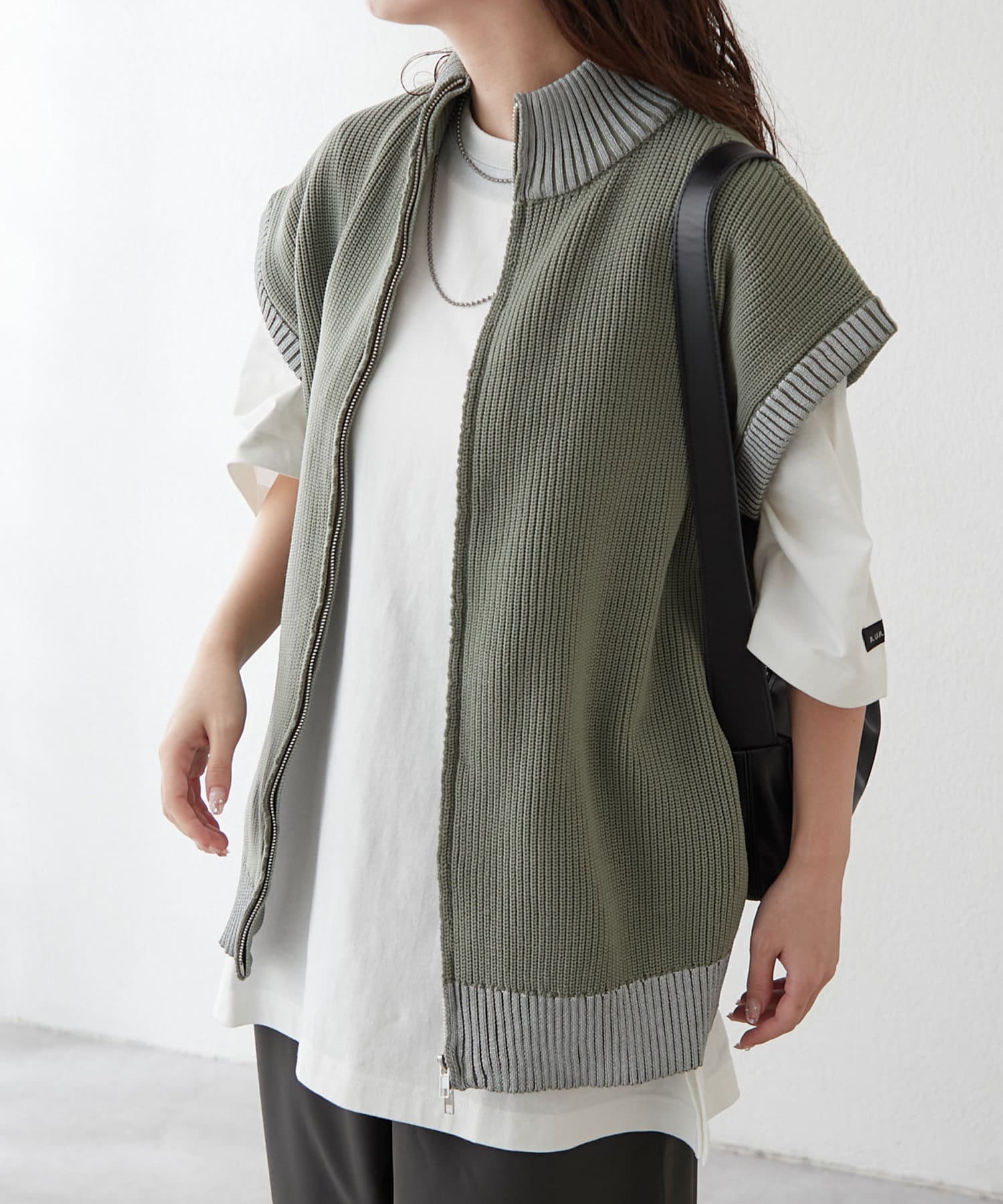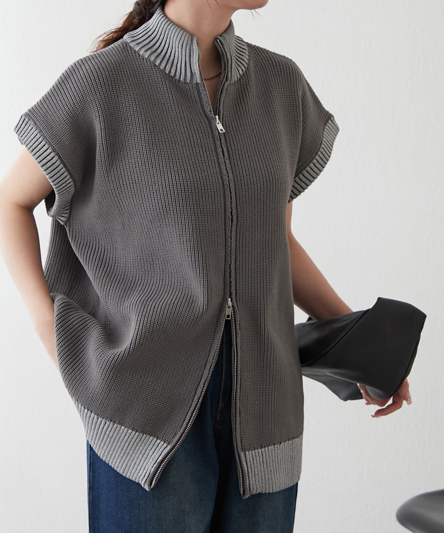 ・ゆとりのあるボクシーなシルエットでWジップで変化を付けられるニットベスト。