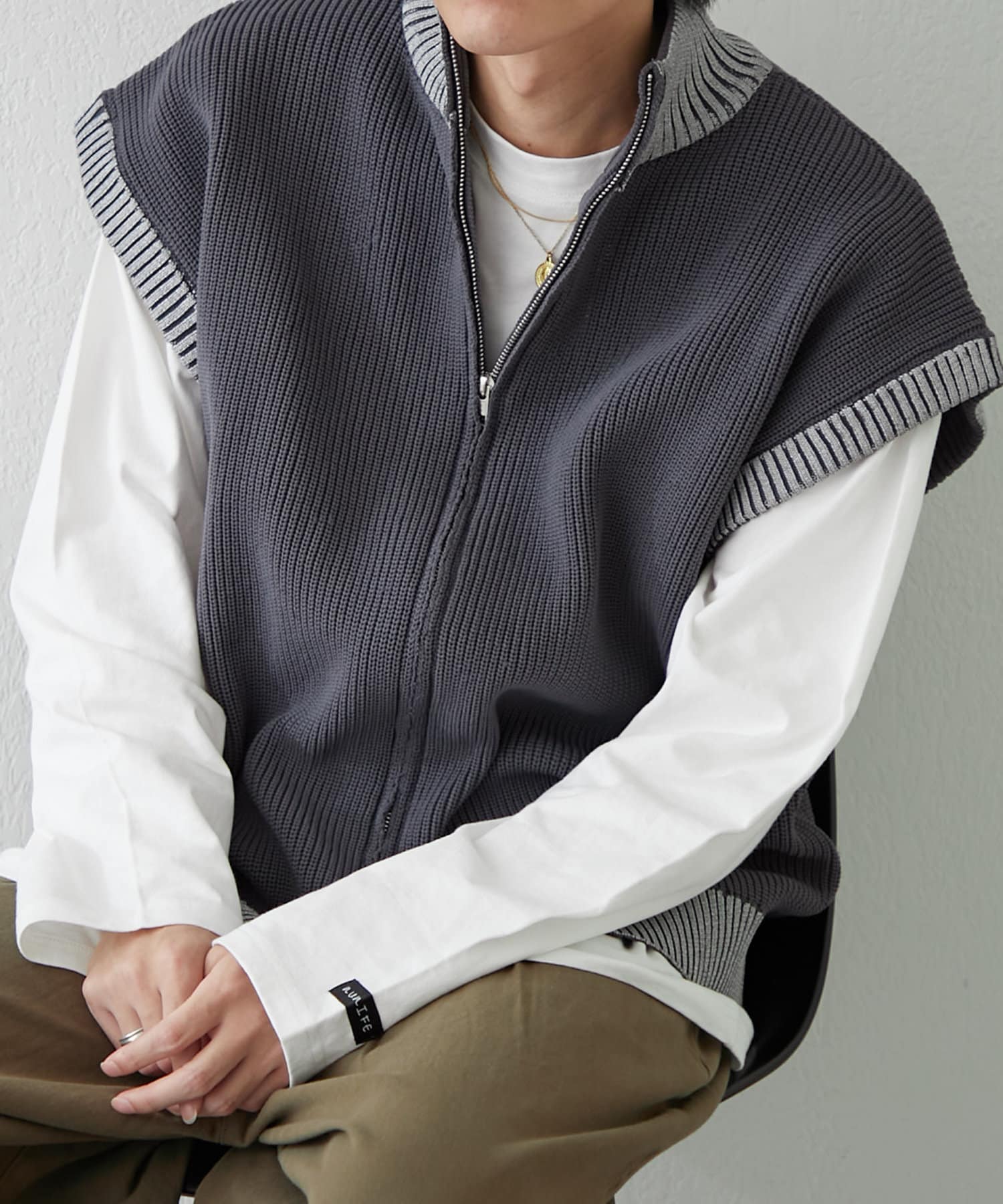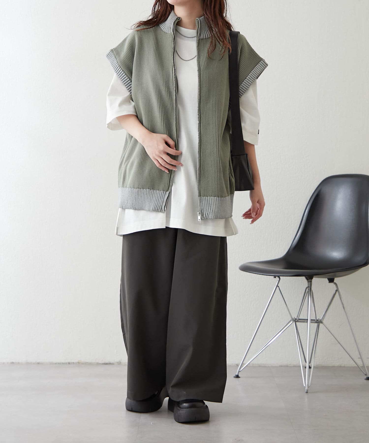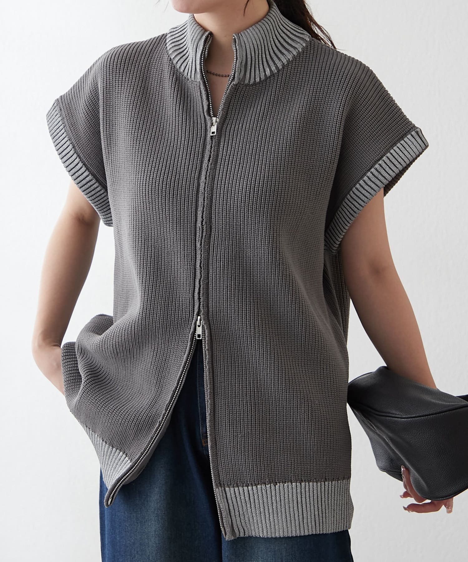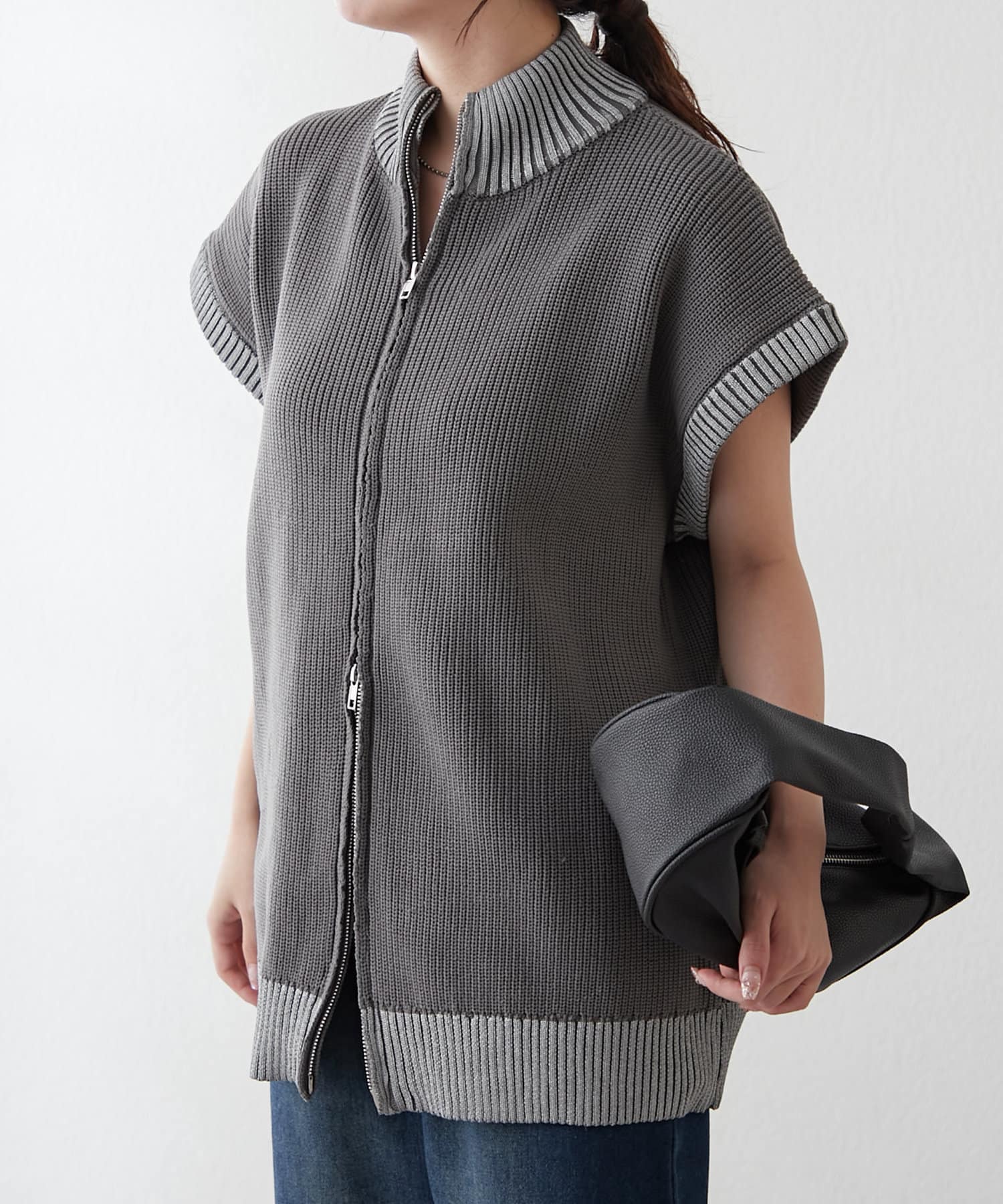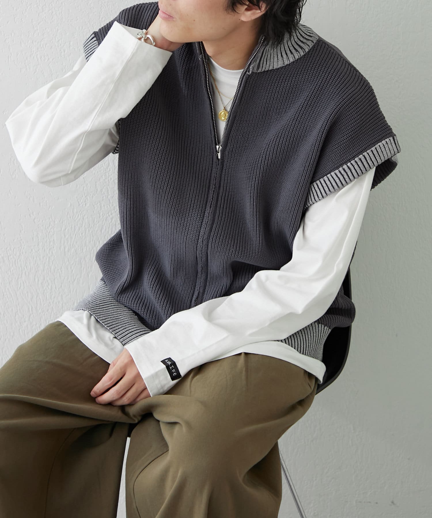 ・ゆとりのあるボクシーなシルエットでWジップで変化を付けられるニットベスト。