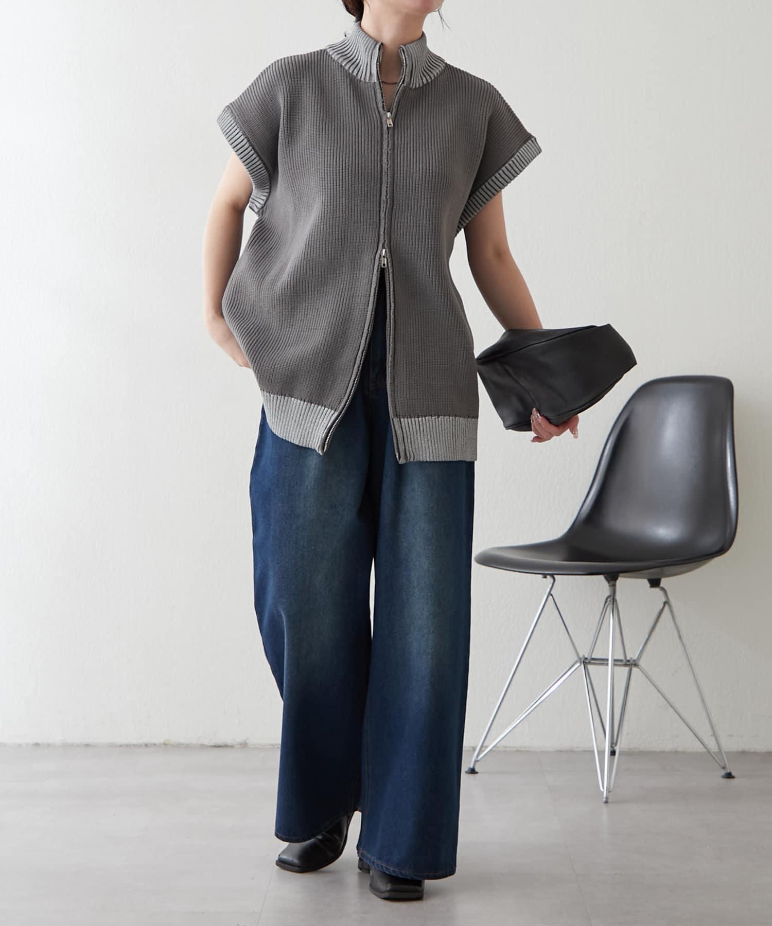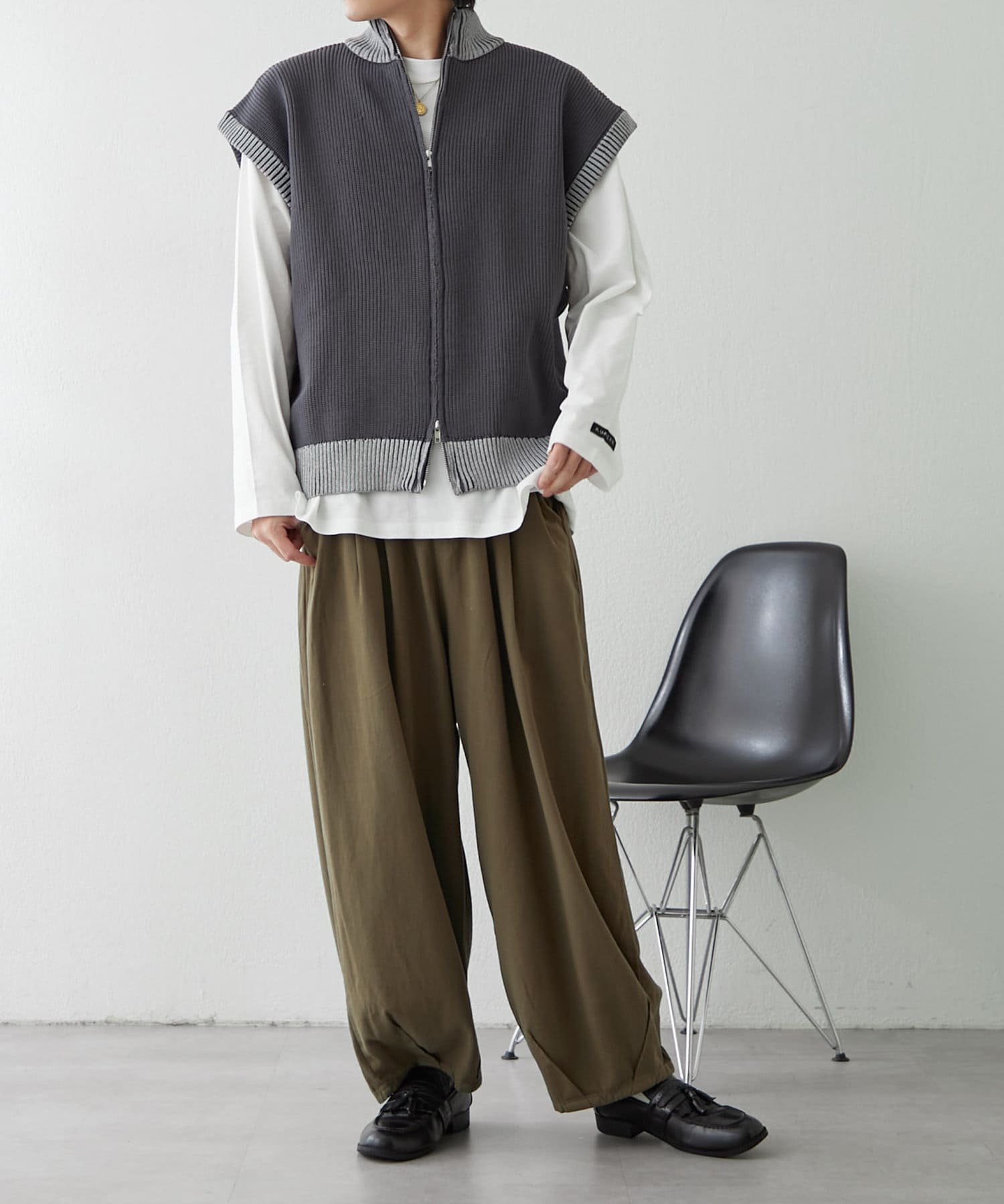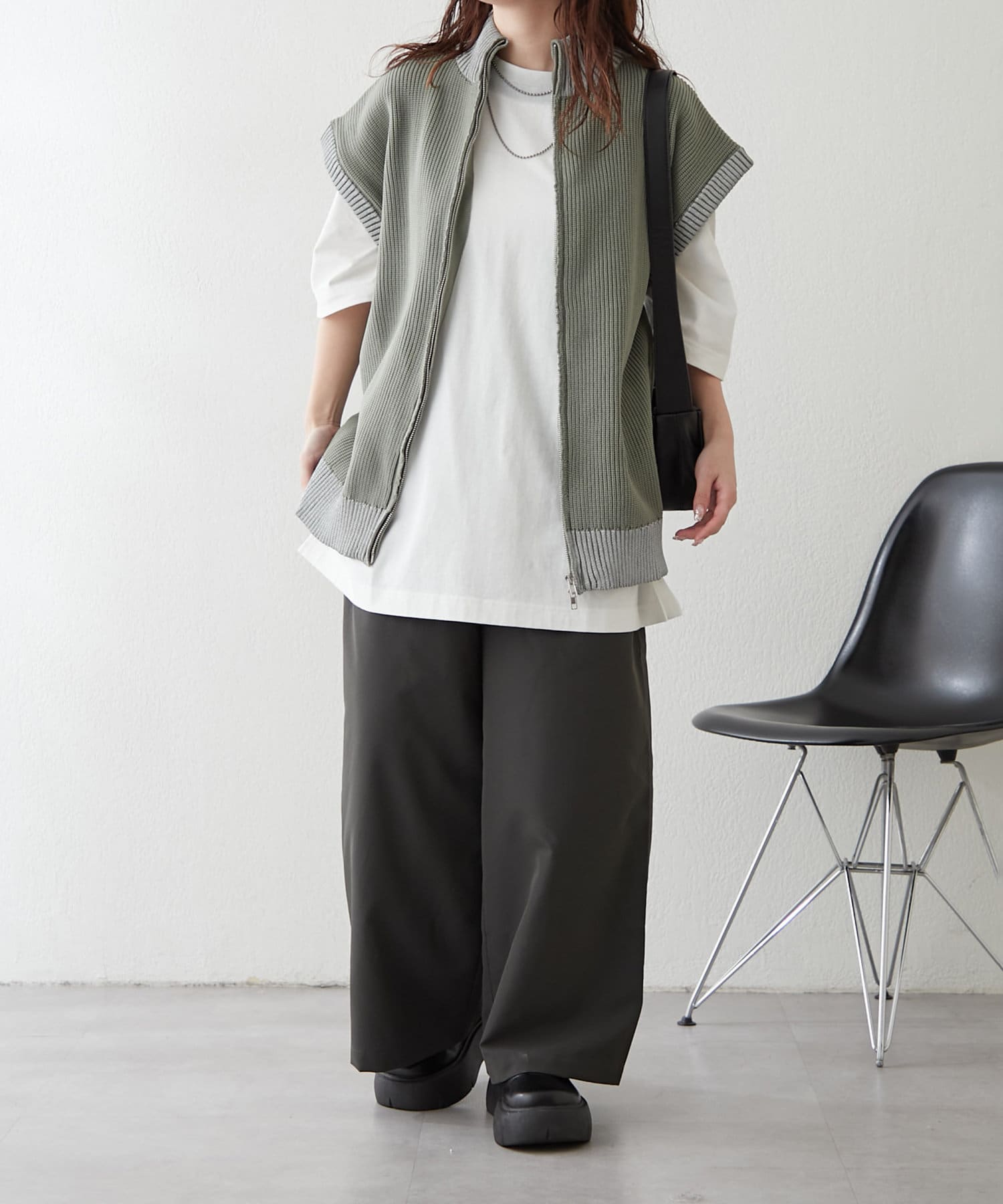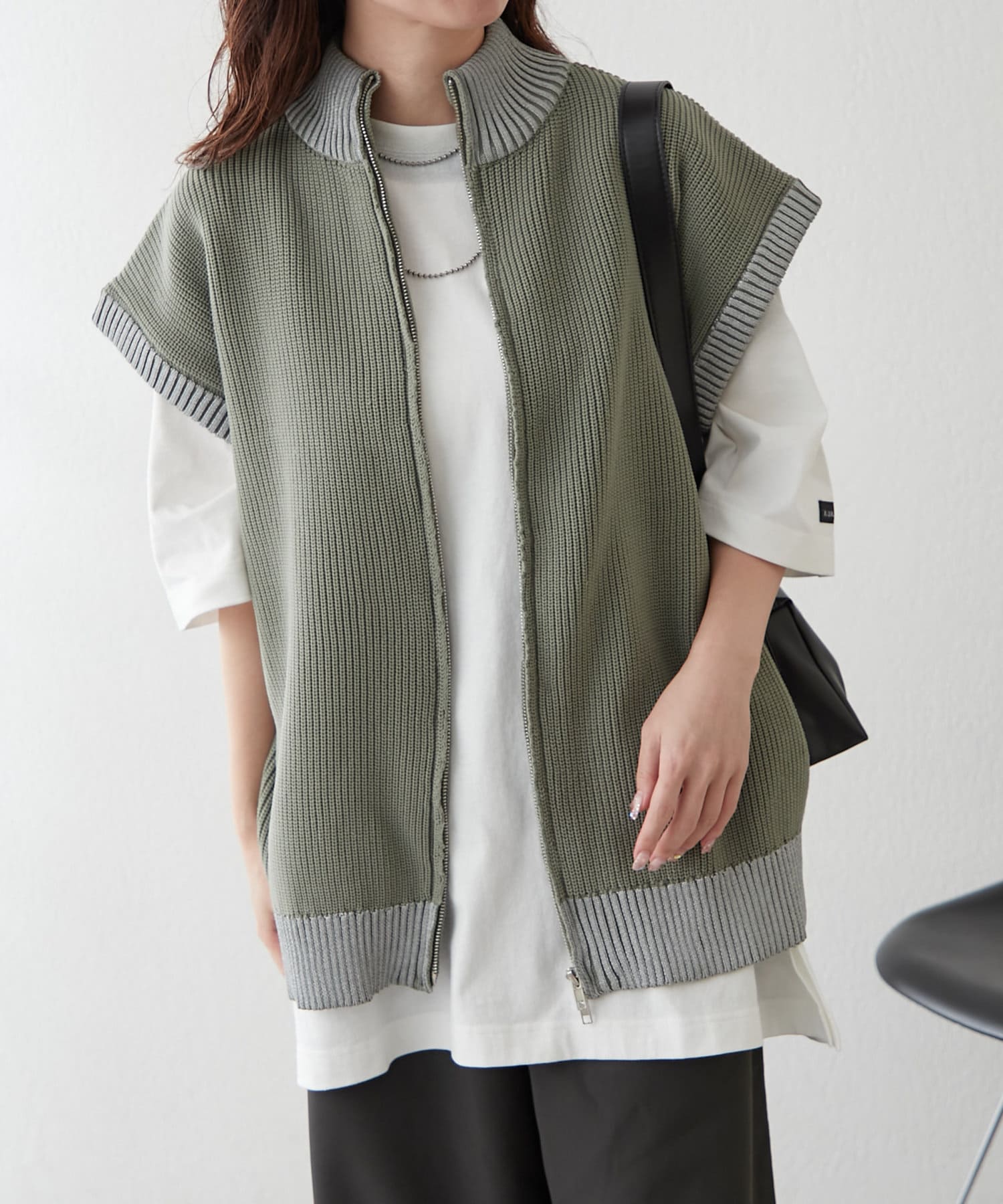 ・ゆとりのあるボクシーなシルエットでWジップで変化を付けられるニットベスト。