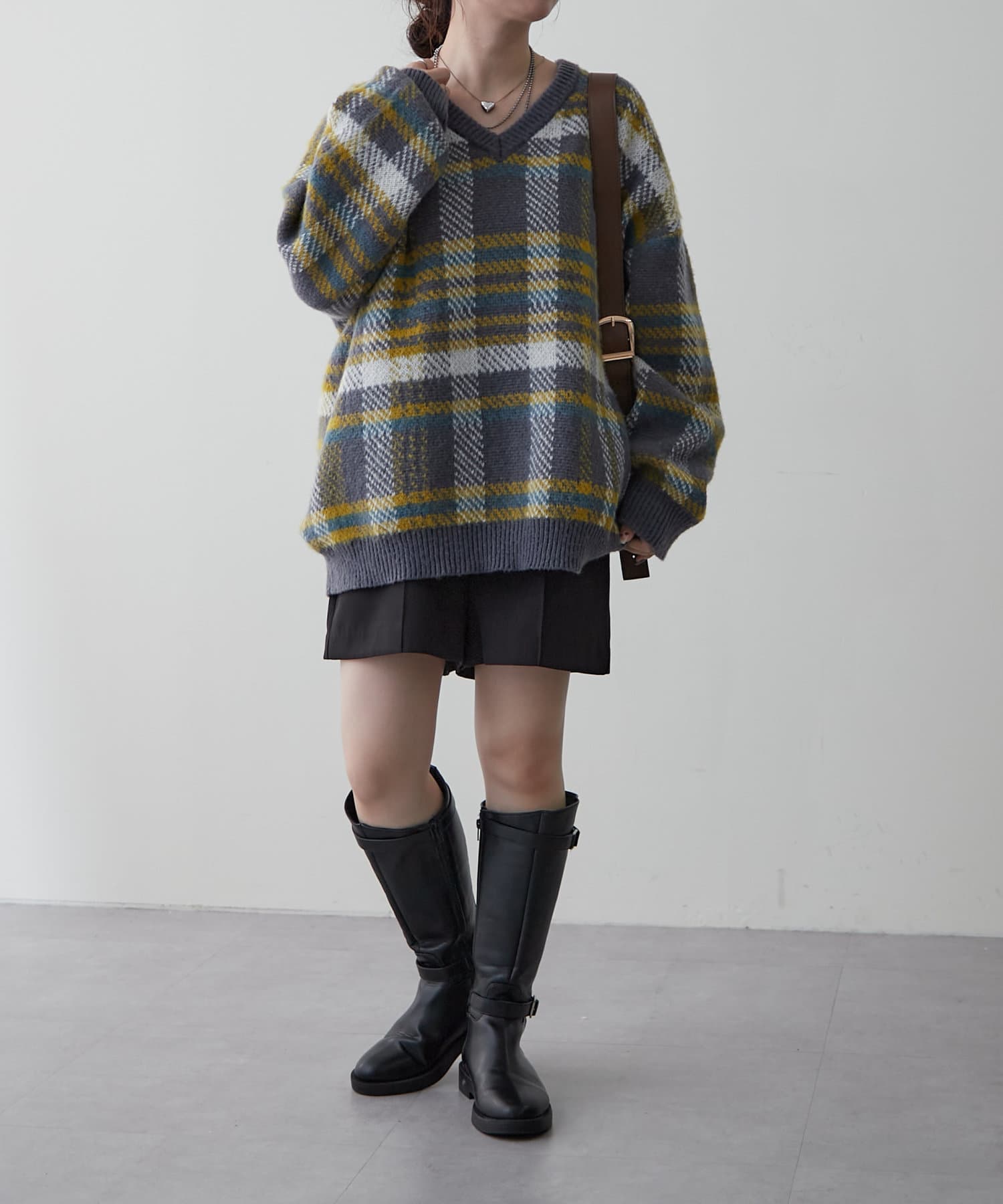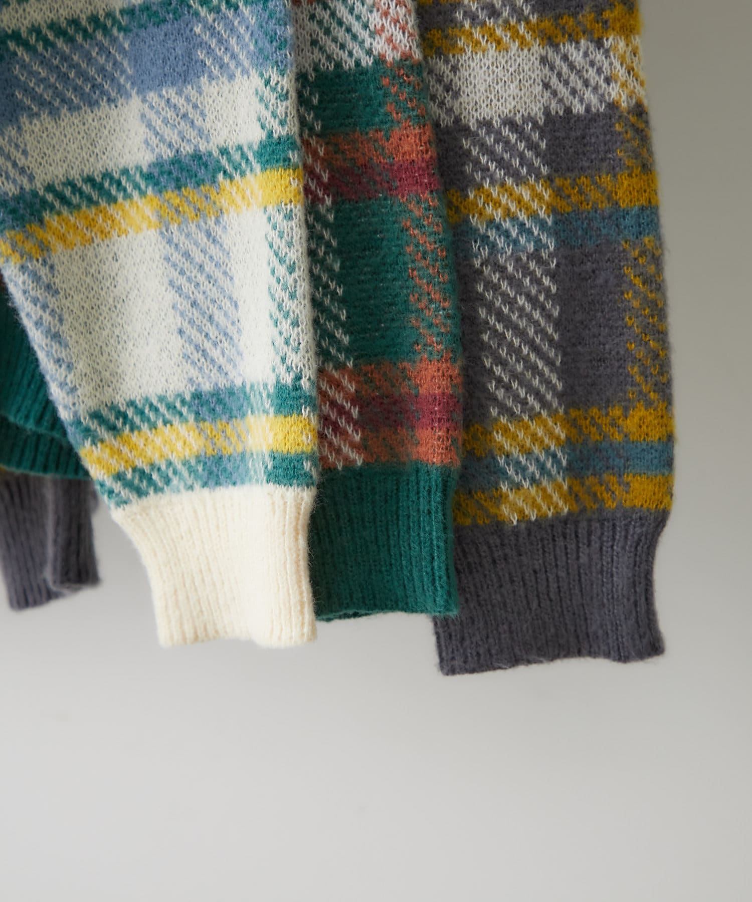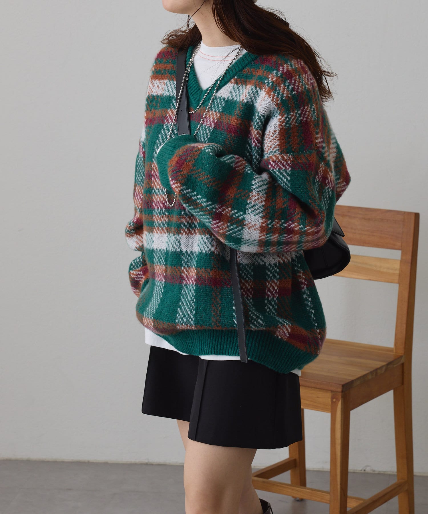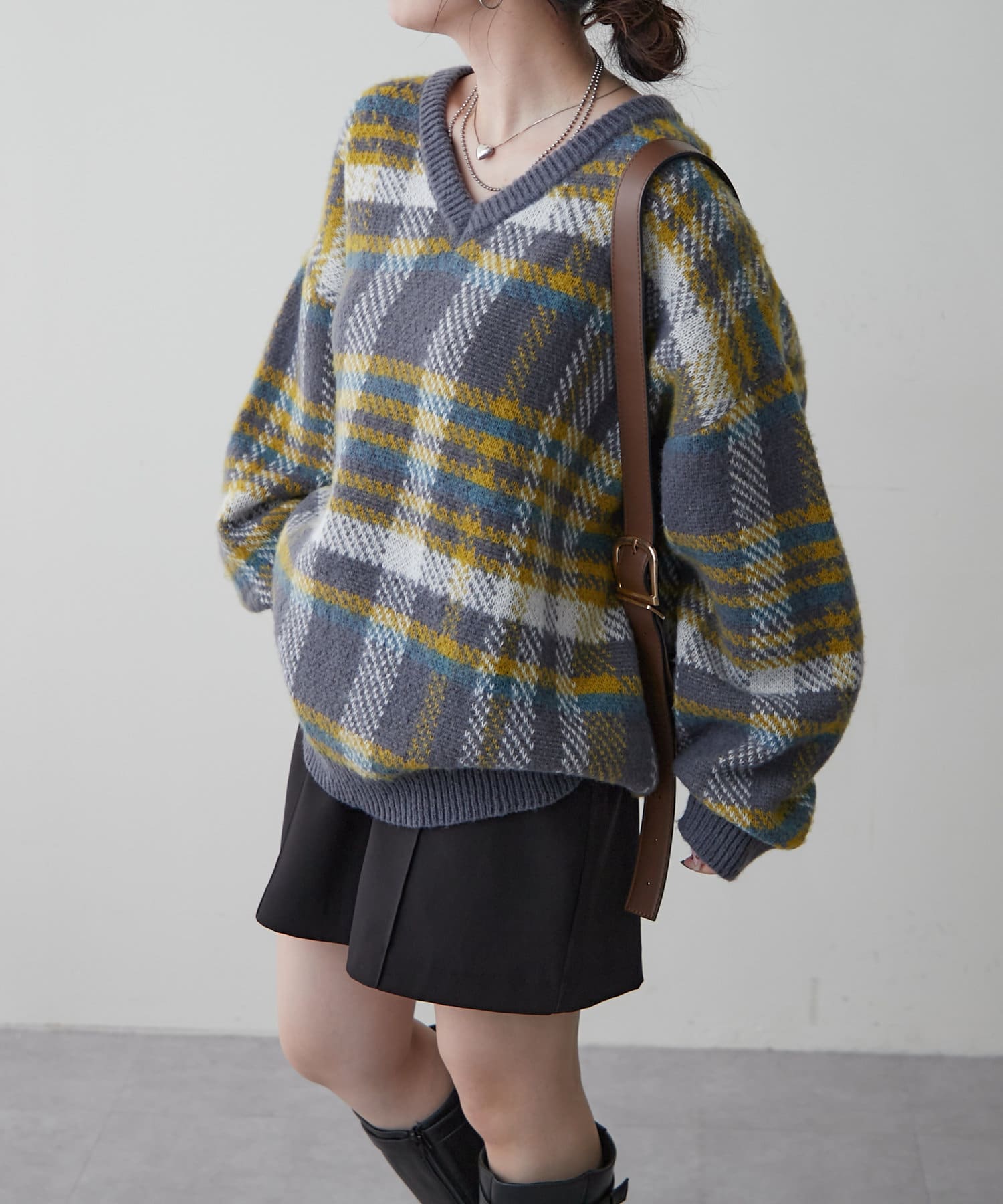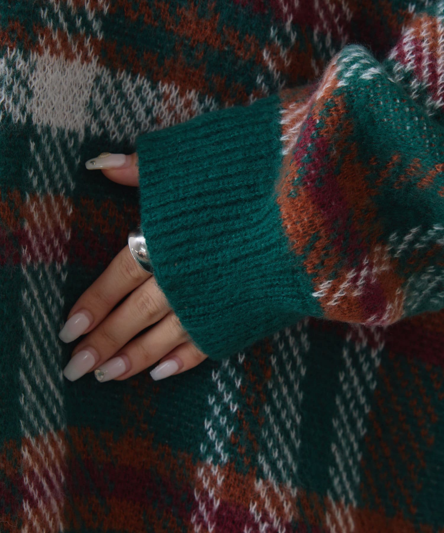 ・秋ムードが一気に高まるチェックニットは一枚でコーデが決まるデザインに。