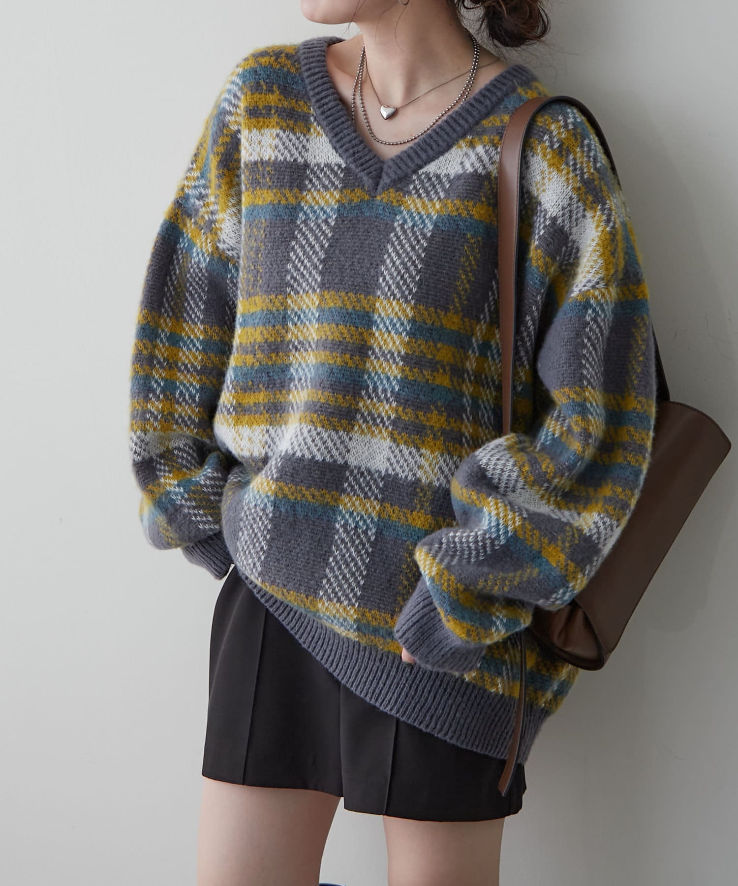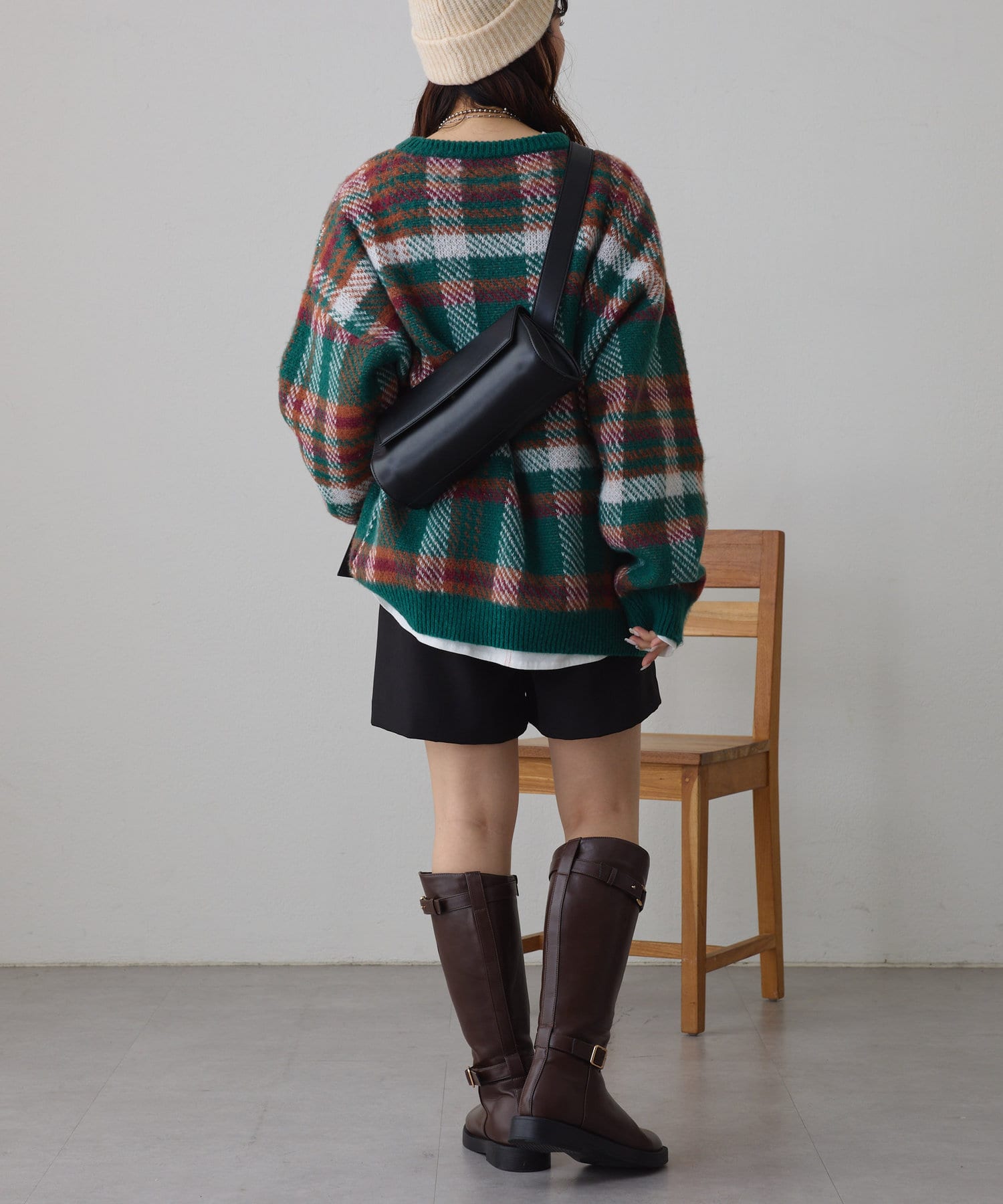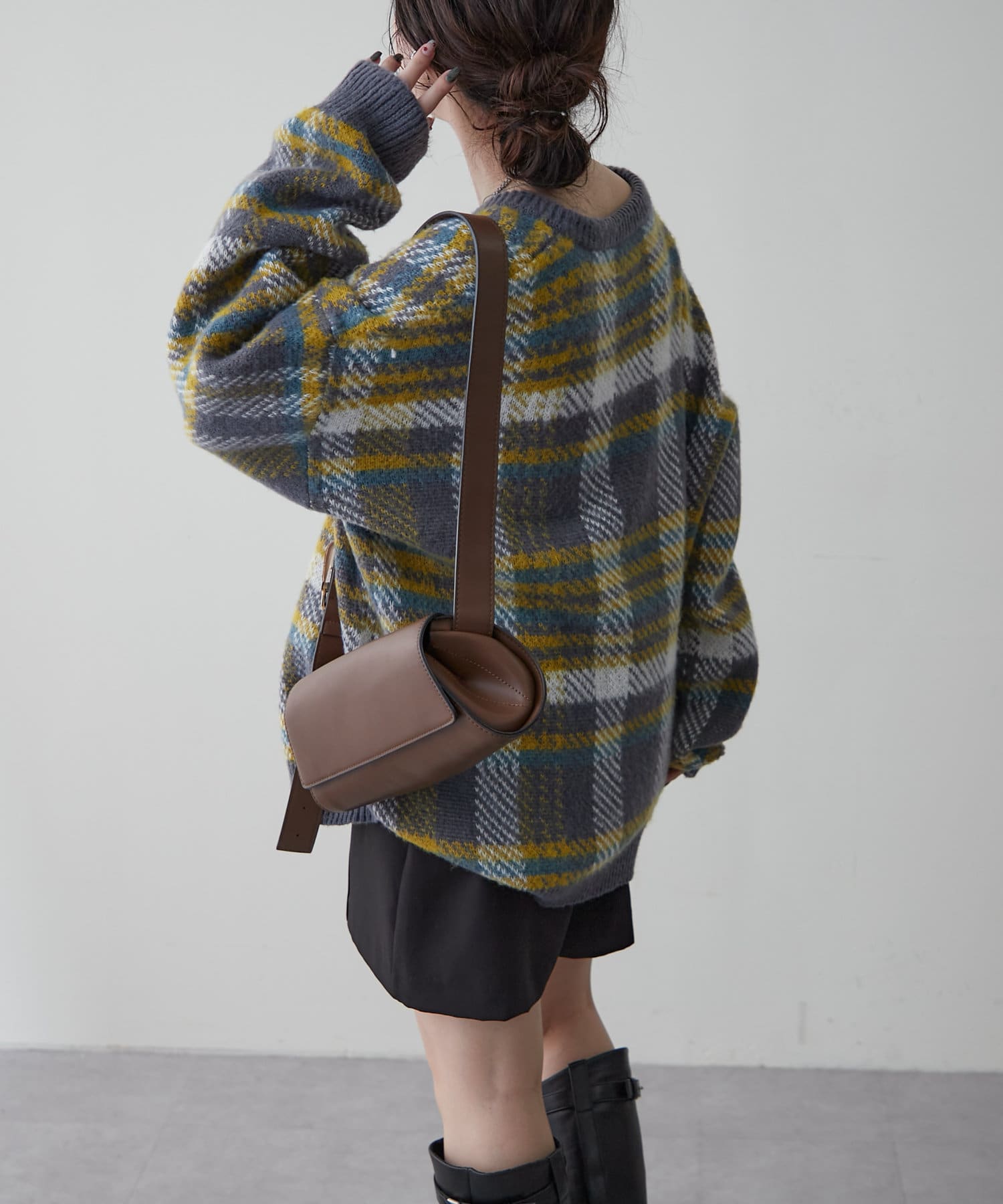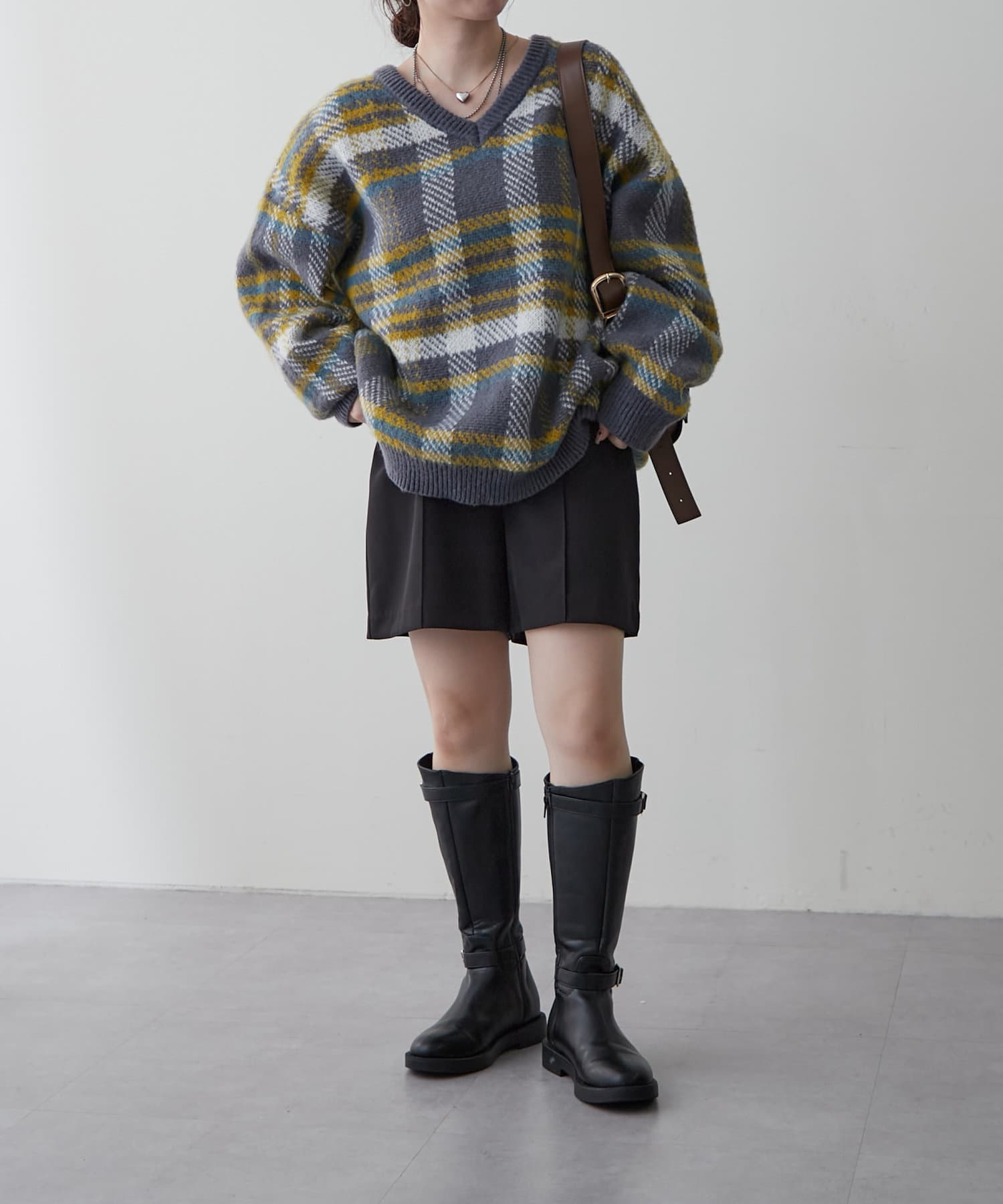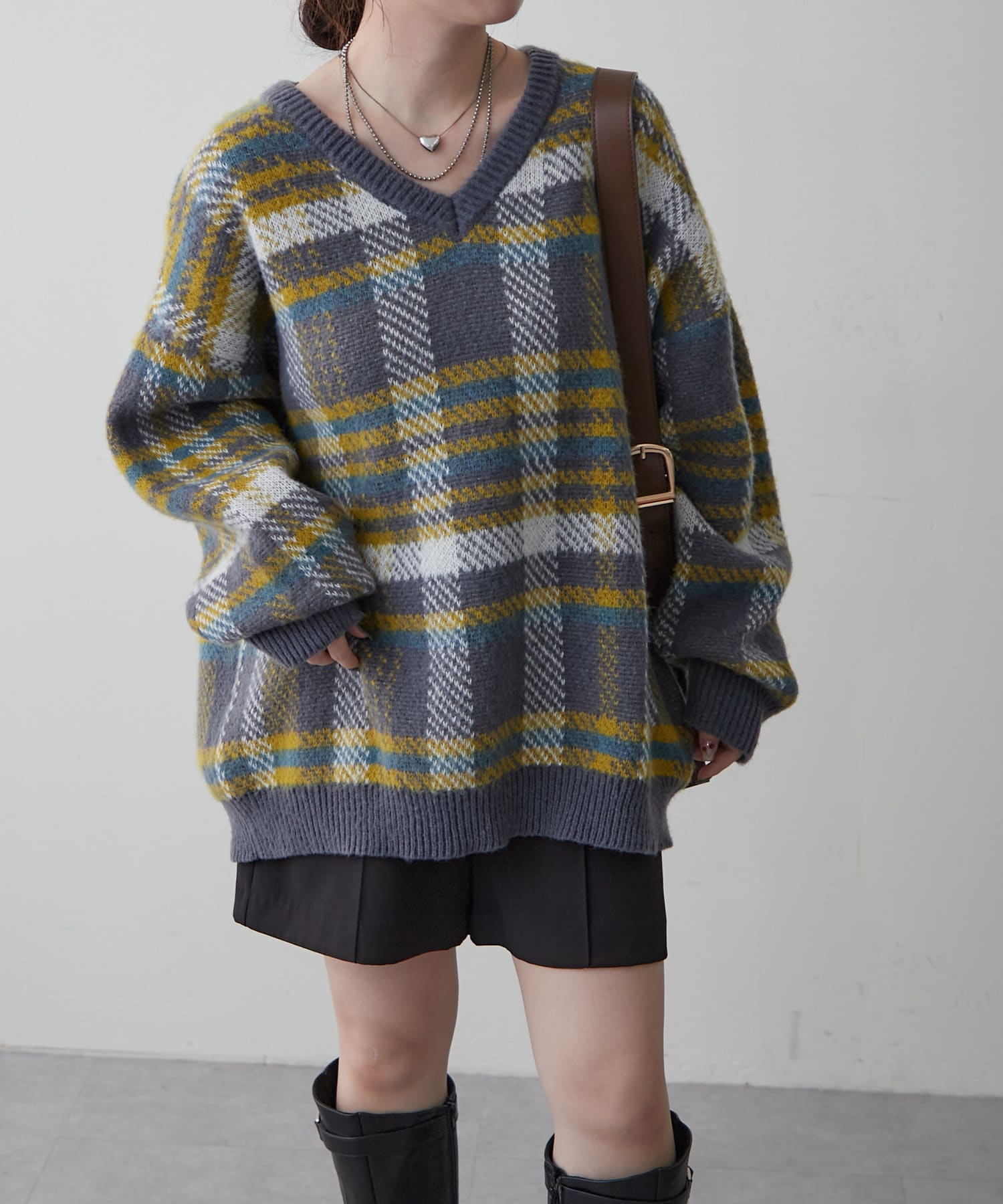 ・秋ムードが一気に高まるチェックニットは一枚でコーデが決まるデザインに。