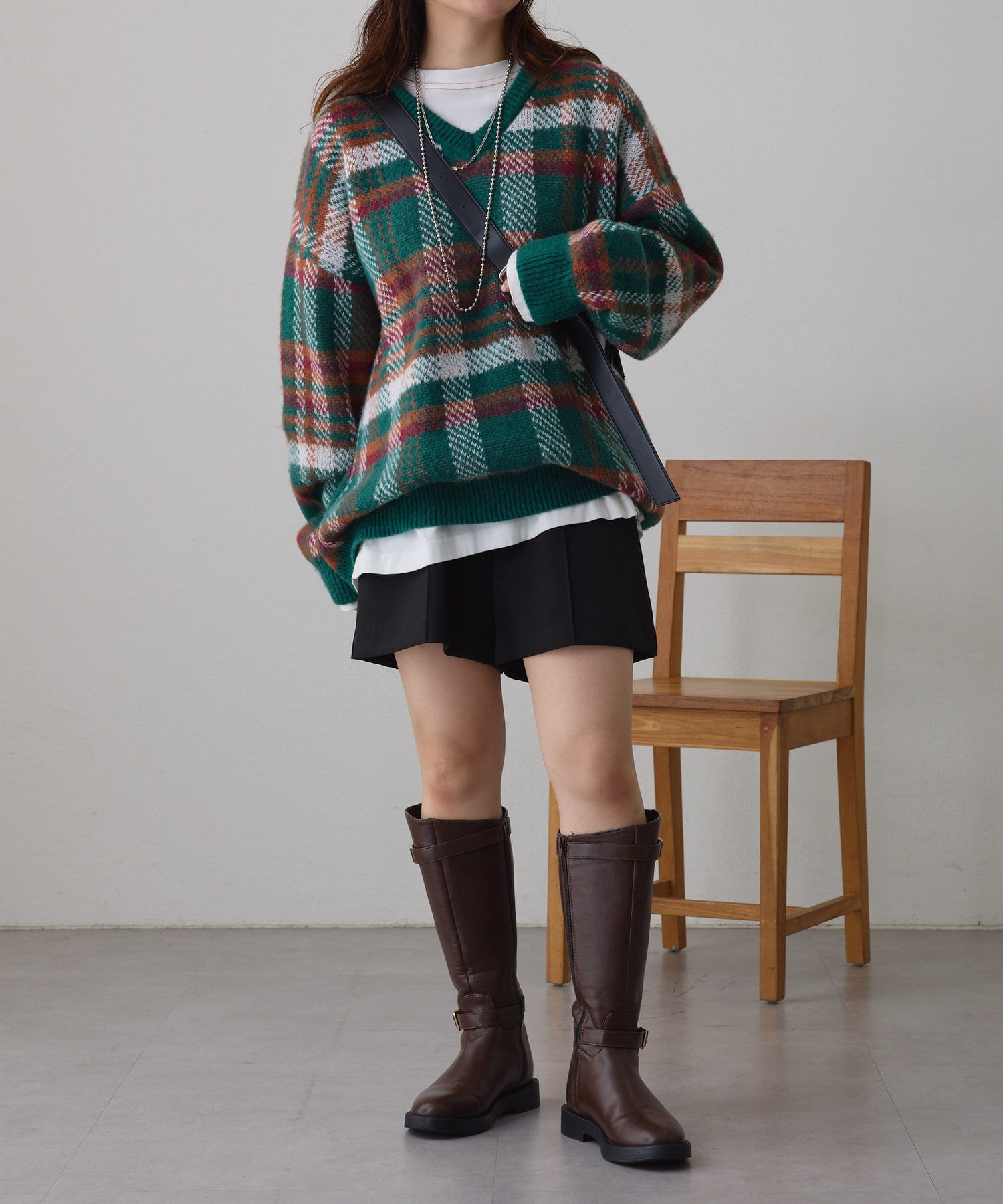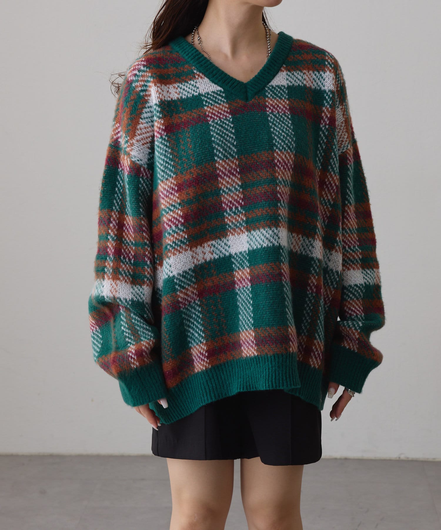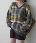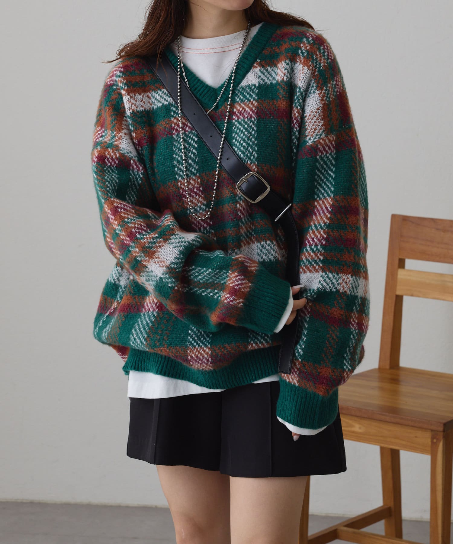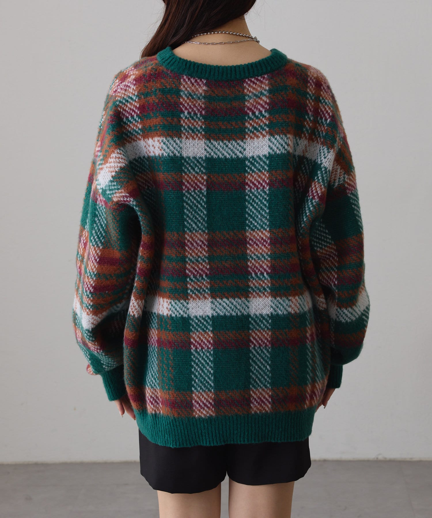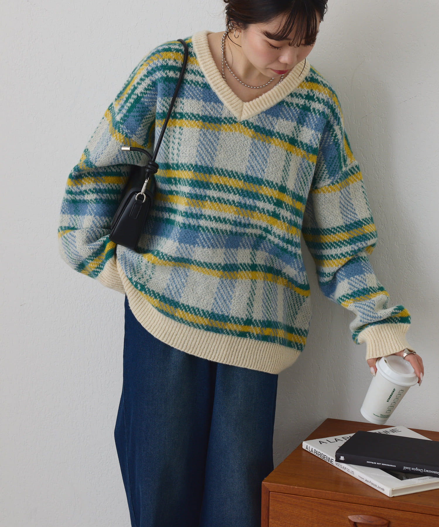 ・秋ムードが一気に高まるチェックニットは一枚でコーデが決まるデザインに。