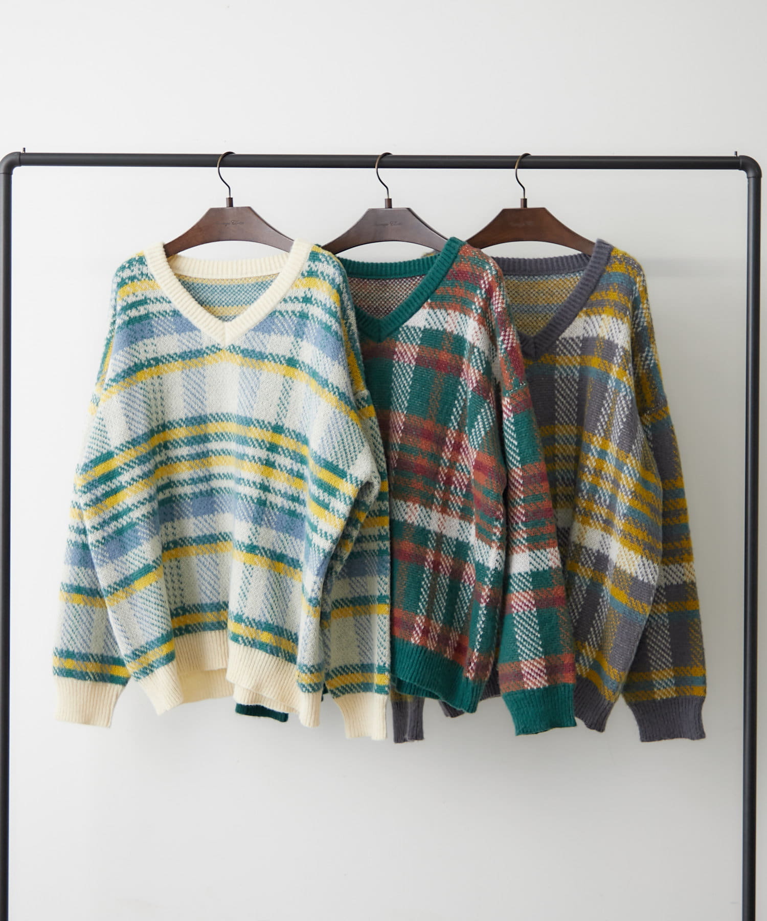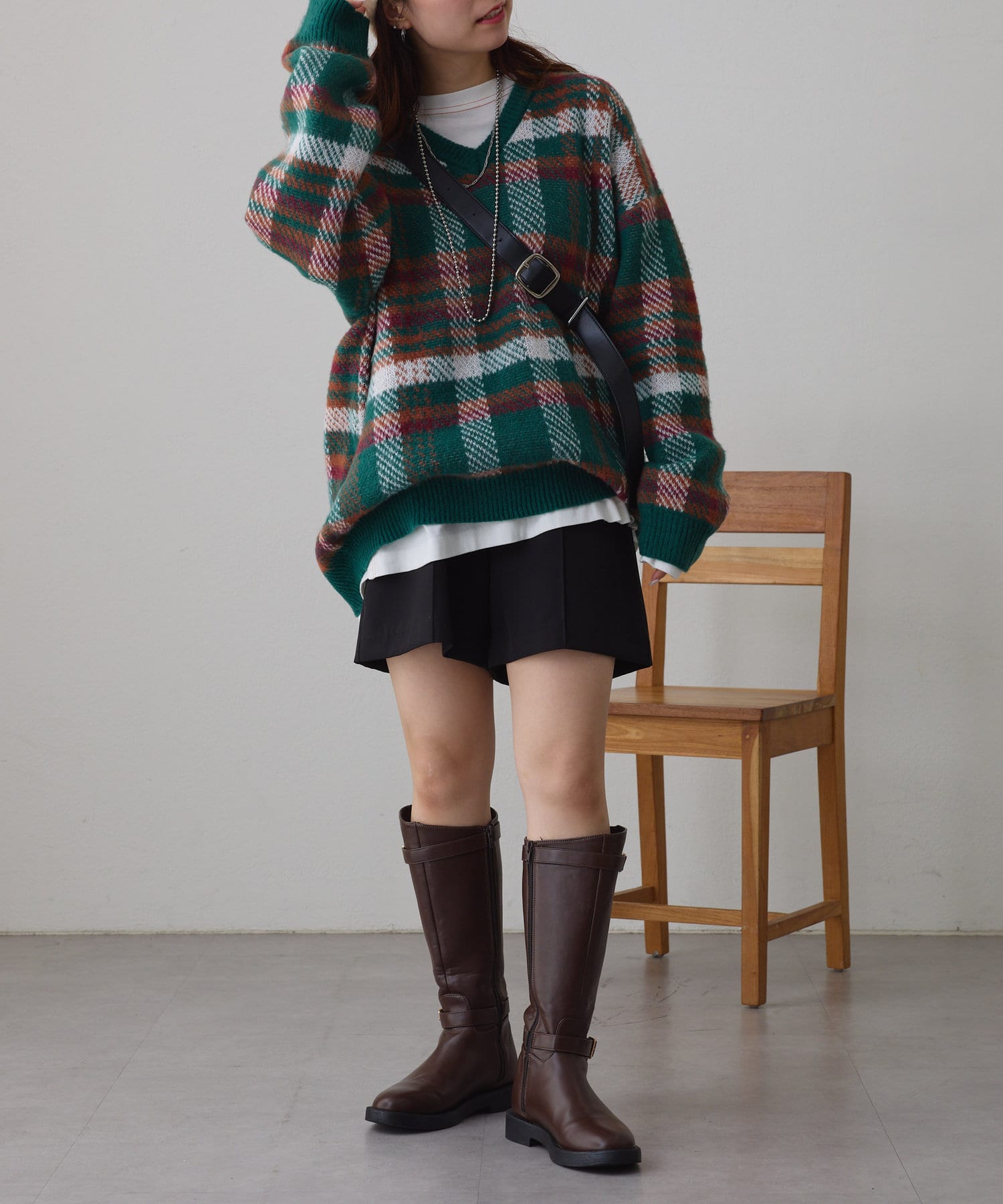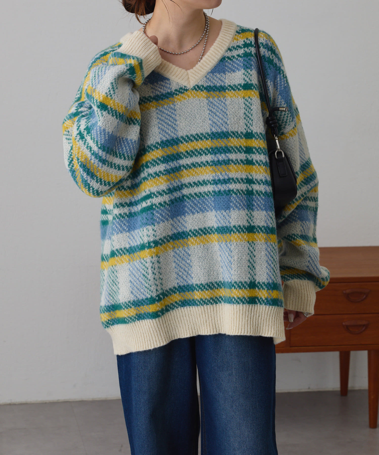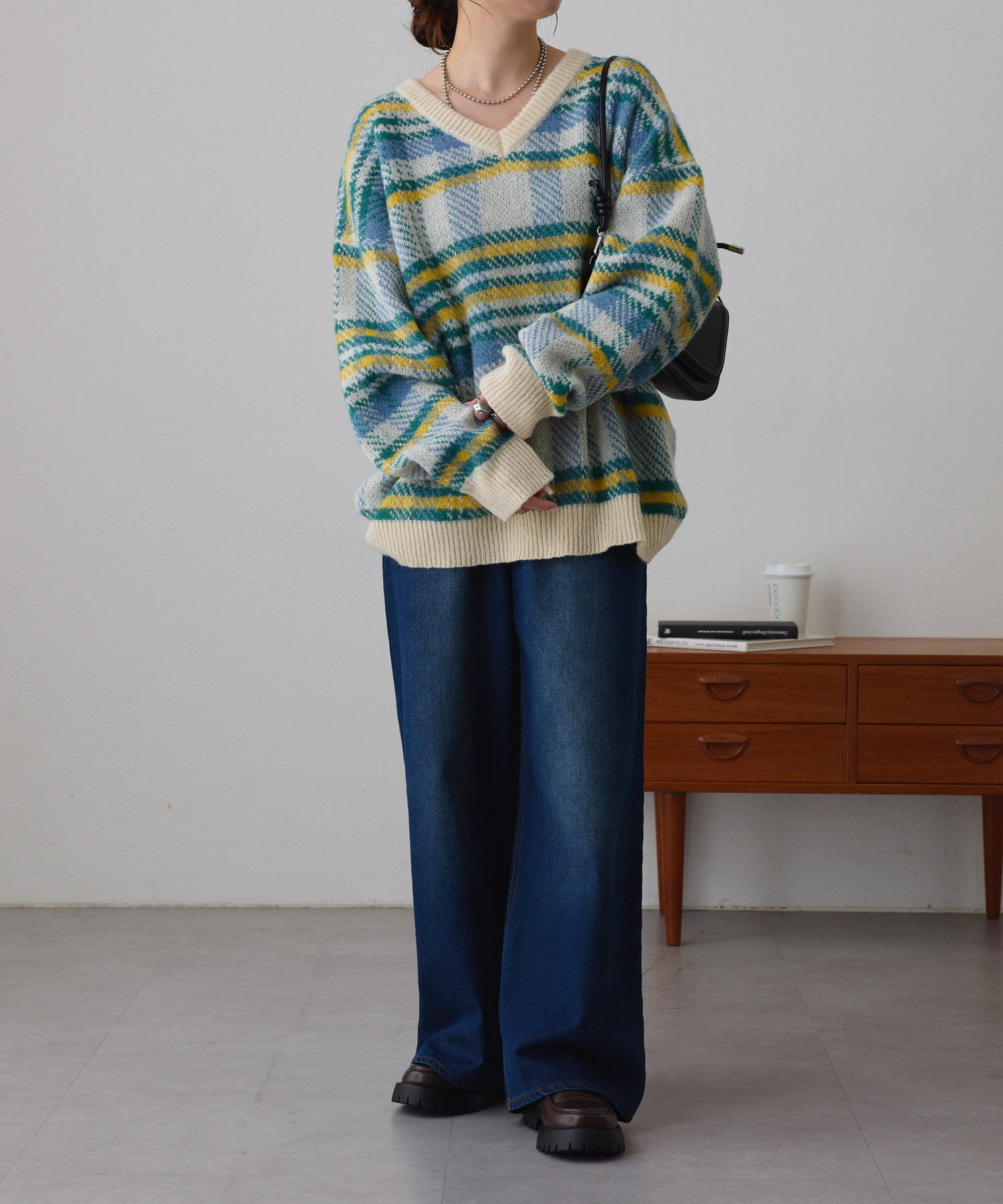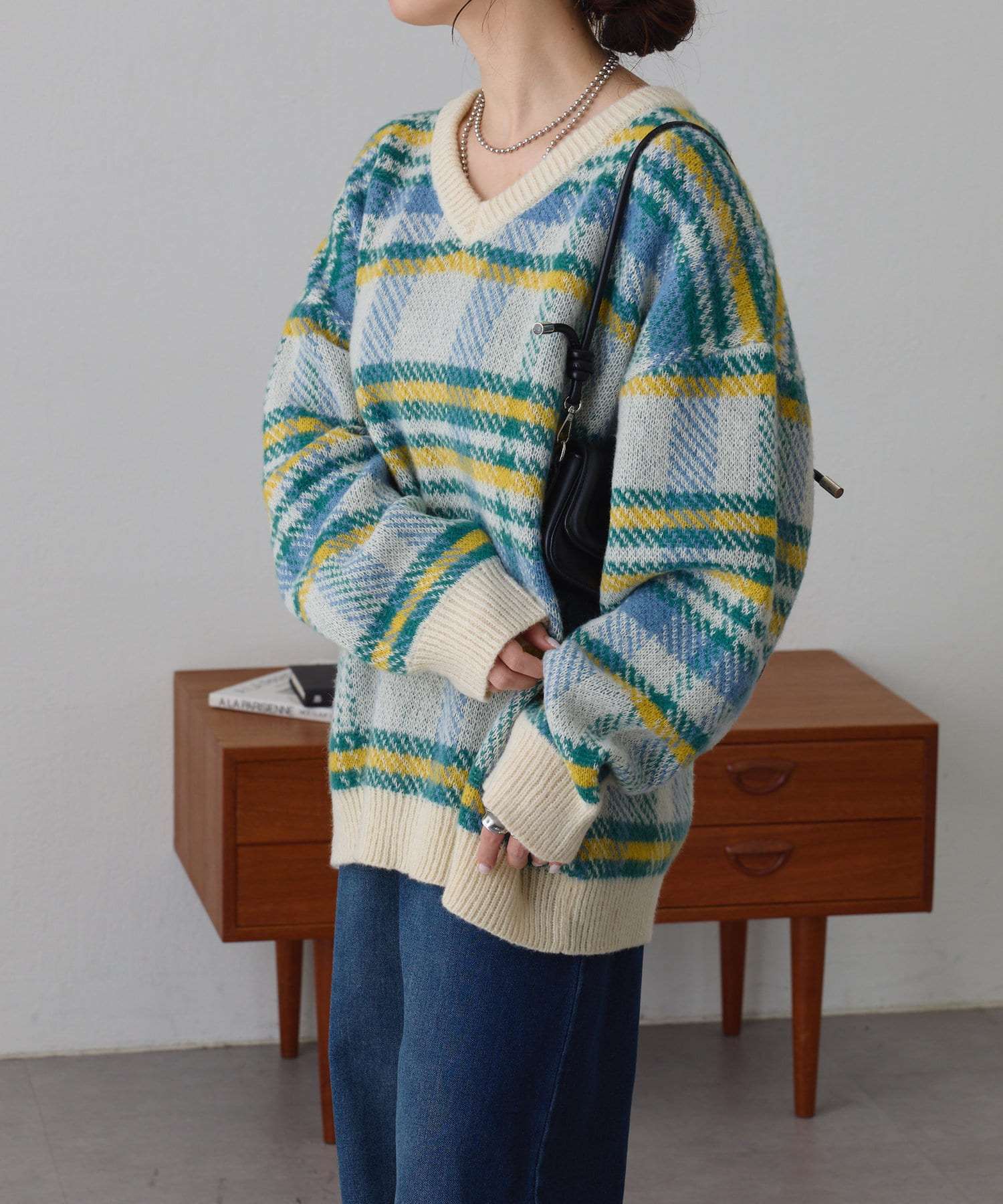 ・秋ムードが一気に高まるチェックニットは一枚でコーデが決まるデザインに。