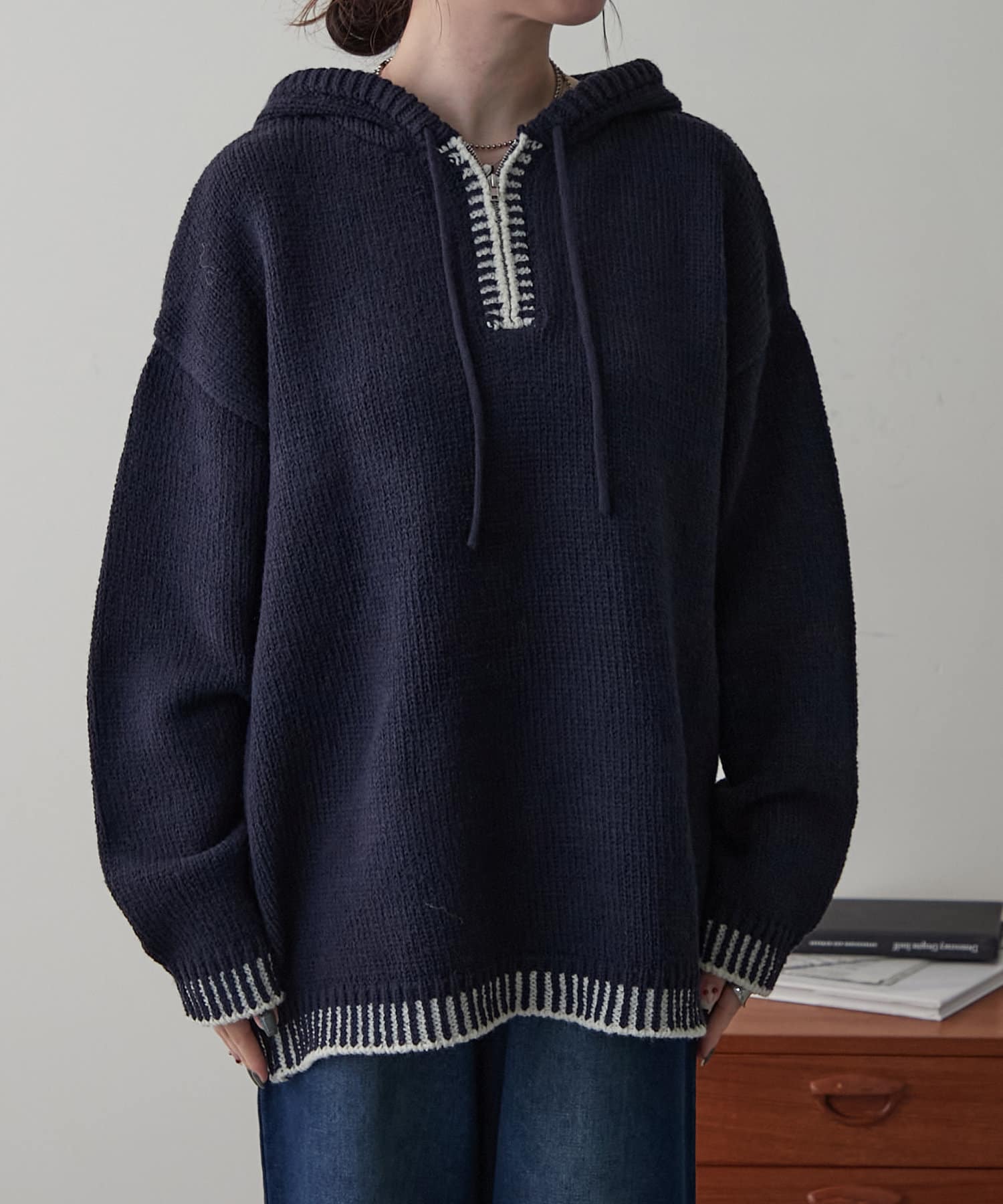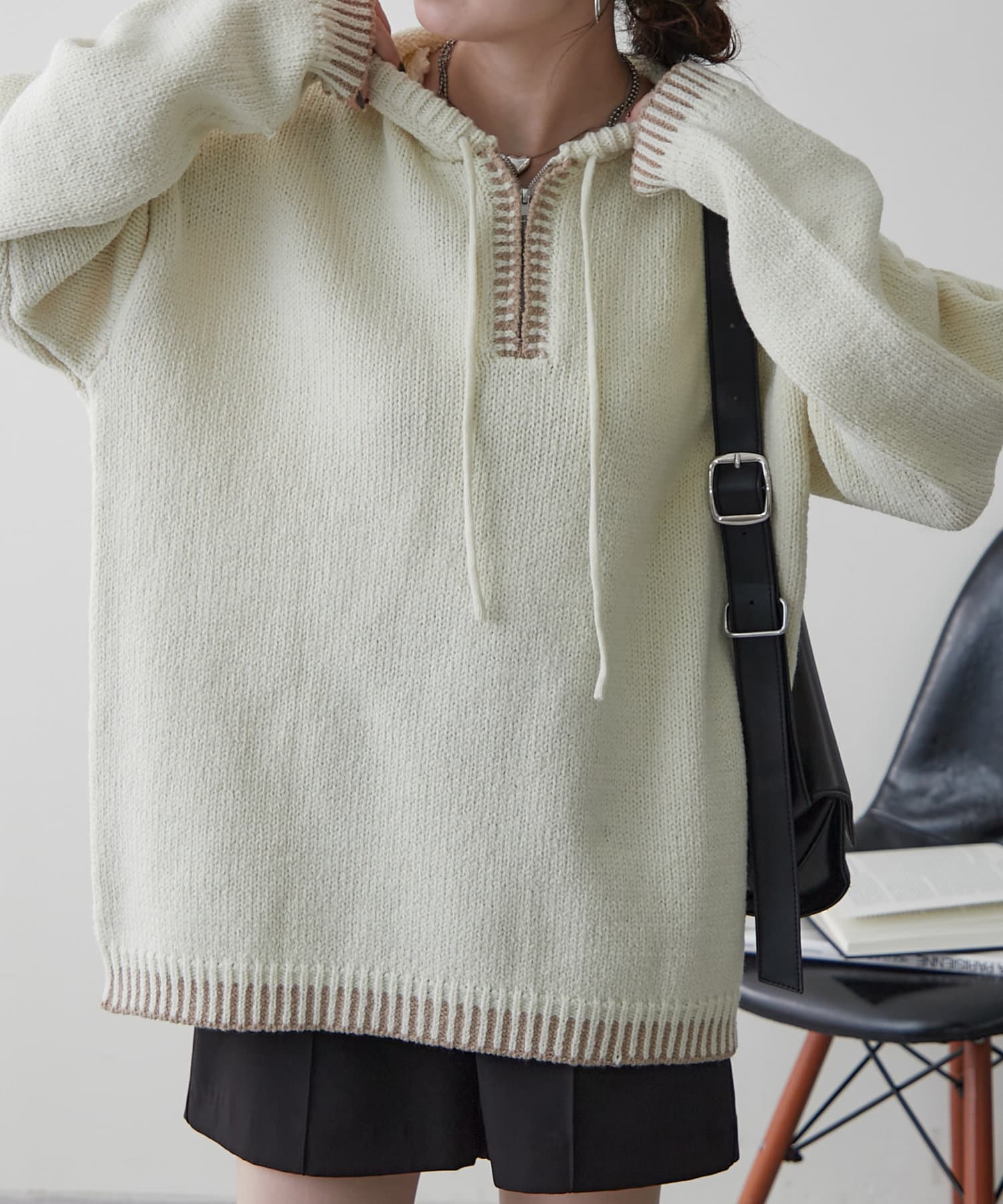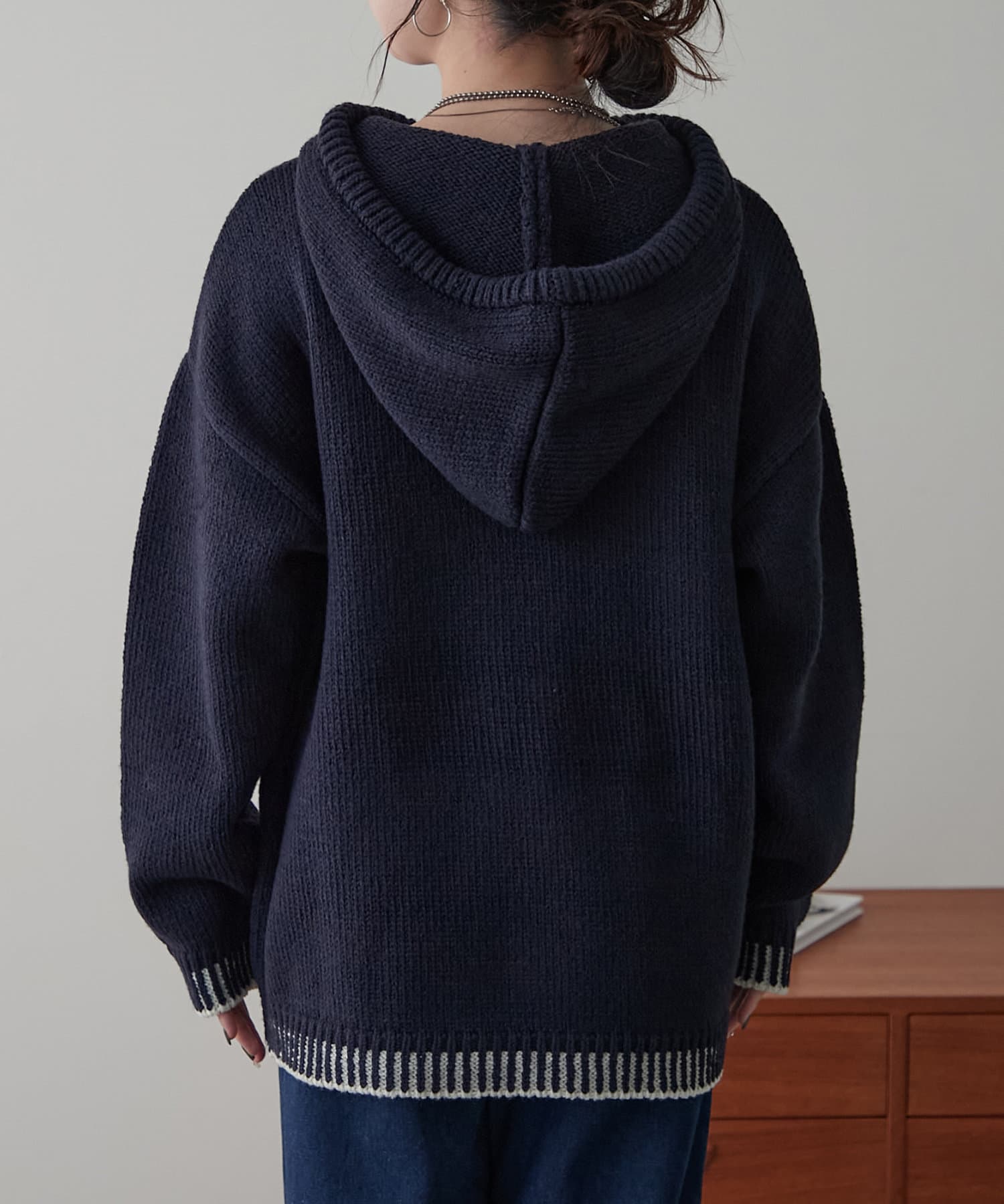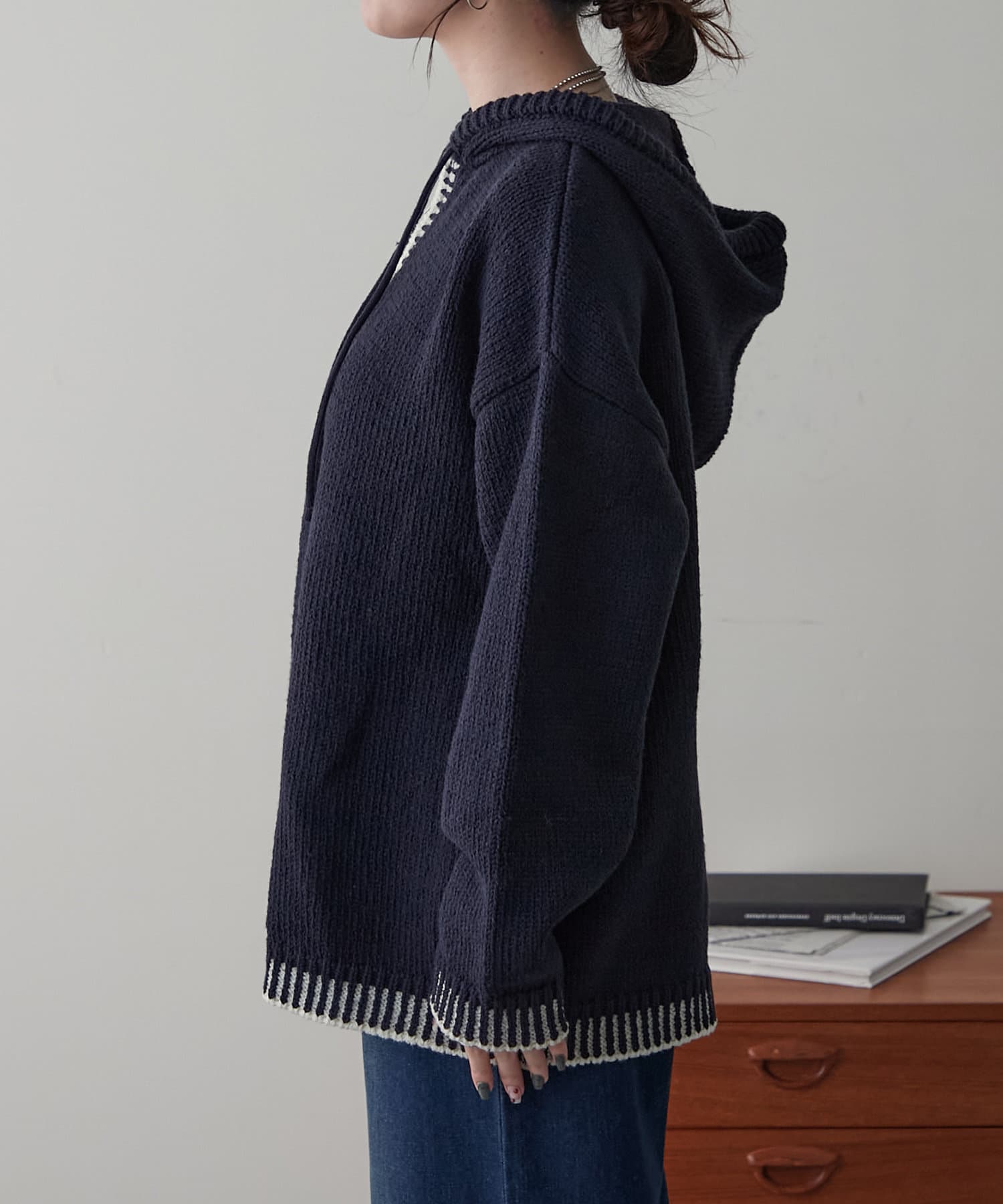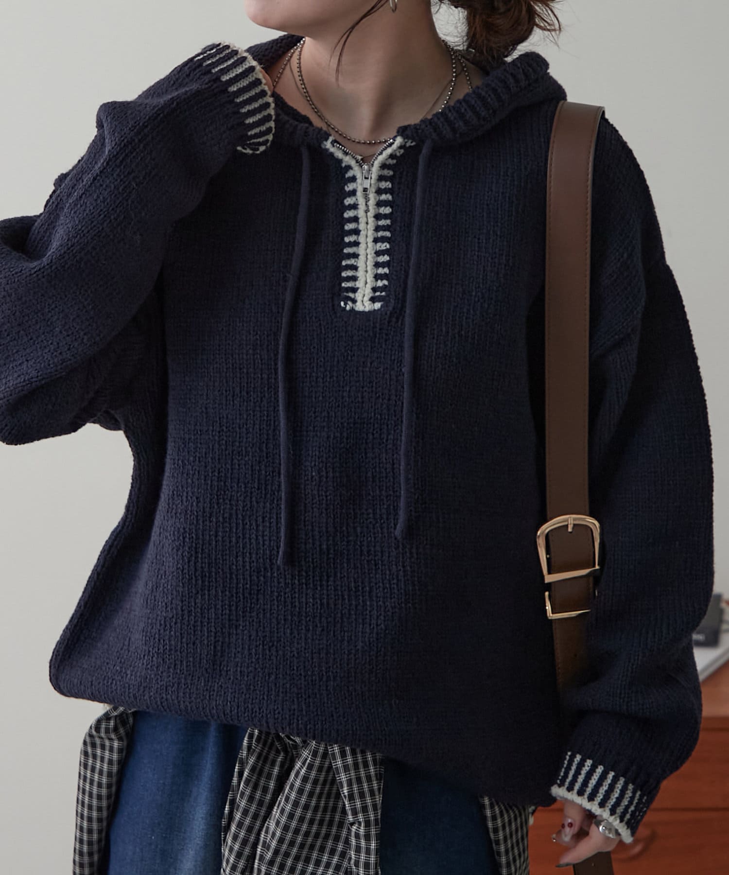 ・配色ステッチがコーデのアクセントになるニットパーカー