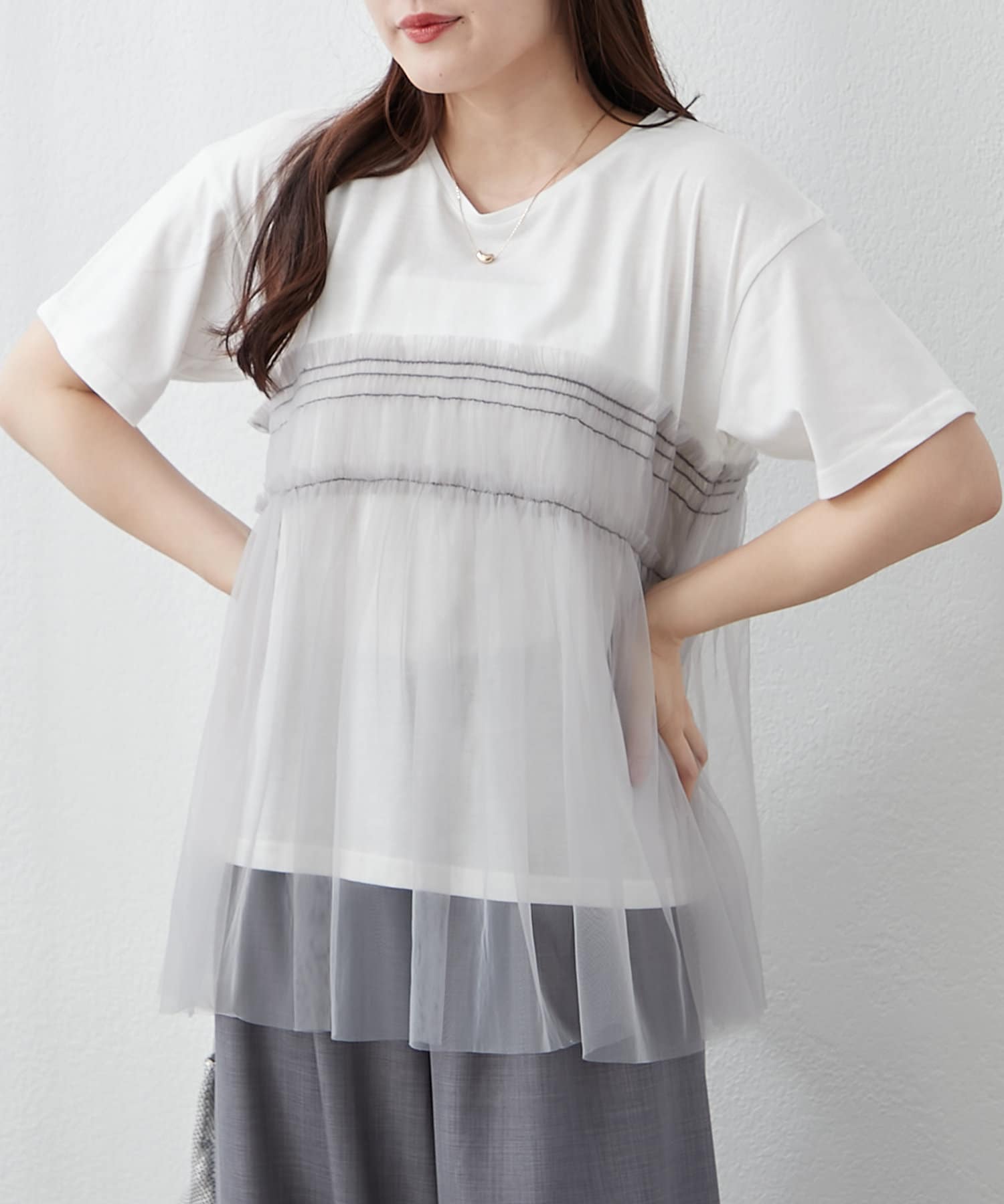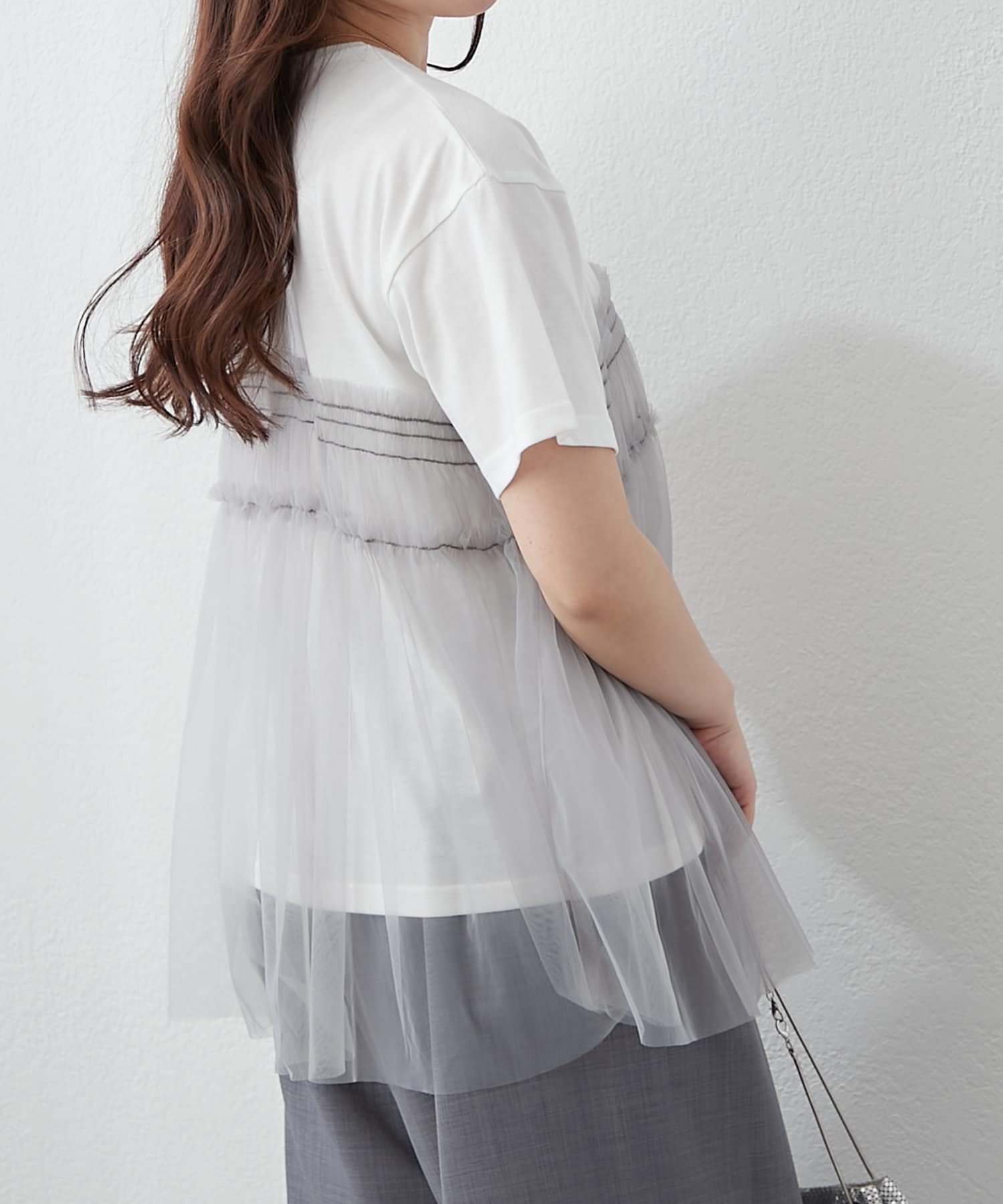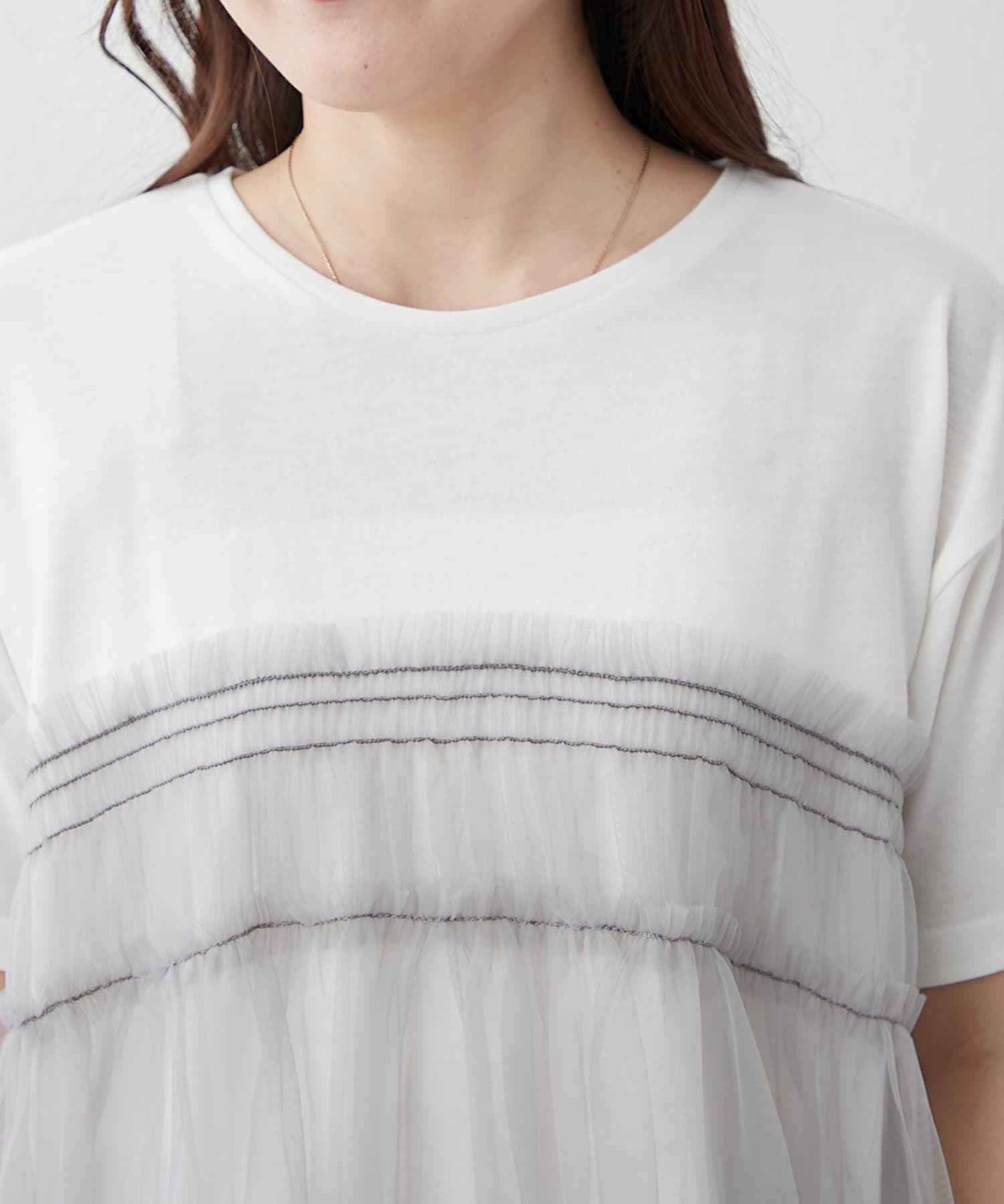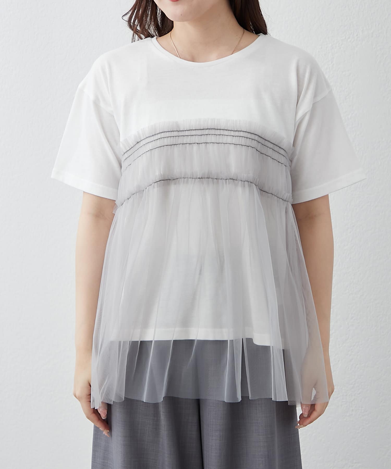 ・春夏らしいチュール素材を組み合わせたレイヤード風Tシャツ