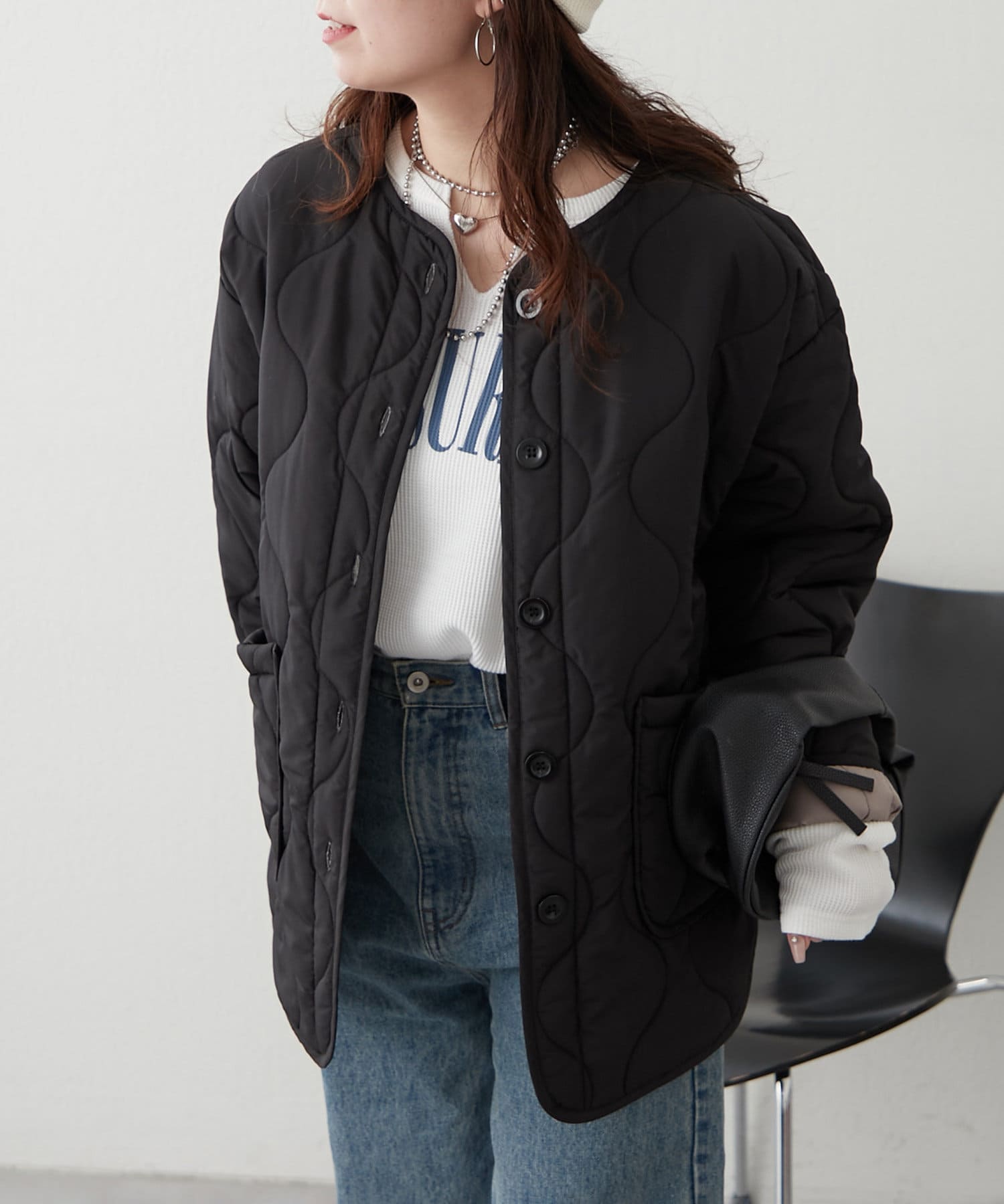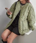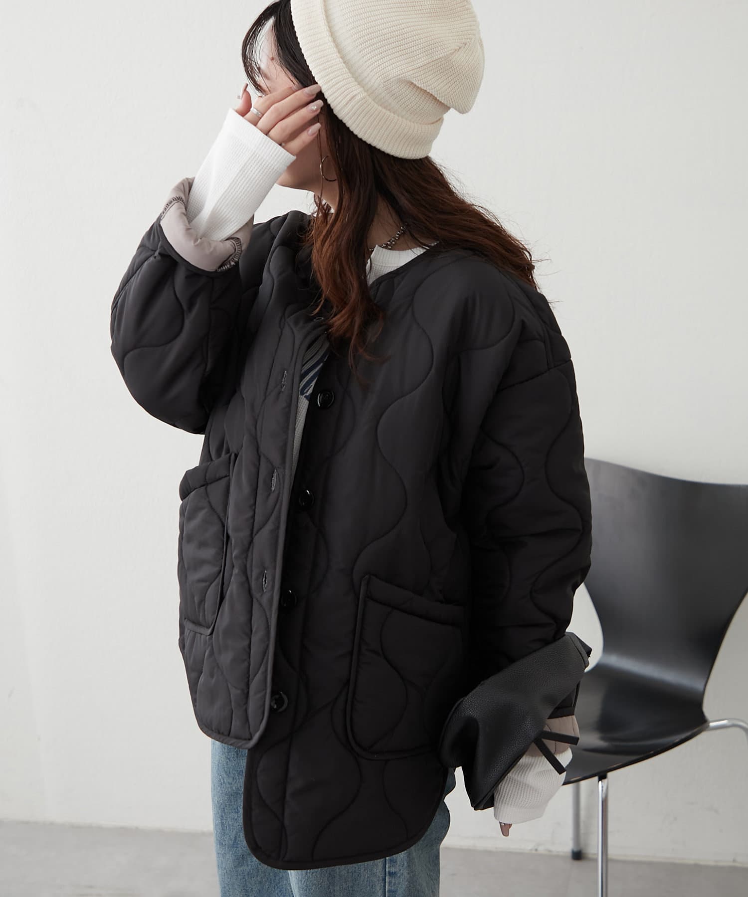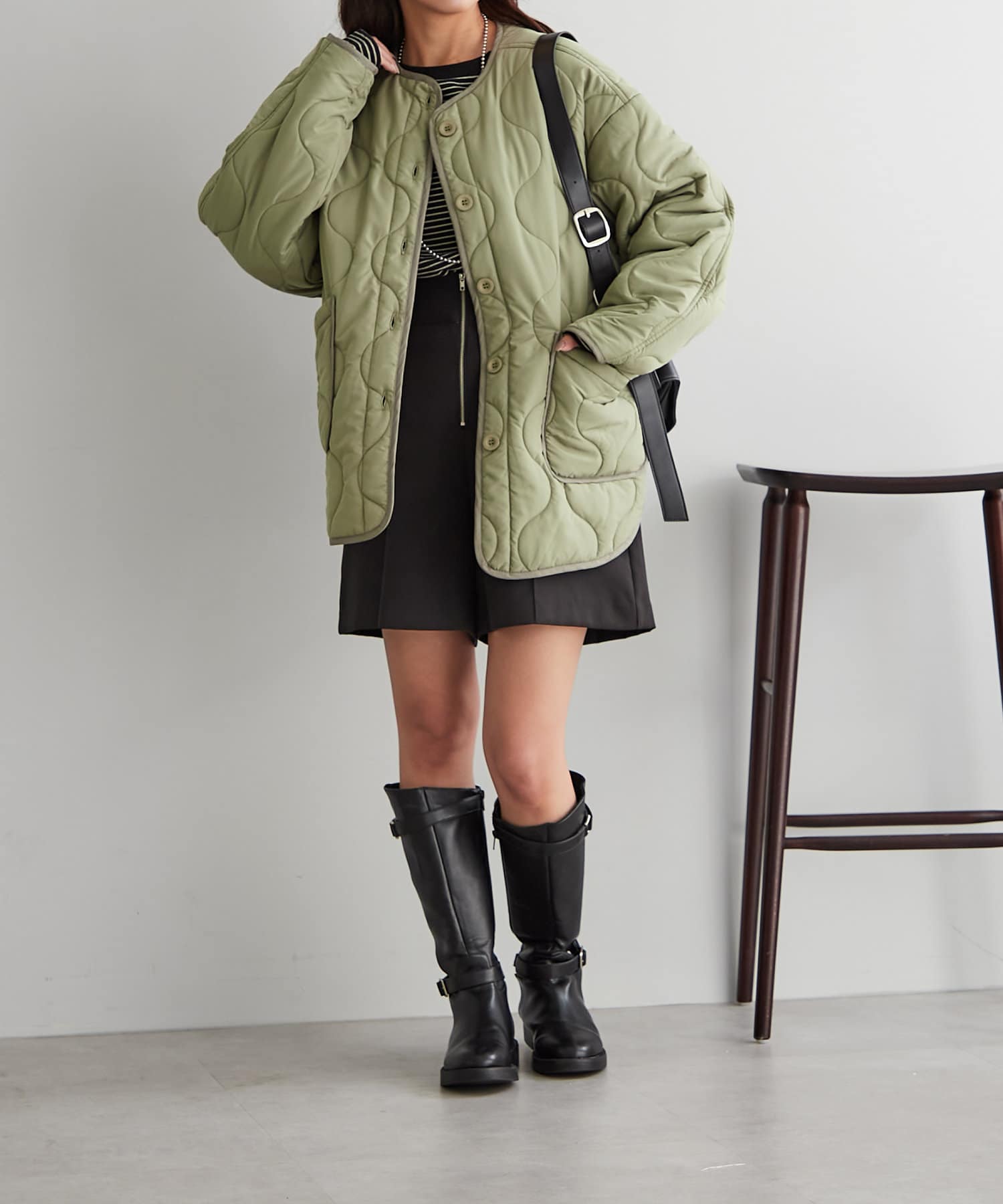・軽さと防寒に優れたアウターの定番キルト素材を使ったノーカラージャケット。