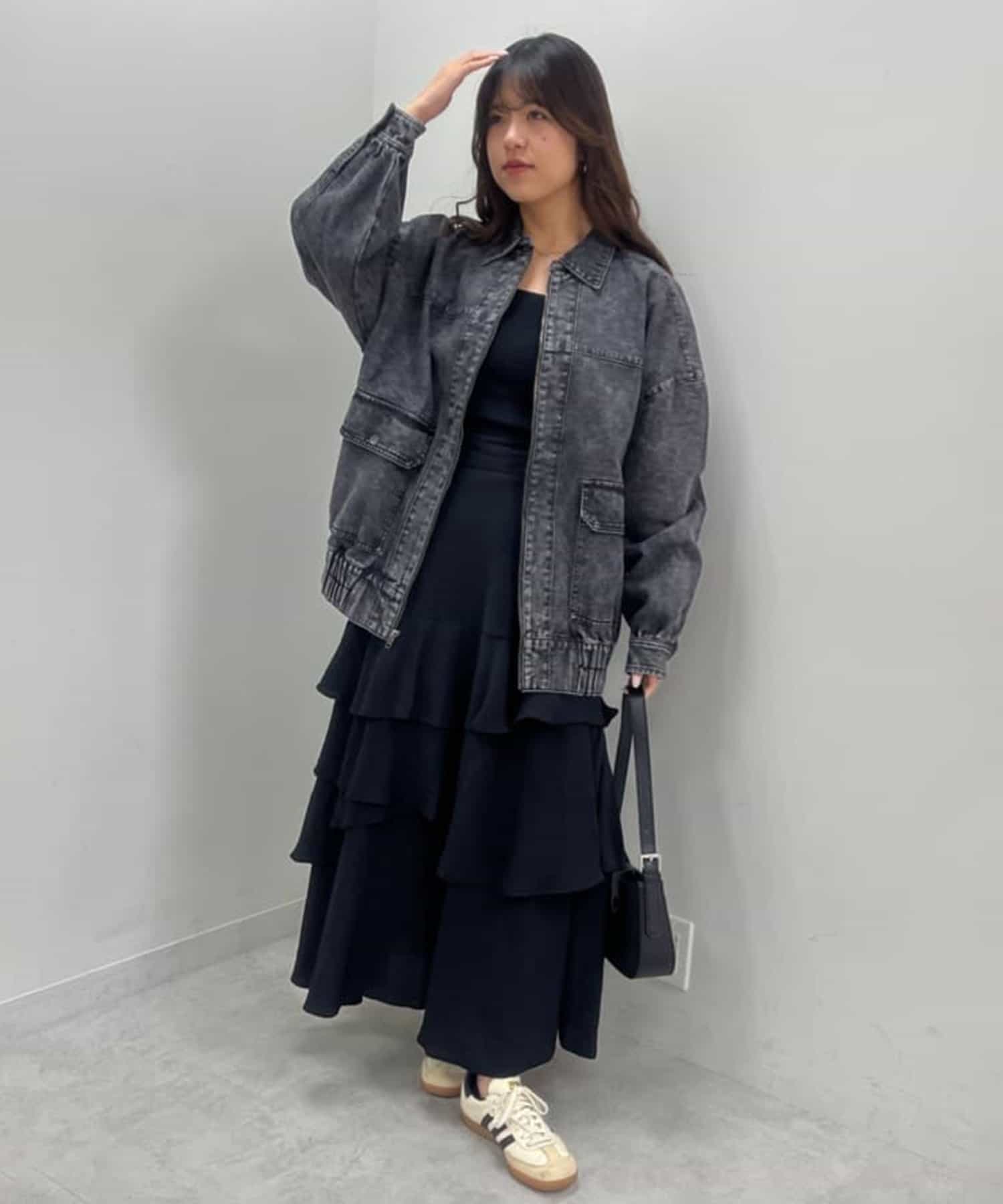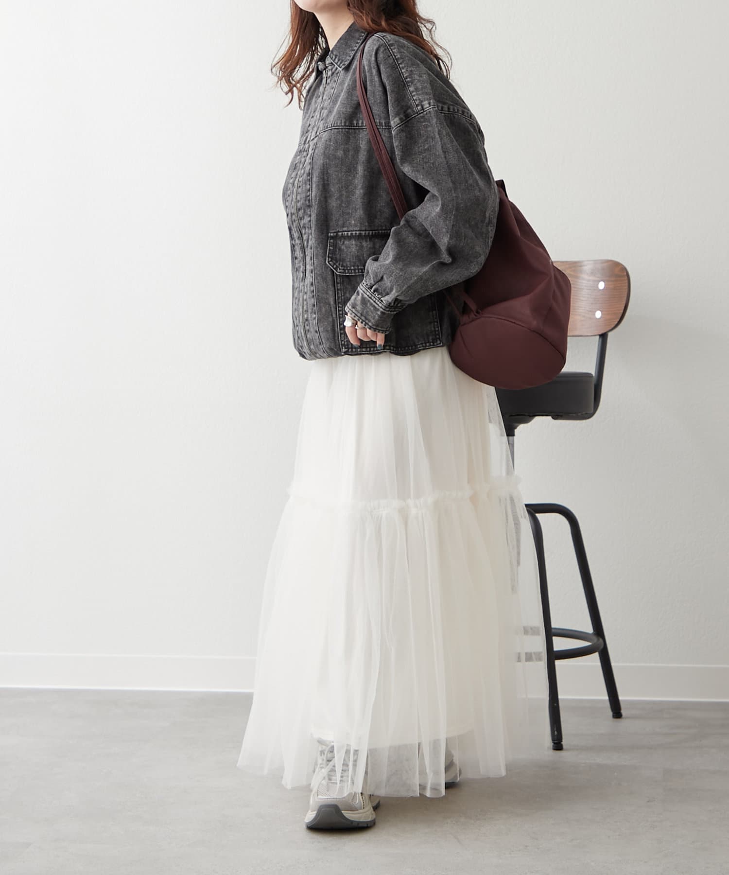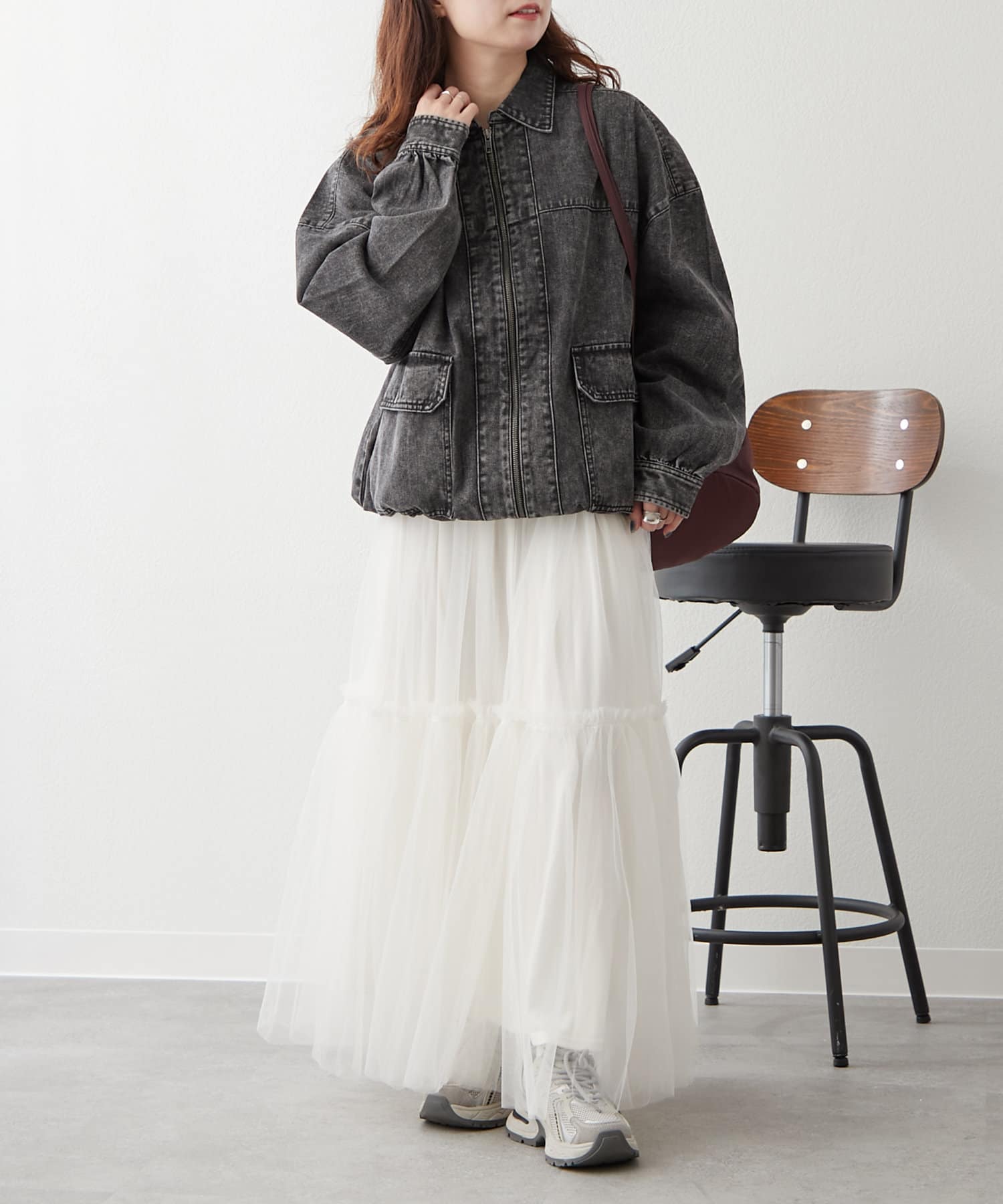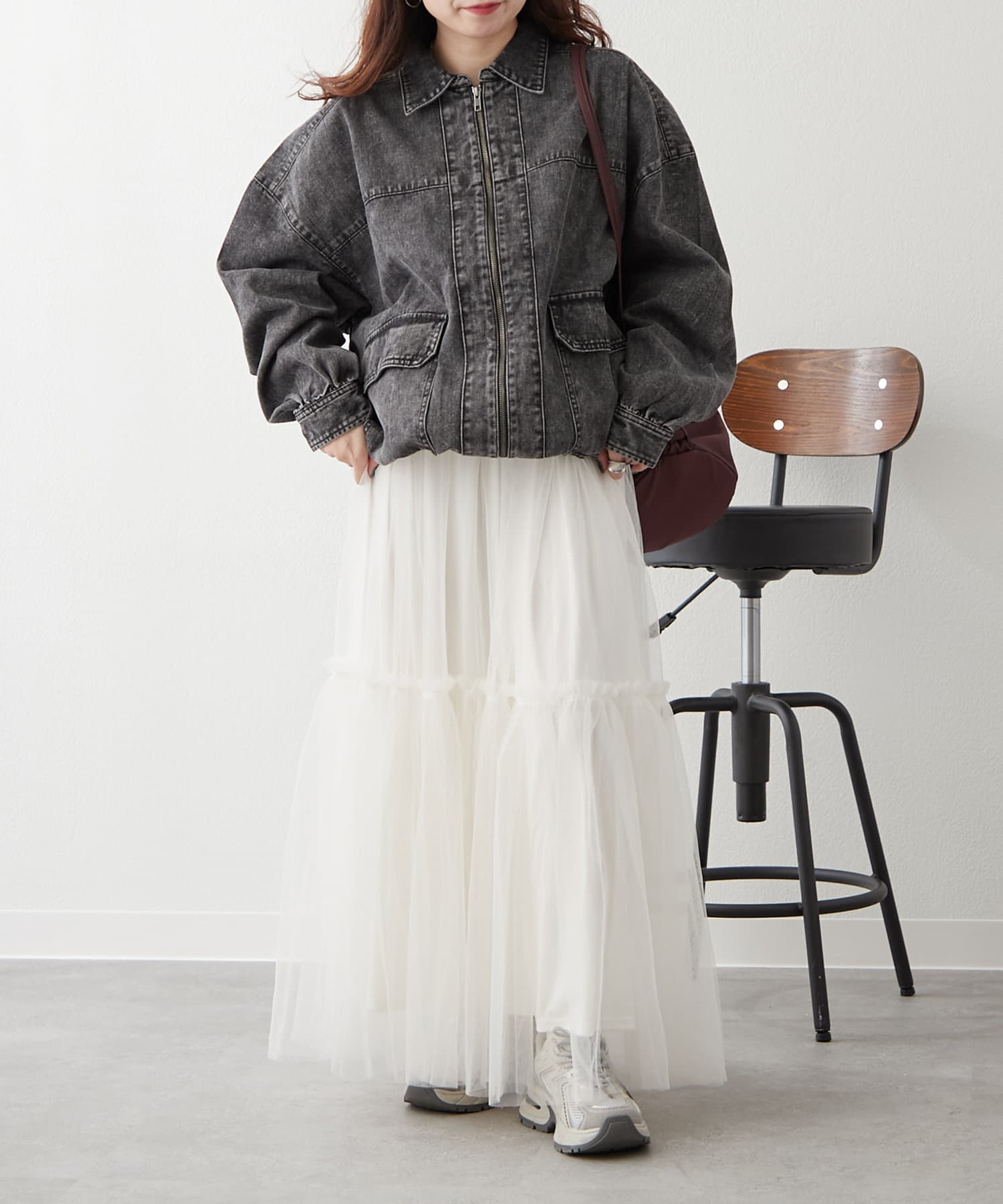 ・あえてチュールやレース素材のボトムスを合わせたガーリーコーデにもぴったりなアウターです。