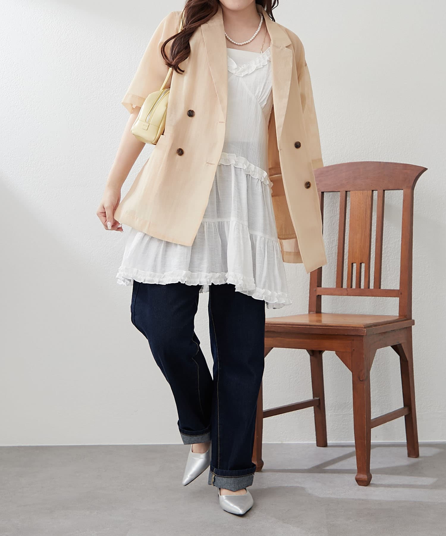 ・シーズンムード高まるシアー素材のジャケットはWテーラード仕様でカジュアルすぎない印象