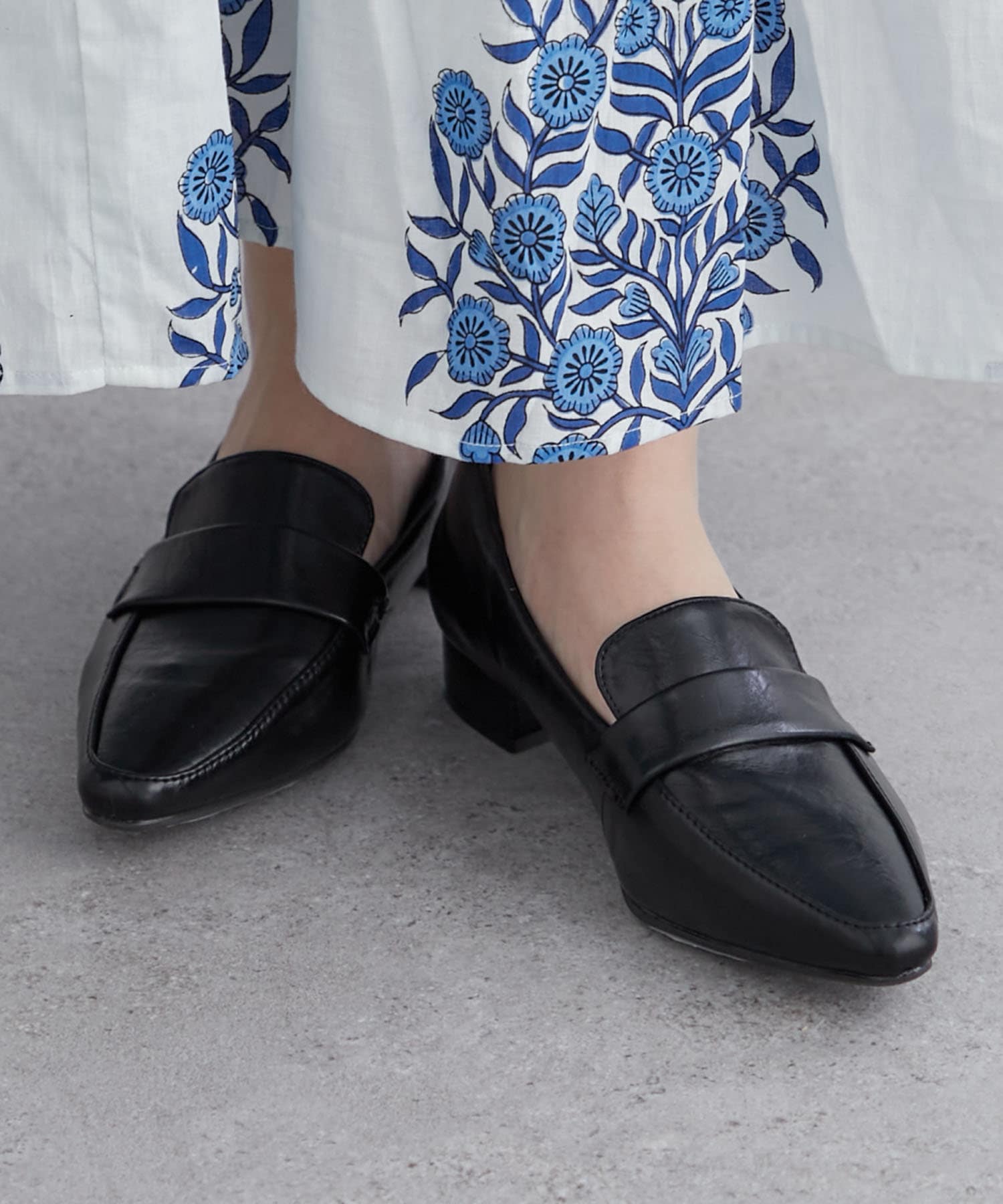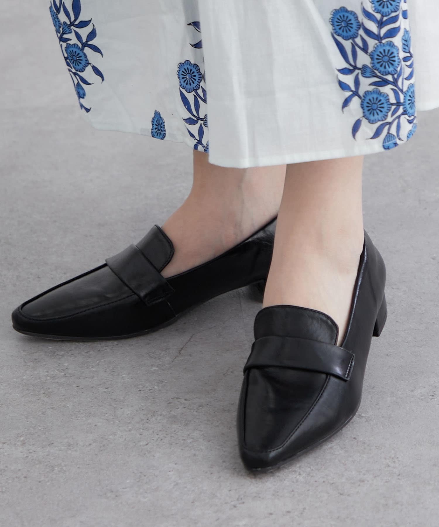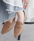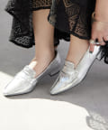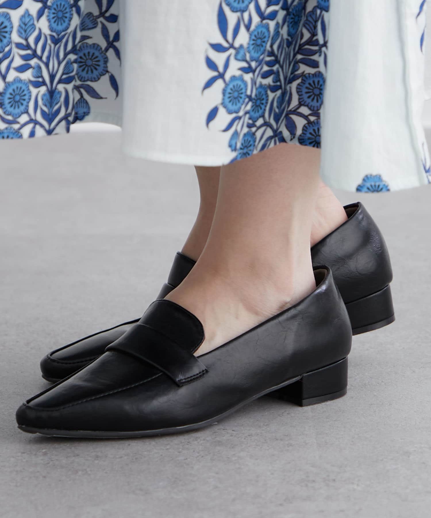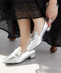 ・スリムなスクエアトゥのデザインとローヒールで上品見え。