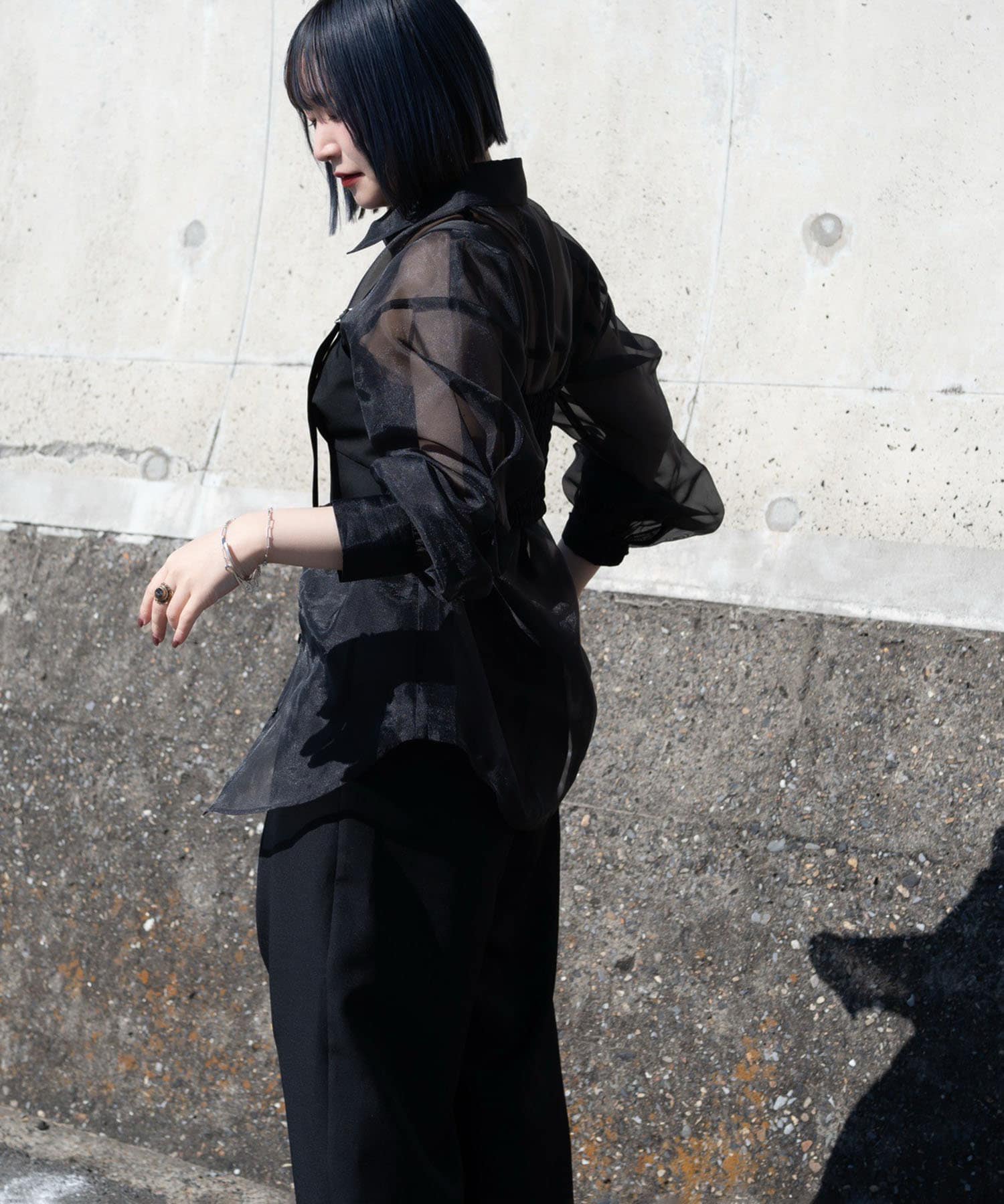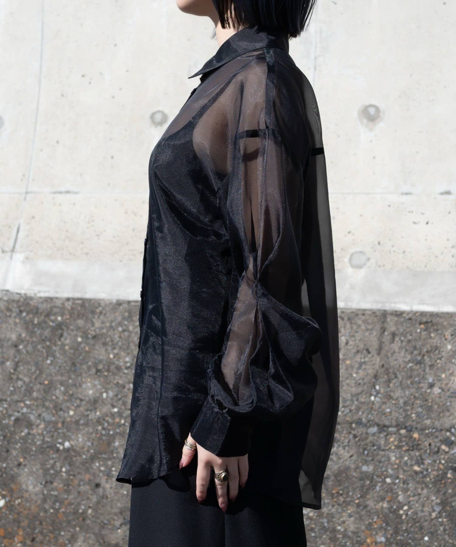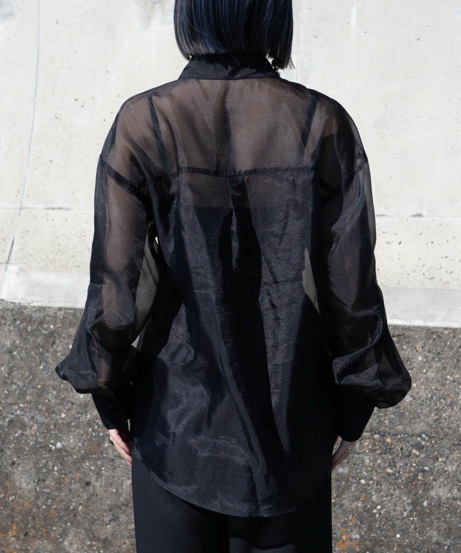 ・夏まで使える透け感のシアーシャツ。春はインナーにハイネックやロンT、夏はキャミソールやタンクトップ合わせがおすすめです。