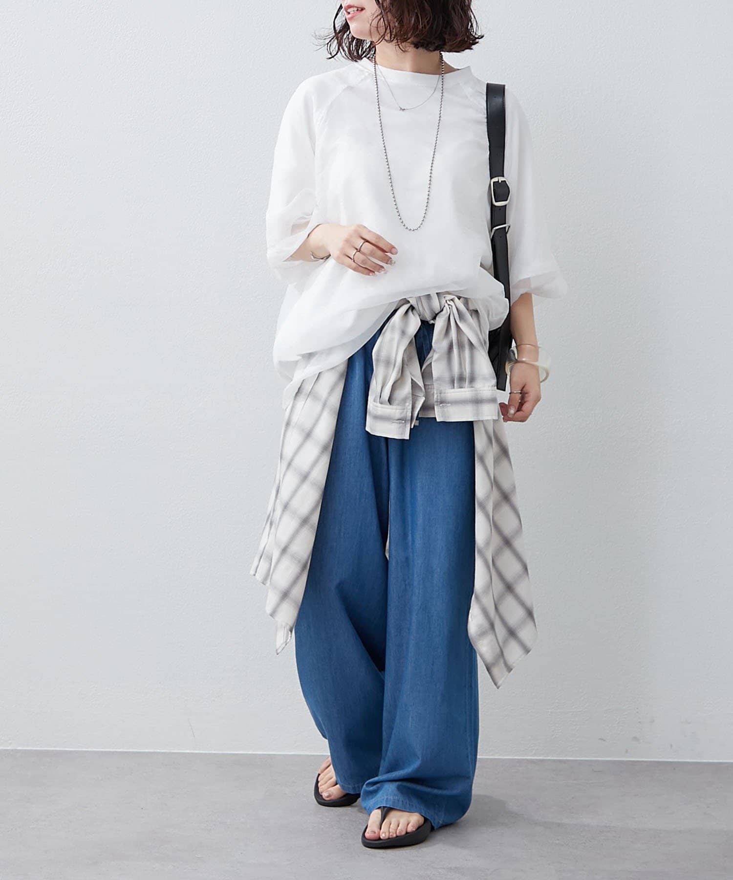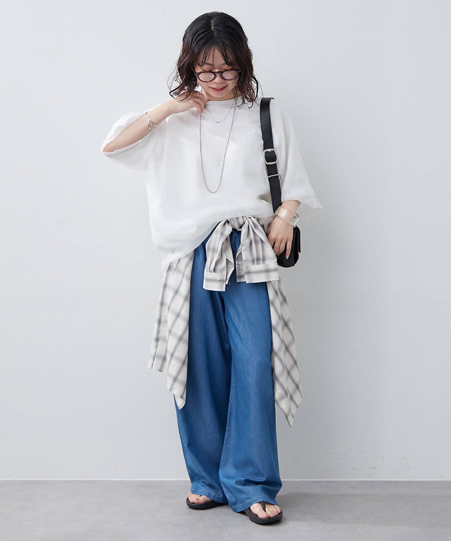 ・シンプルにロゴTシャツやシアーシャツと合わせれば大人カジュアルコーデの完成!