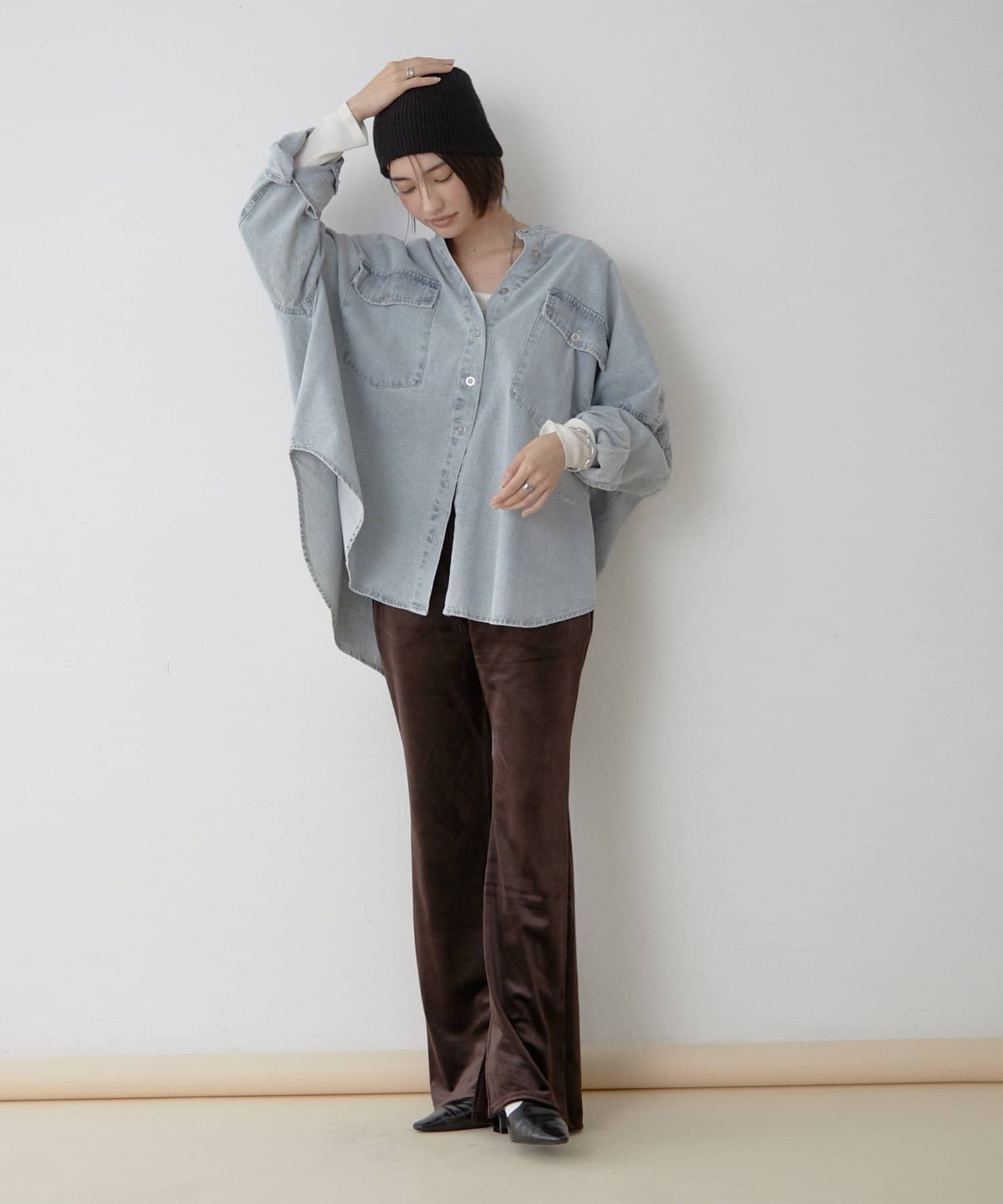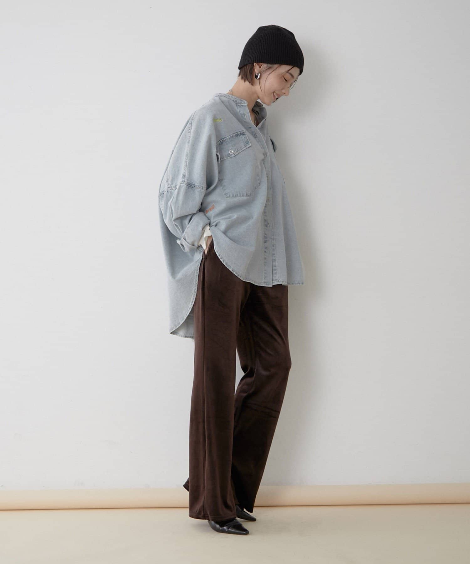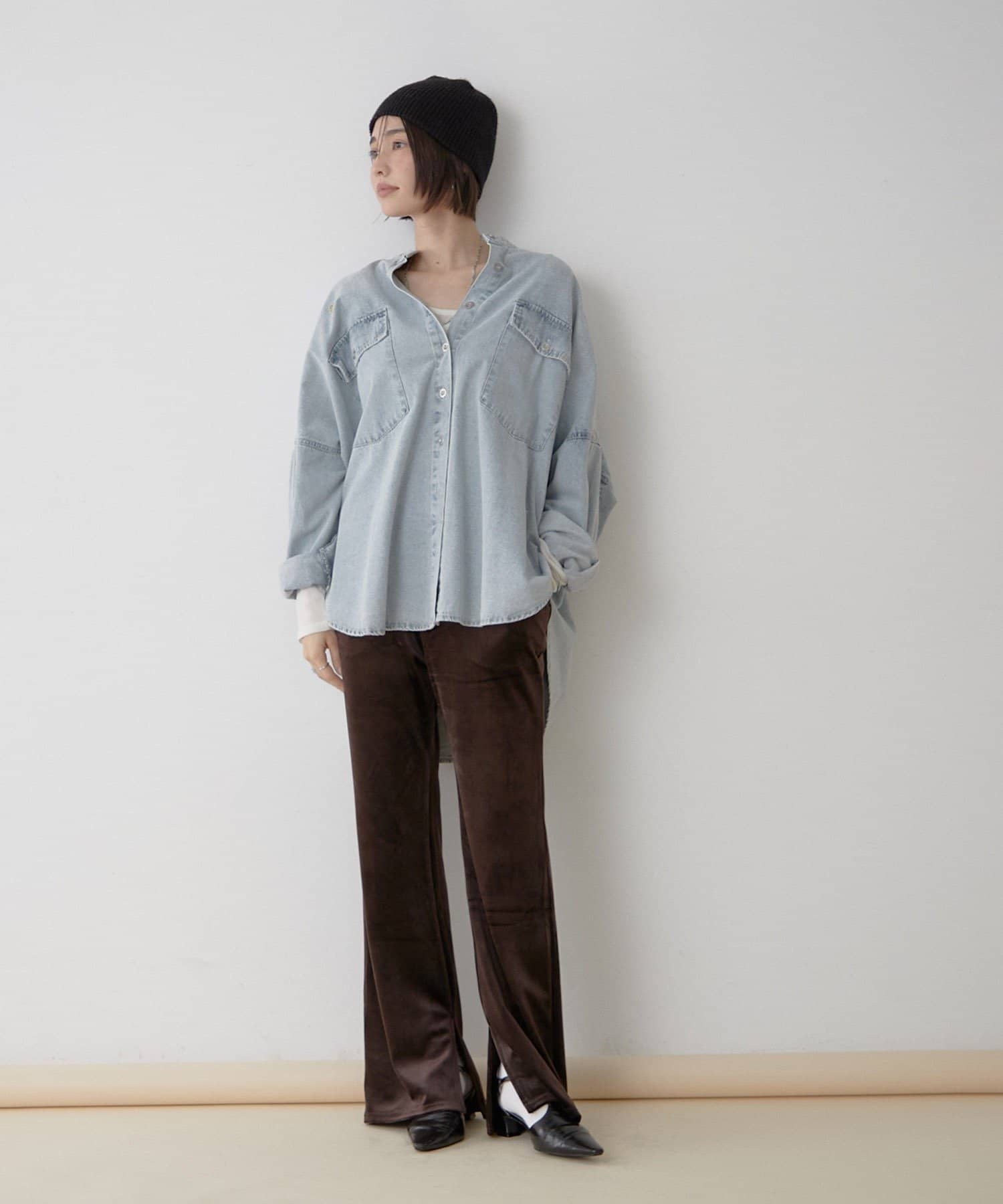 ・裾にスリットを入れたのでスニーカーやブーツなどどんな靴と合わせてもスッキリとした見え方に