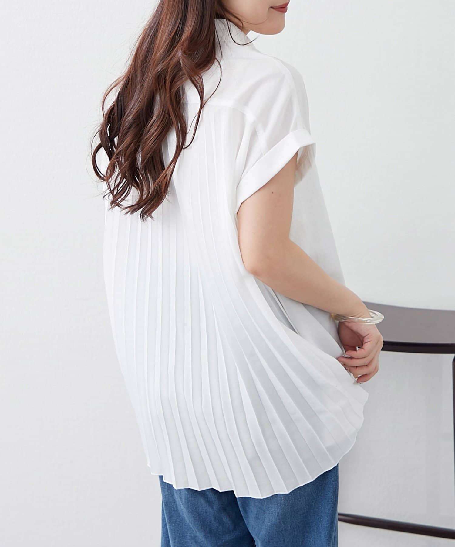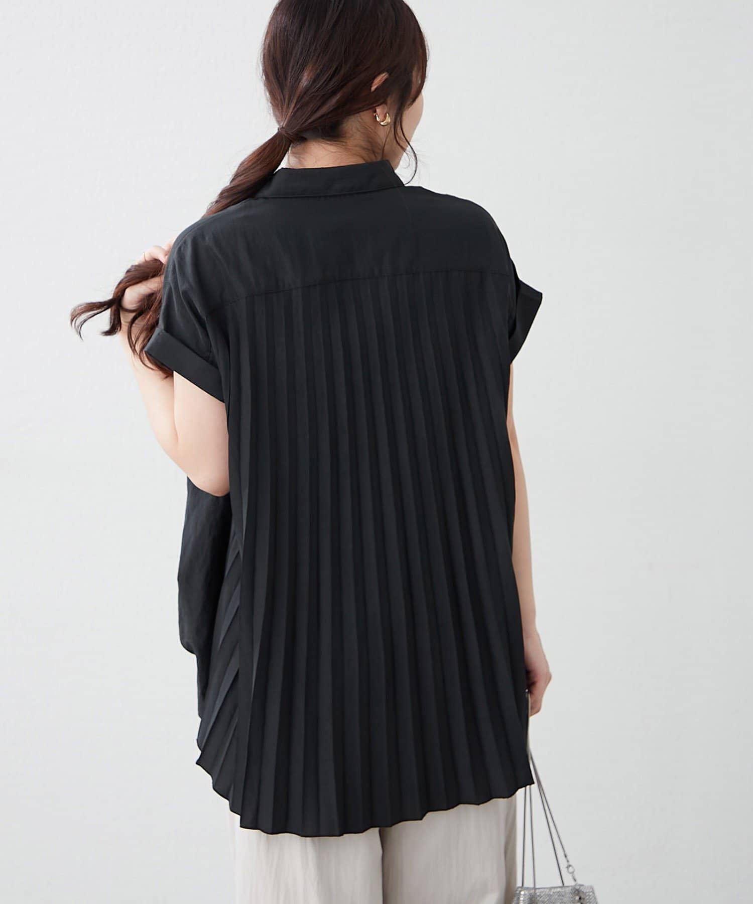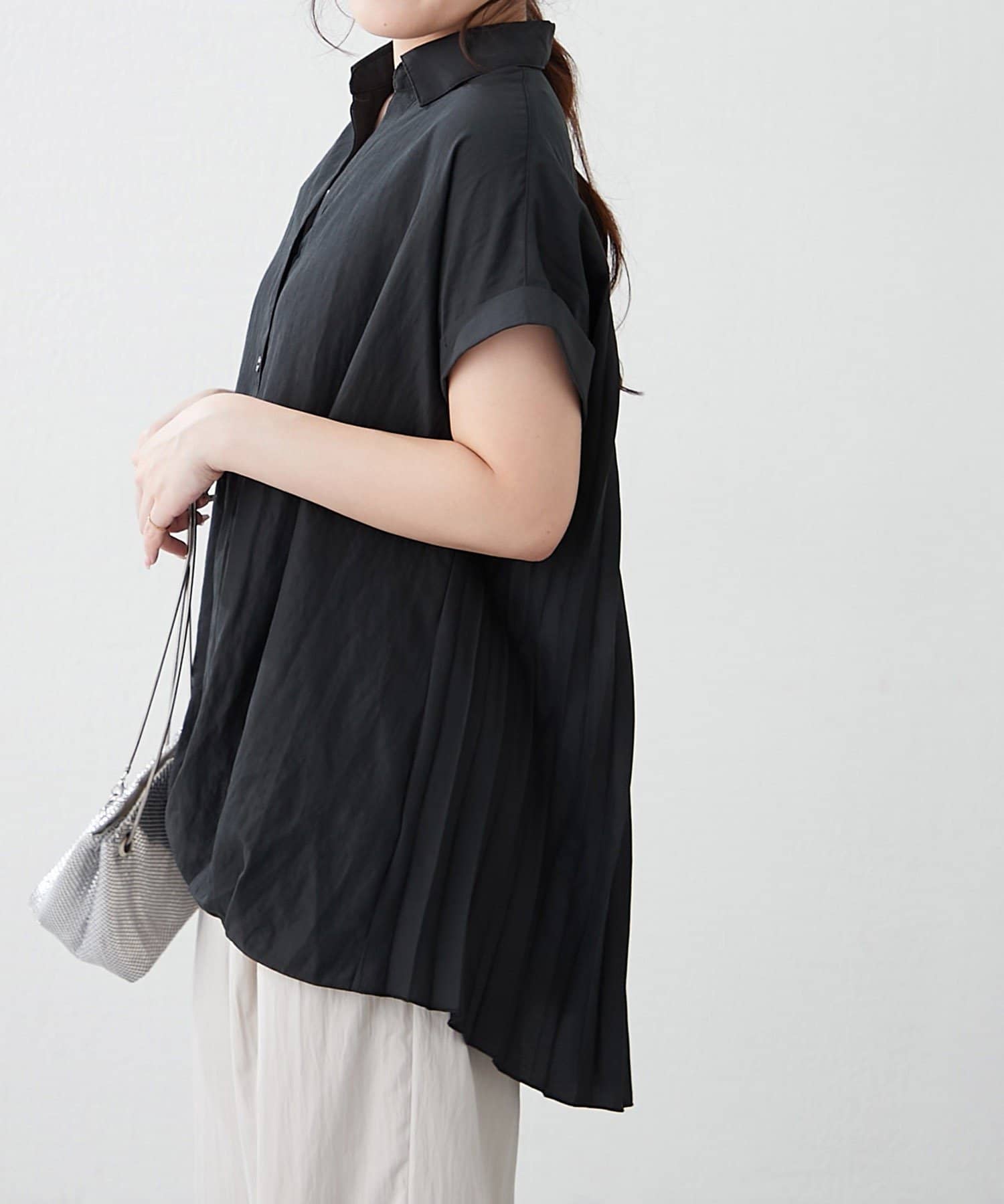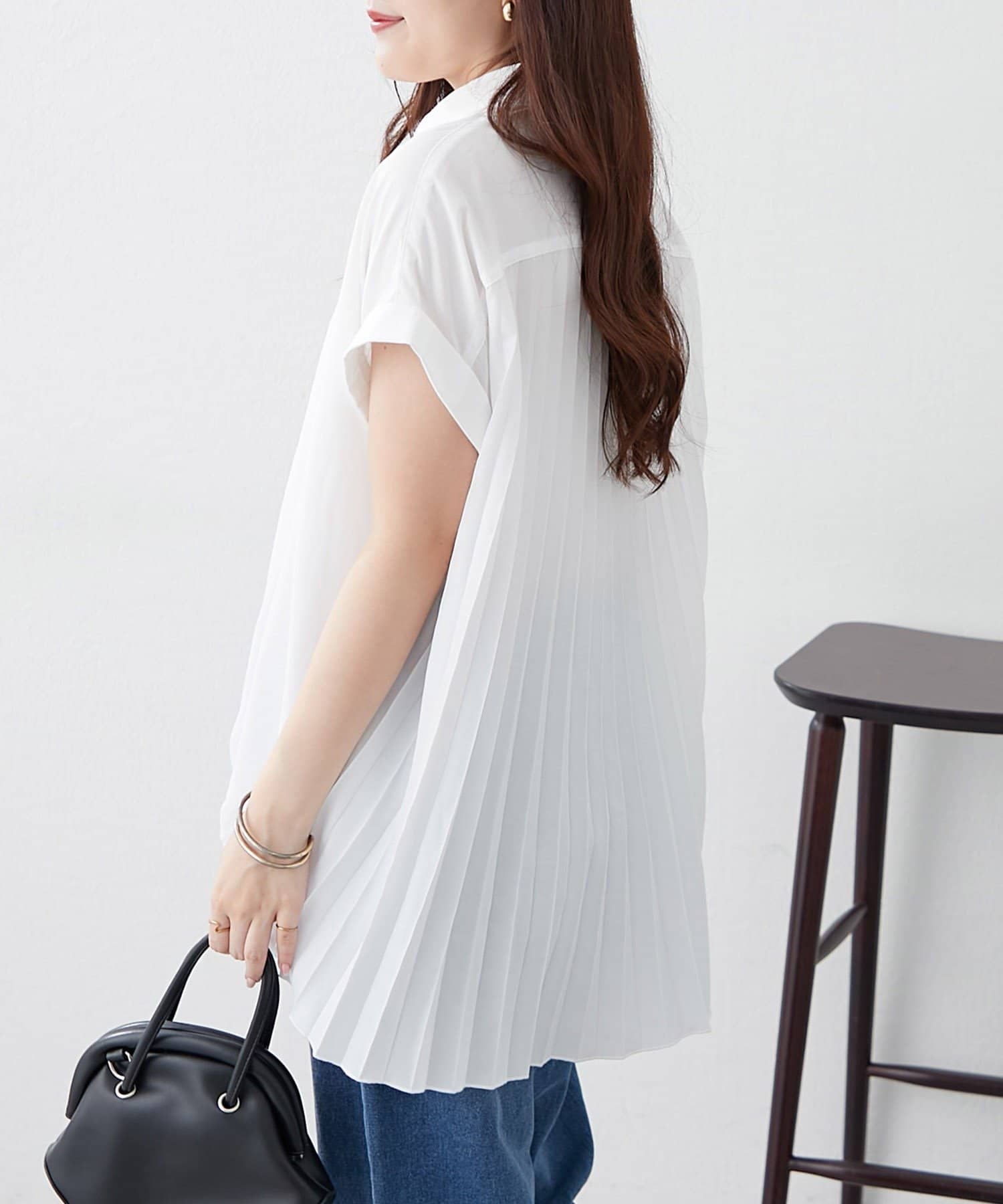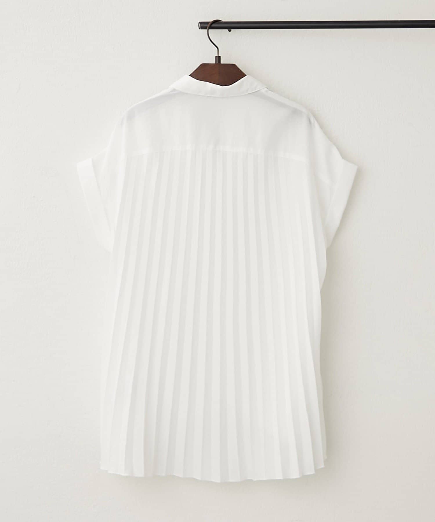 ・一見シンプルなスキッパーシャツブラウスながら、後ろがプリーツになっておりバックスタイルも決まる一枚