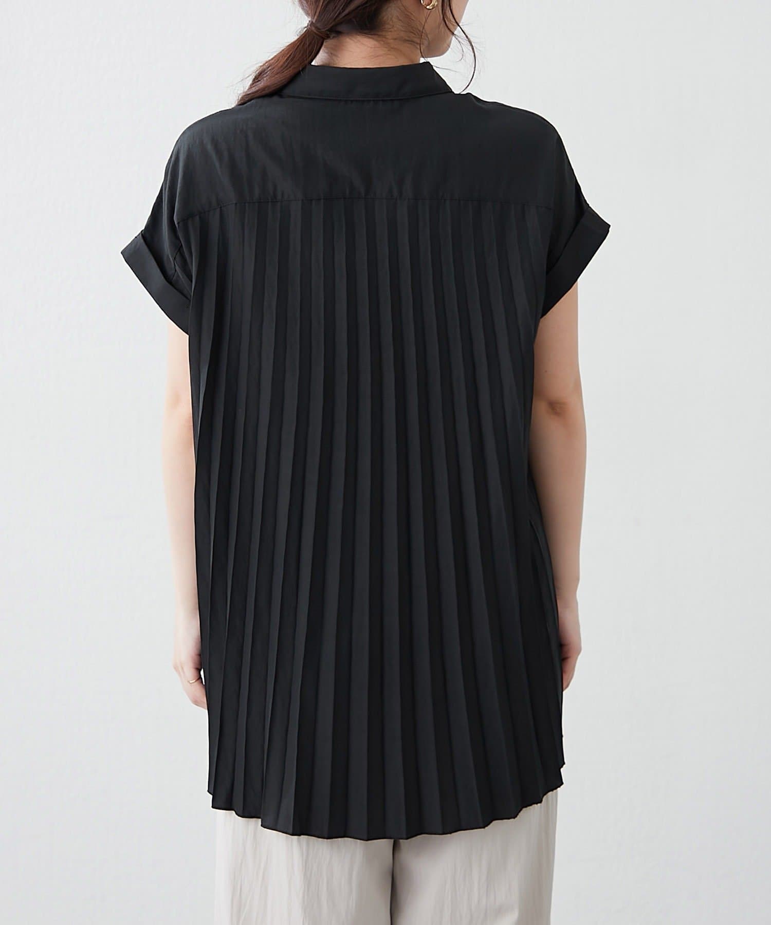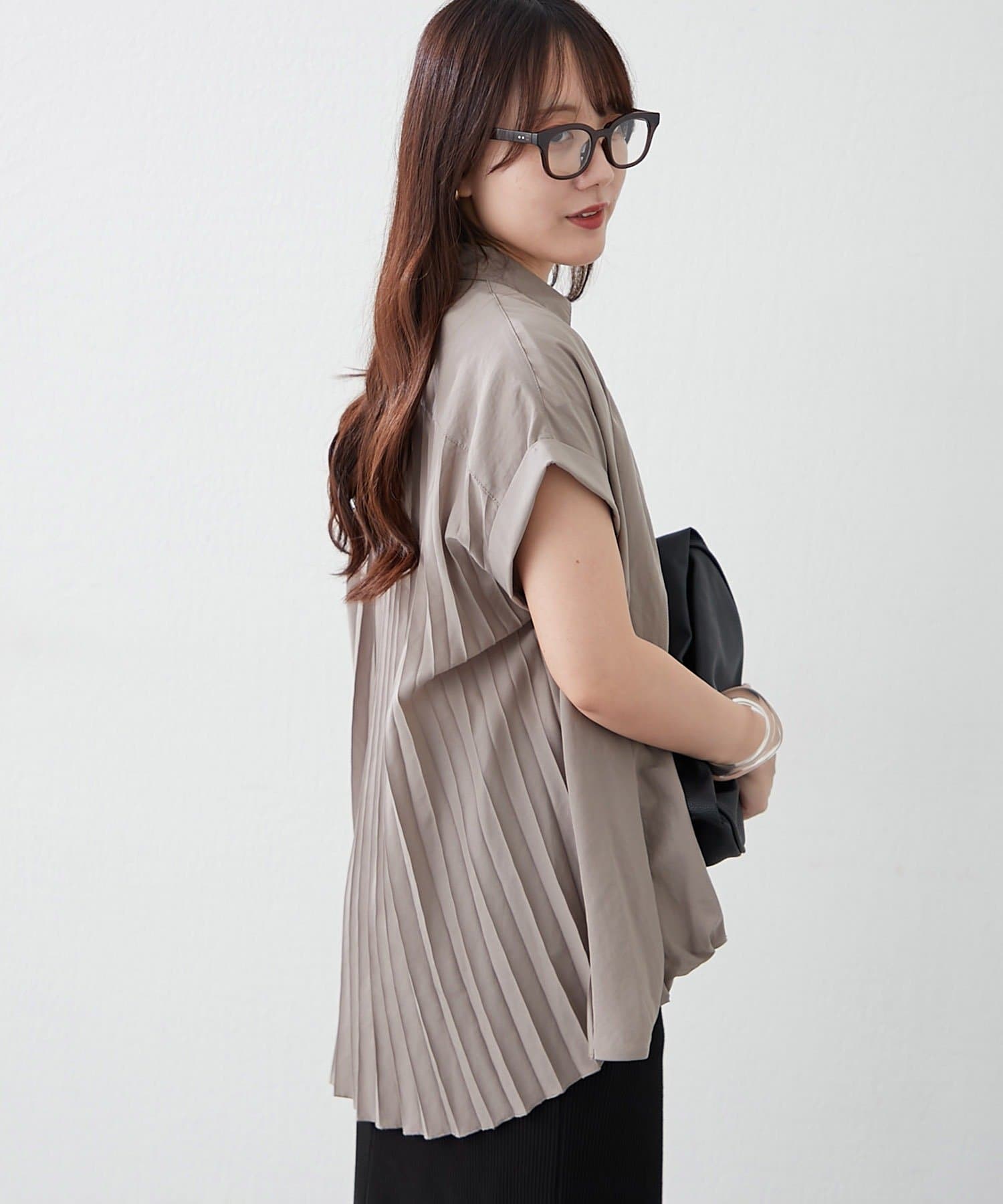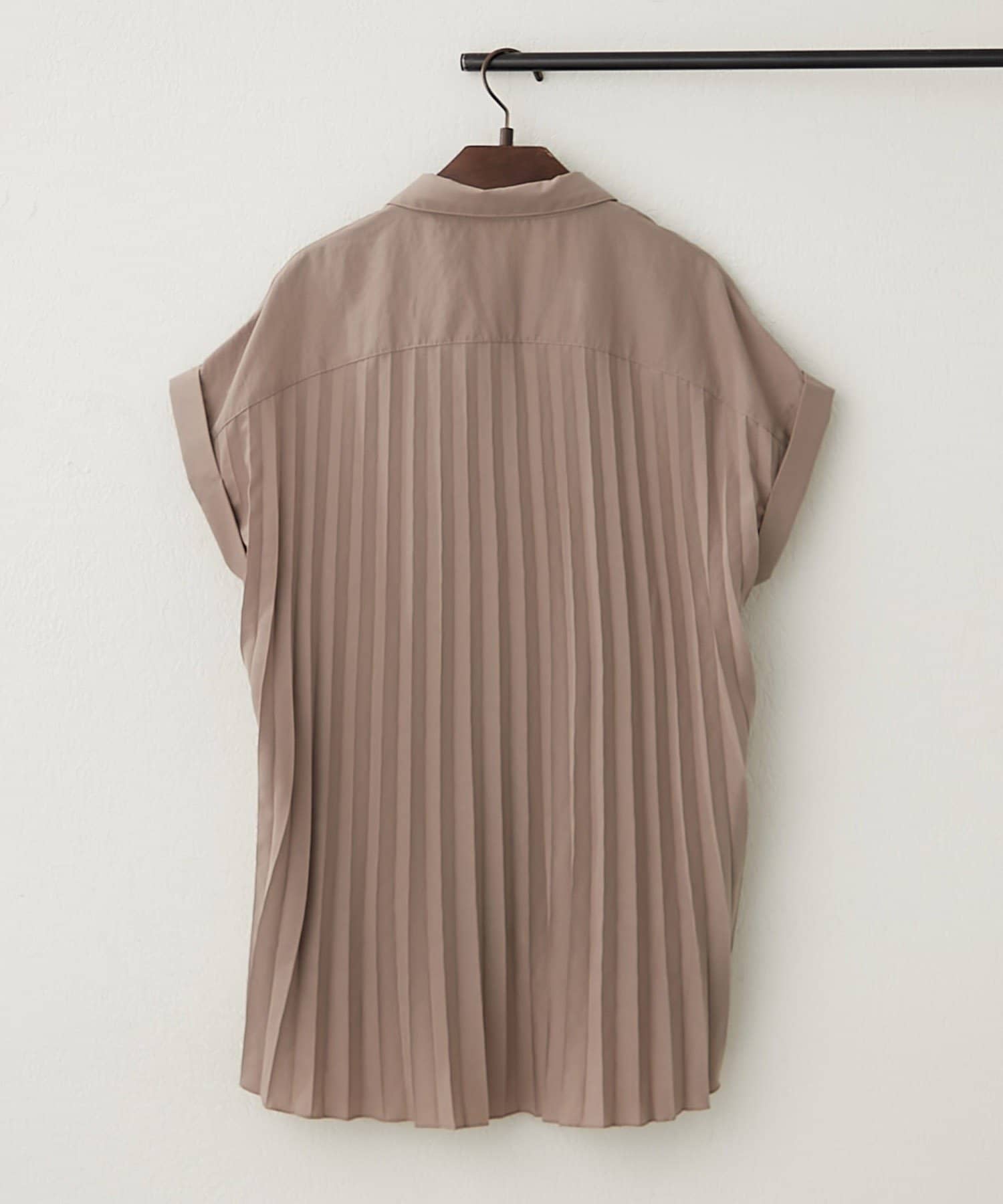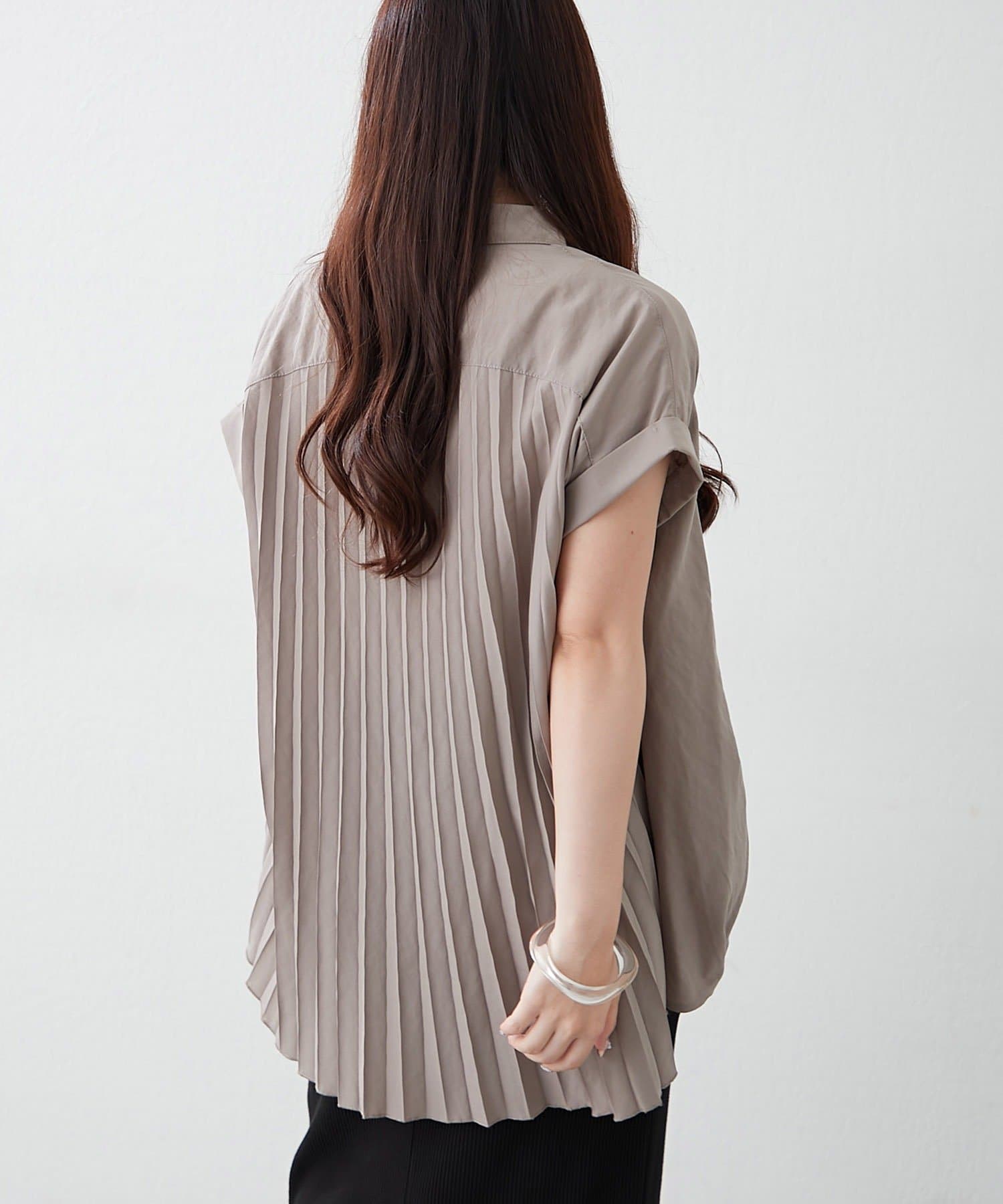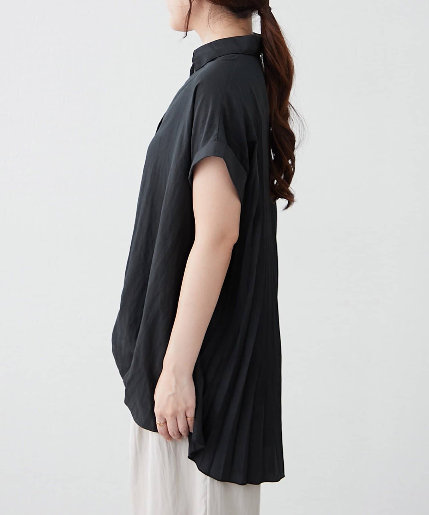 ・一見シンプルなスキッパーシャツブラウスながら、後ろがプリーツになっておりバックスタイルも決まる一枚