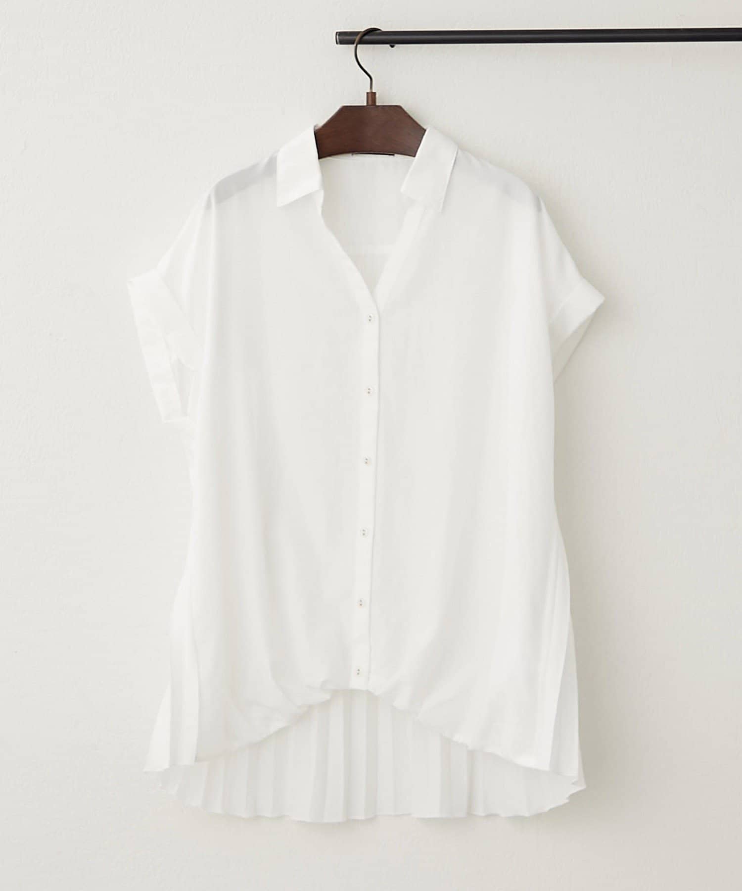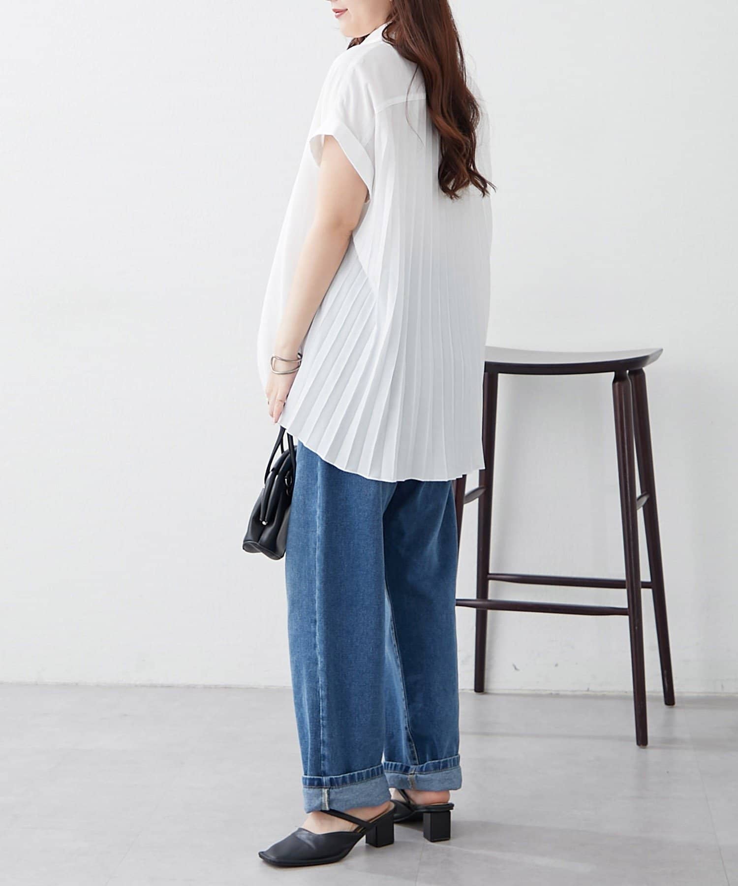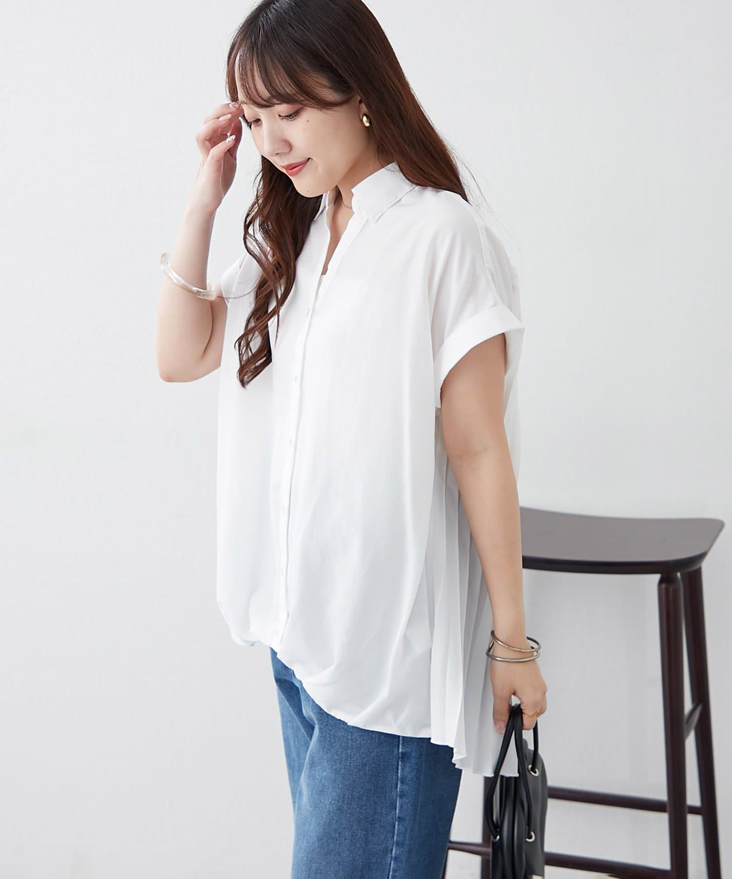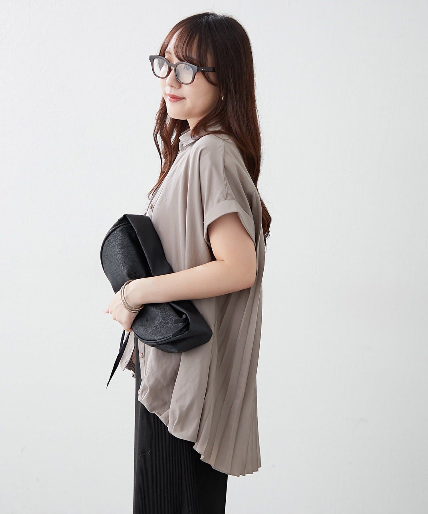 ・一見シンプルなスキッパーシャツブラウスながら、後ろがプリーツになっておりバックスタイルも決まる一枚