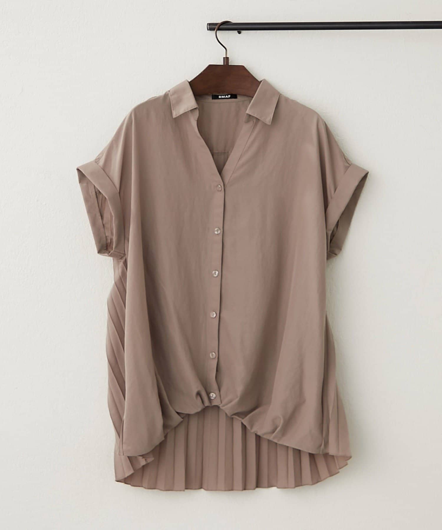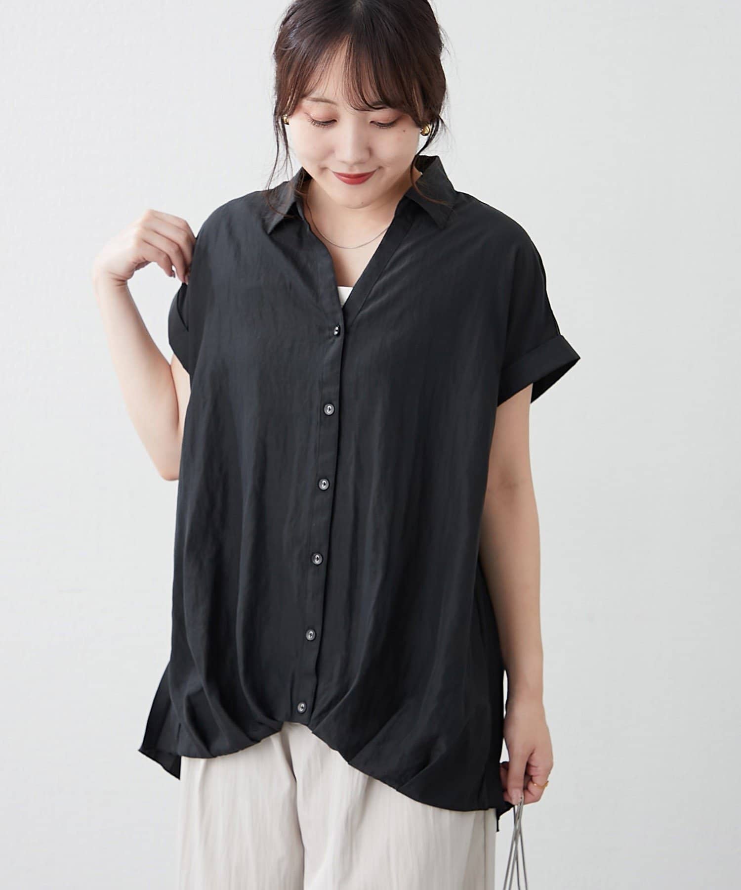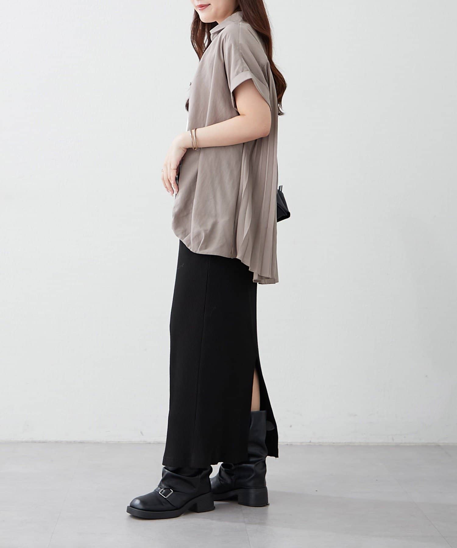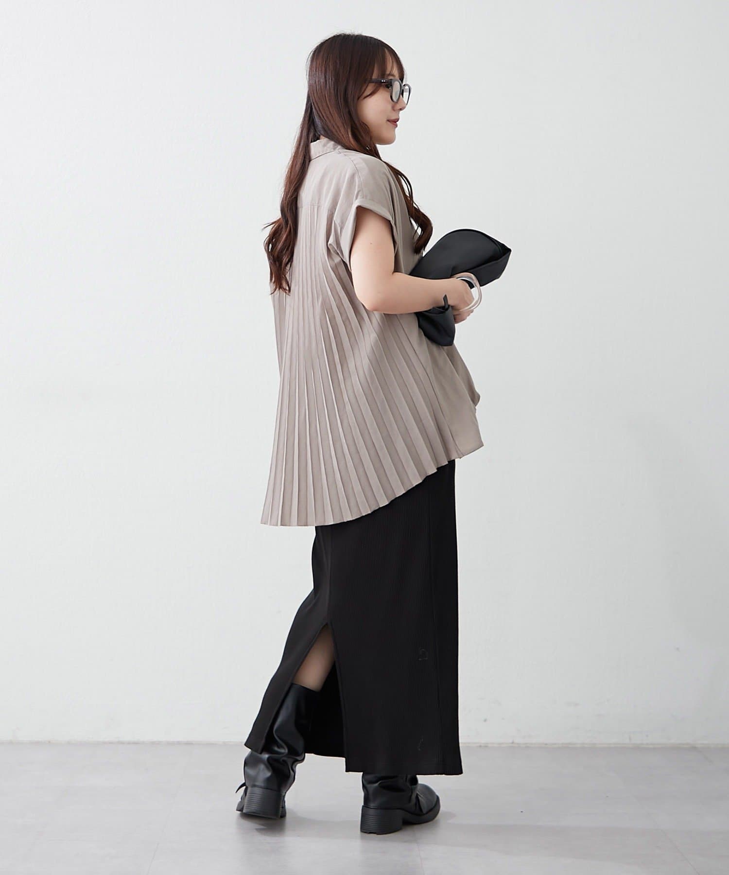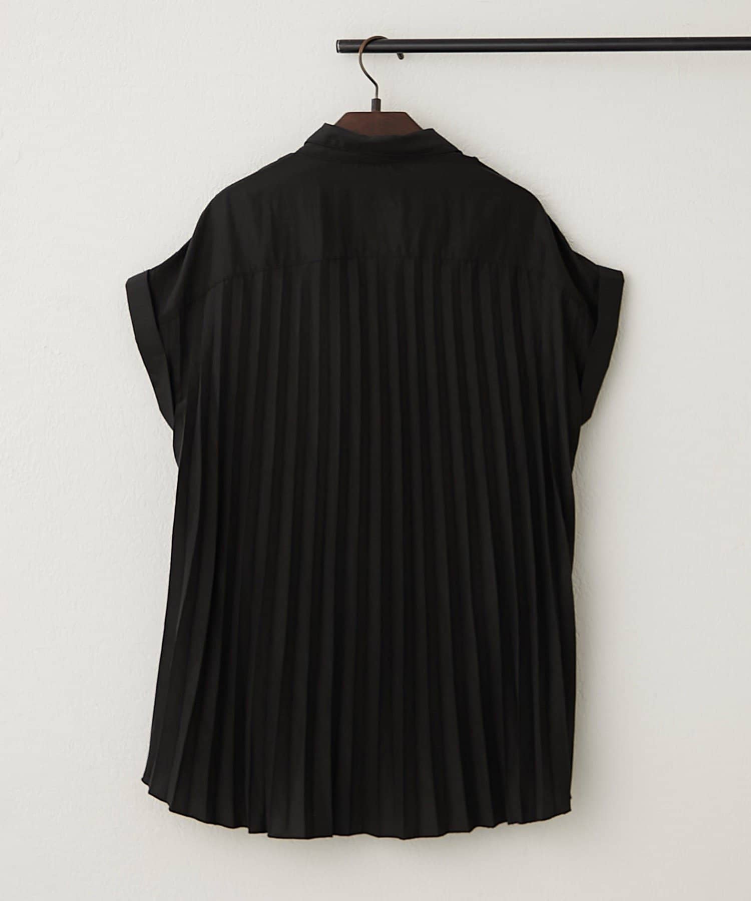 ・一見シンプルなスキッパーシャツブラウスながら、後ろがプリーツになっておりバックスタイルも決まる一枚