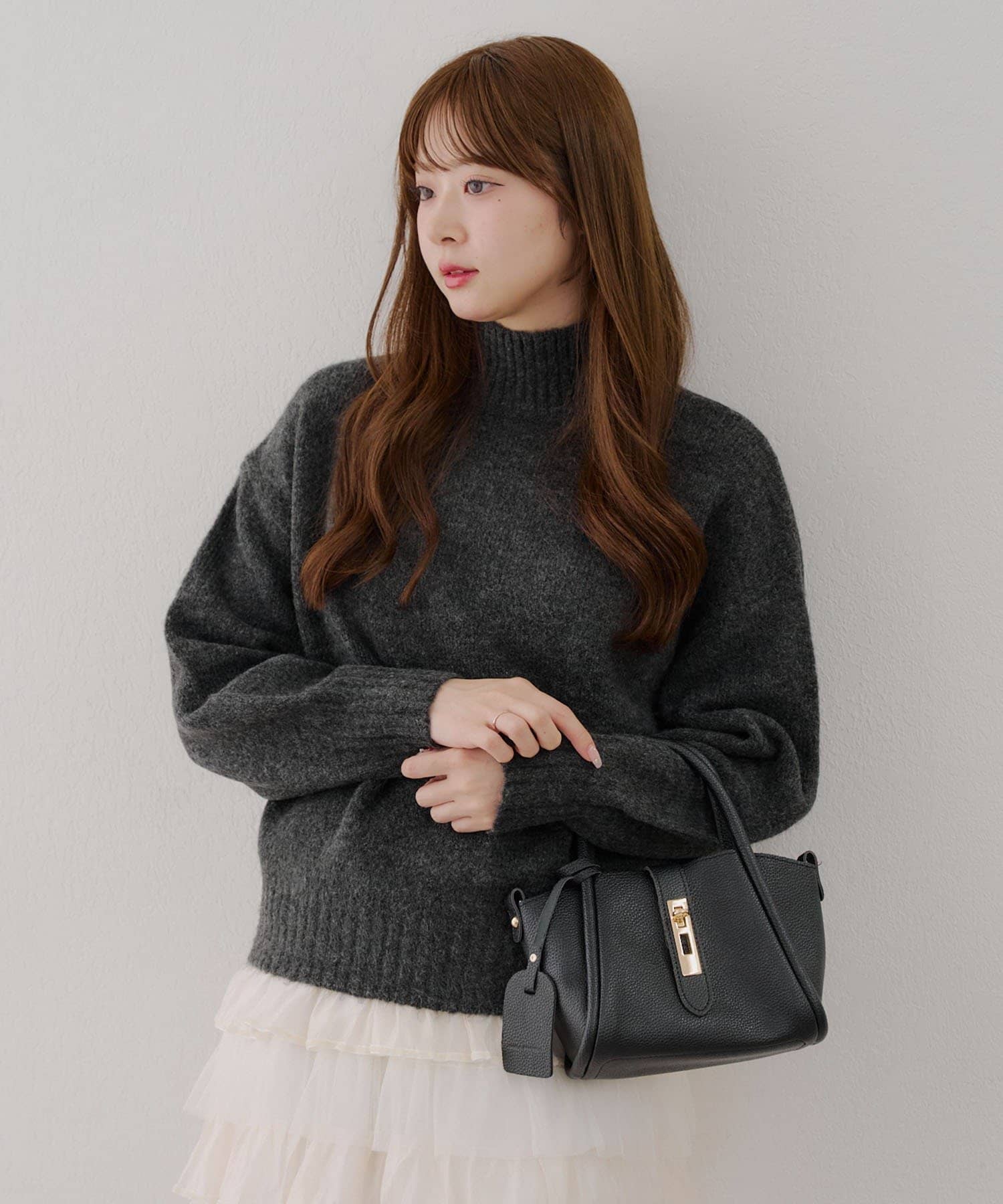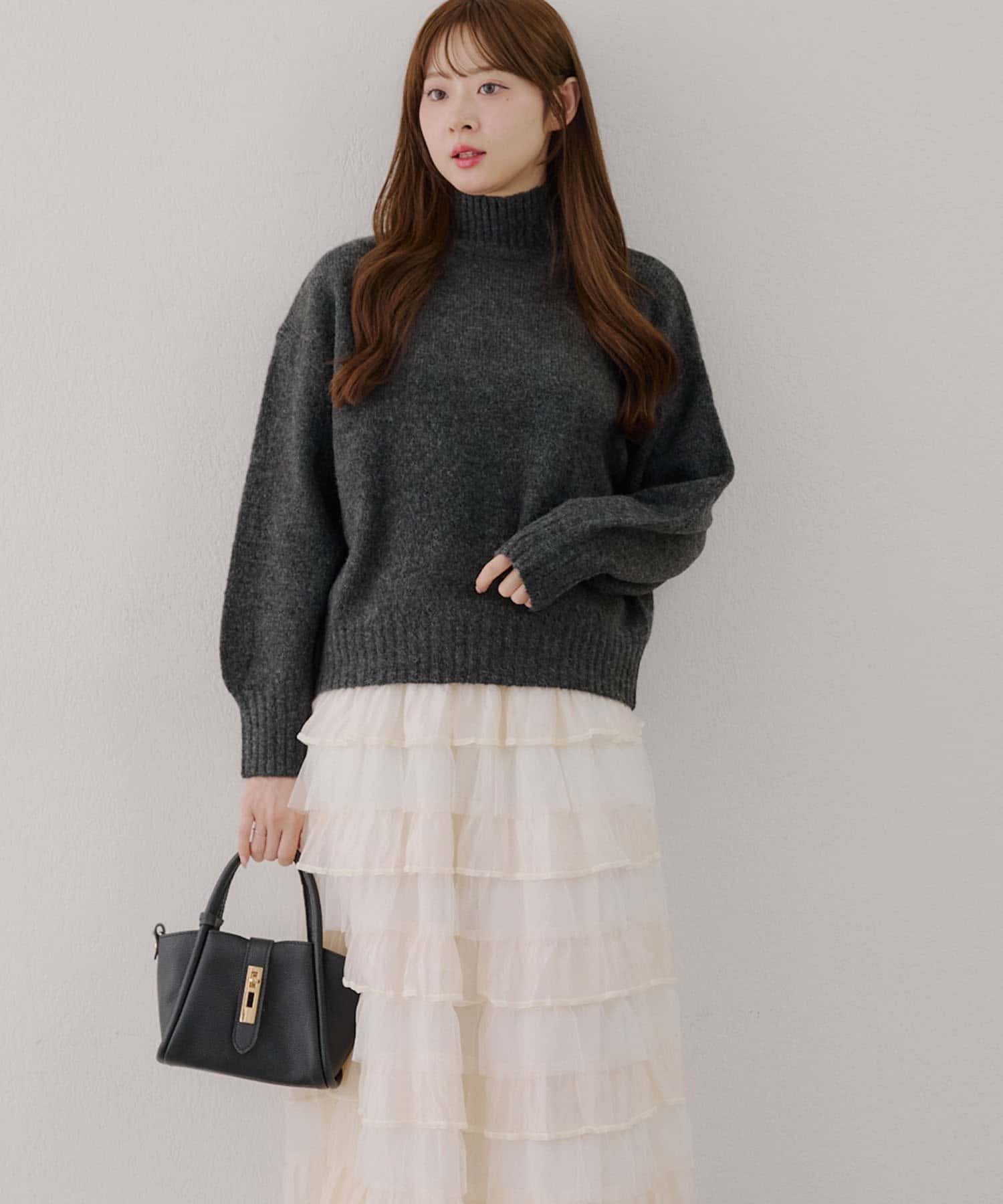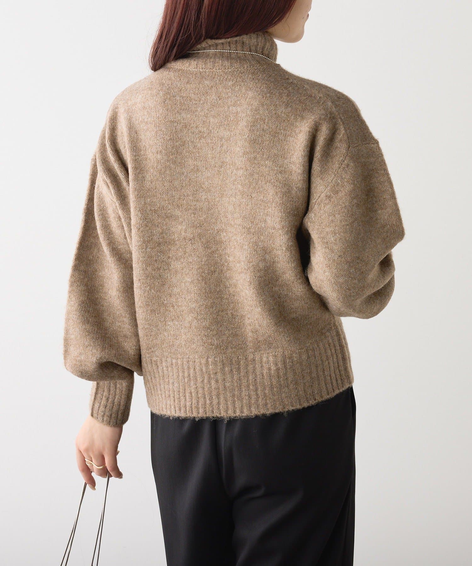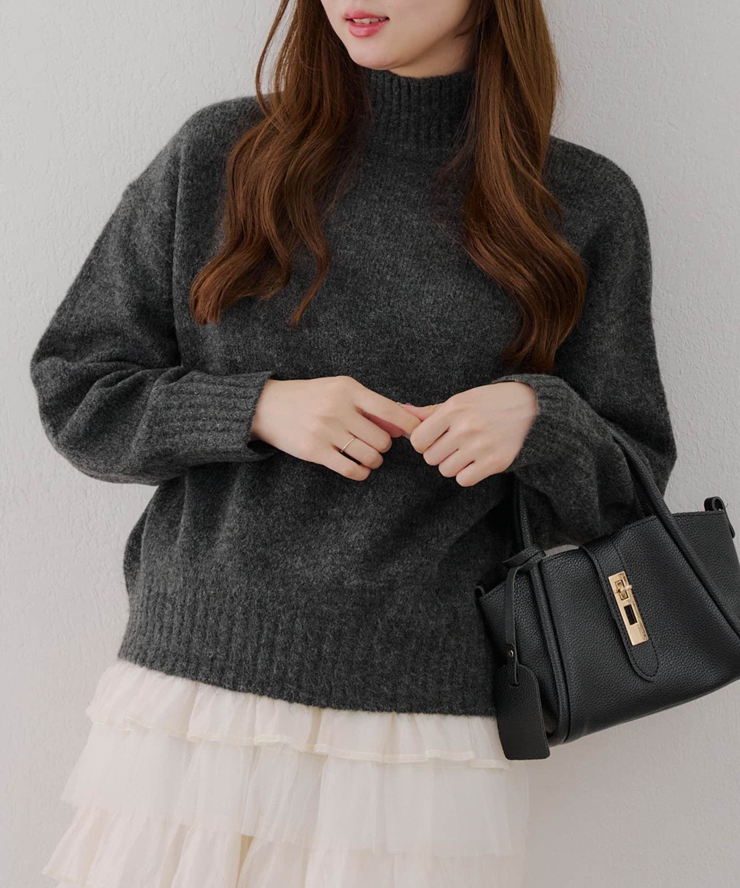 ・首元に余裕のあるアウター合わせるとニットのハイネック部分を見せることが出来ます。