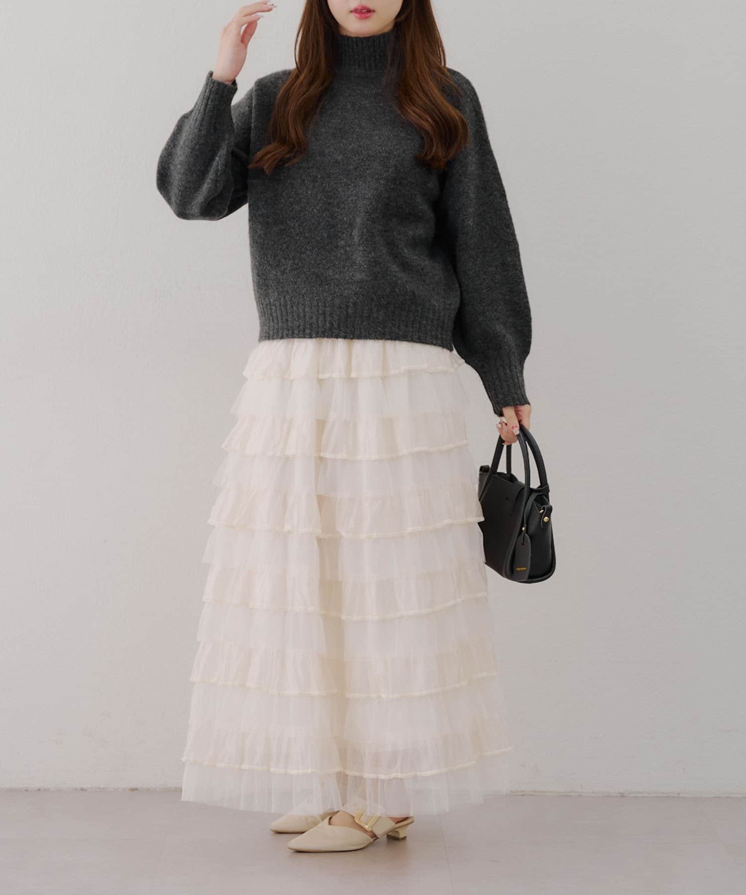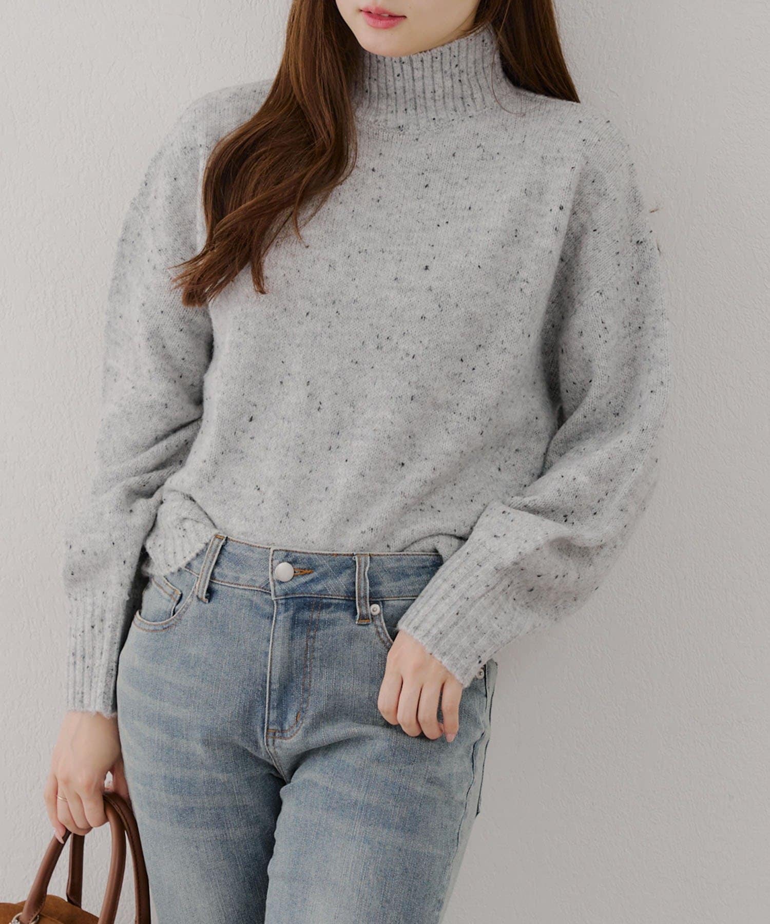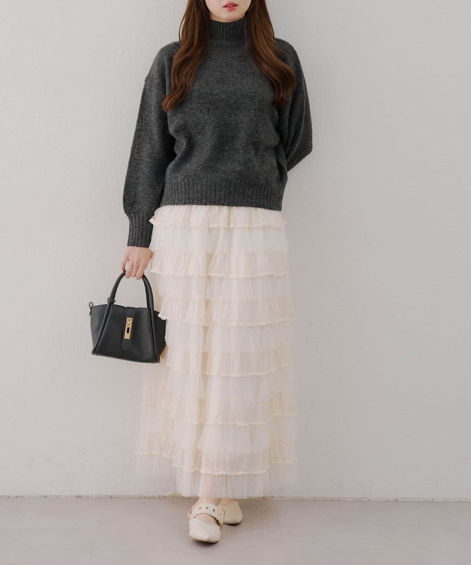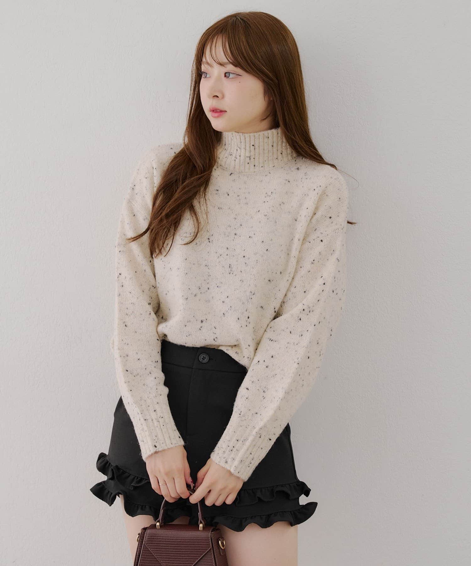 ・首元に余裕のあるアウター合わせるとニットのハイネック部分を見せることが出来ます。
