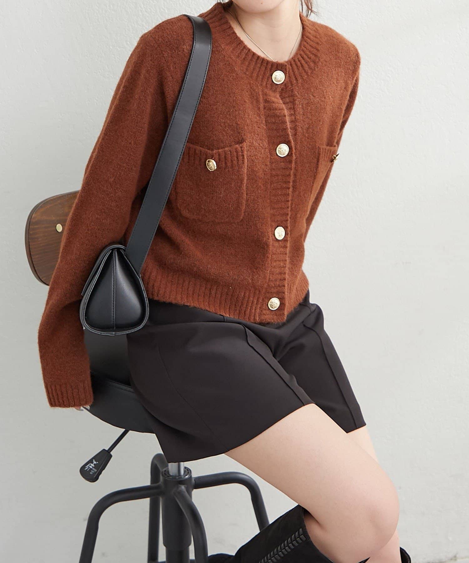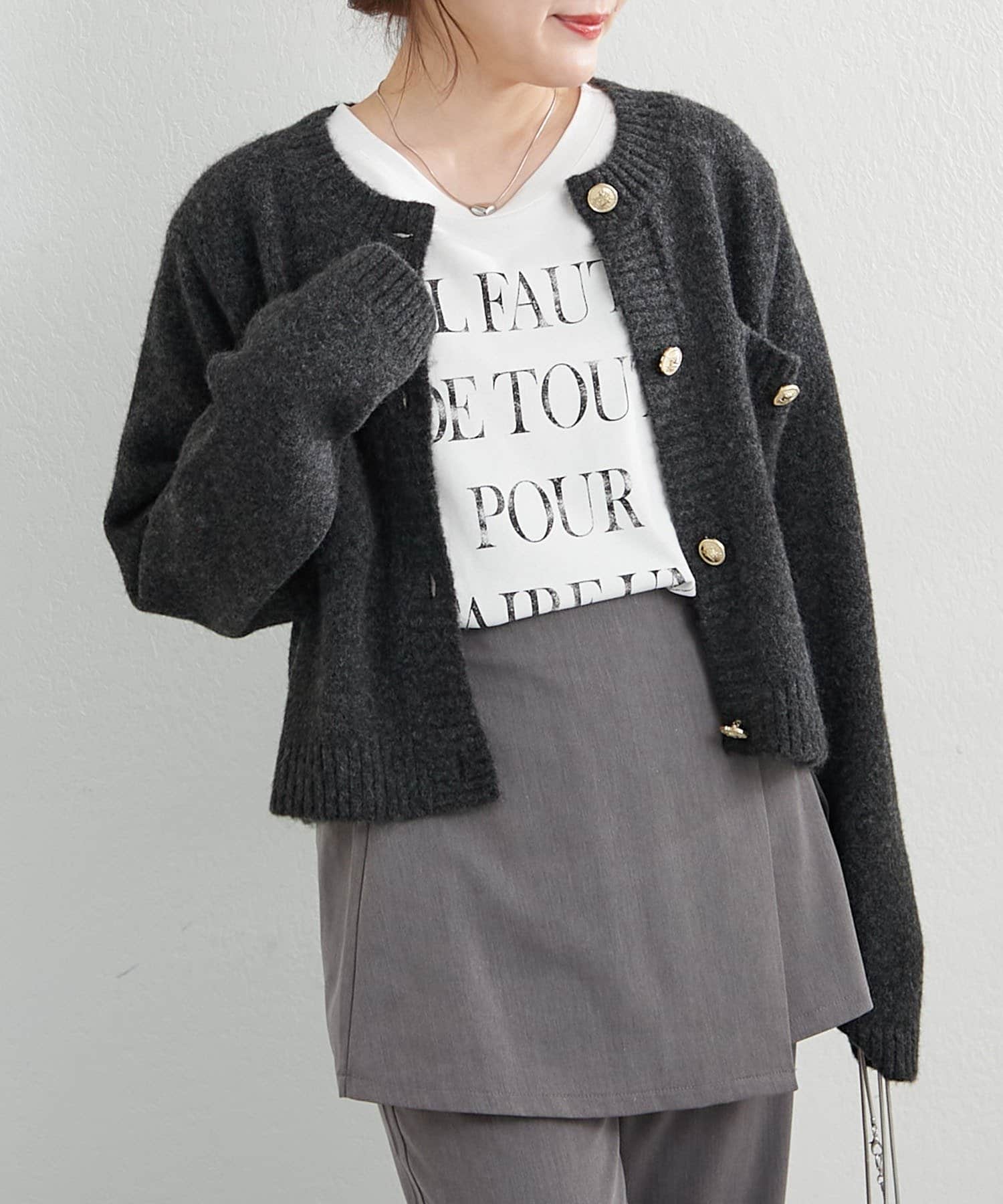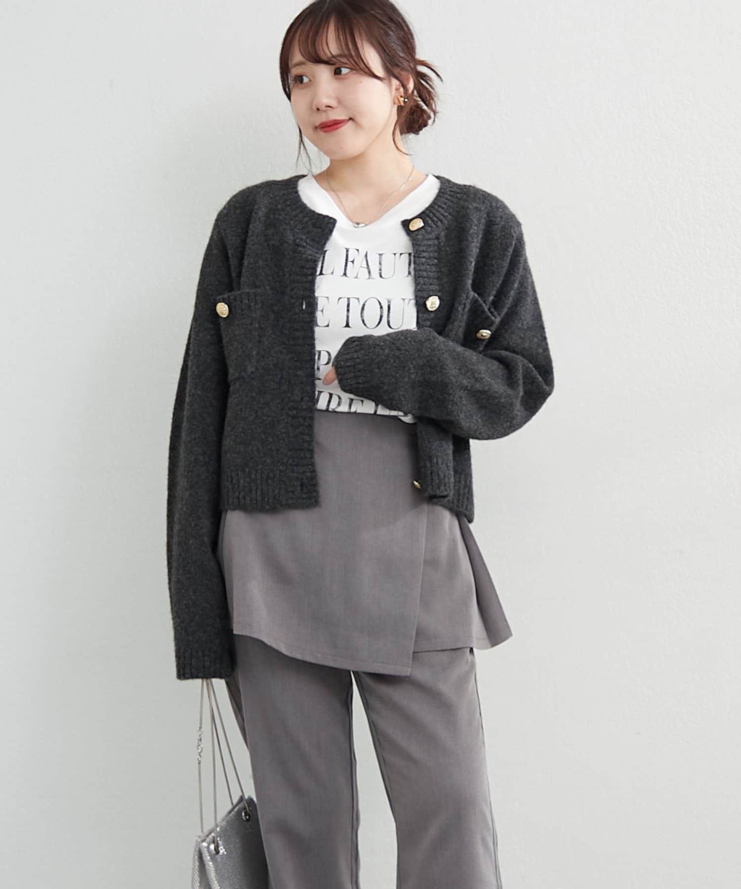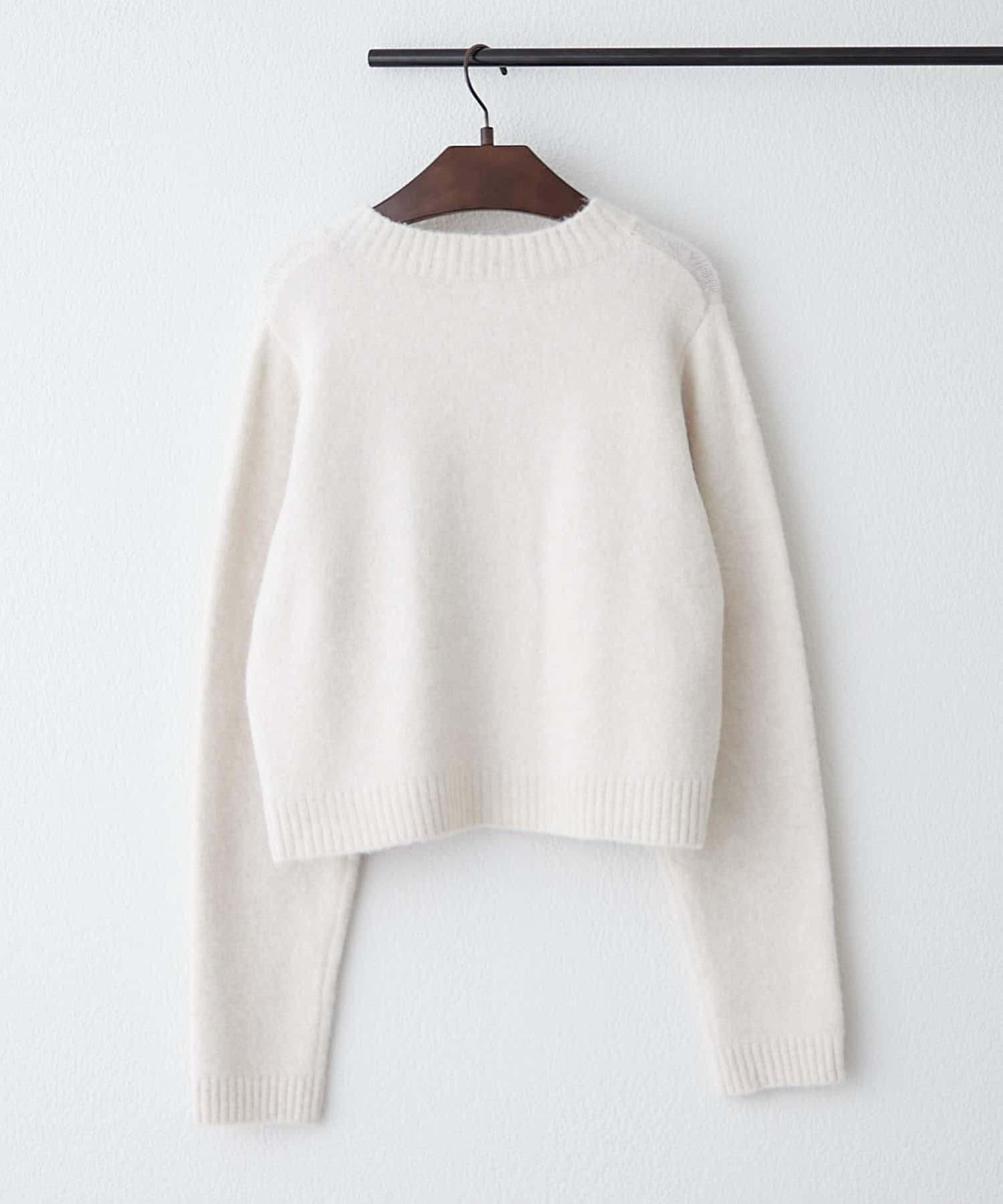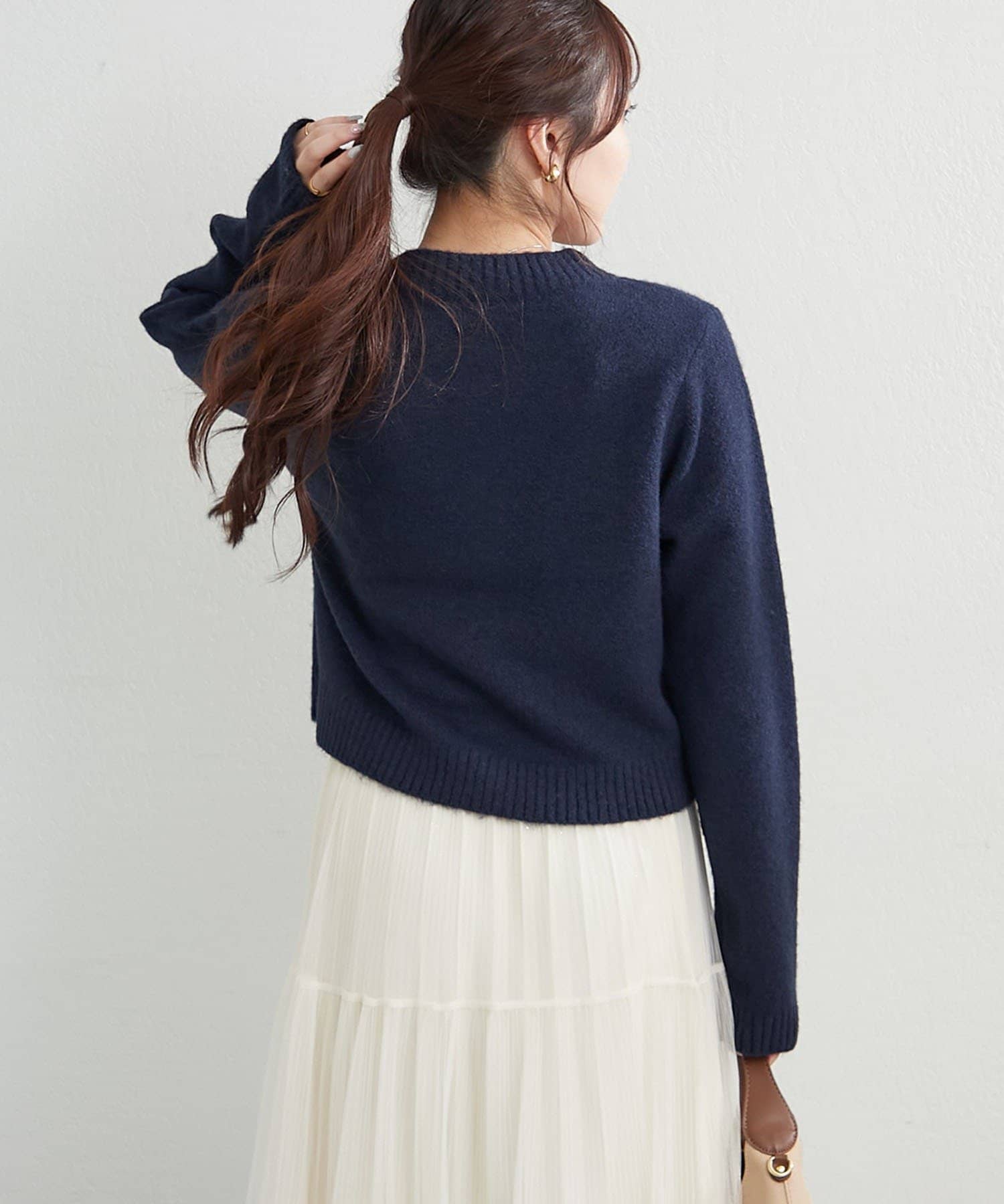 ・クルーネックなのでカーディガン使いだけでなく、一枚着トップスとしての着こなしもできます