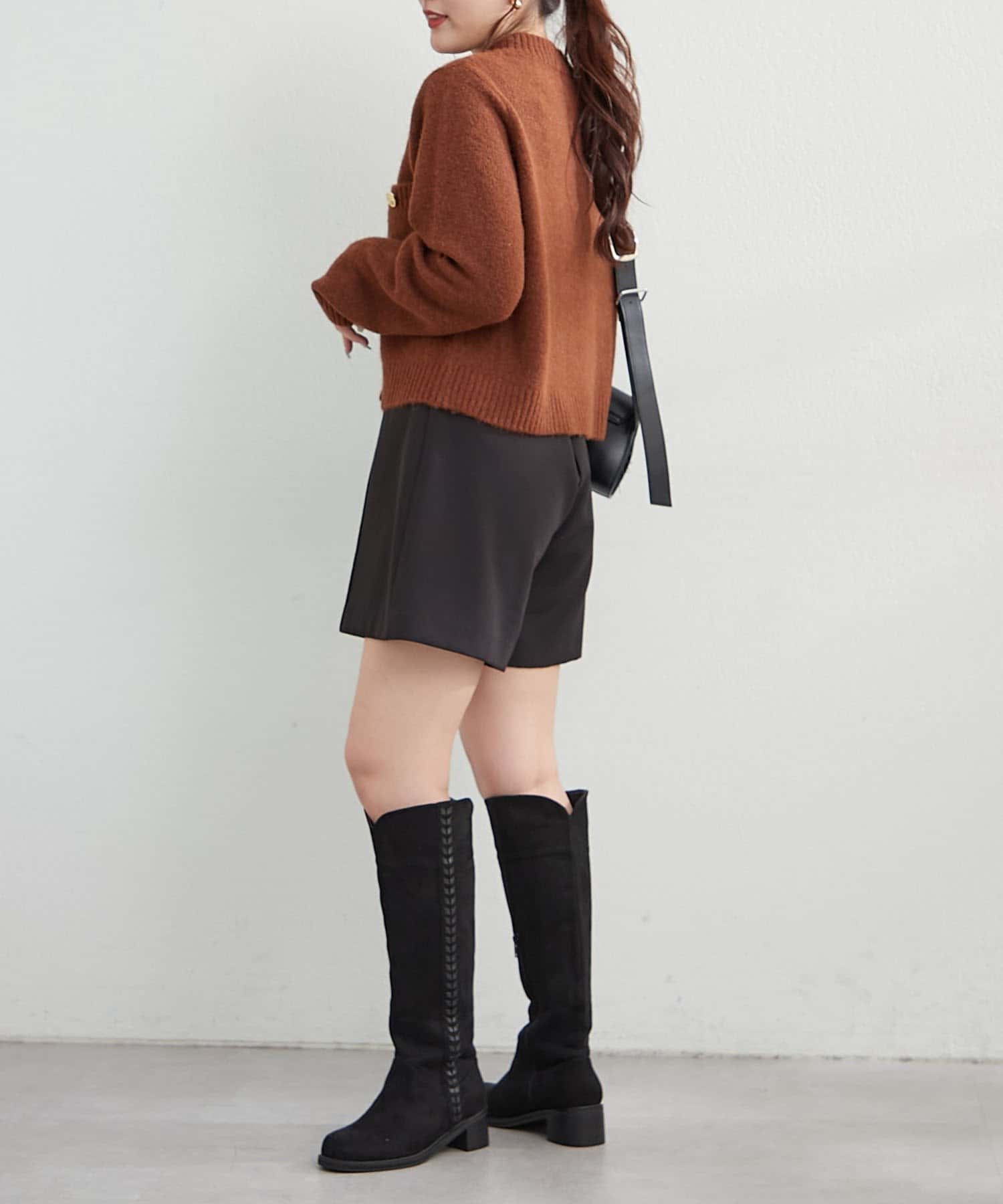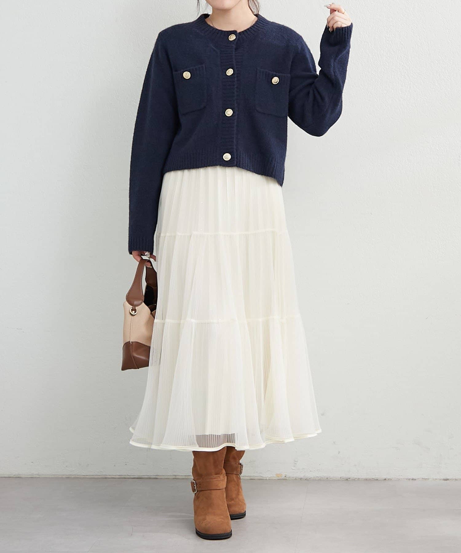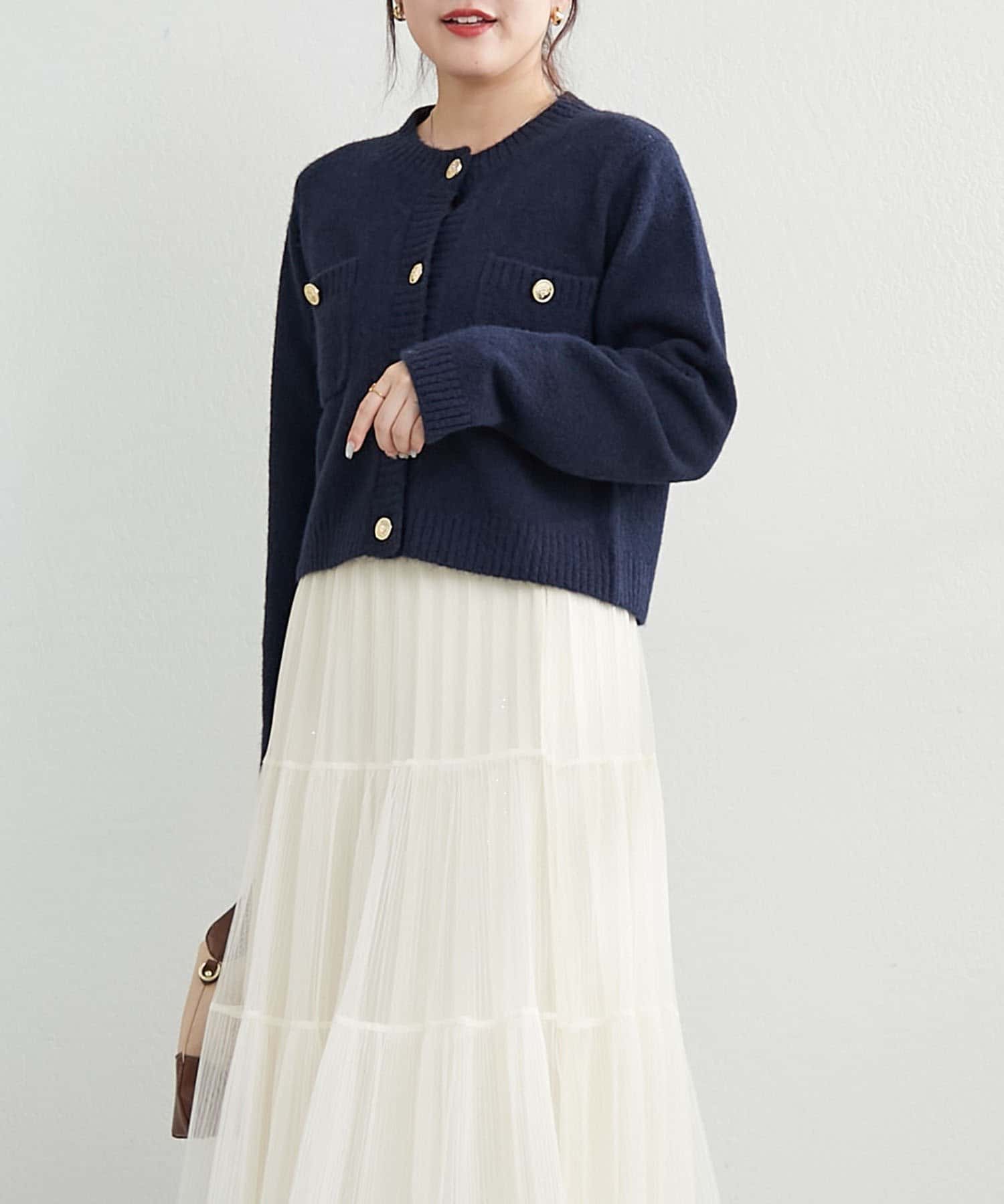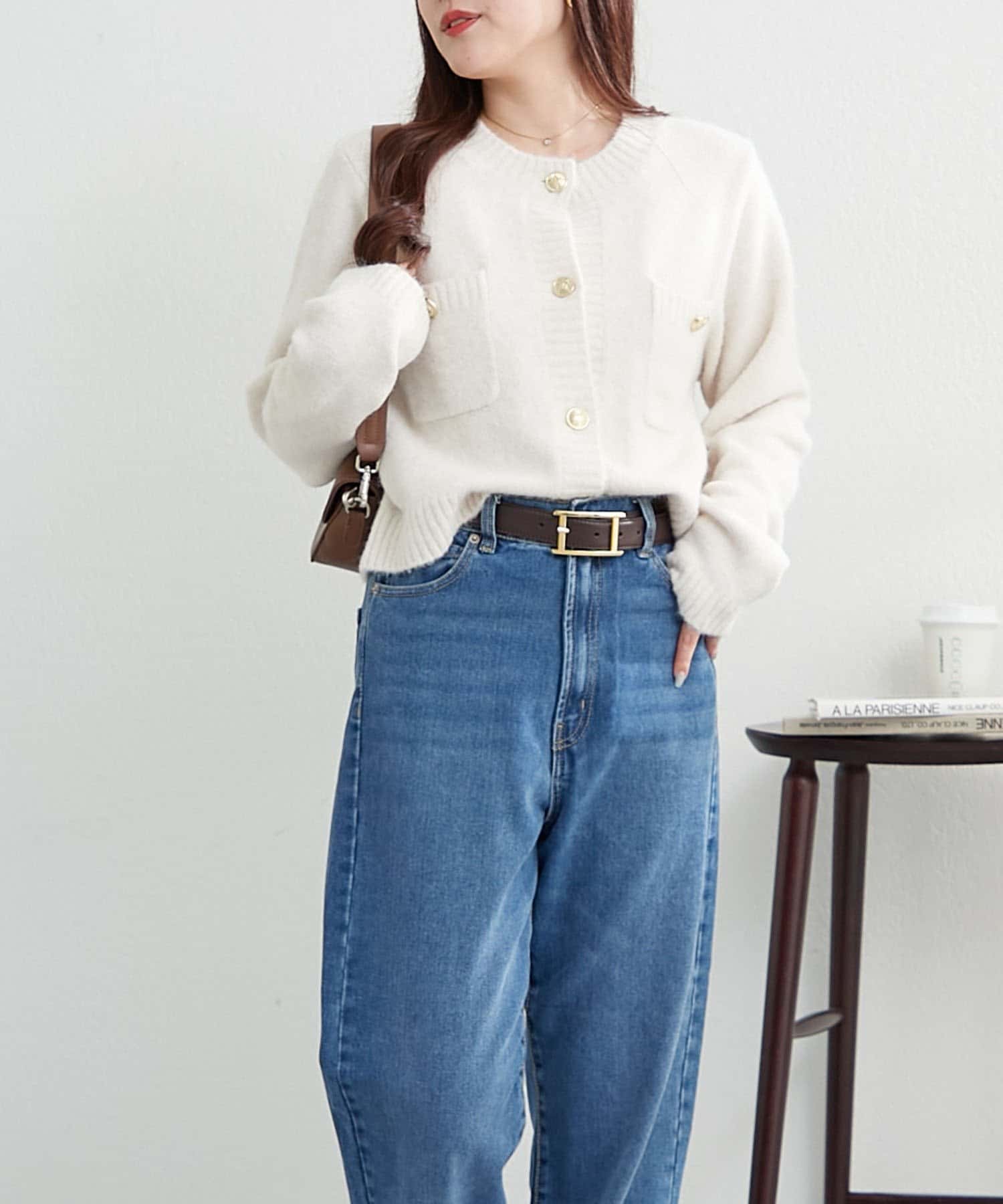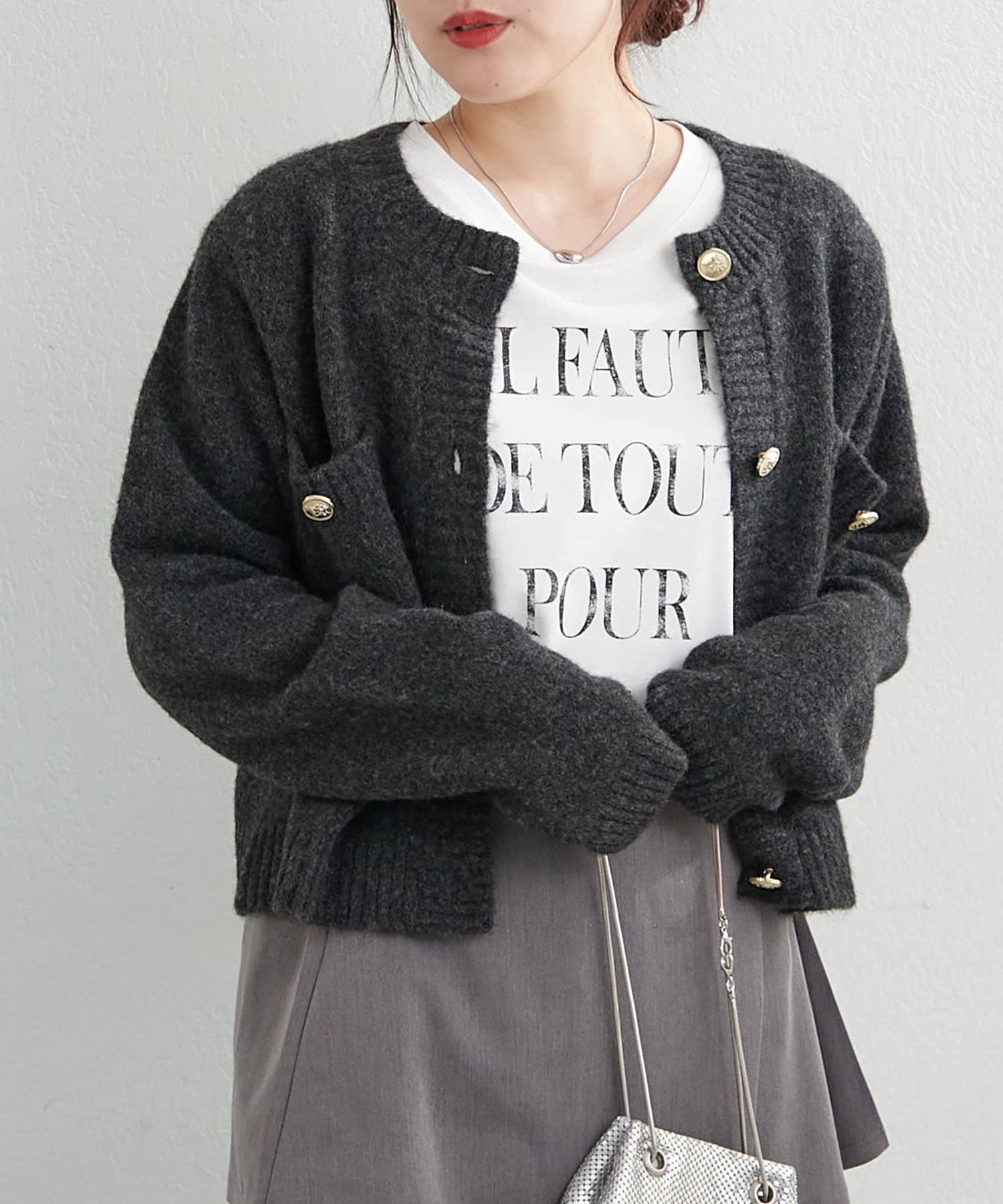 ・クルーネックなのでカーディガン使いだけでなく、一枚着トップスとしての着こなしもできます