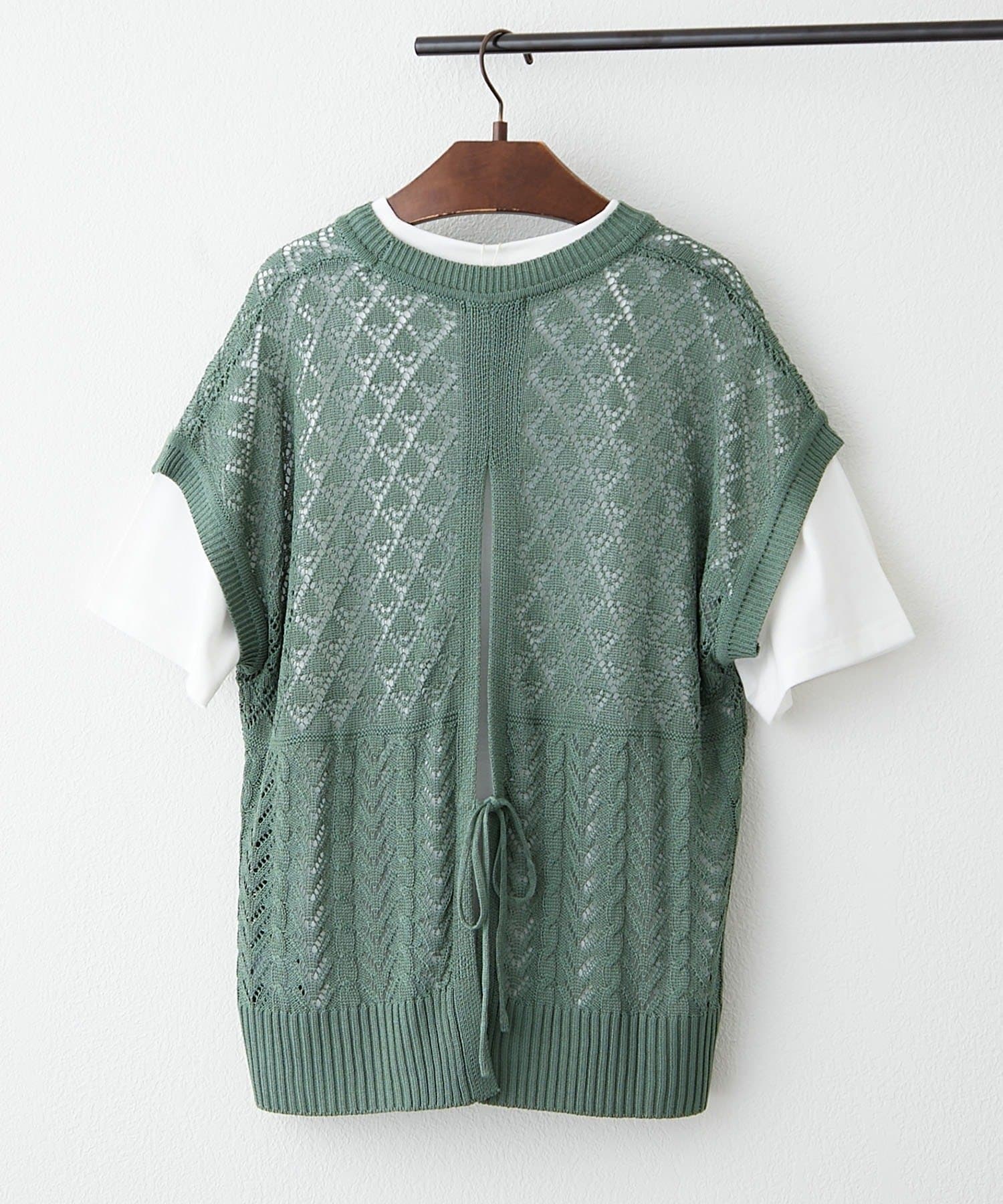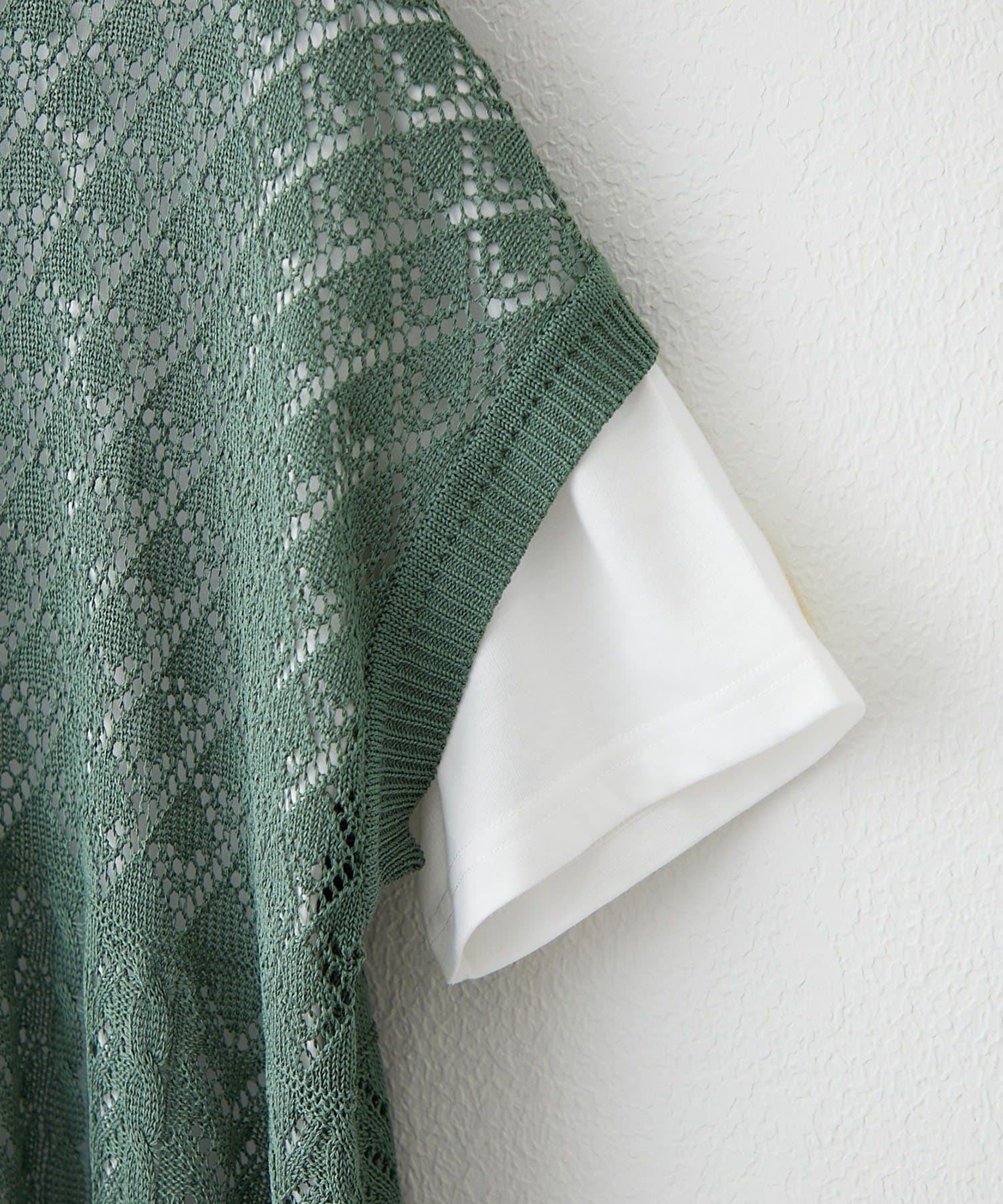着回しの効く透かし編みベストとシンプルなTシャツの人気セットアイテム