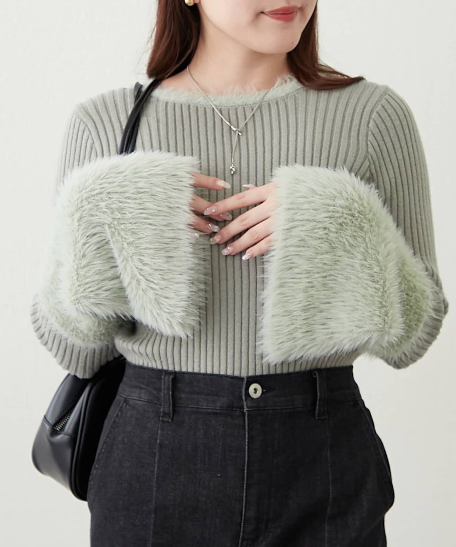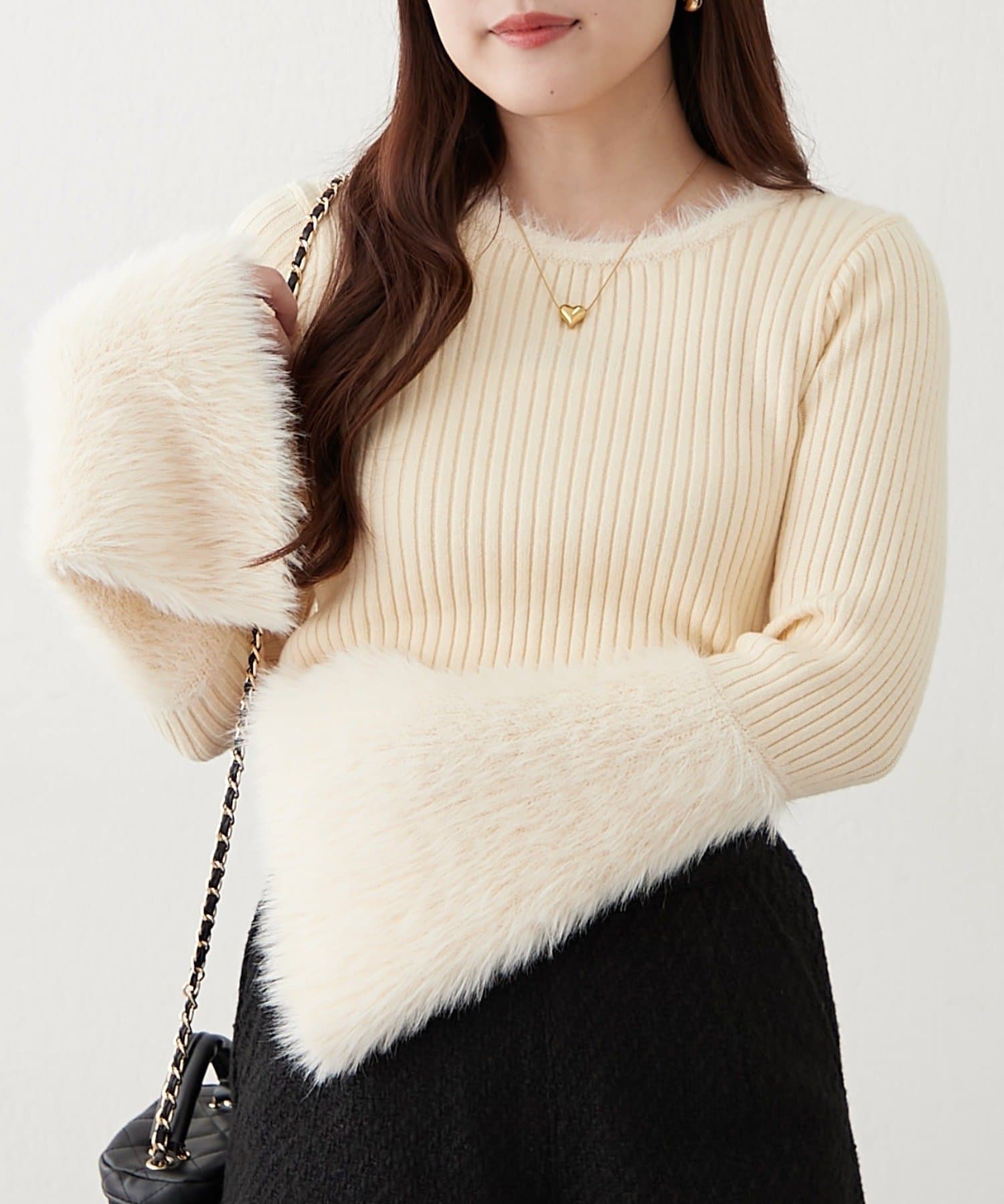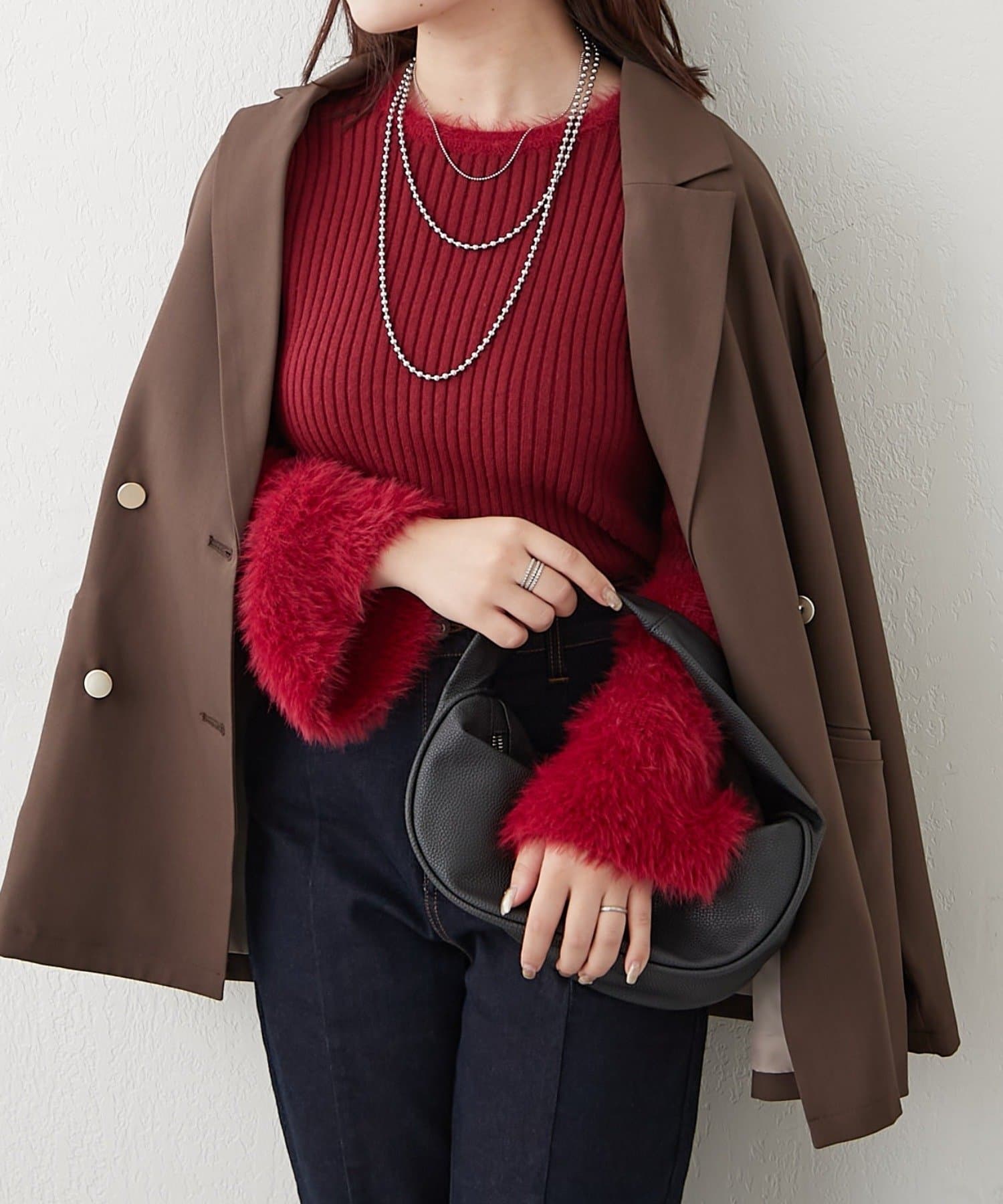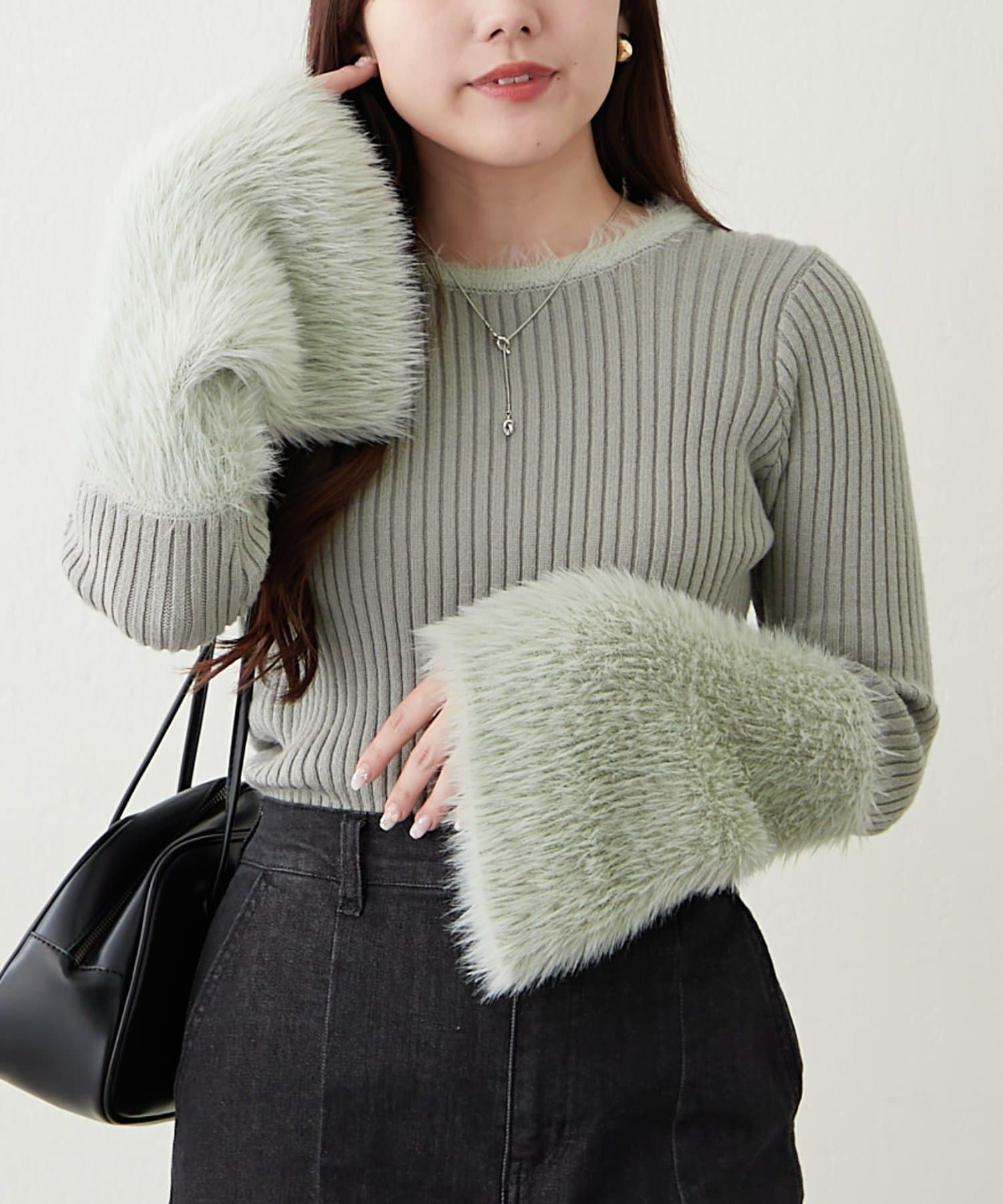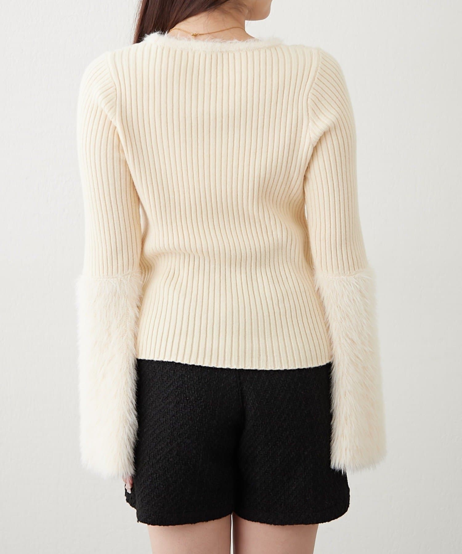 ・襟元と袖がフェザーヤーンになったニットプルオーバー