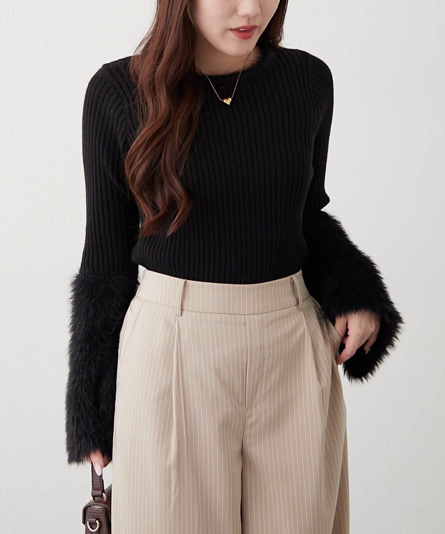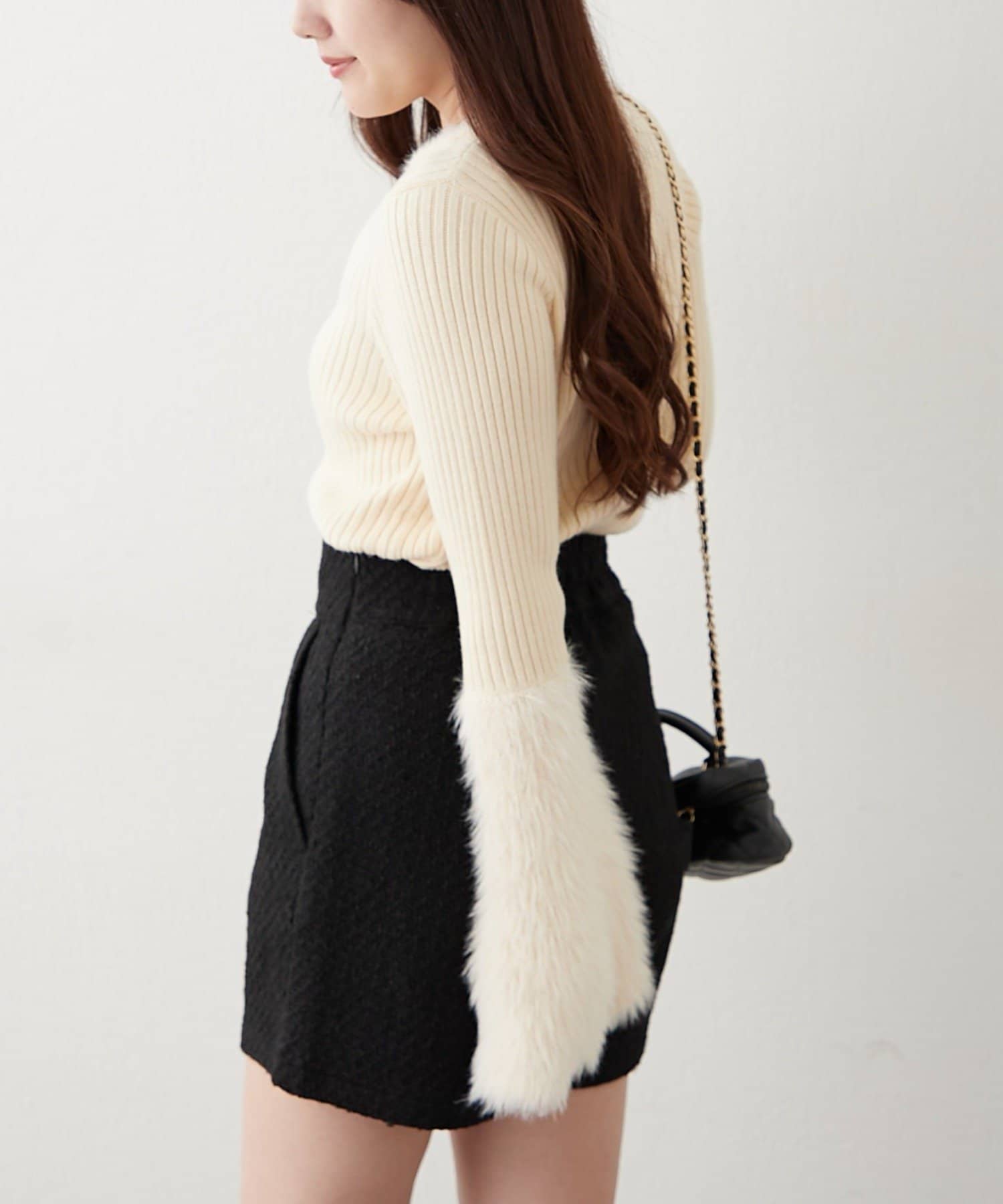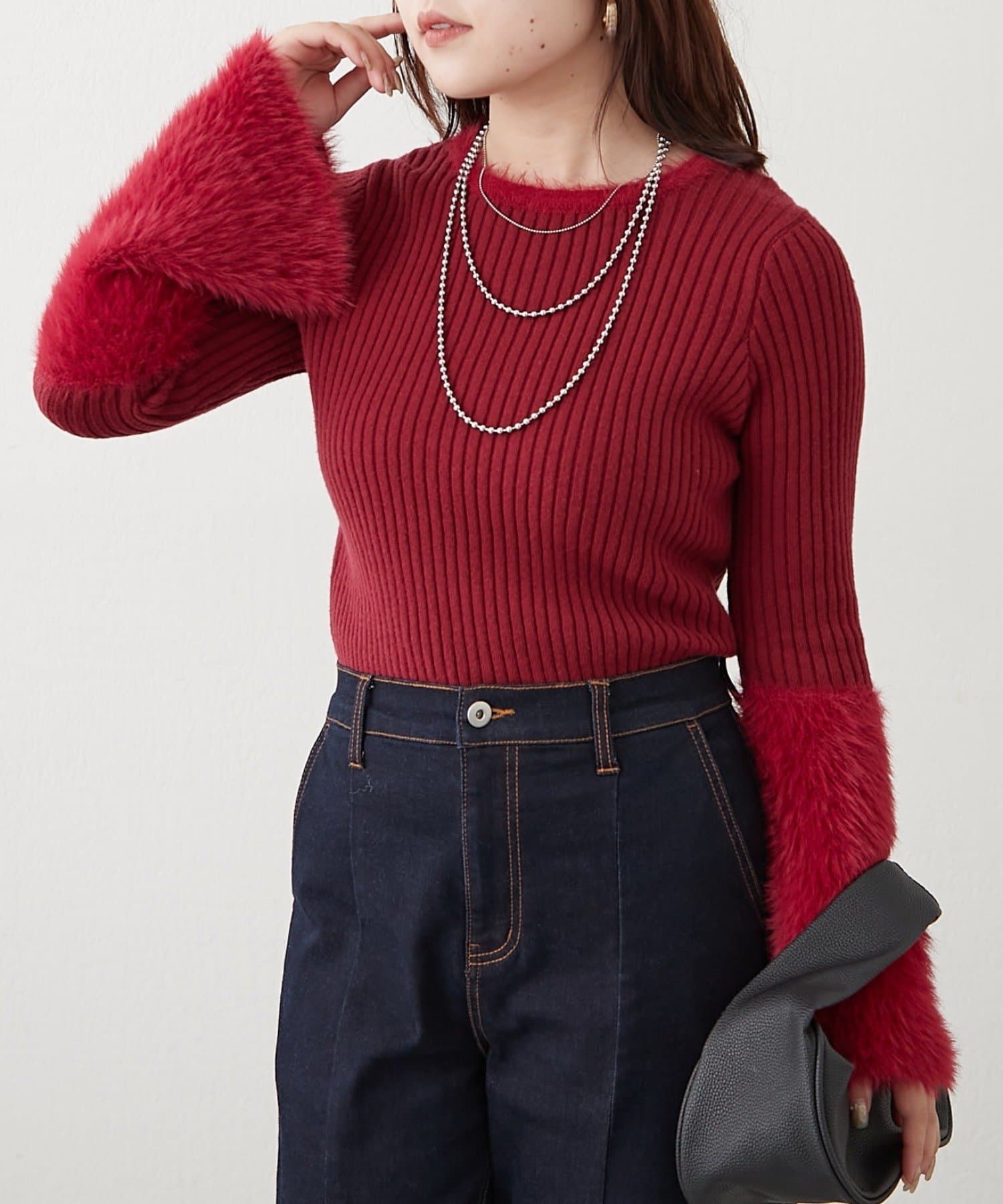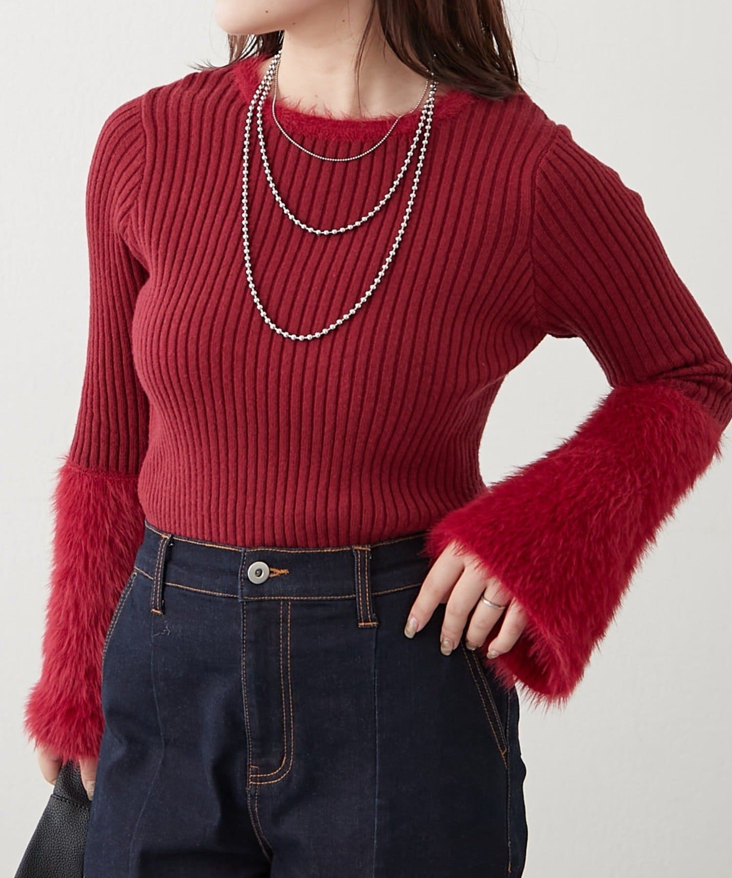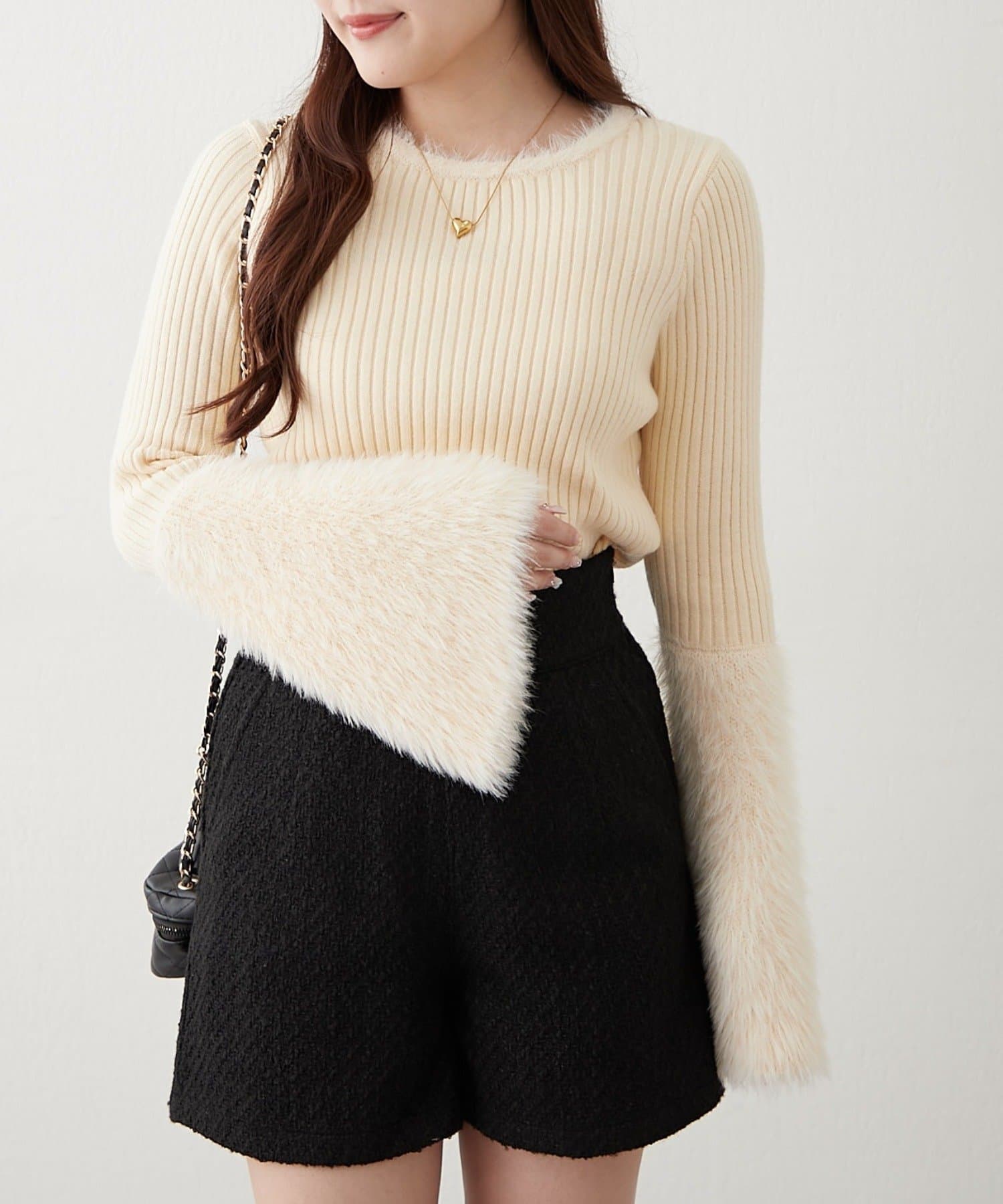 ・襟元と袖がフェザーヤーンになったニットプルオーバー