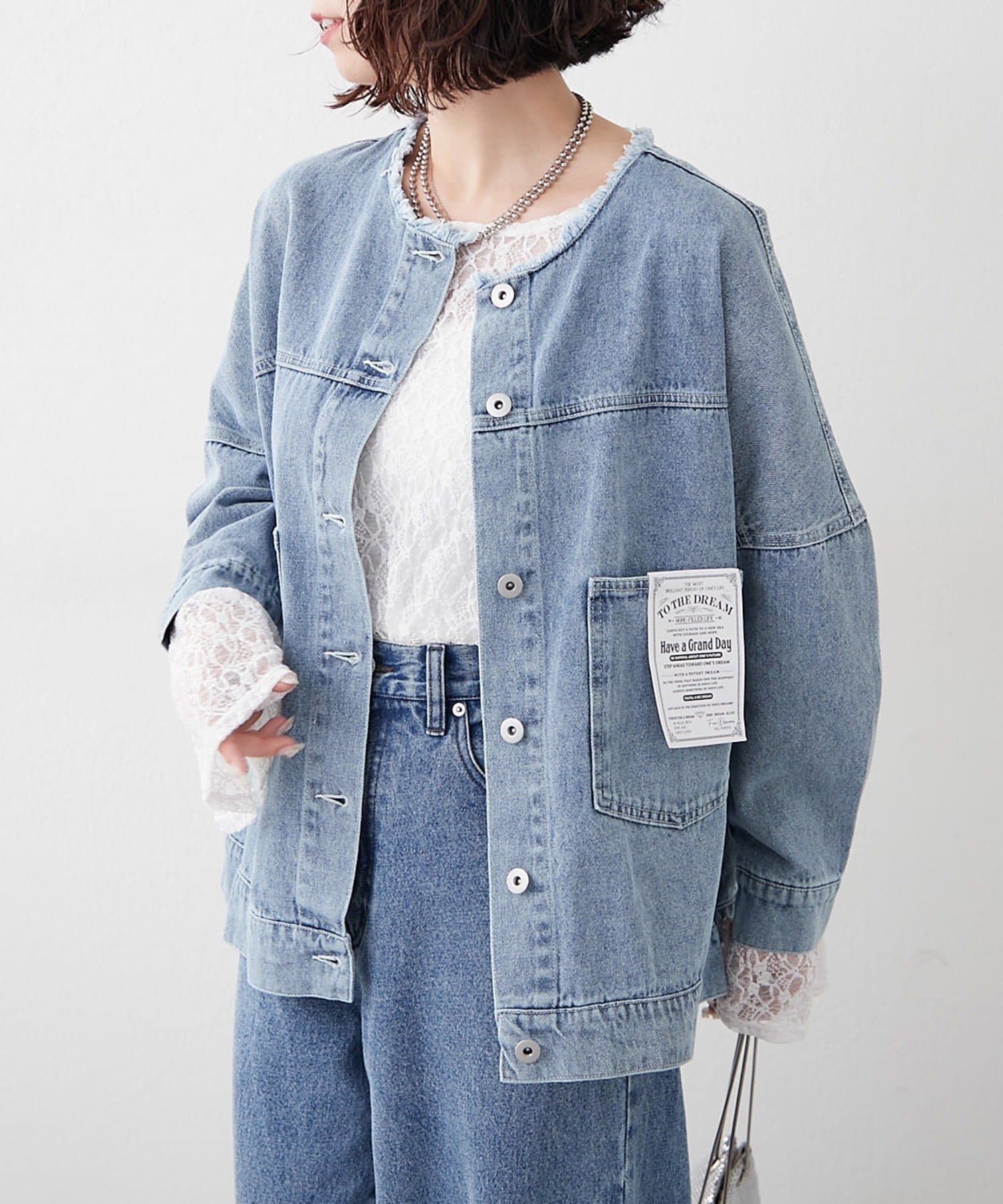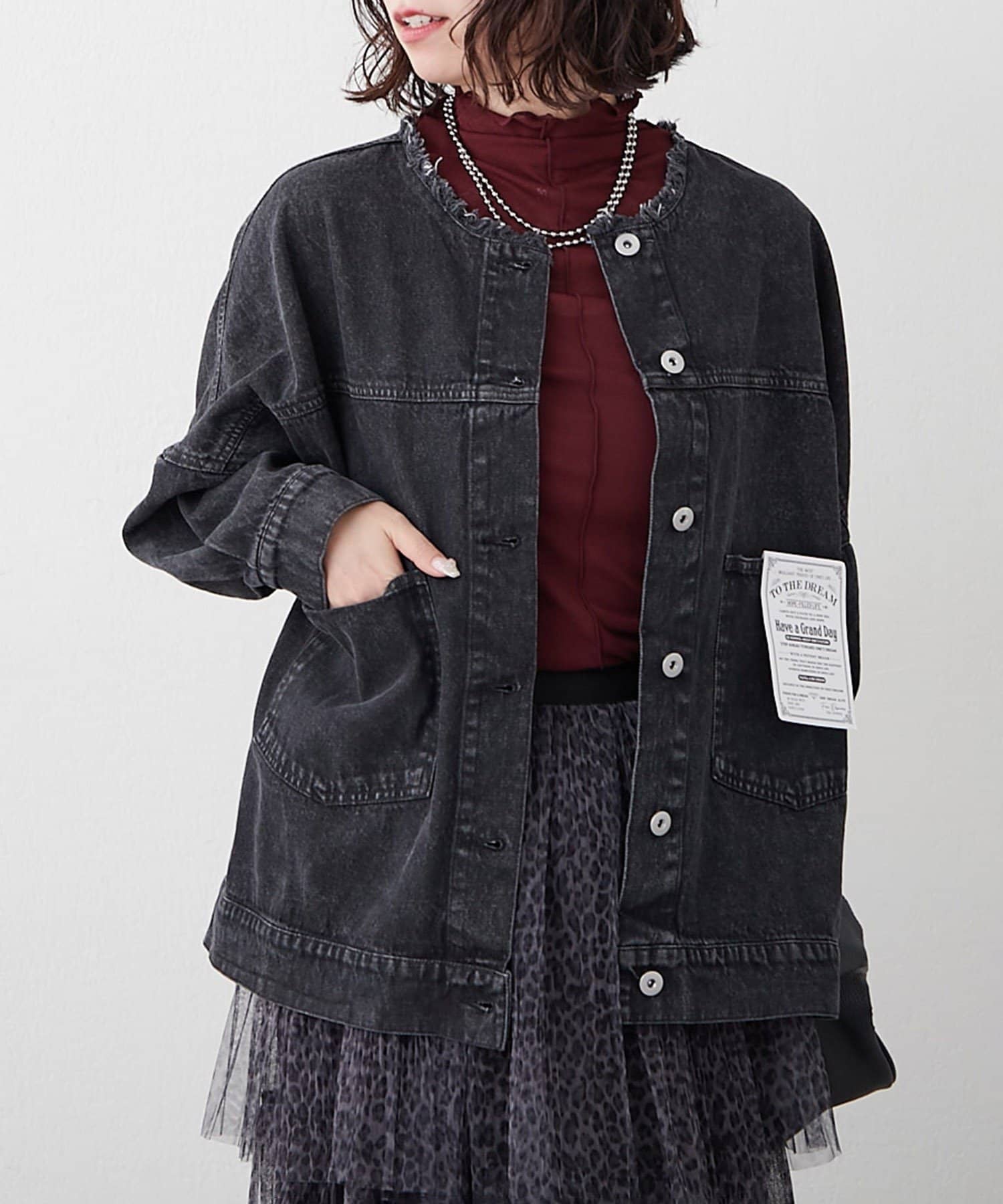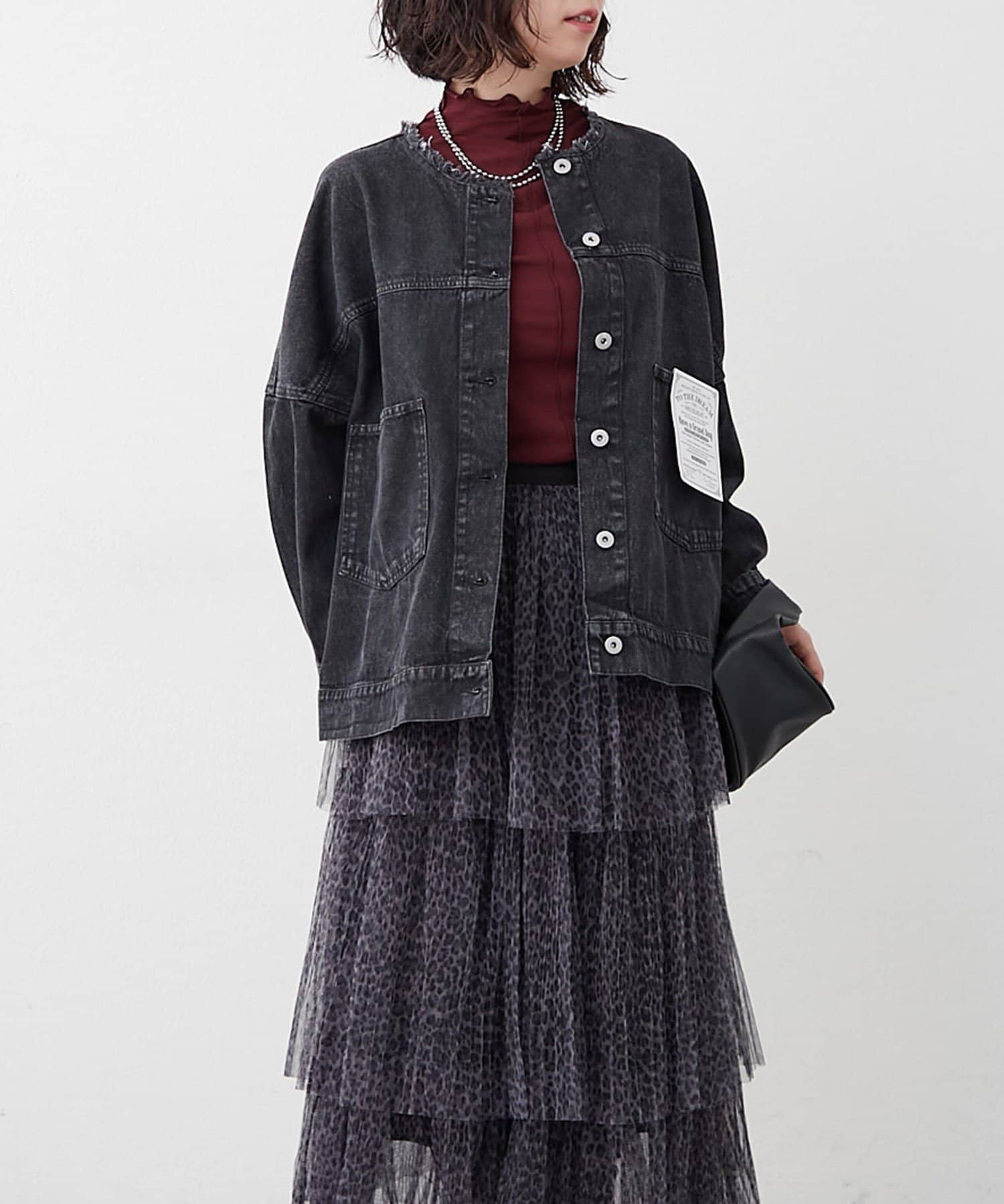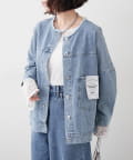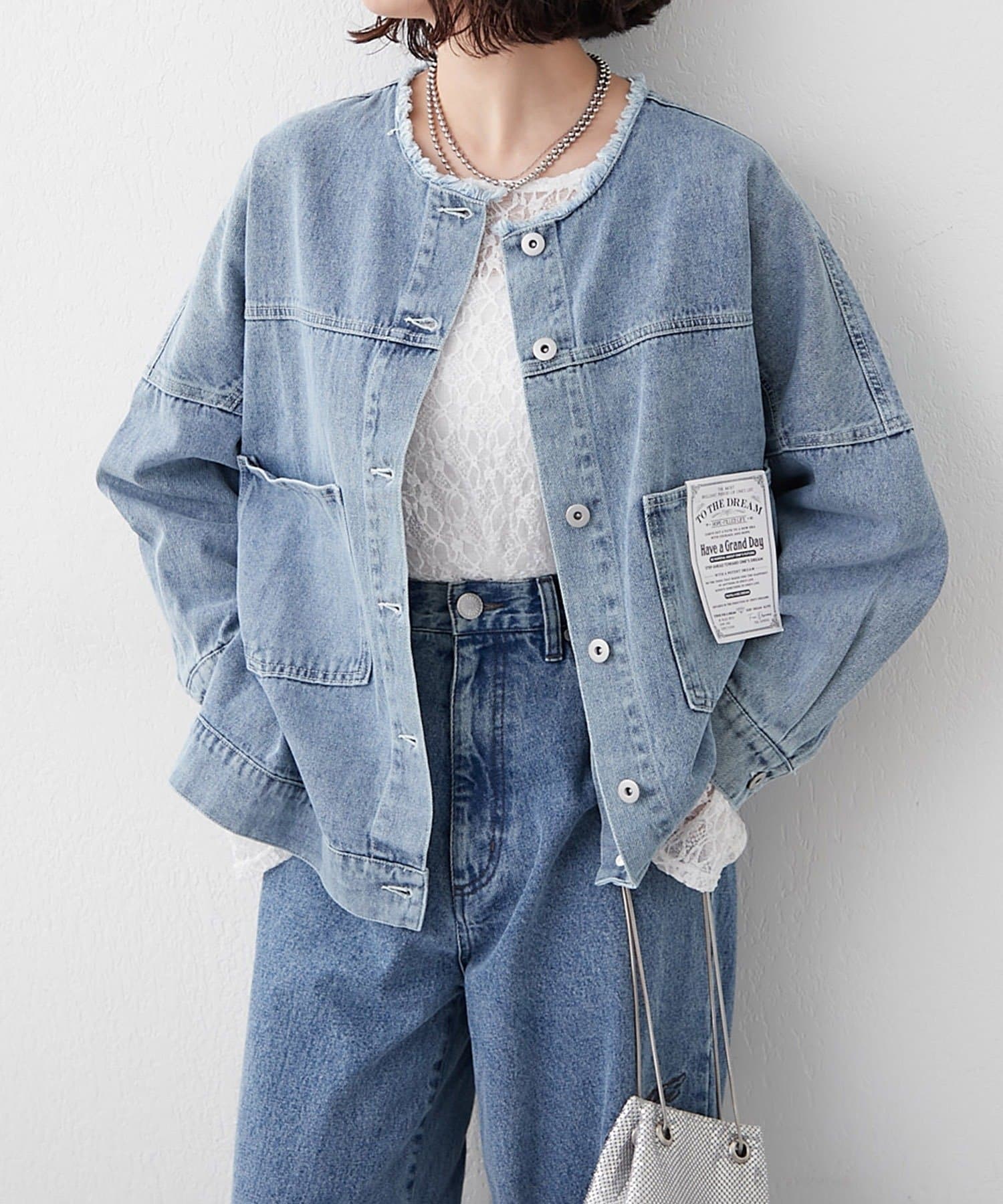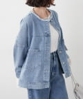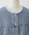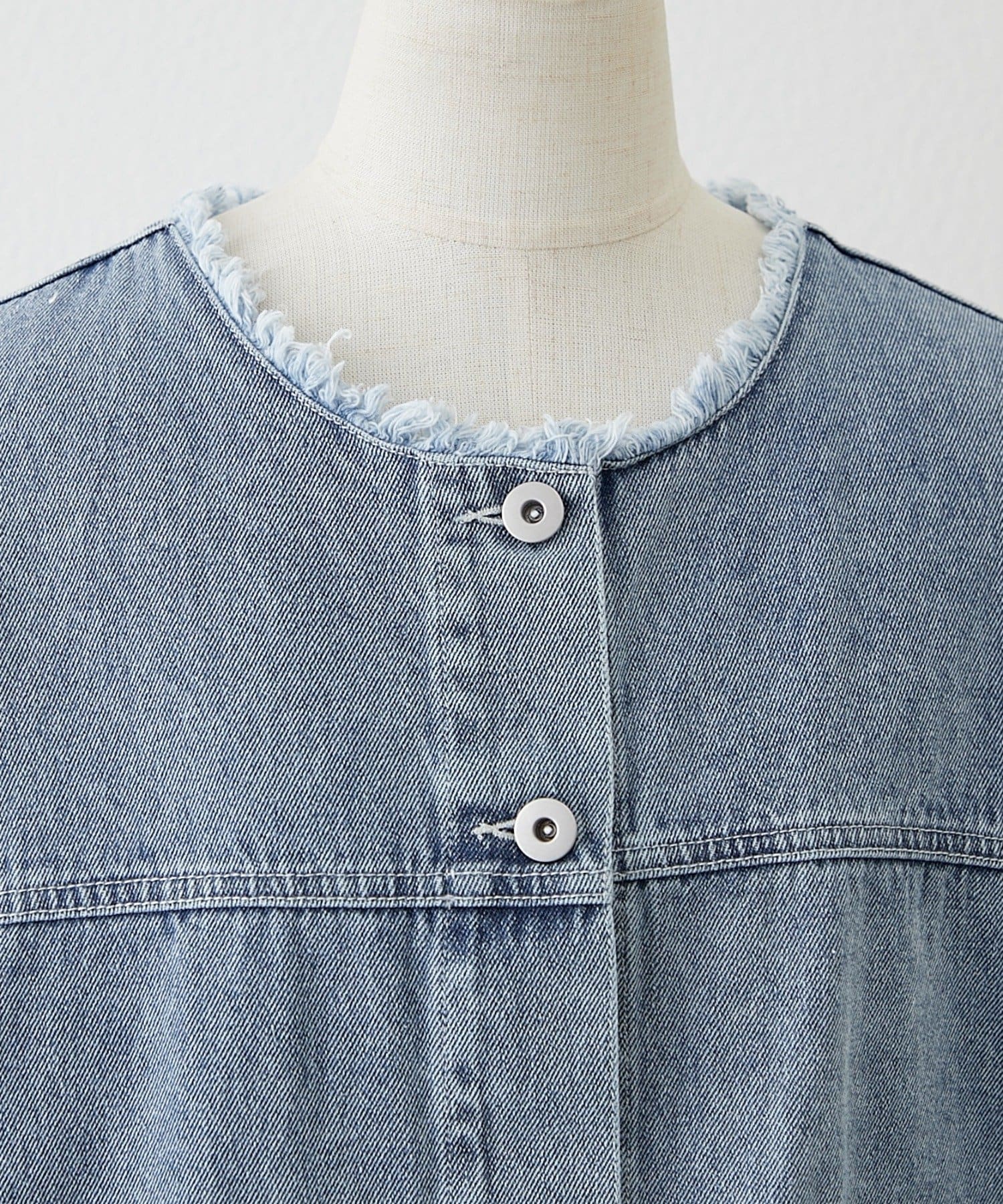 ・ダメージ加工の入ったノーカラーのデニムジャケット