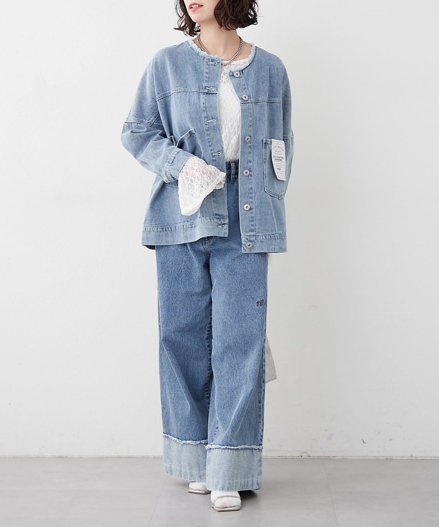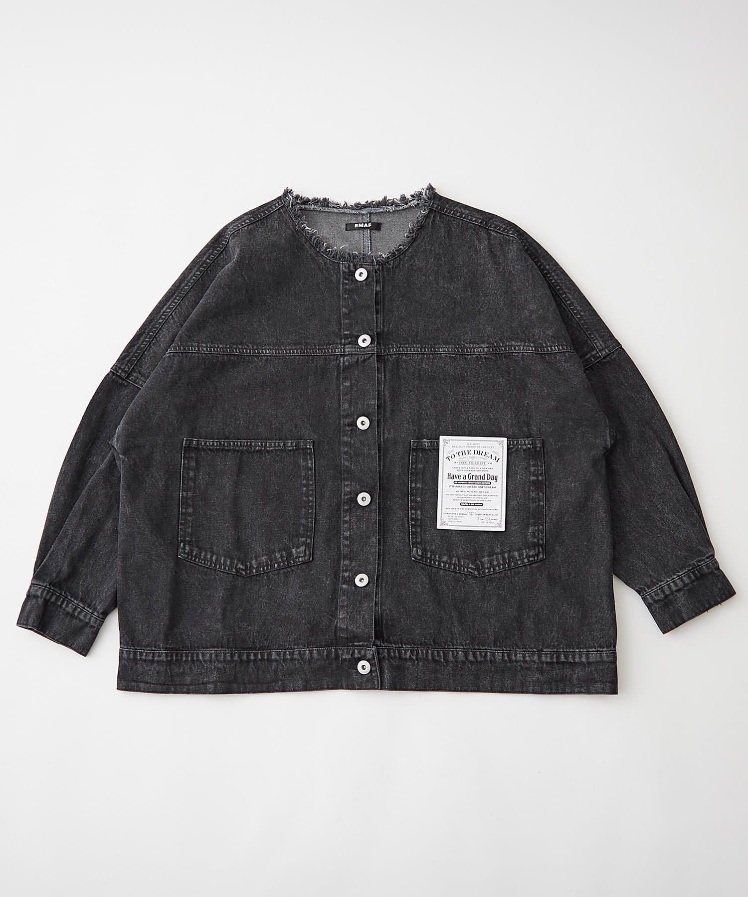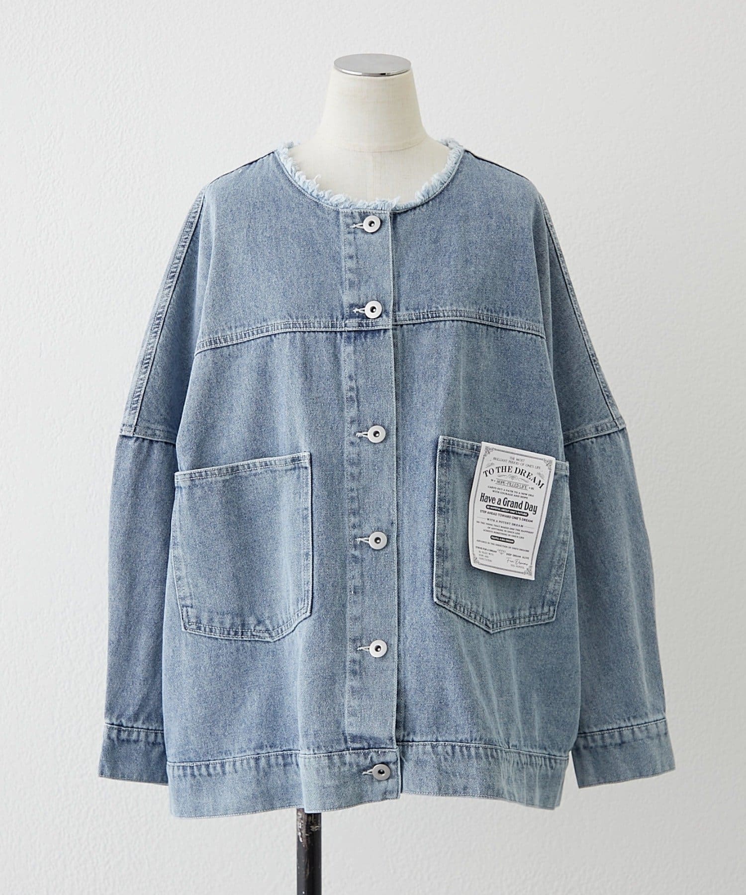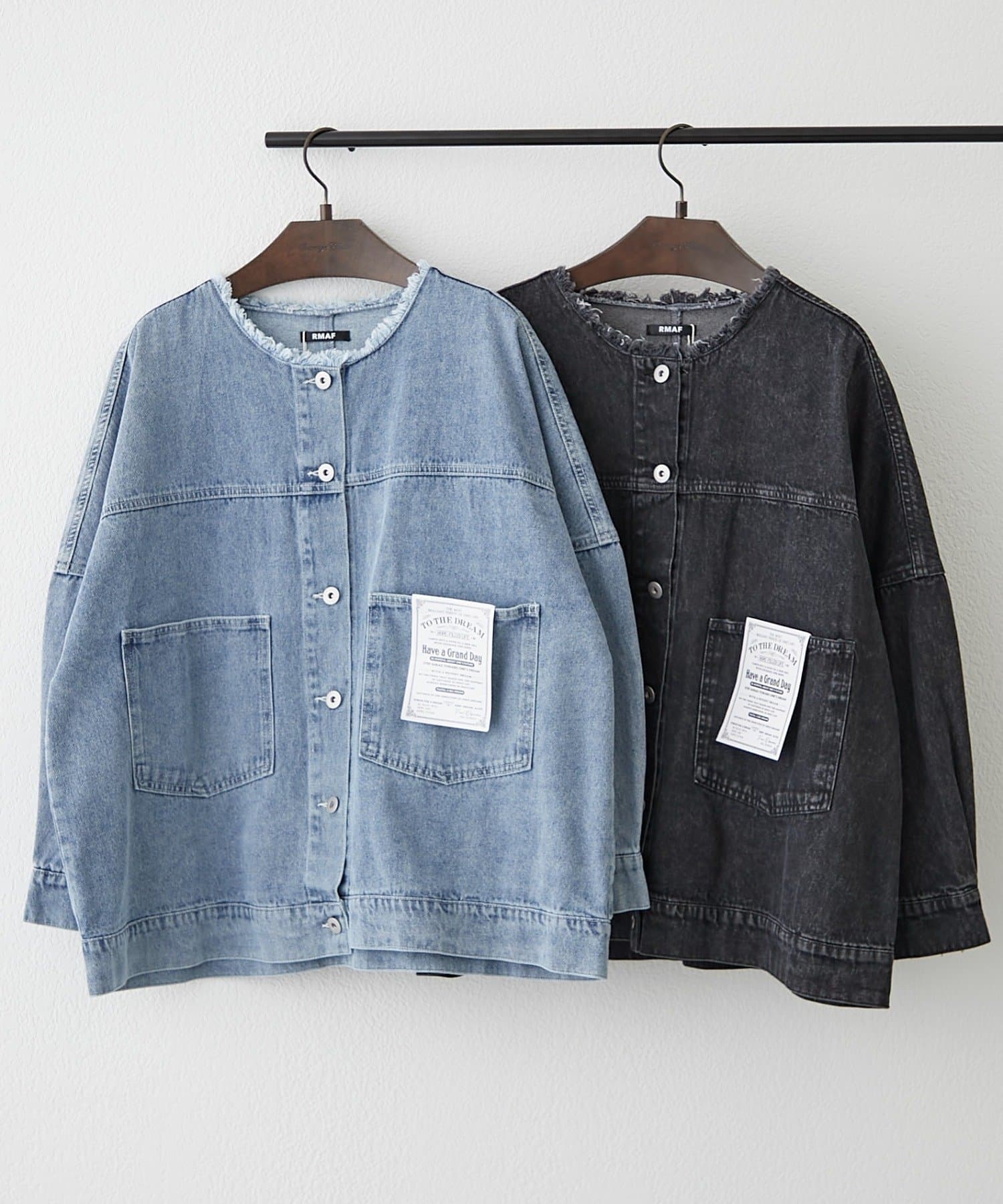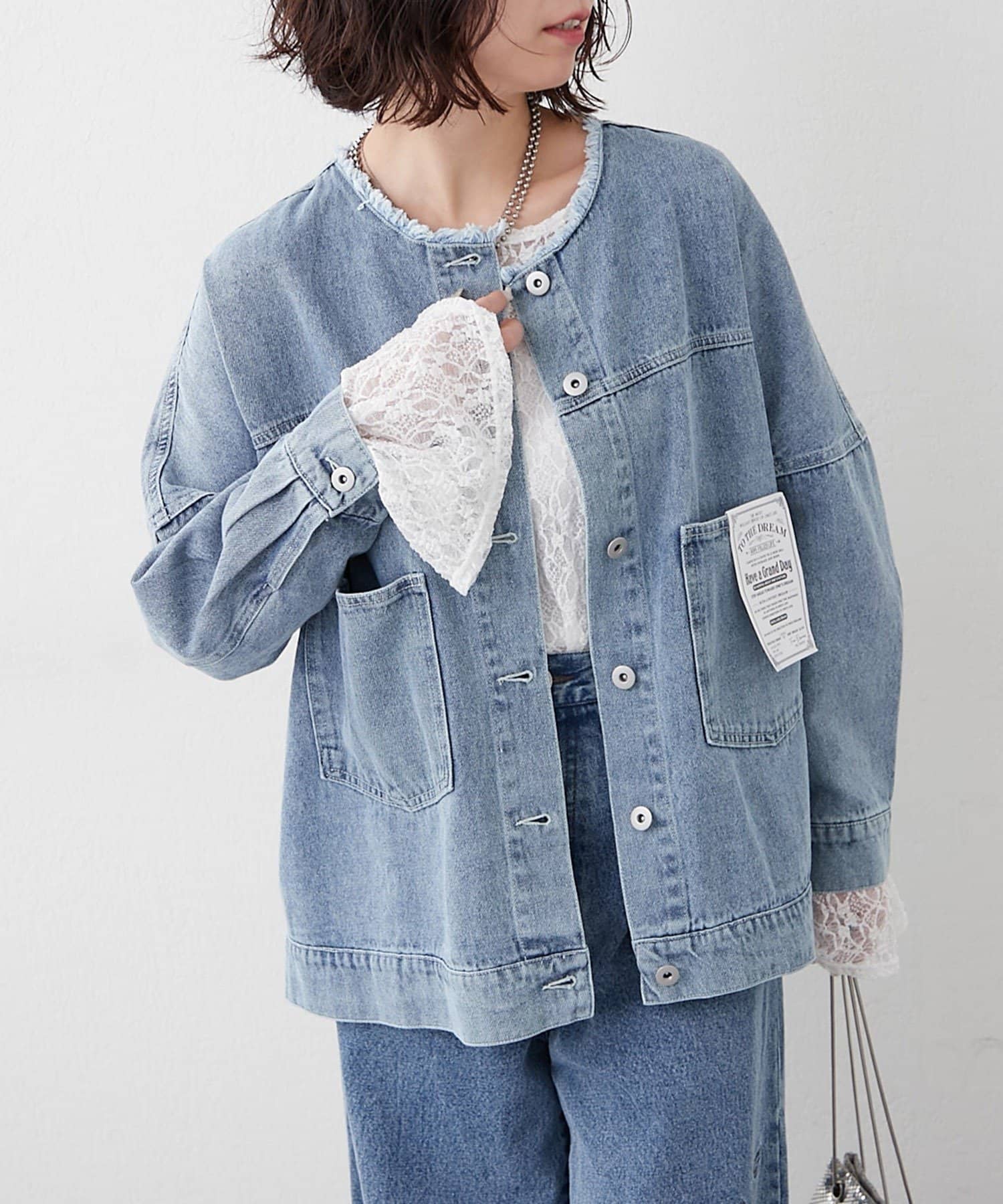 ・ダメージ加工の入ったノーカラーのデニムジャケット