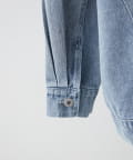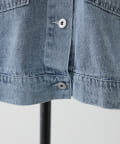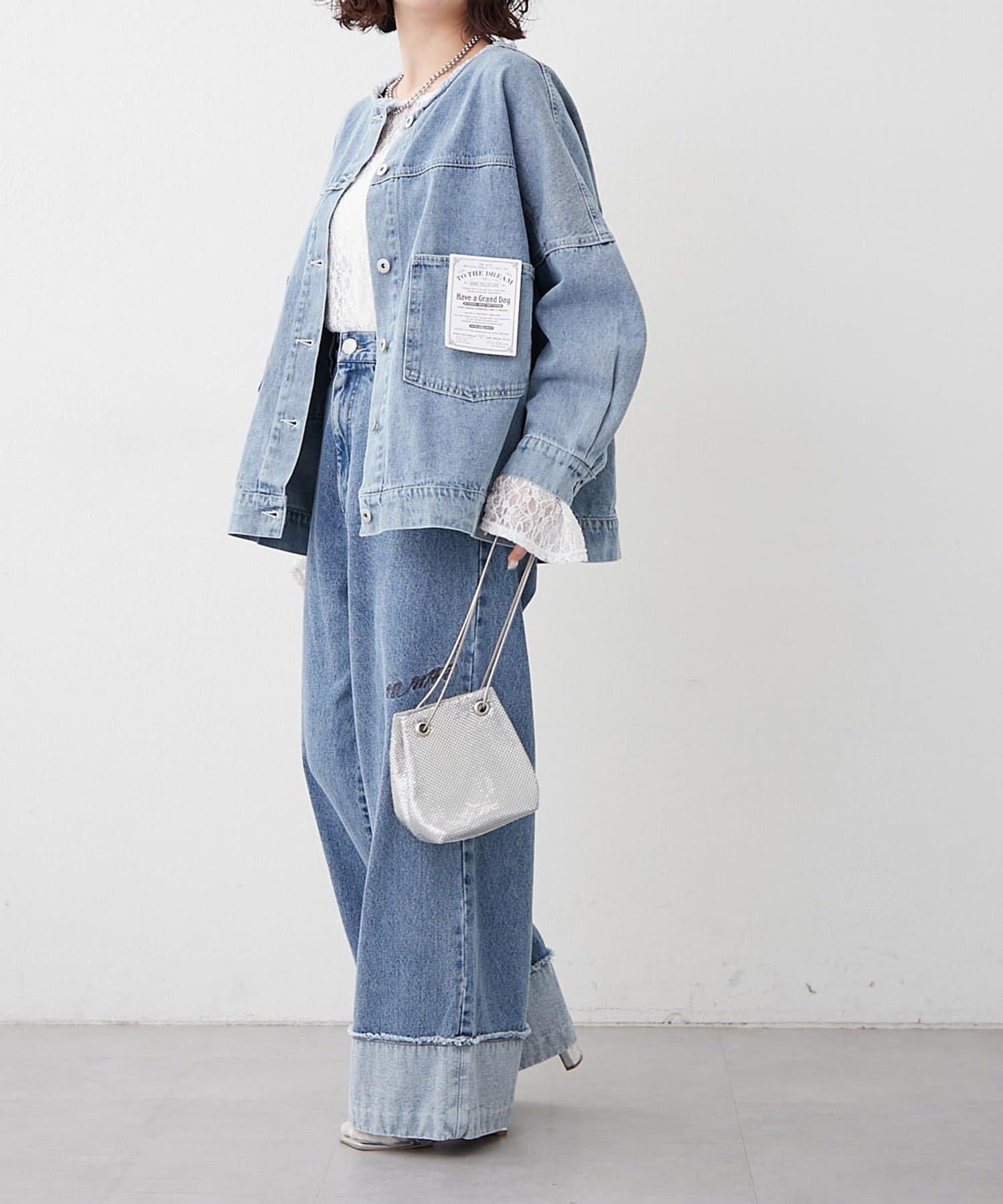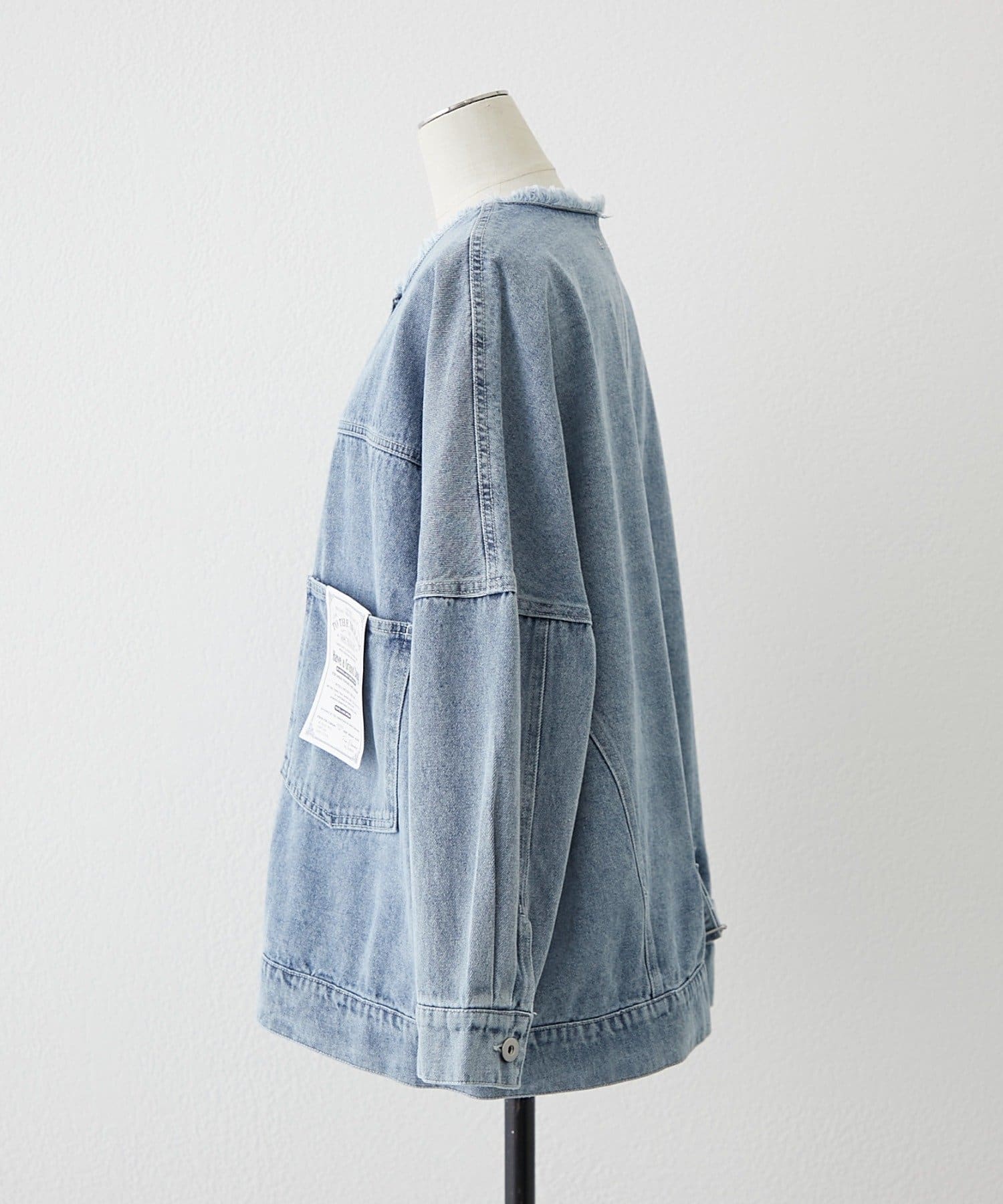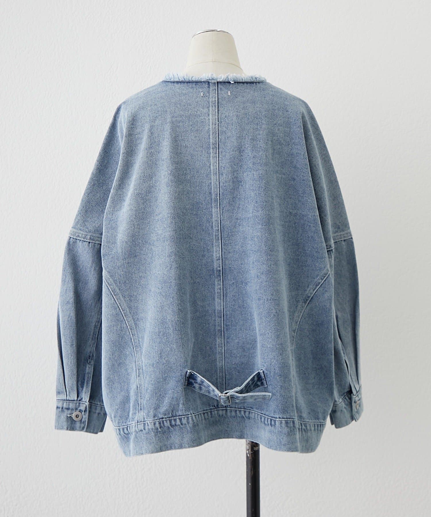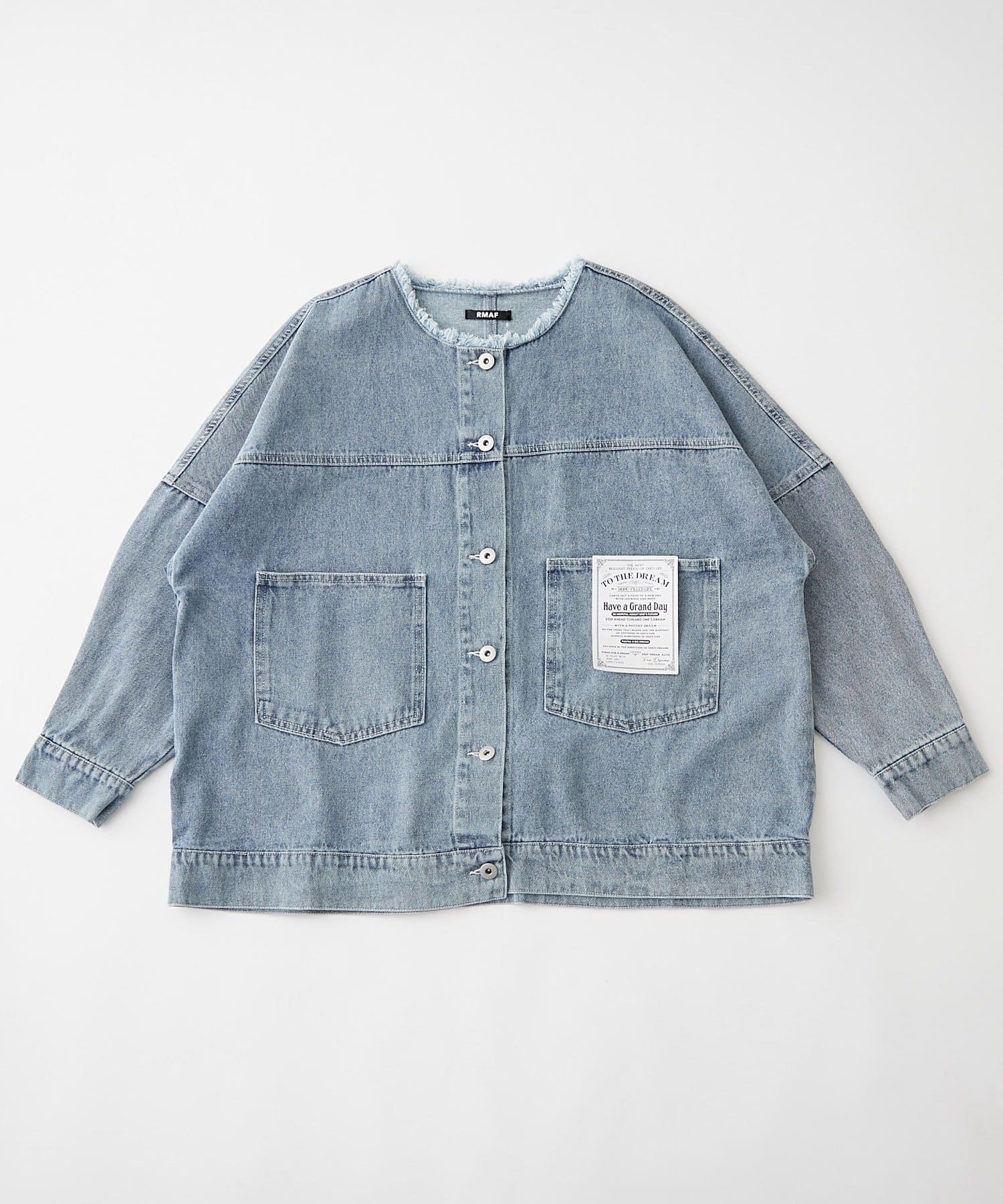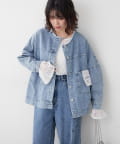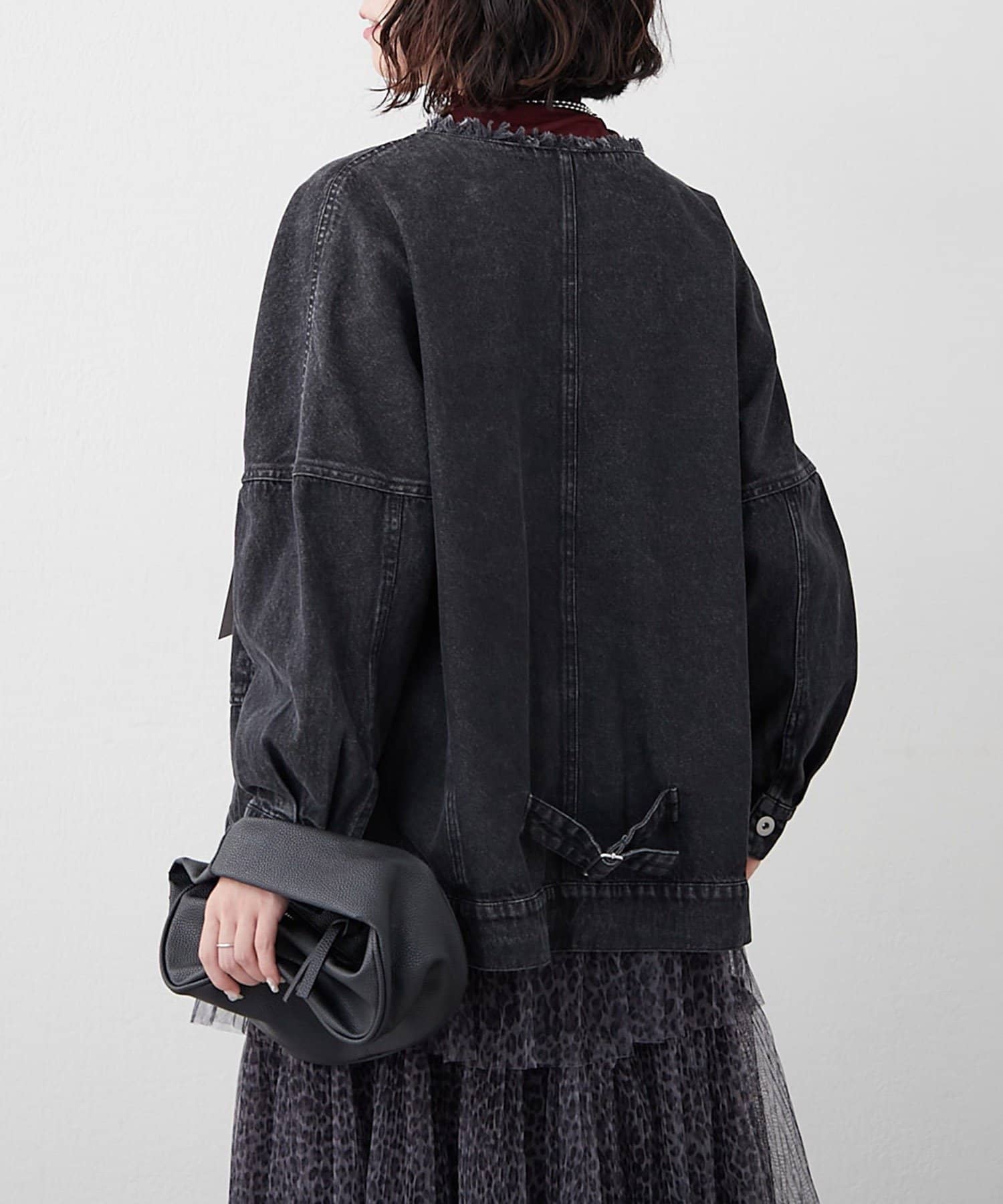 ・ダメージ加工の入ったノーカラーのデニムジャケット