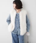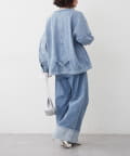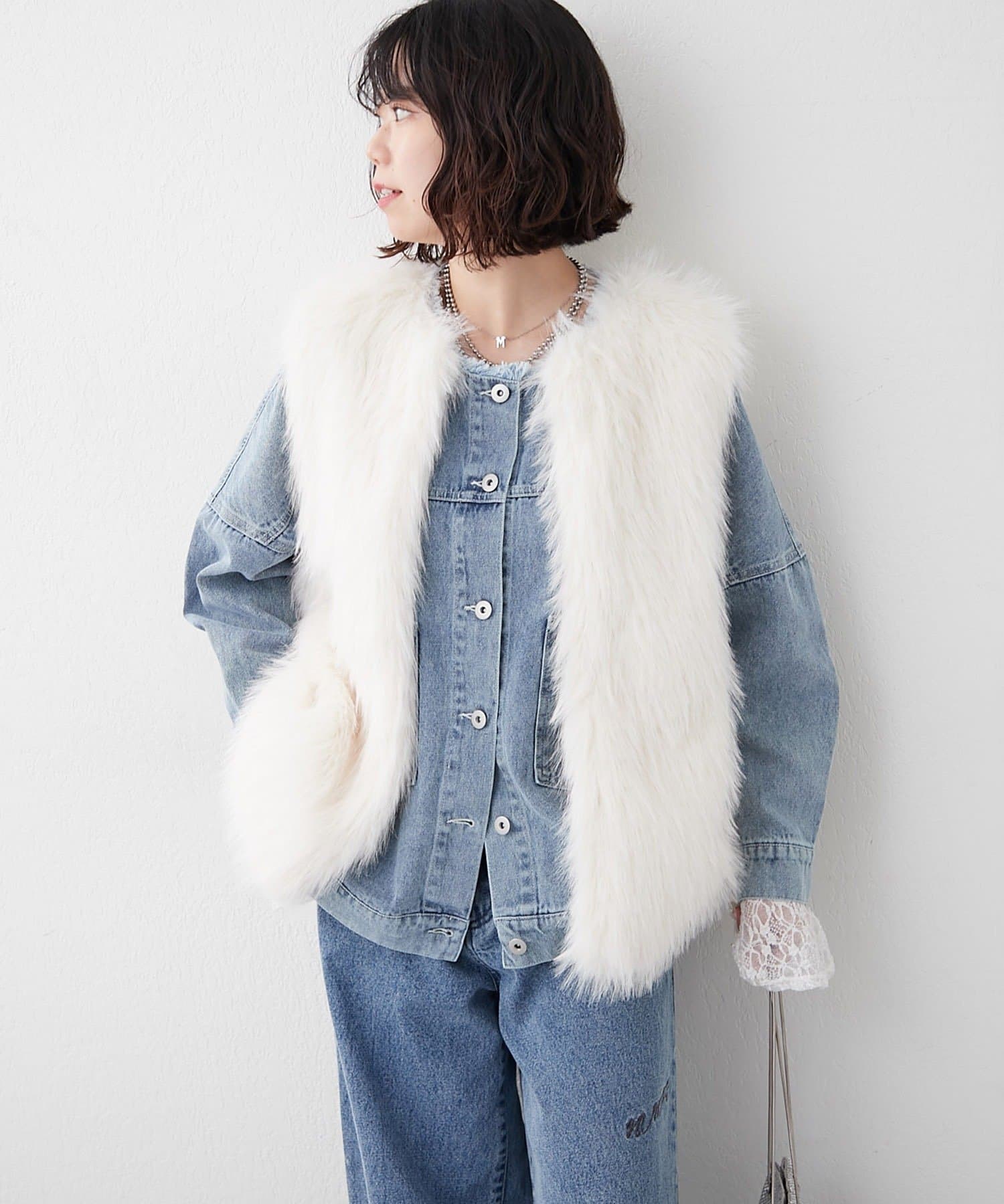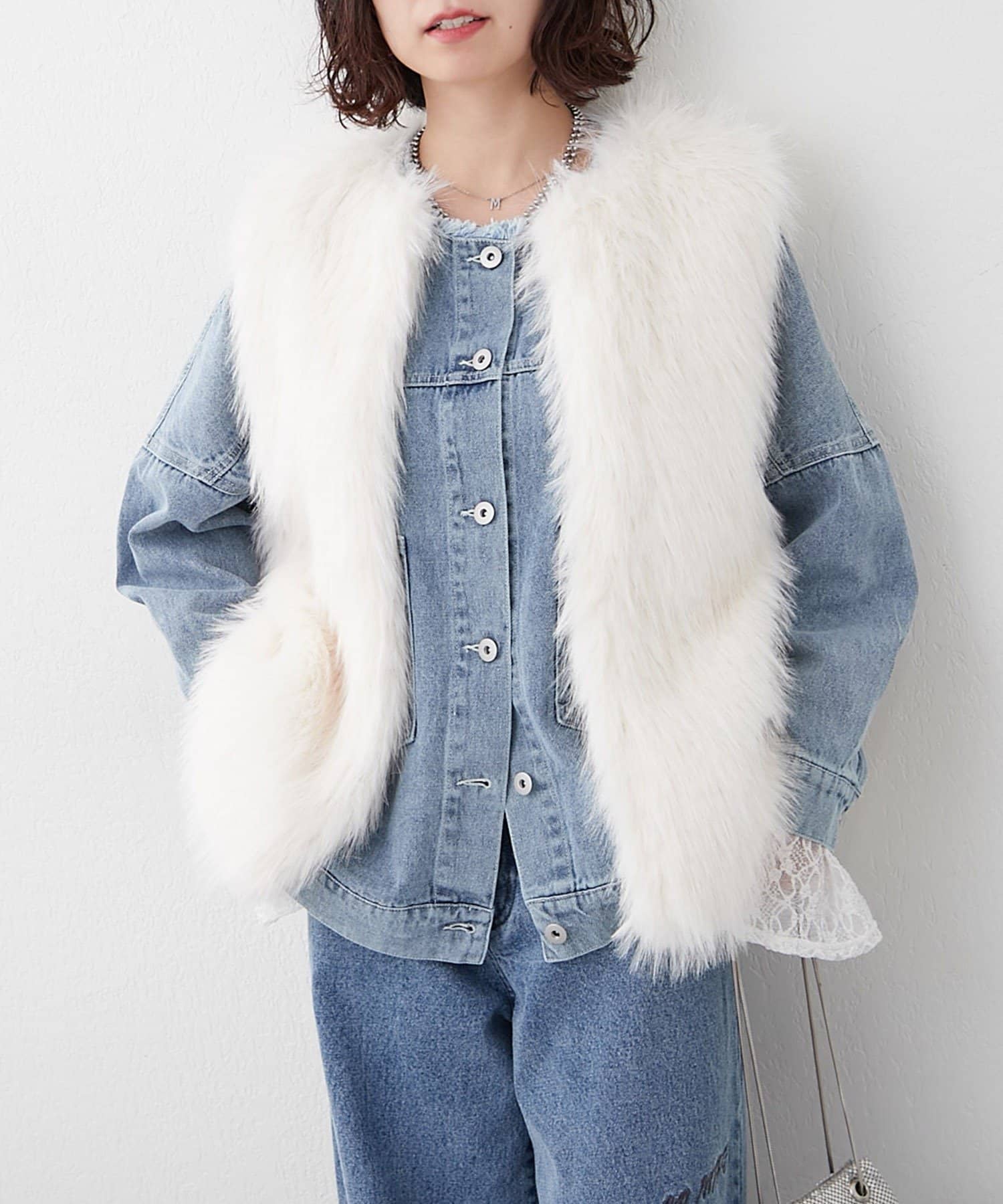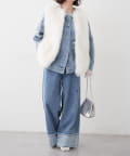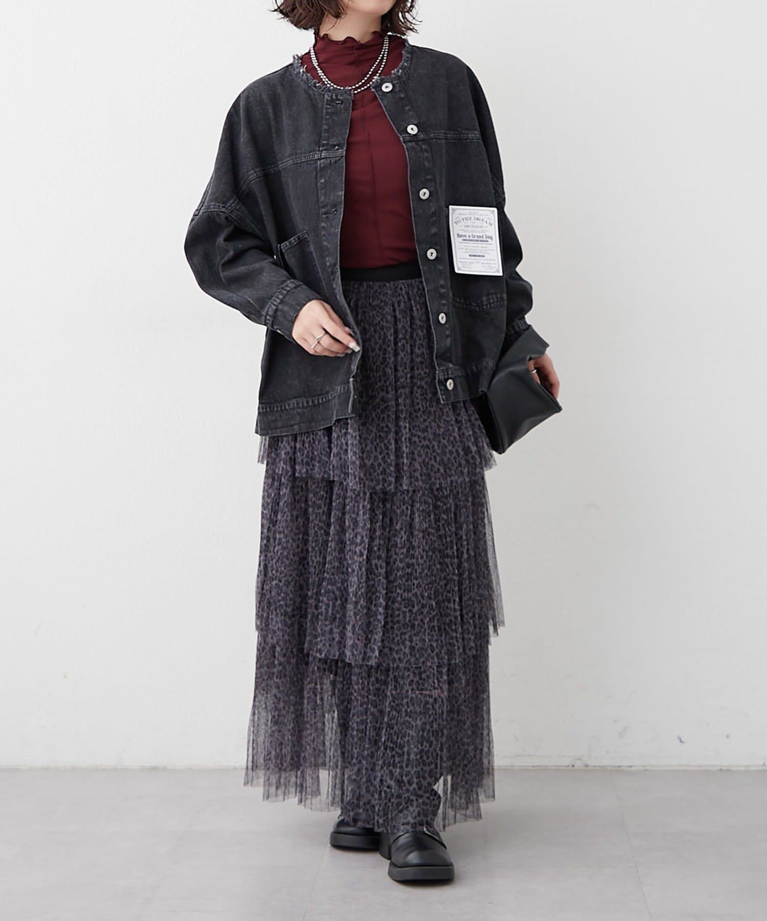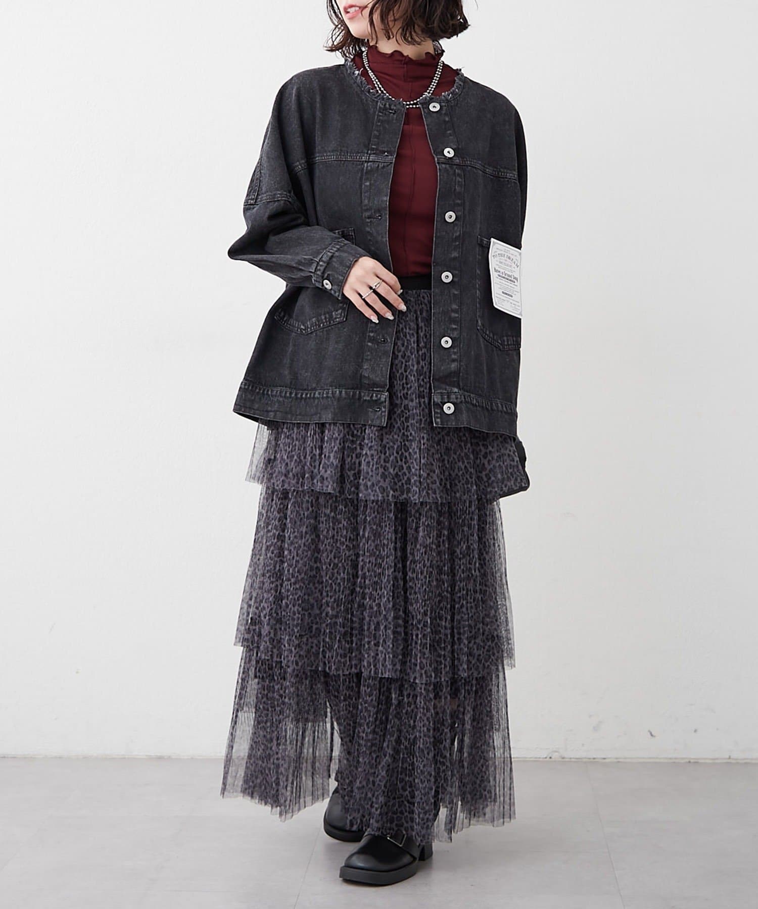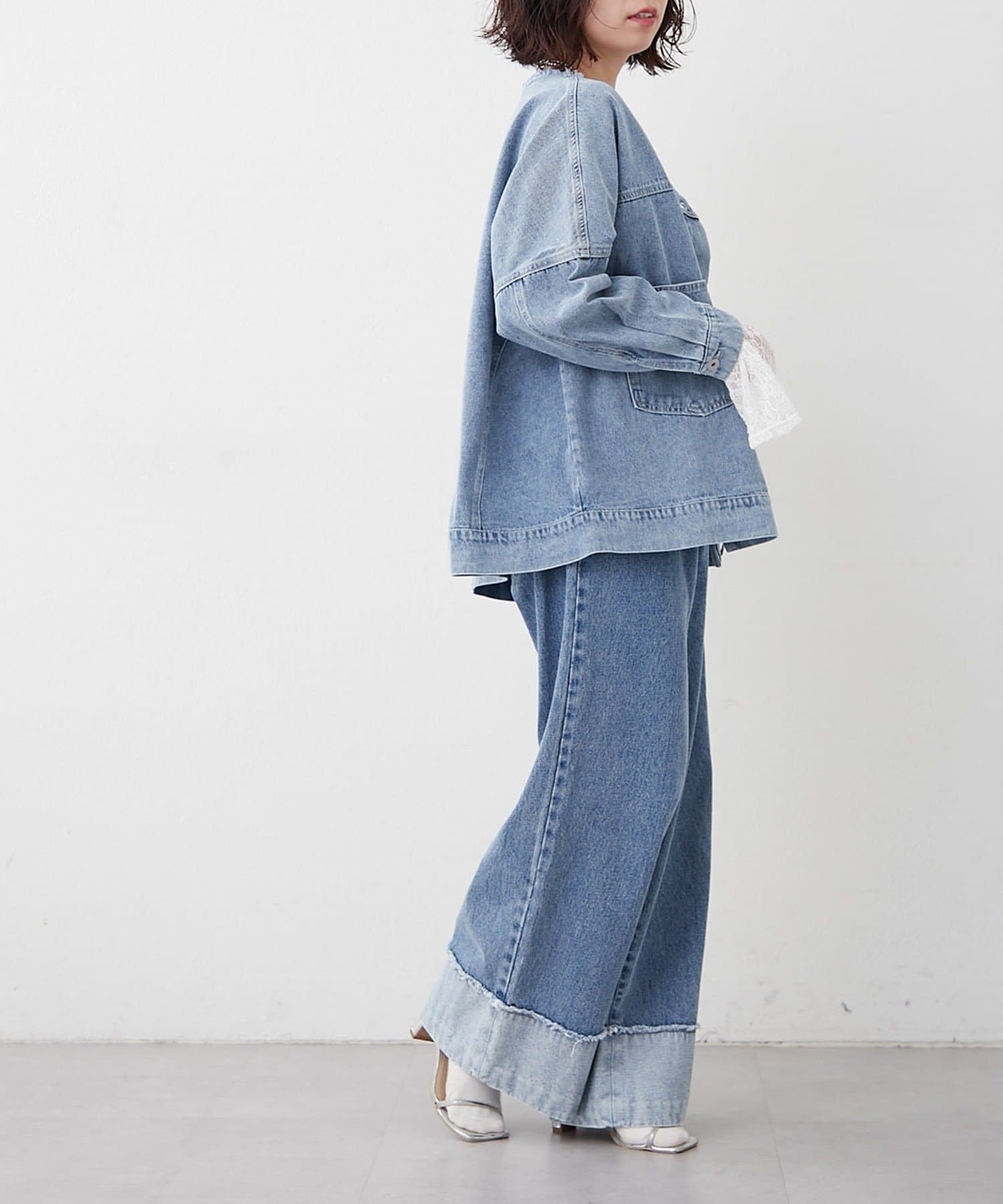 ・ダメージ加工の入ったノーカラーのデニムジャケット
