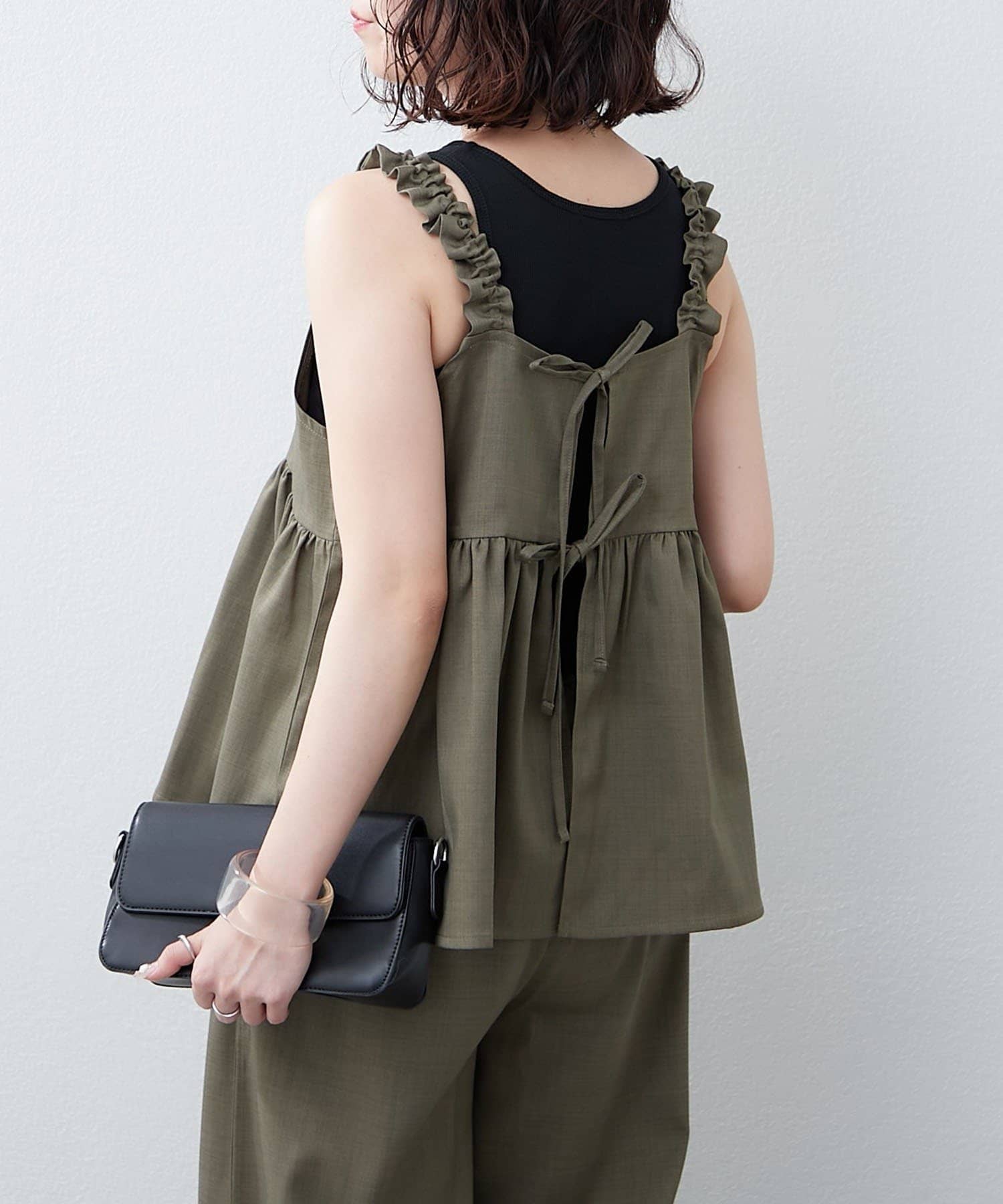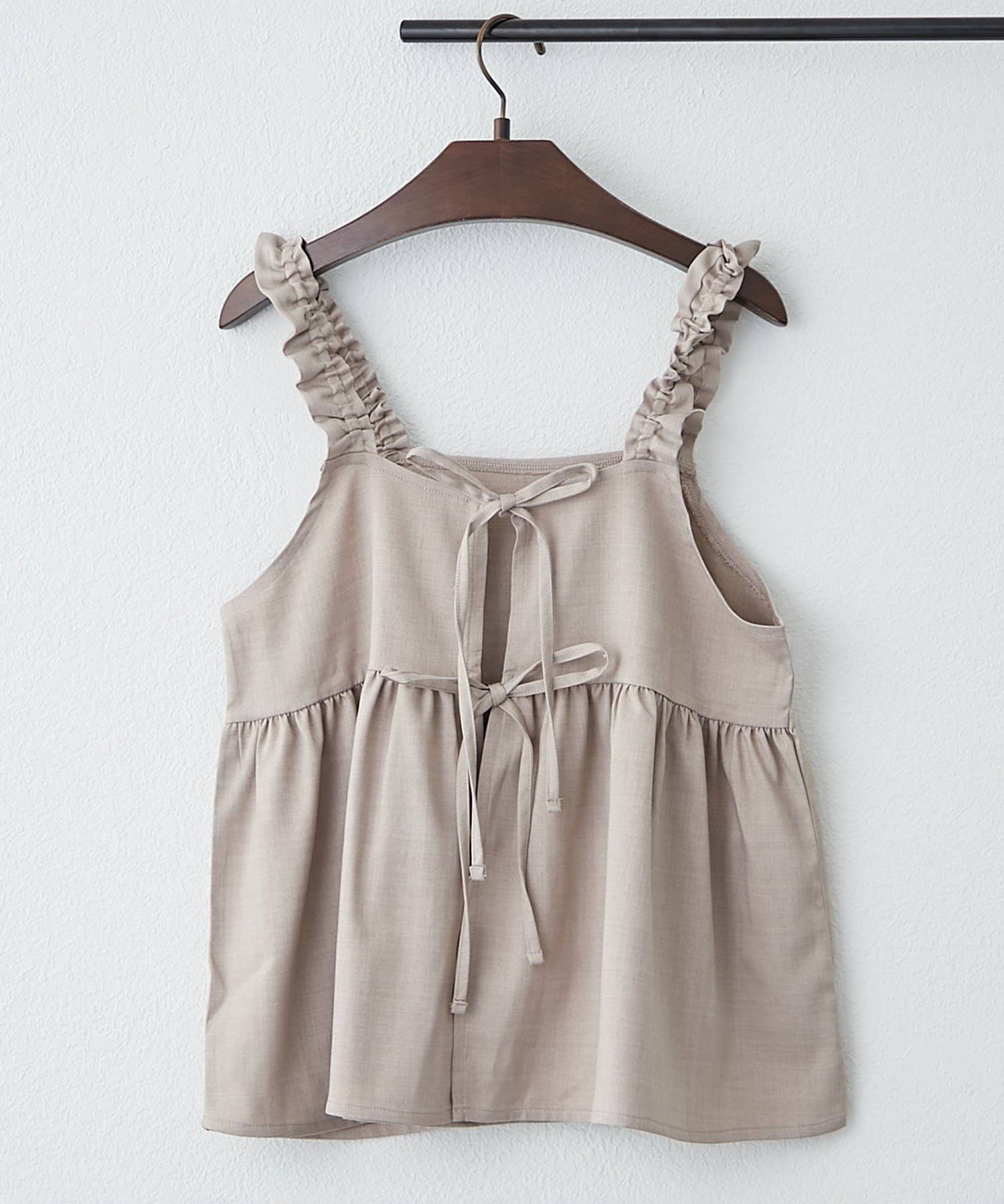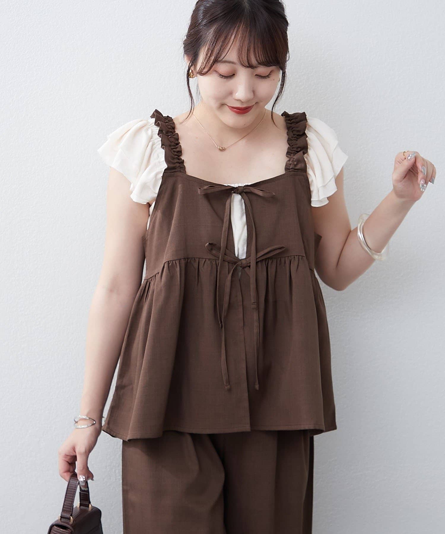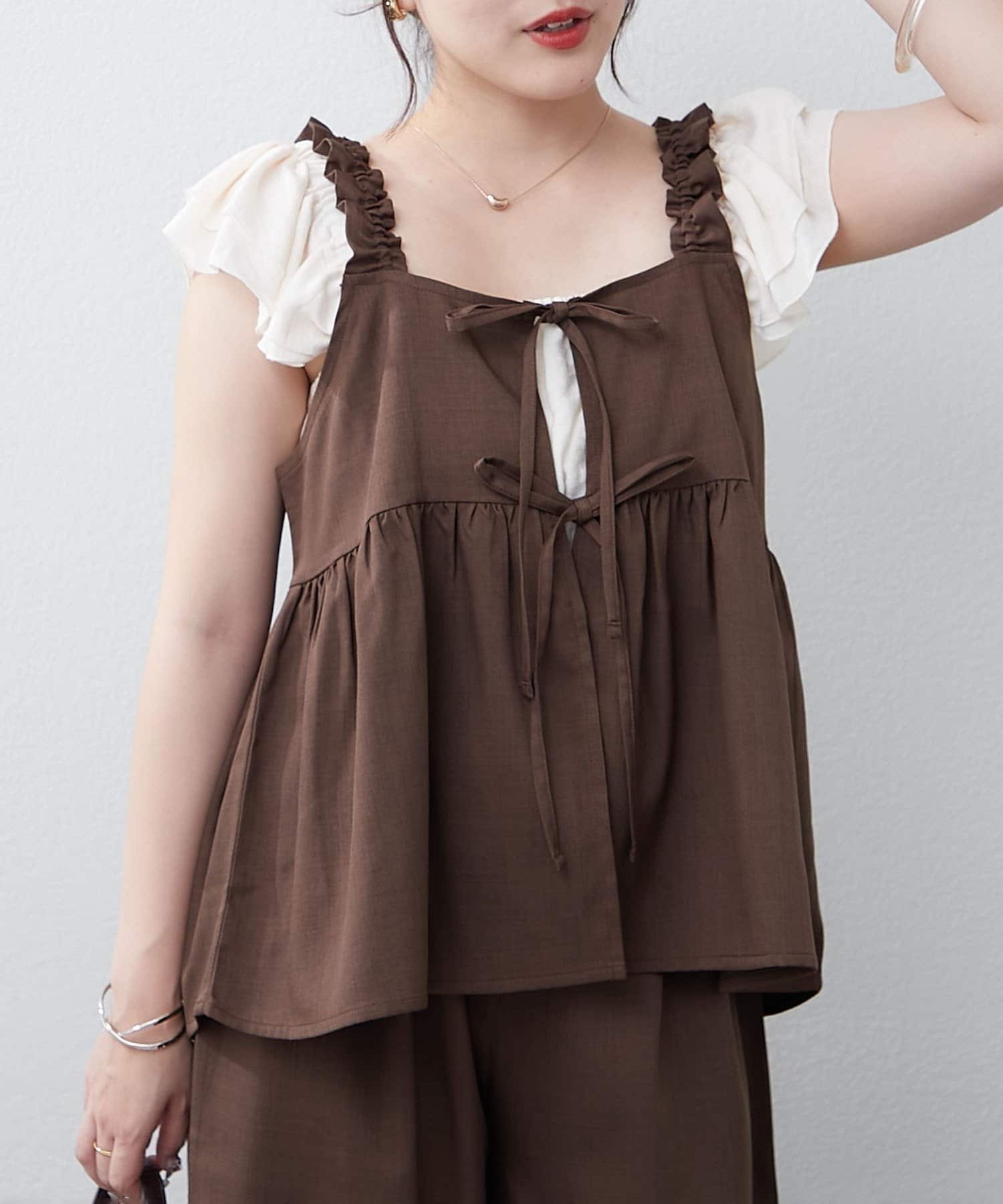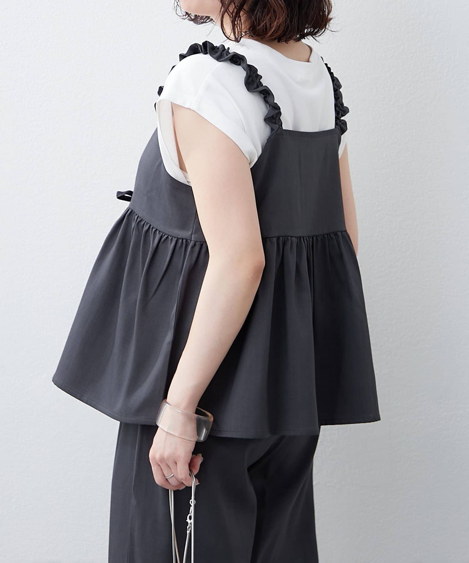 ・キャミは前後2wayで着用でき、フリルデザインやリボンが可愛いポイントで、ペプラムなのでお腹周りは隠せる優秀アイテム◎