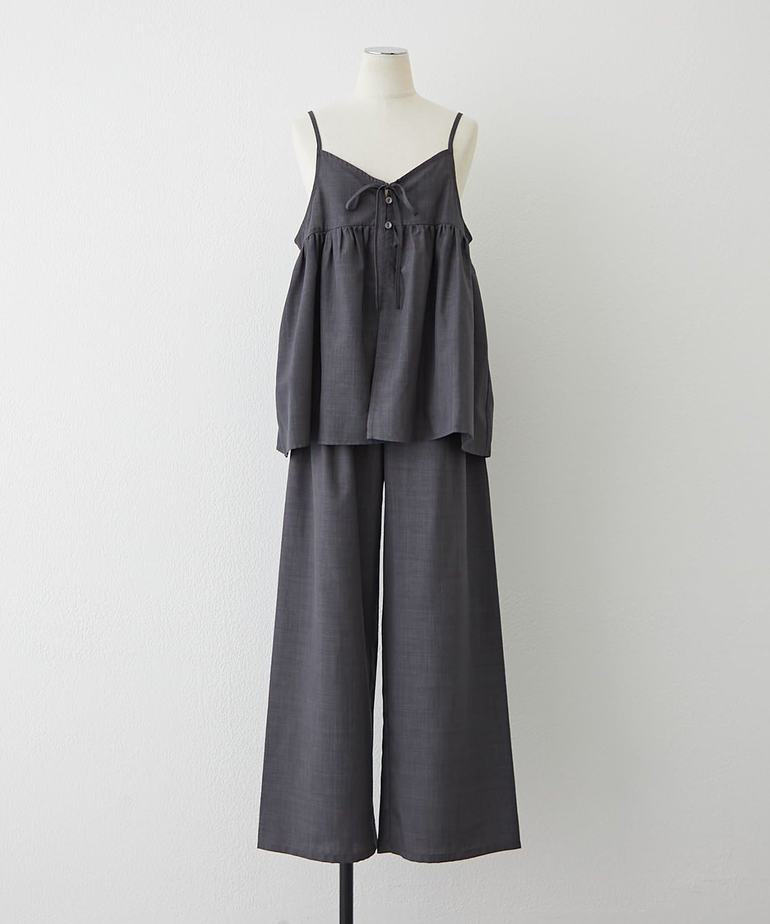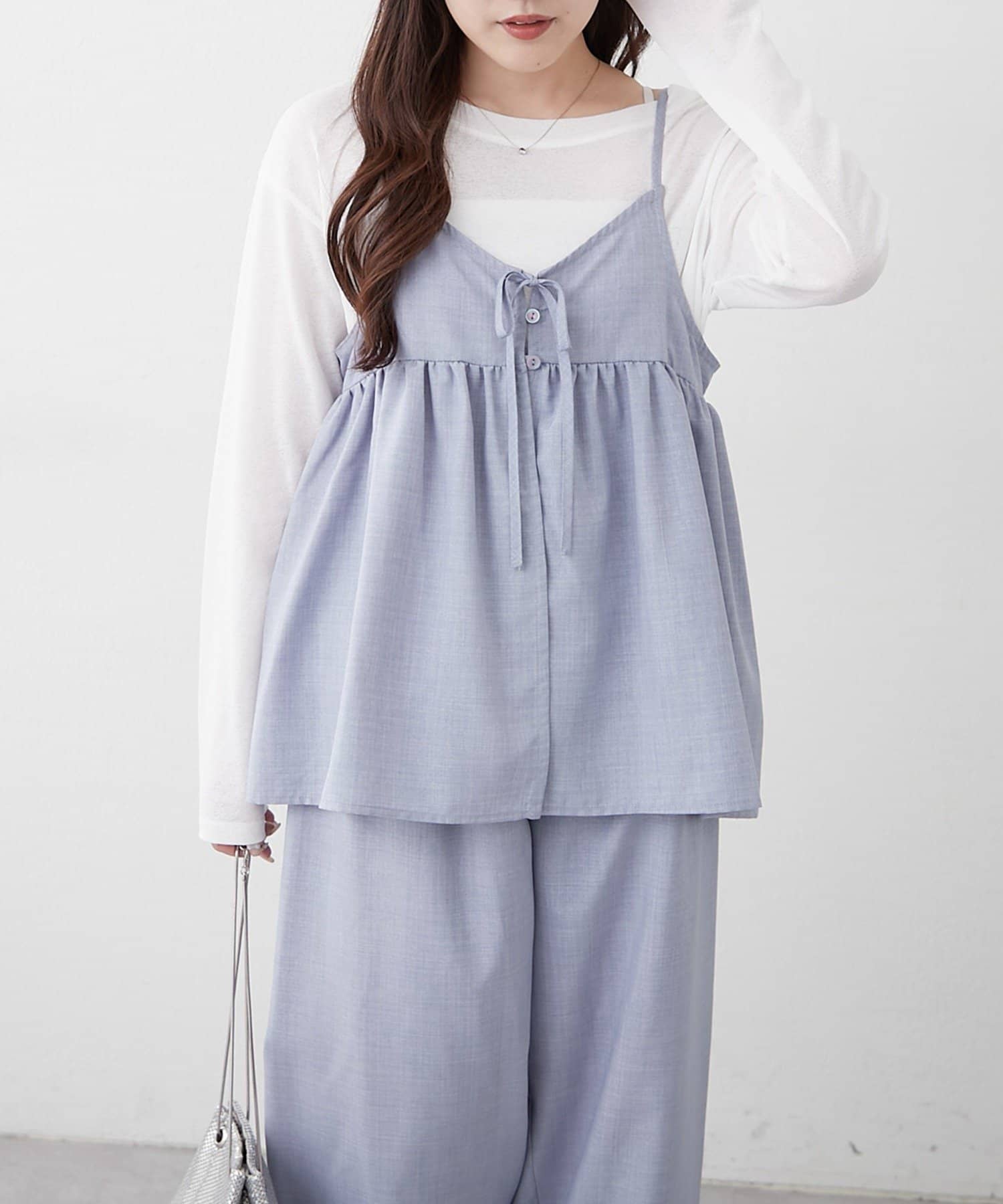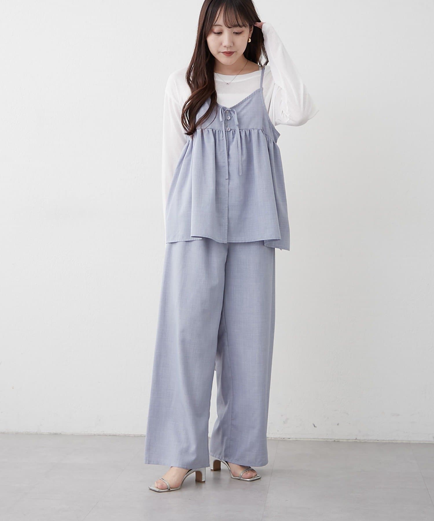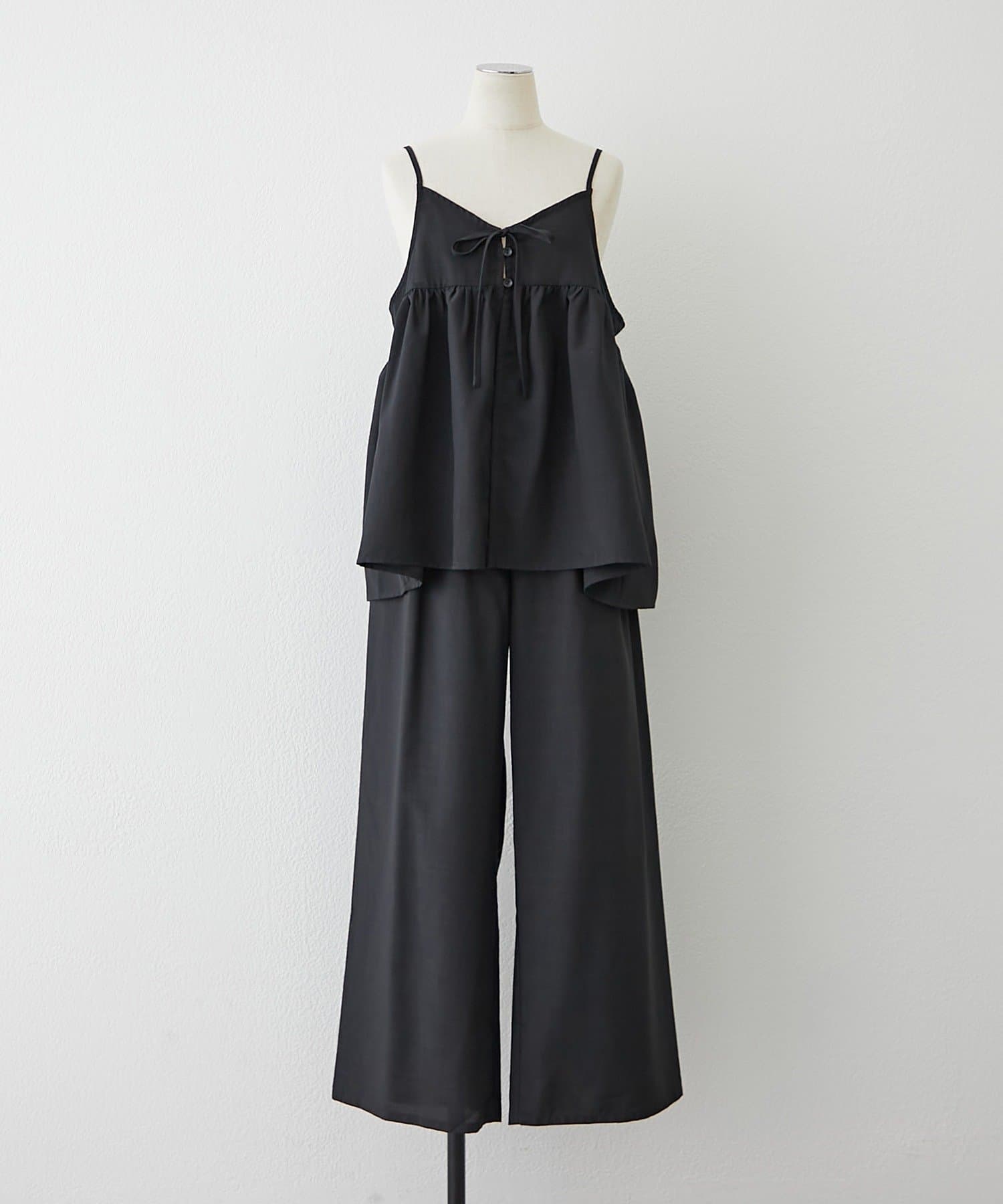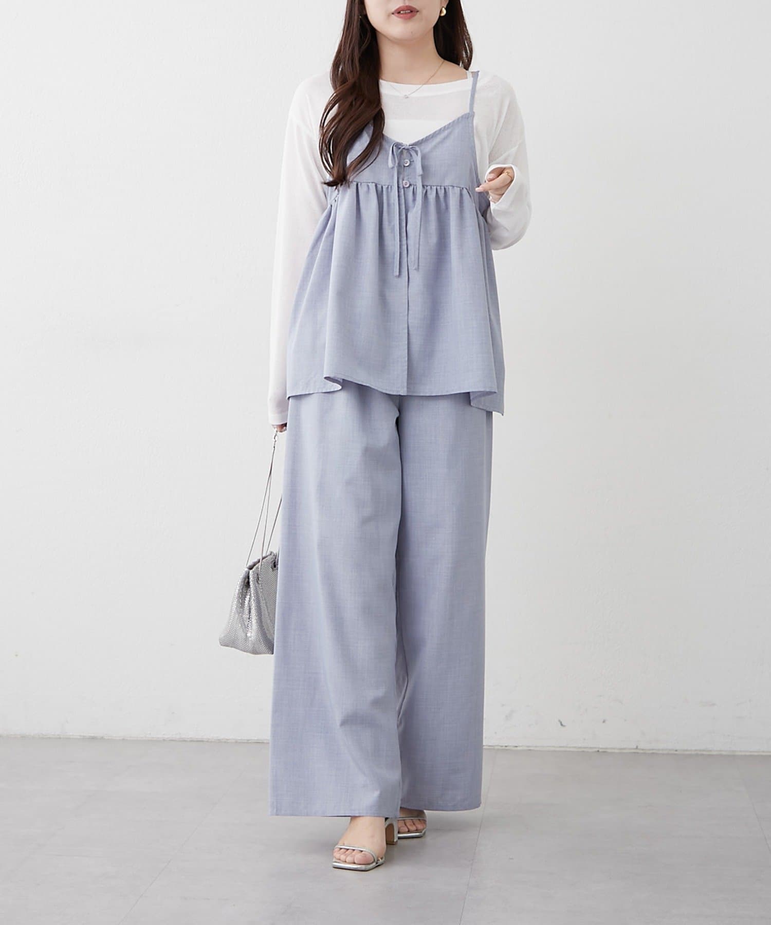 ・前リボンがポイントのキャミチュニックとワイドパンツのセットアップ