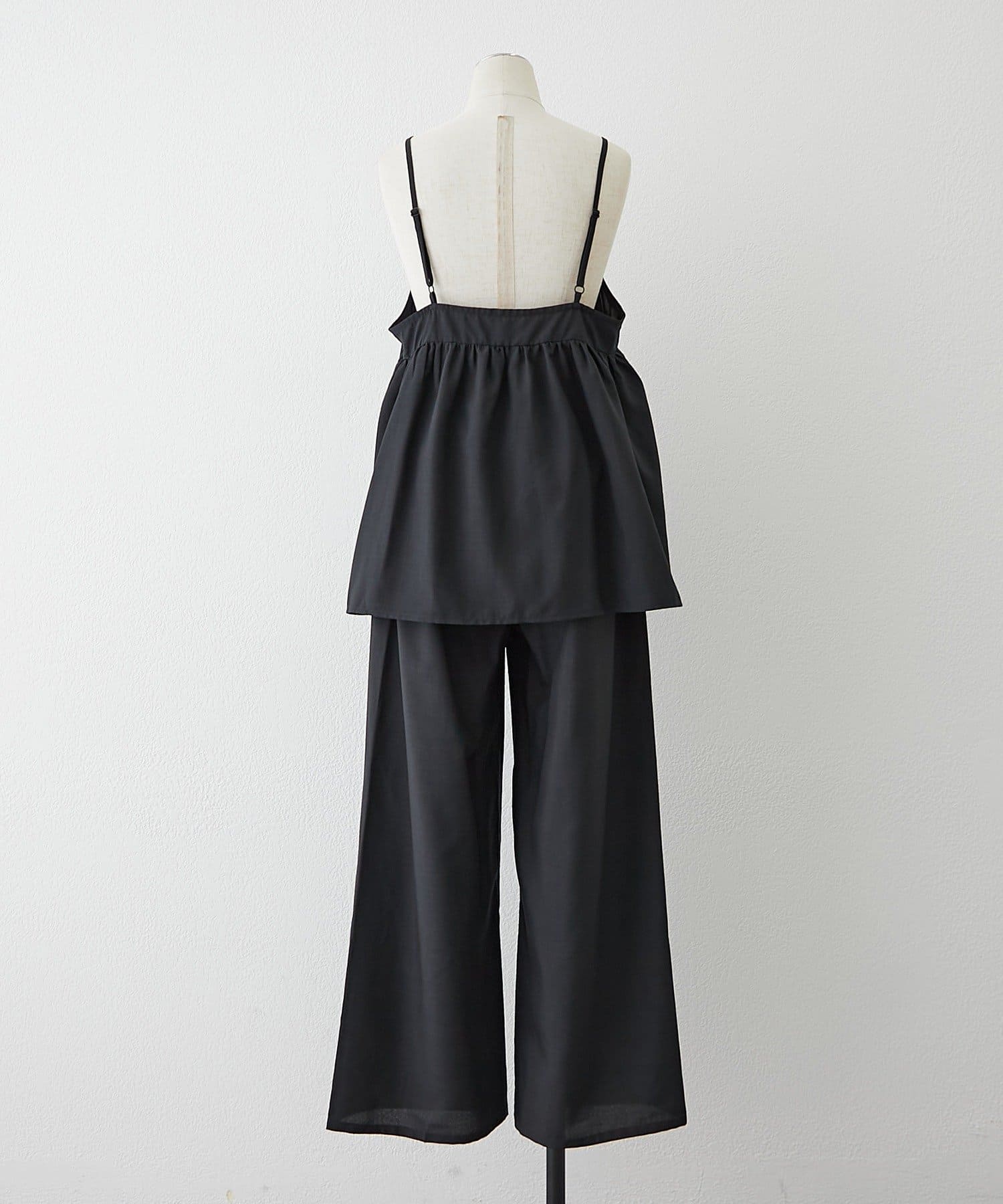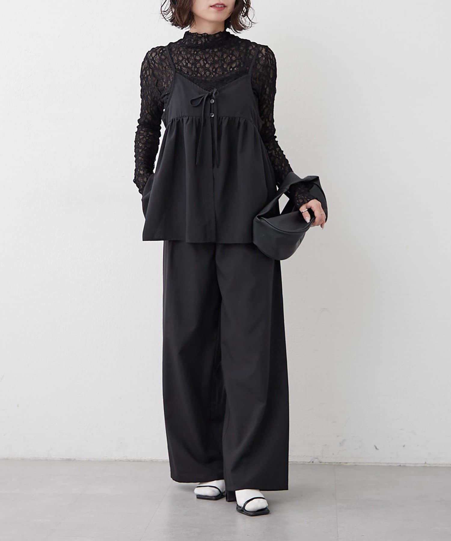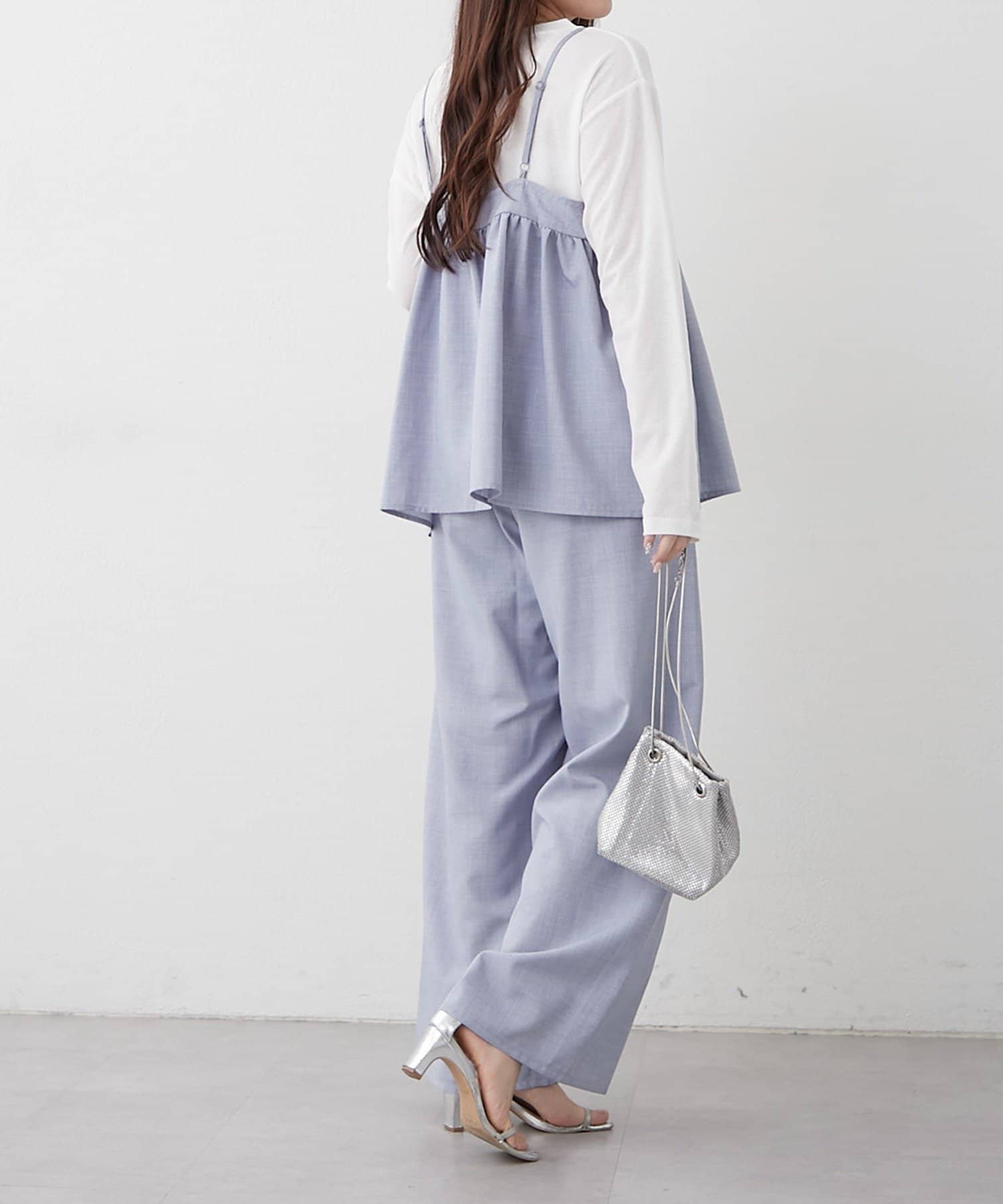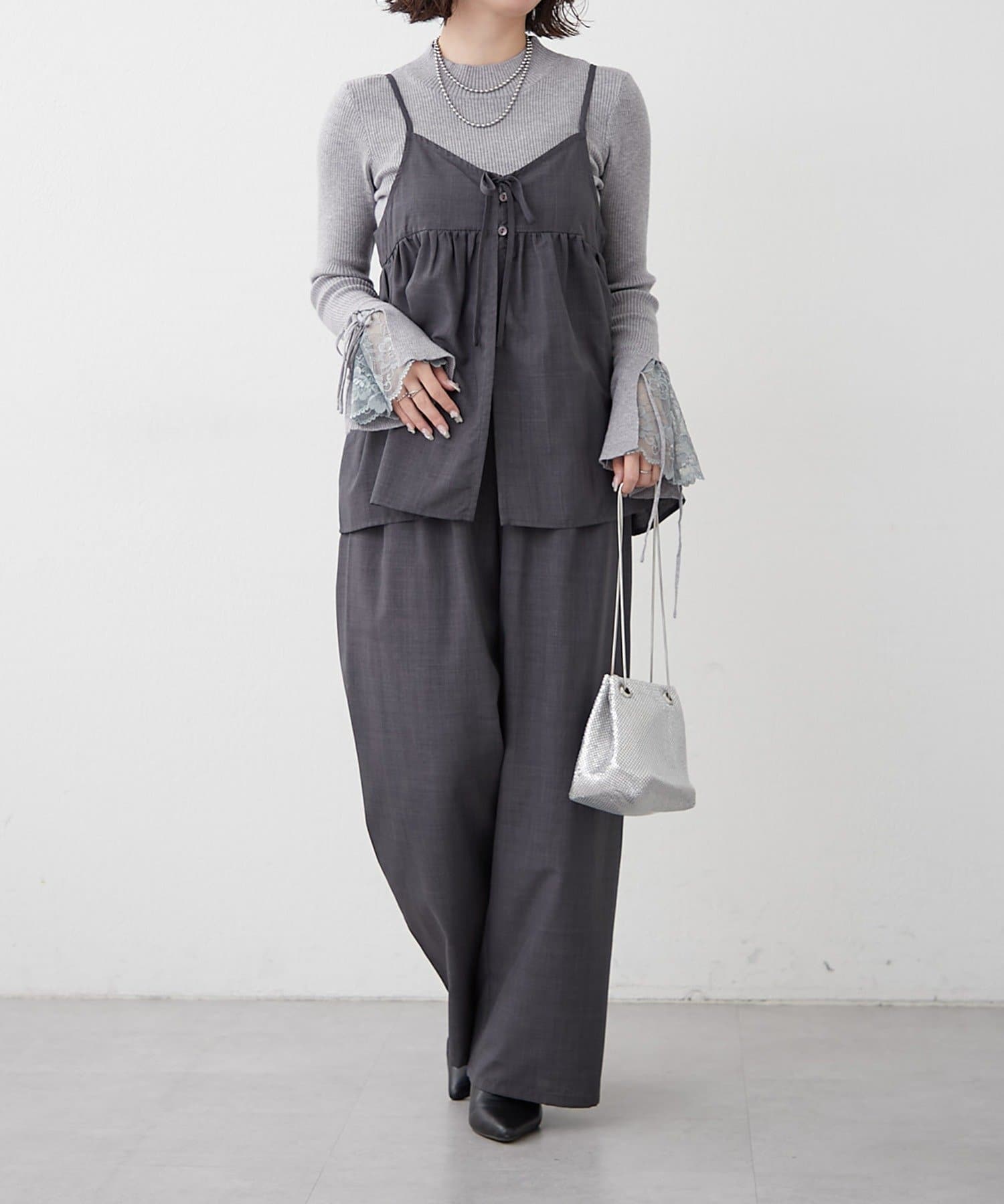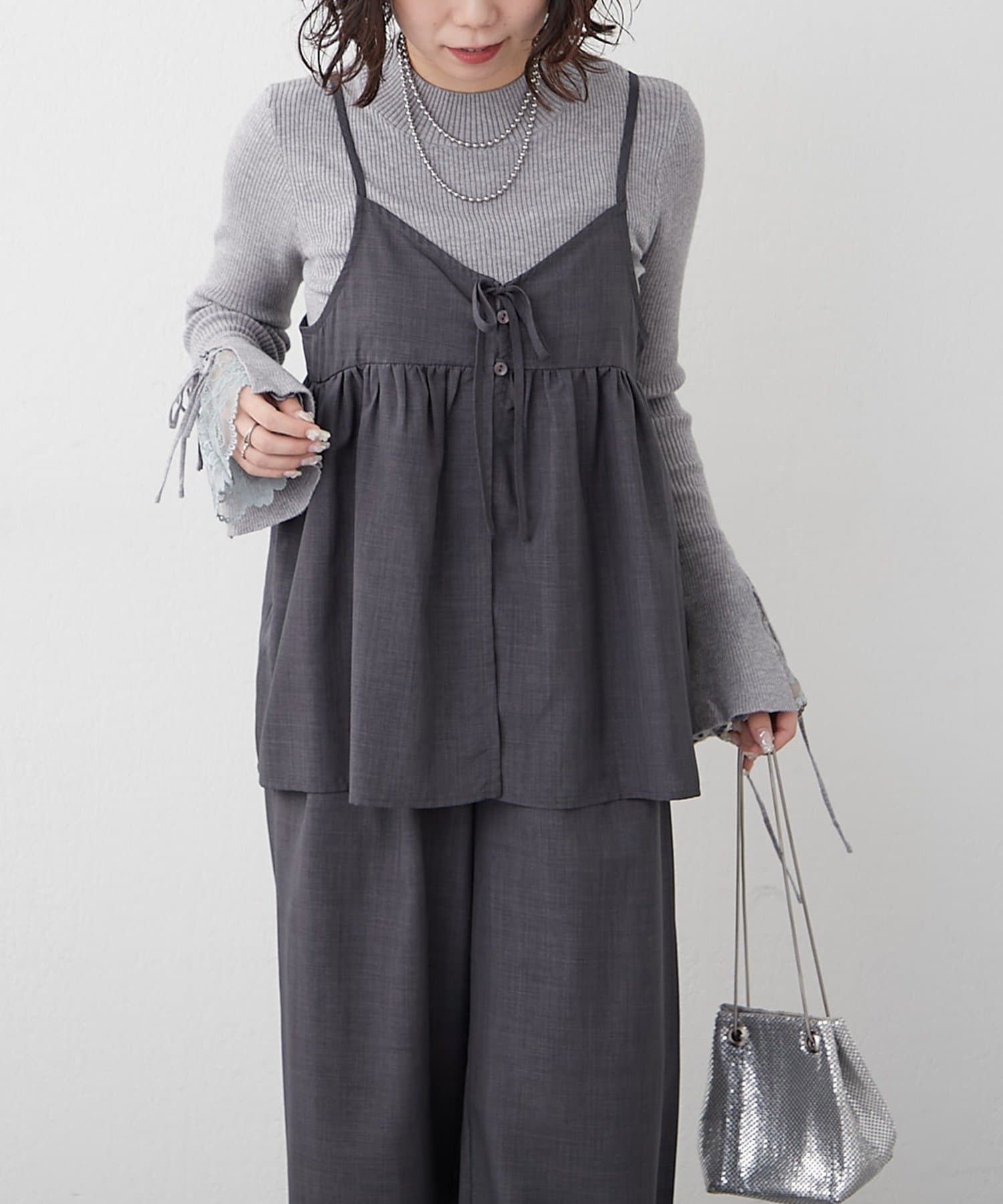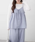 ・前リボンがポイントのキャミチュニックとワイドパンツのセットアップ