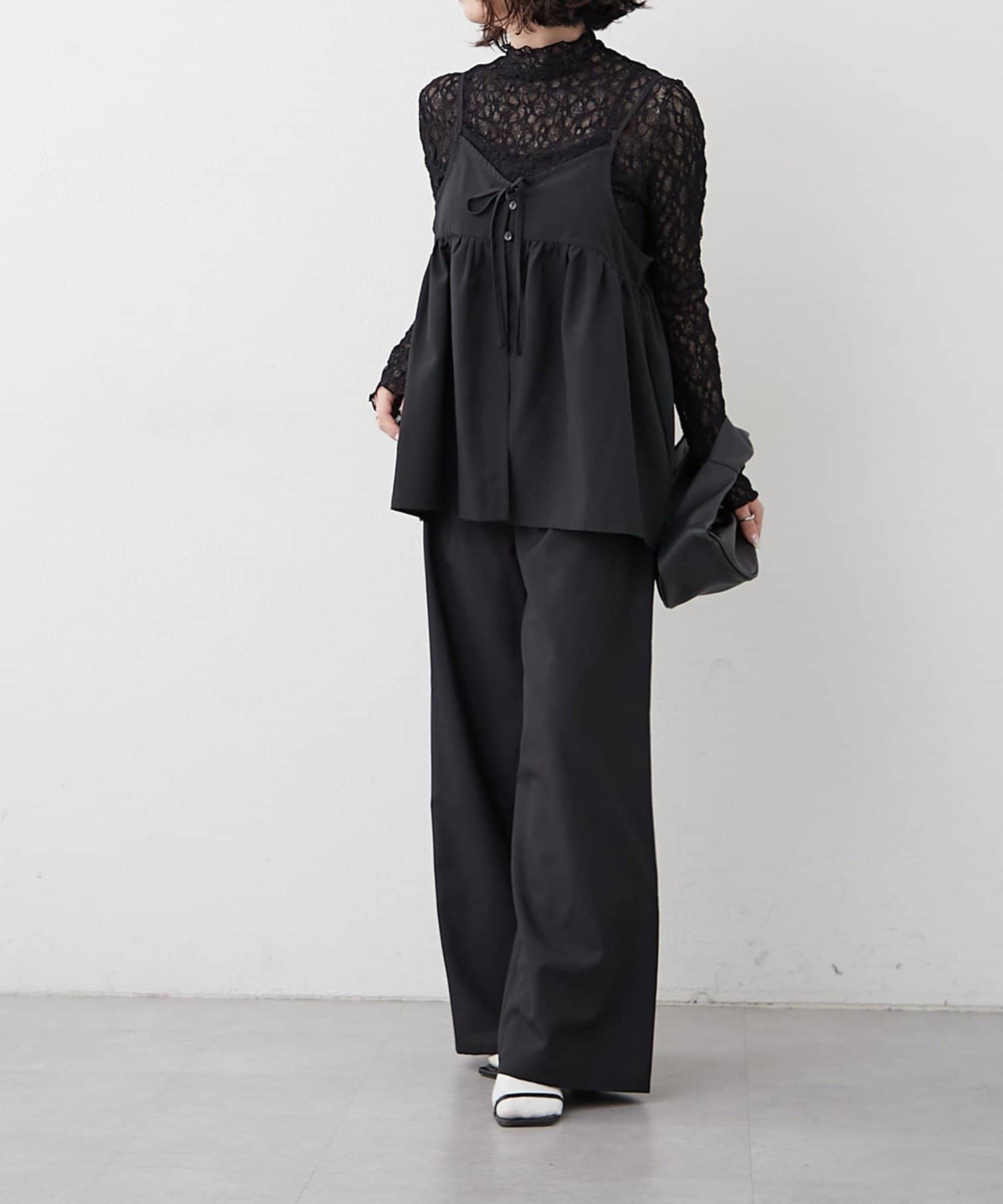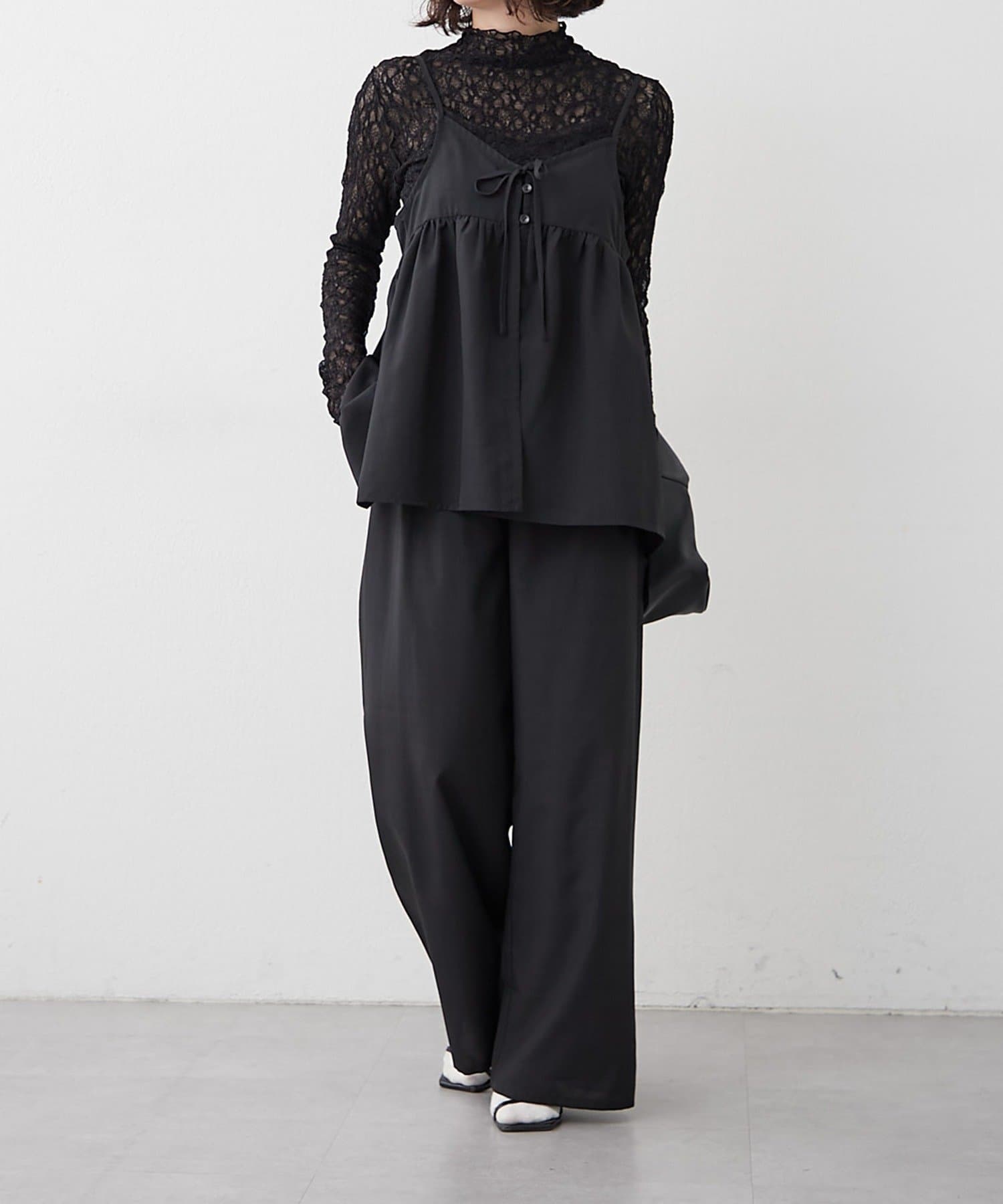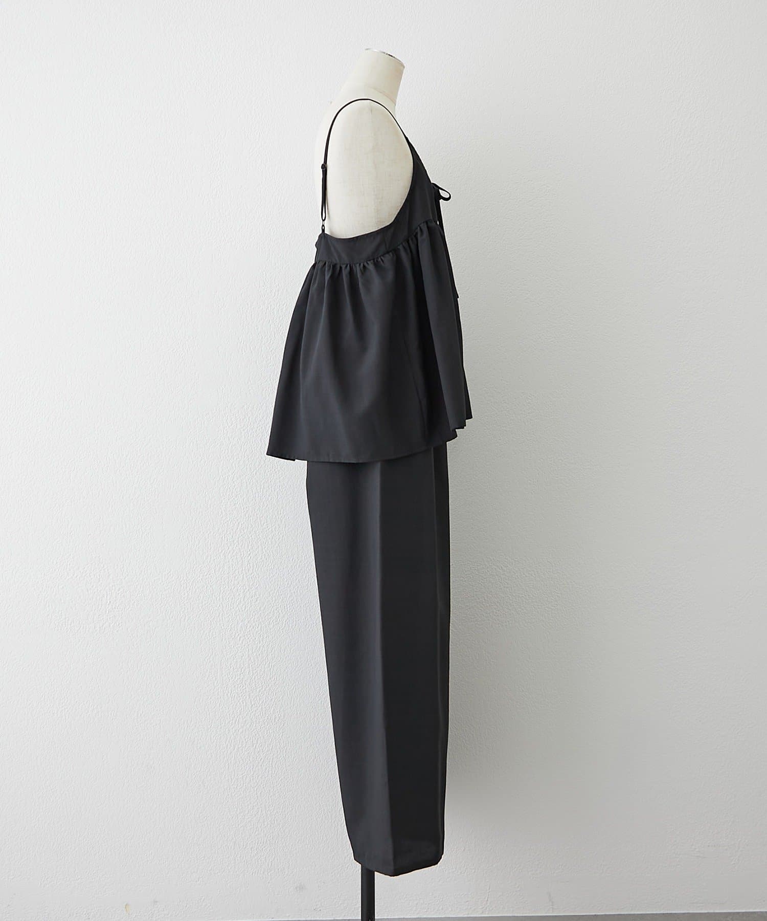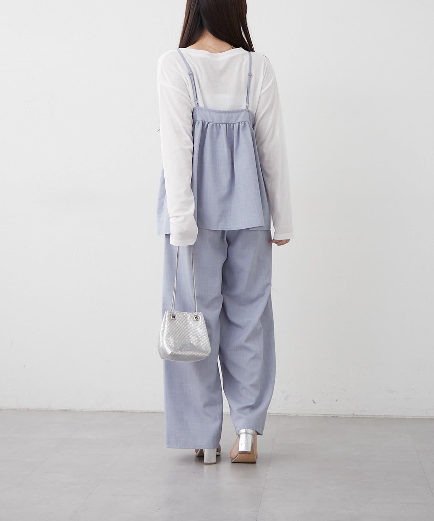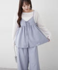 ・前リボンがポイントのキャミチュニックとワイドパンツのセットアップ