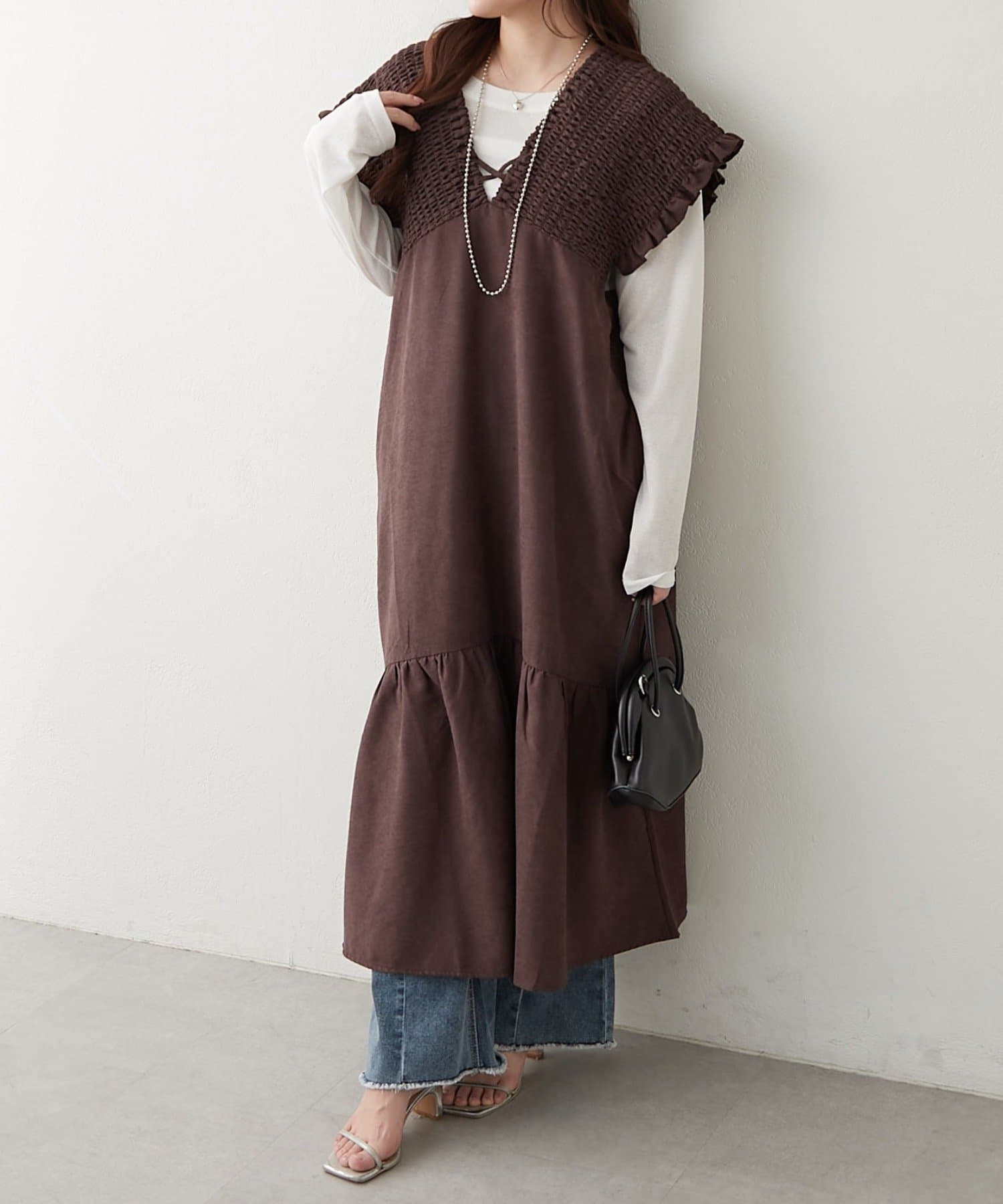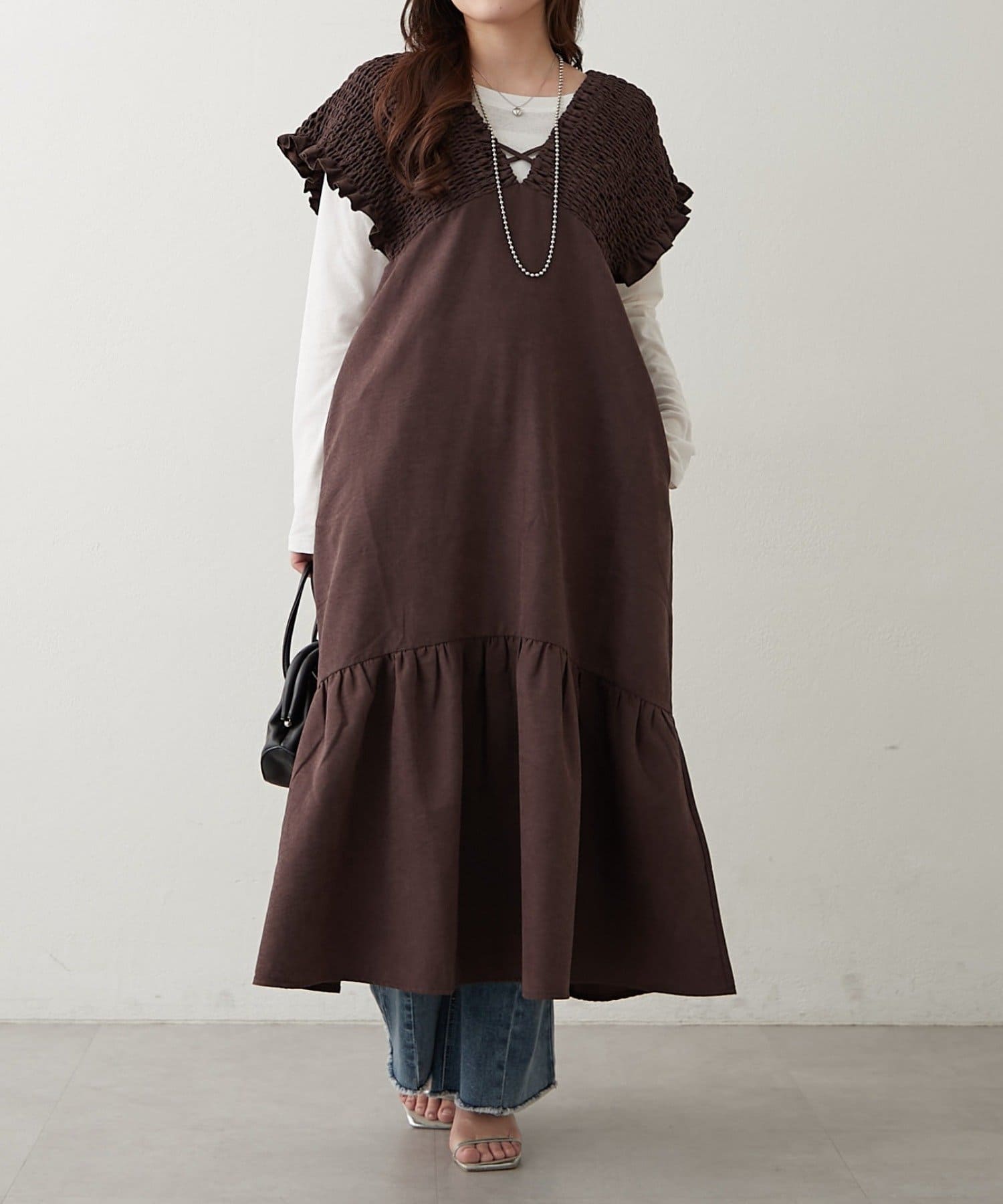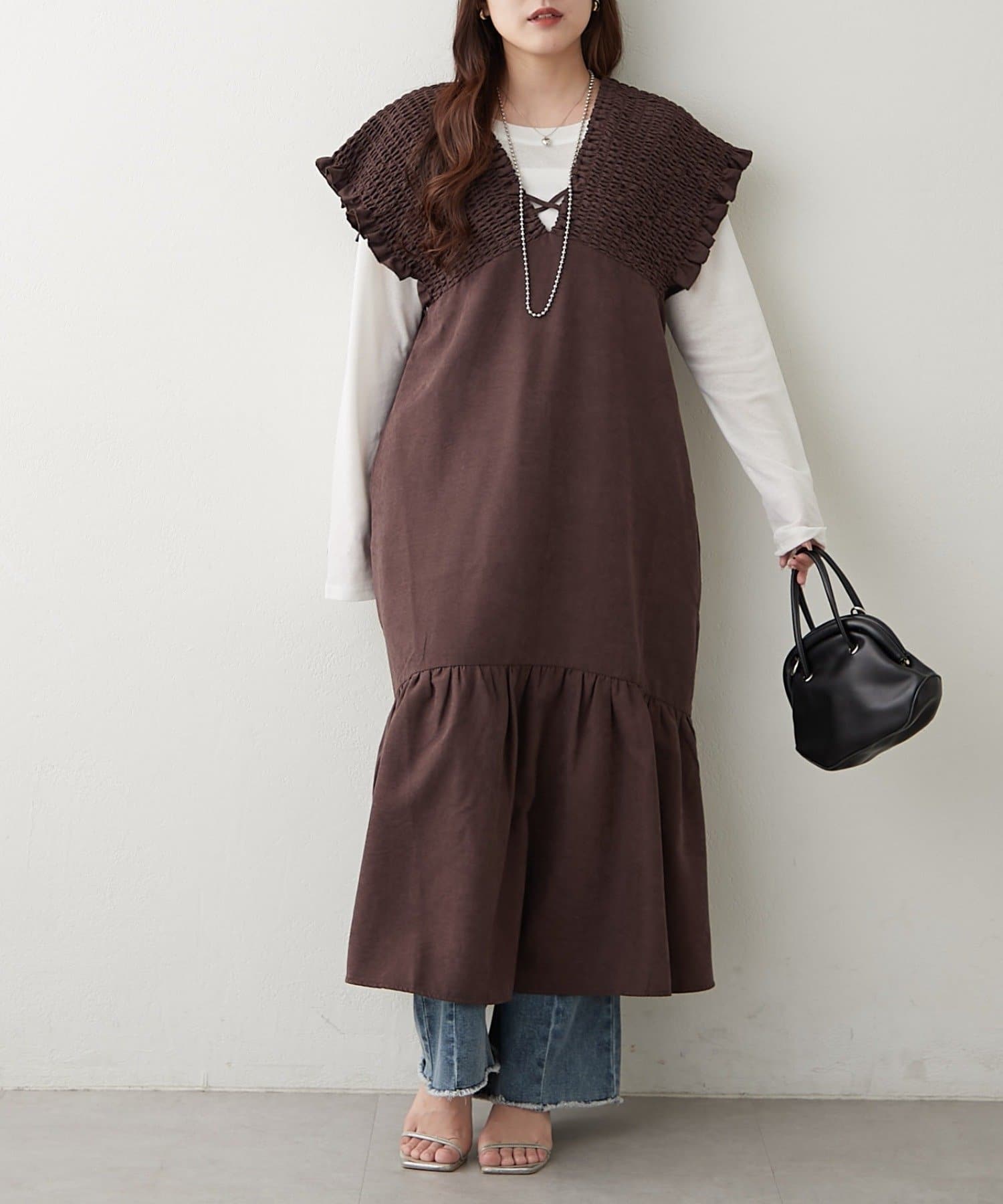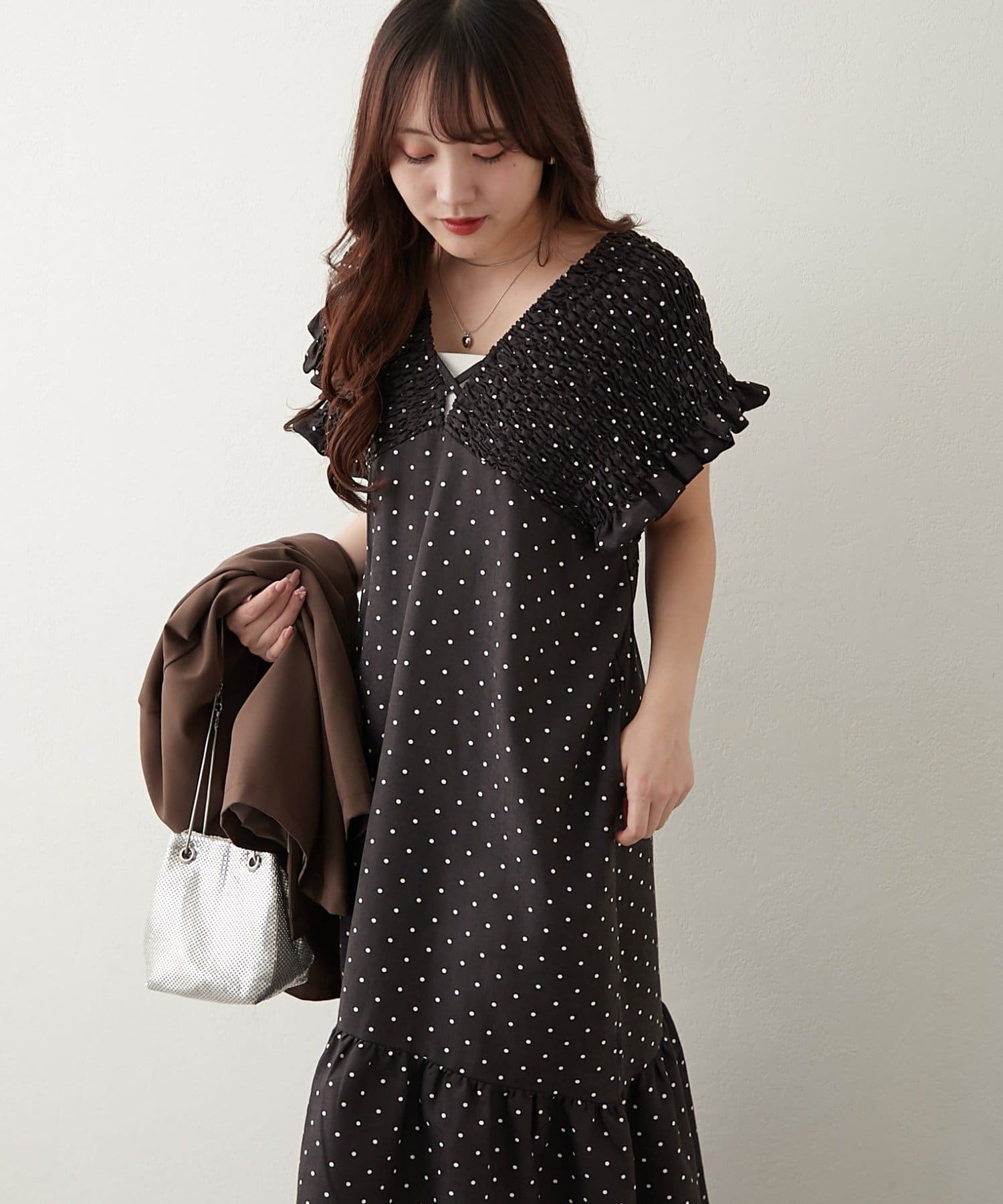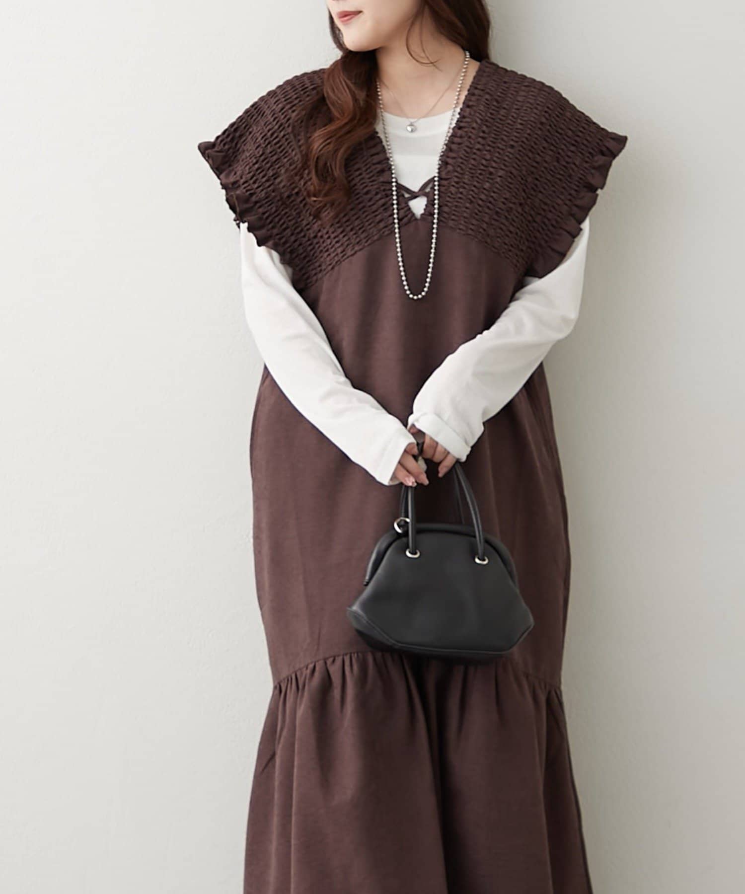 ・胸元が開いたデザインなので、ネックレスで飾るのがマストです