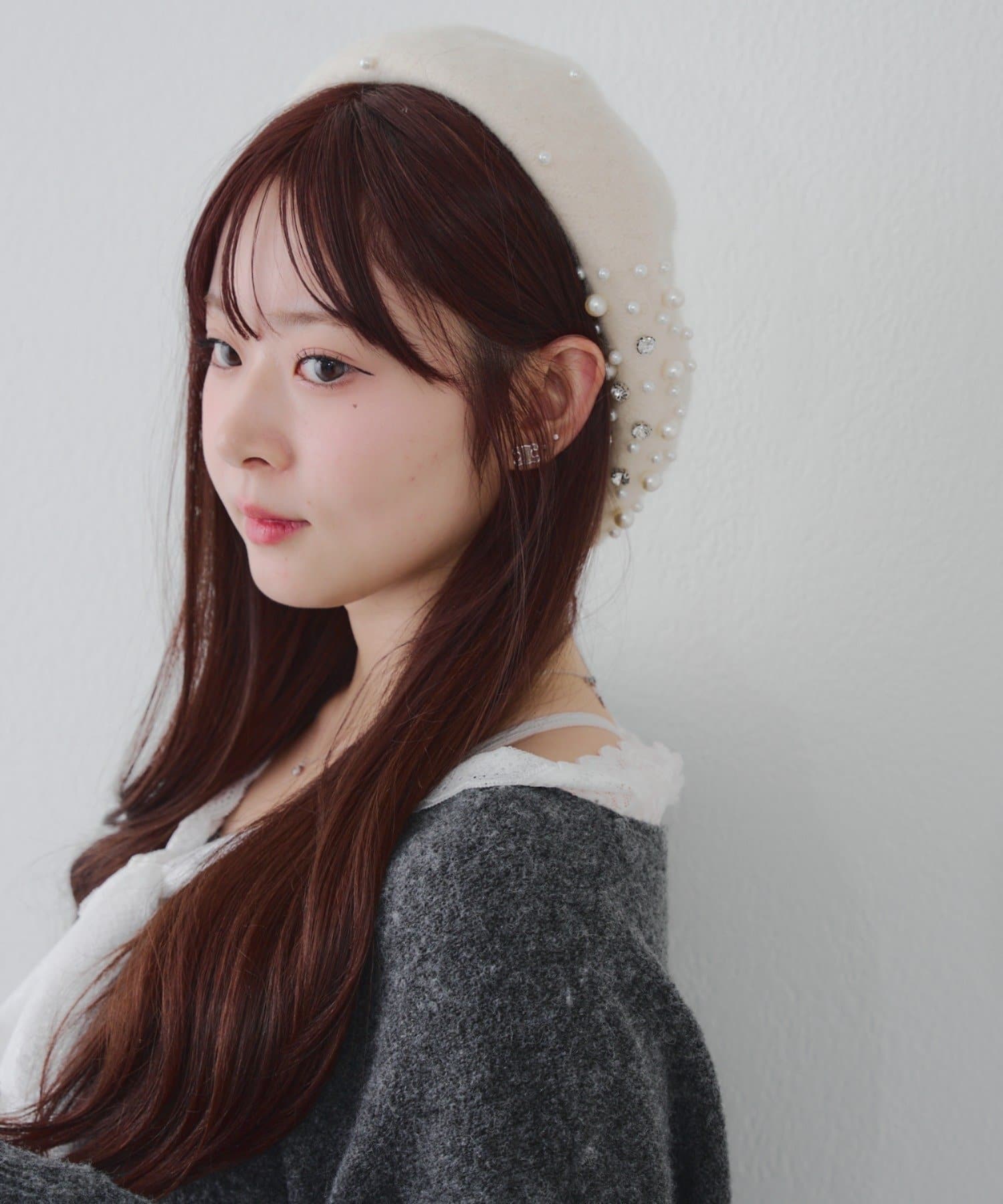 ・きらきらビジューとパールの装飾が可愛いベレー帽。