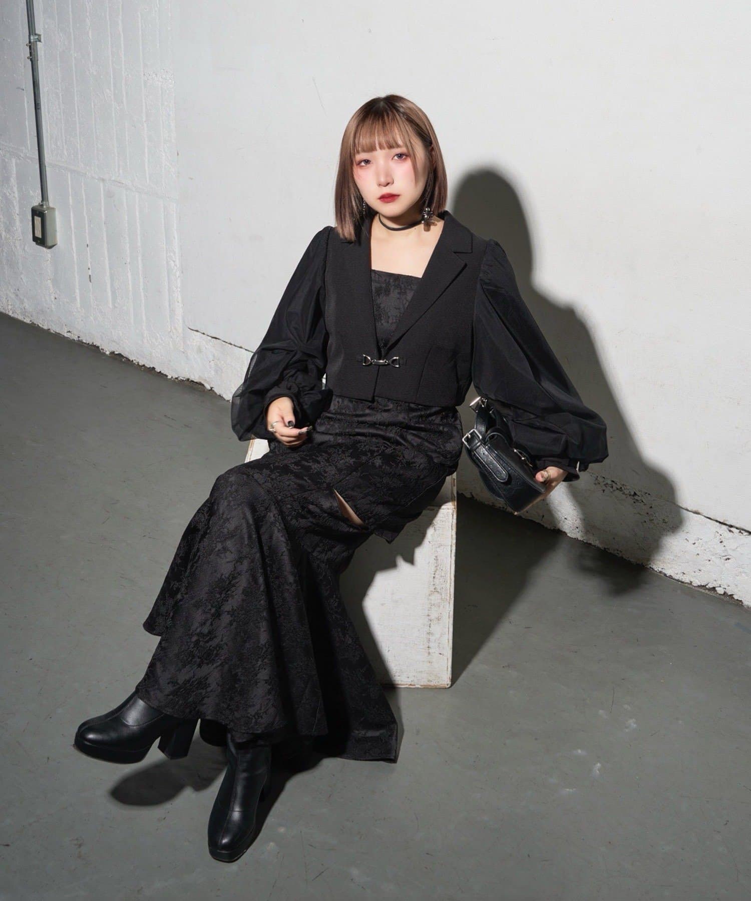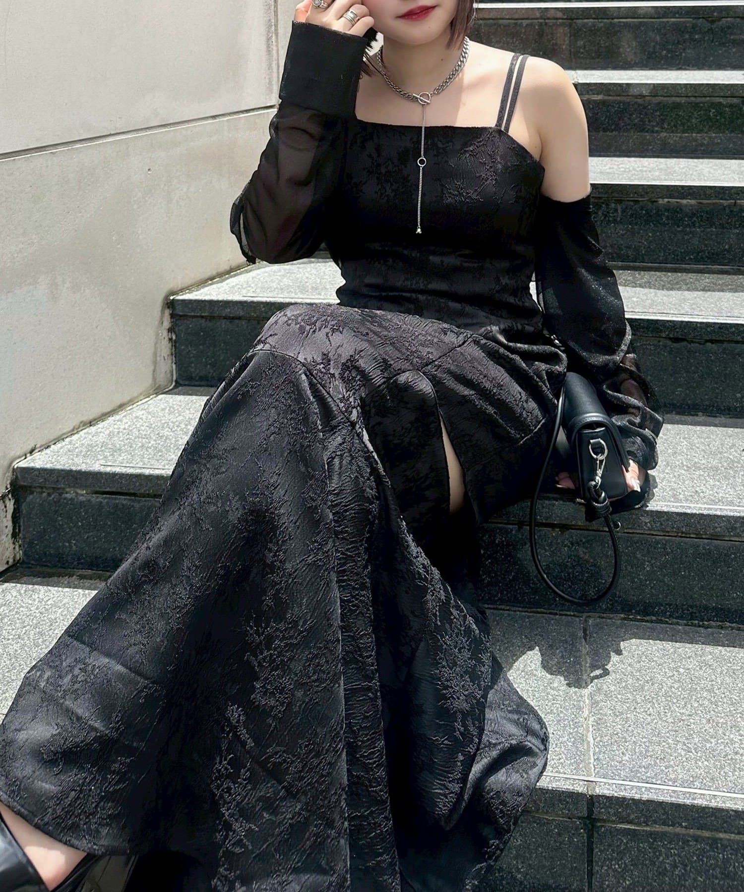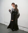スカートの両脇に横スリットをいれ、さりげなく肌見せできます。
