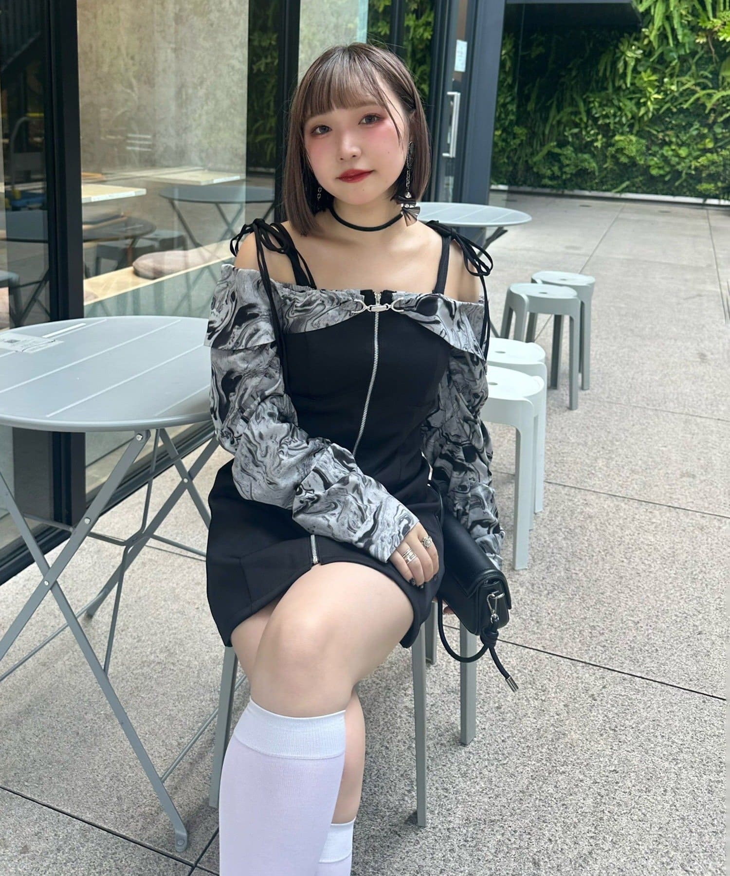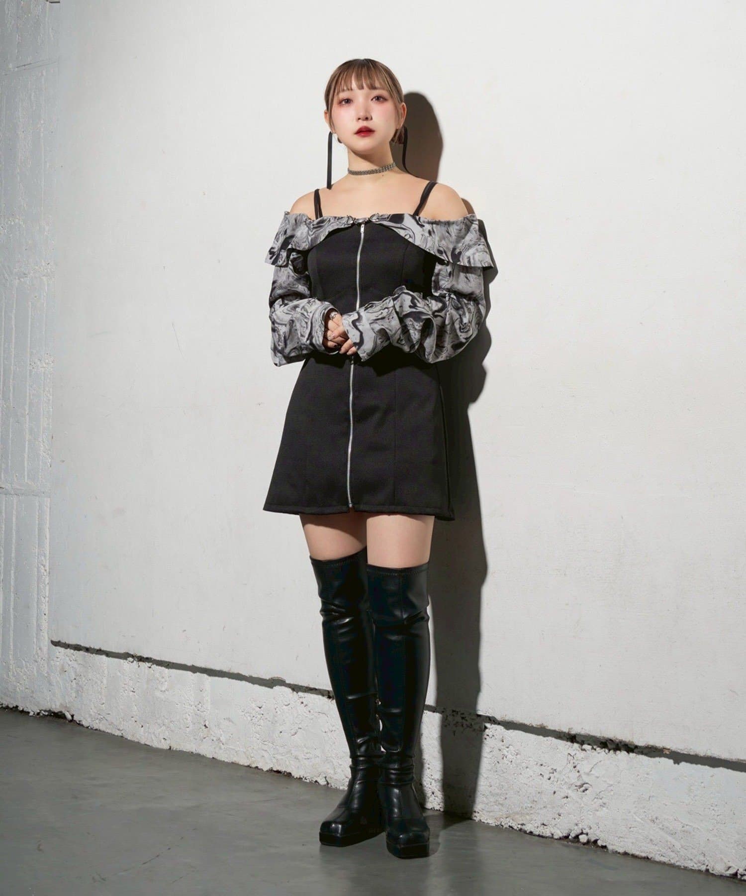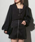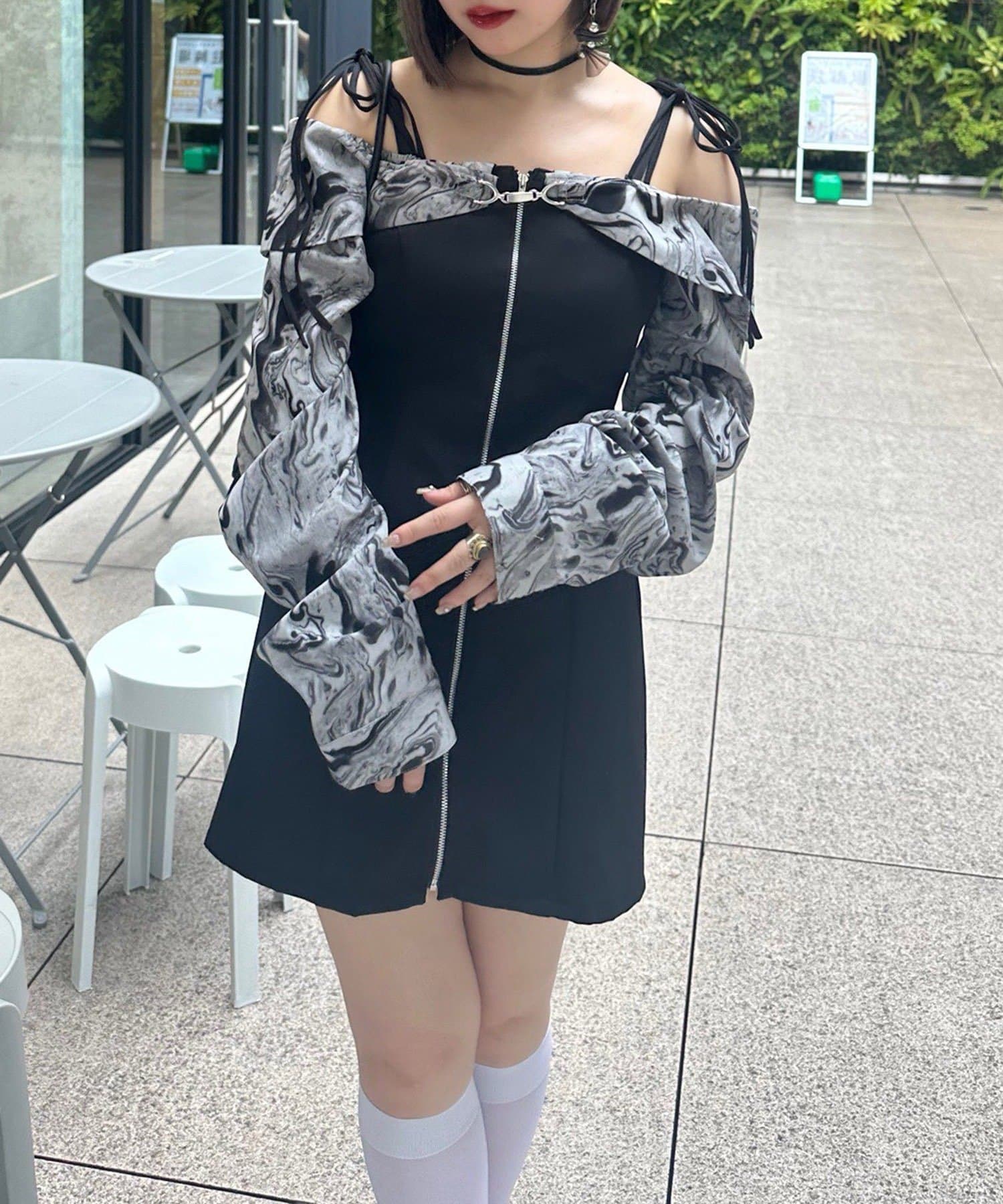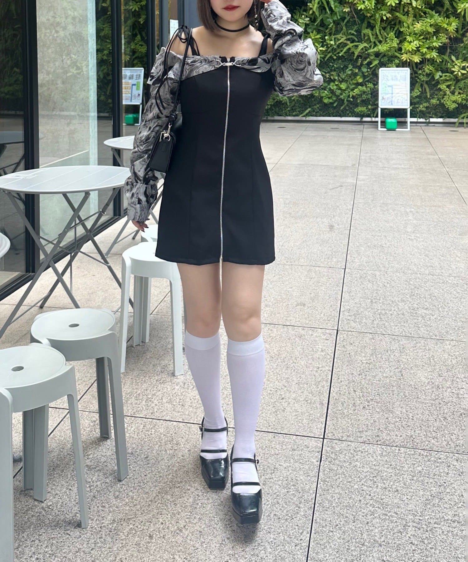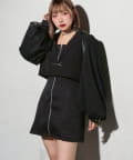 ボレロのオフショルデザインとお袖のギャザーデザインで甘さを出しつつ、ワンピースのフロントジップでスタイリッシュさもプラス。