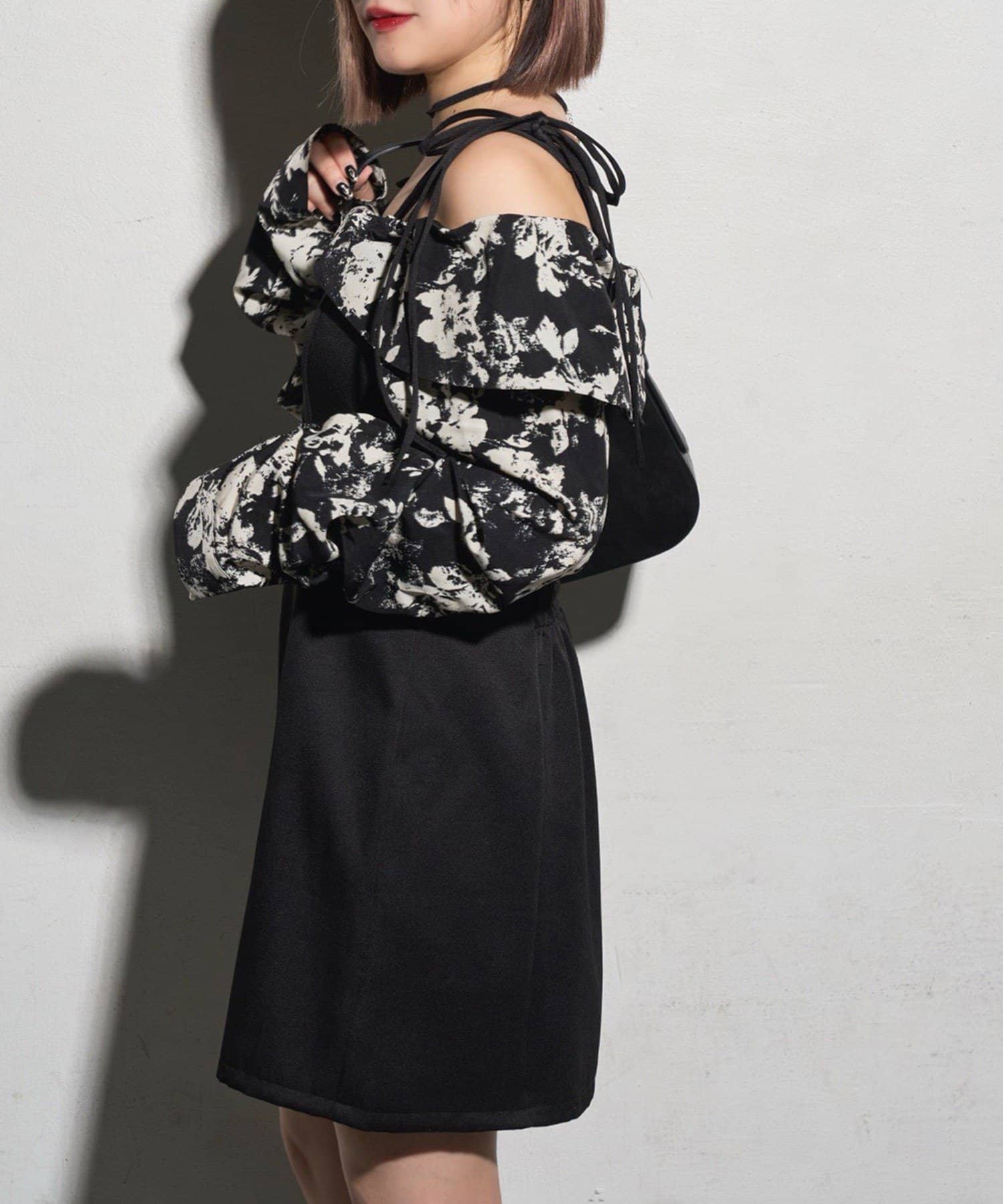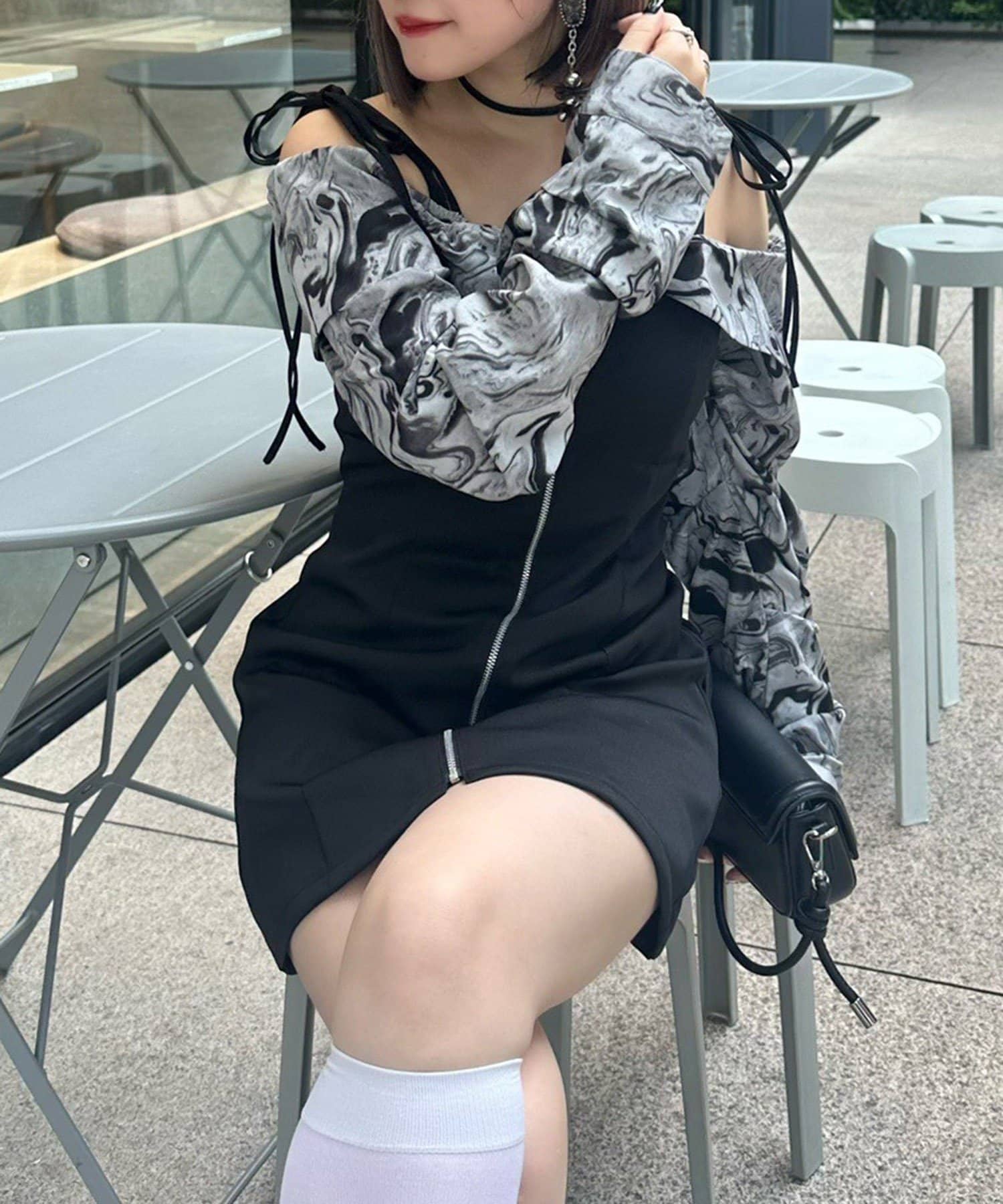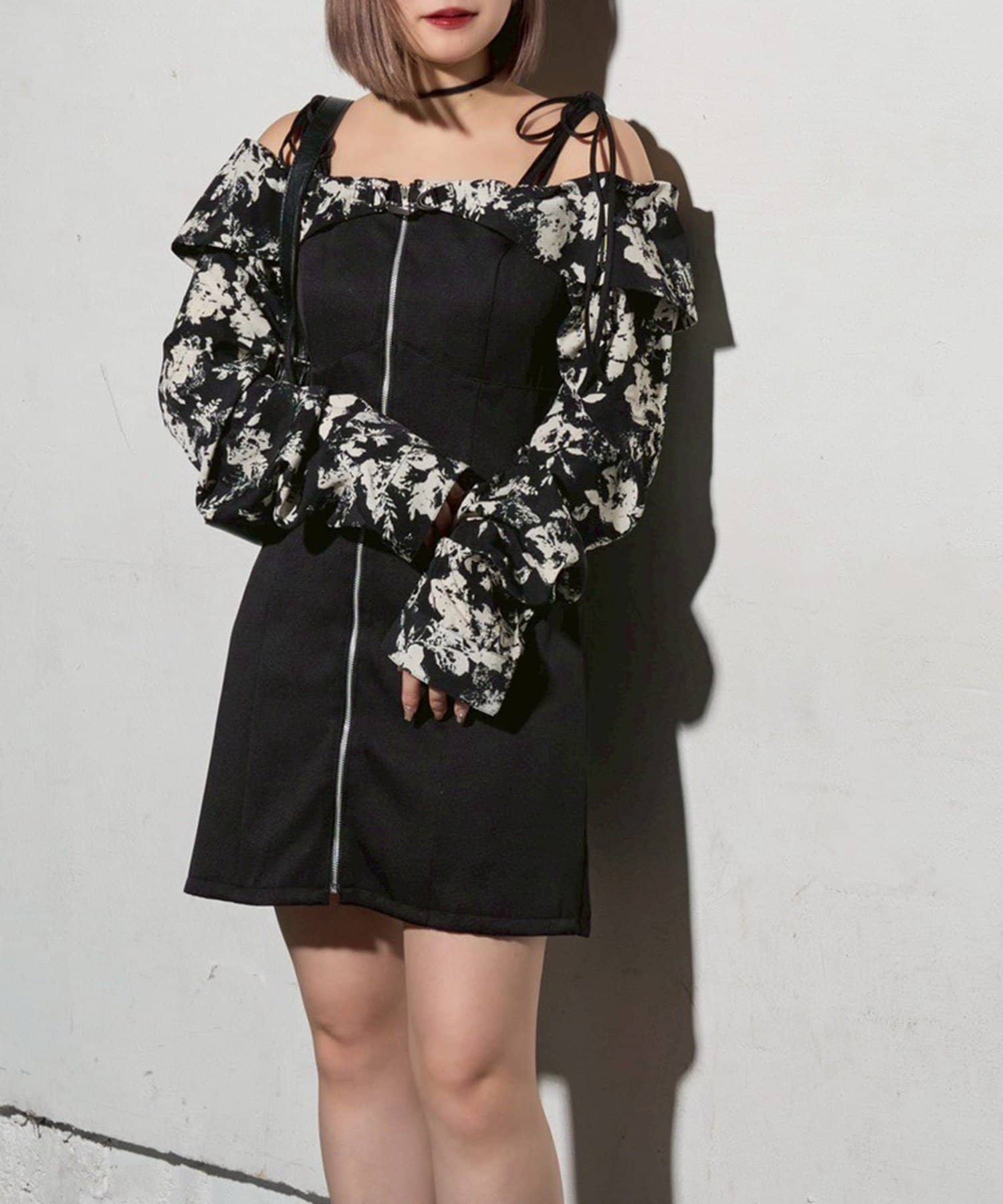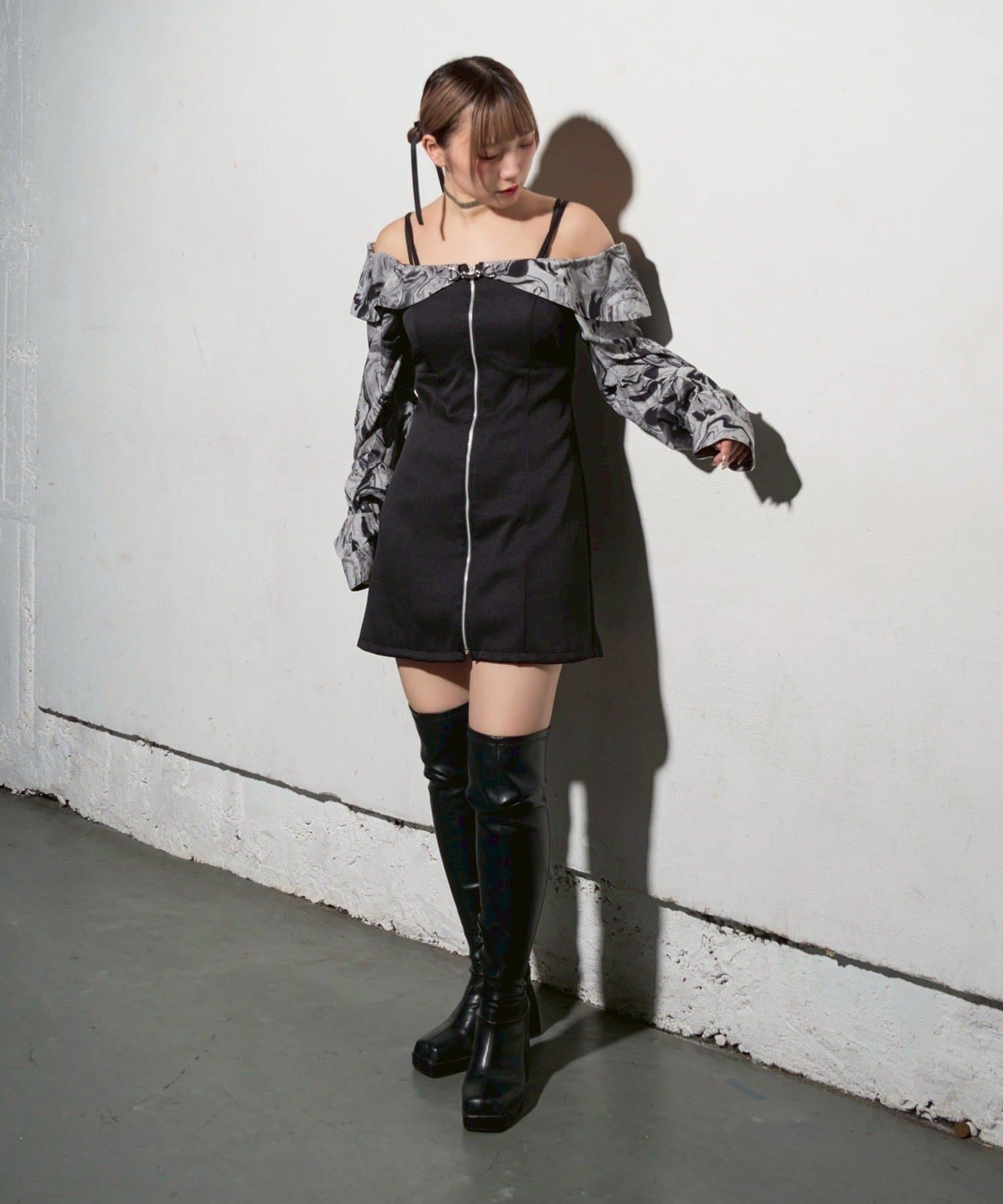 ボレロのオフショルデザインとお袖のギャザーデザインで甘さを出しつつ、ワンピースのフロントジップでスタイリッシュさもプラス。