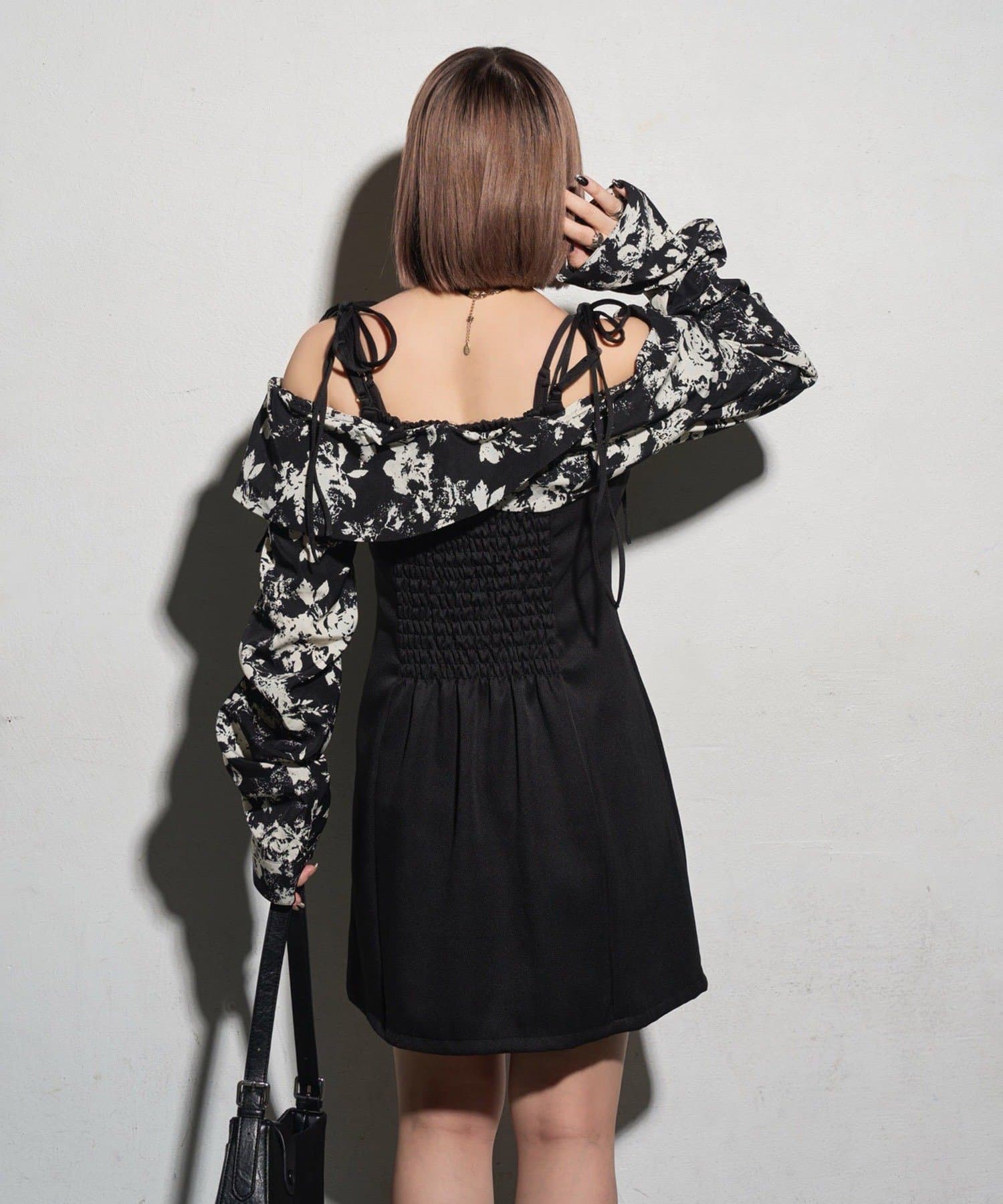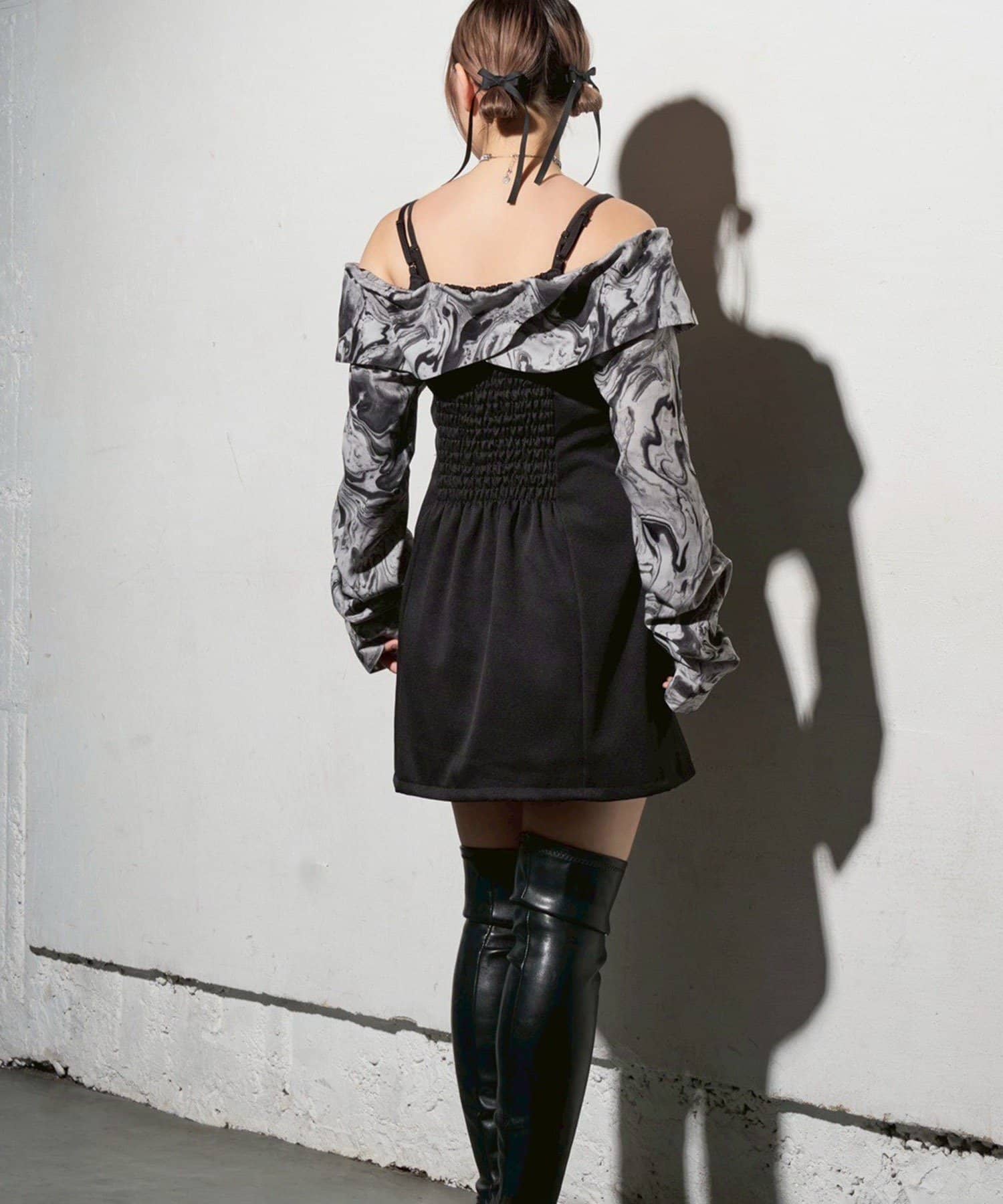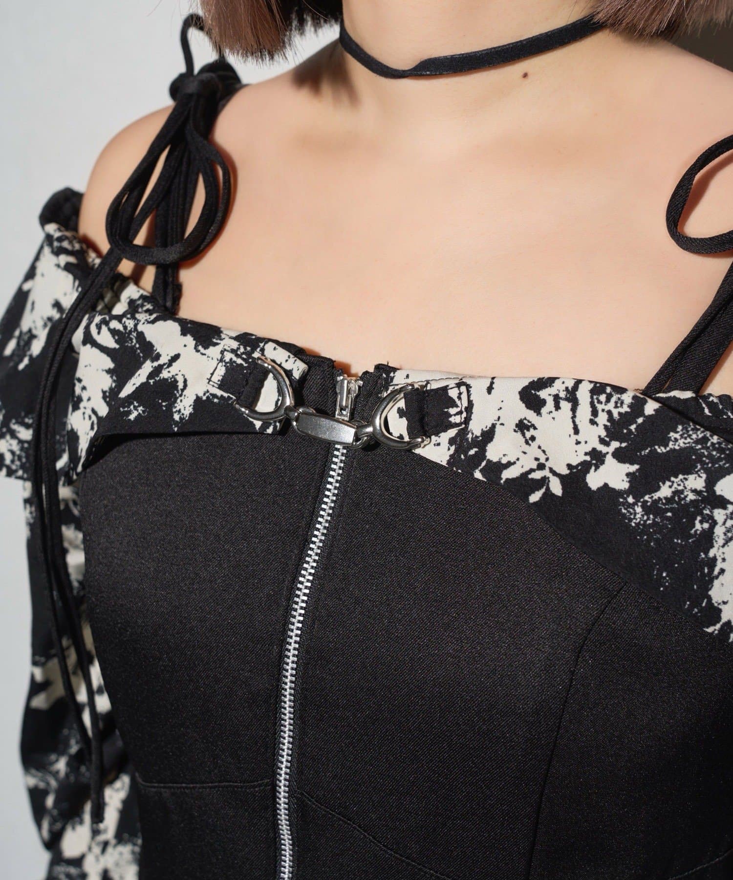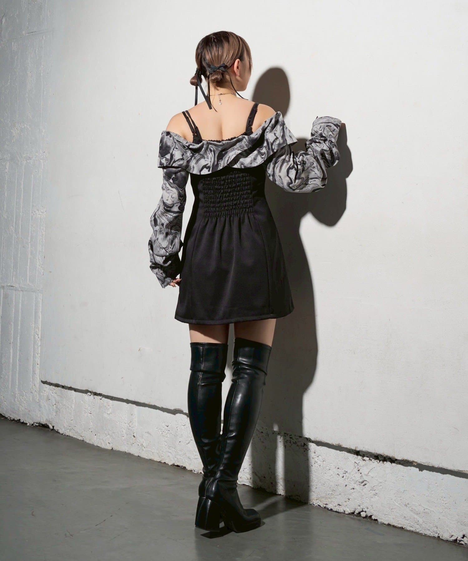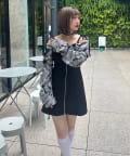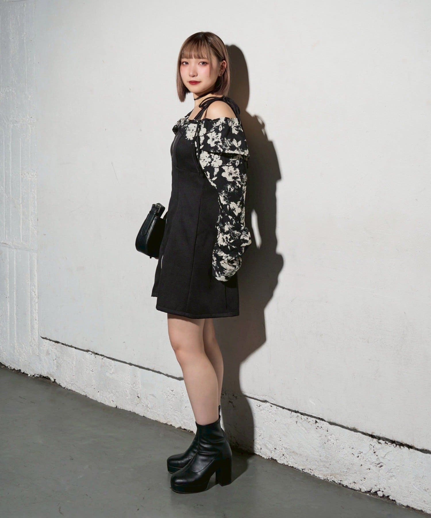 ボレロのオフショルデザインとお袖のギャザーデザインで甘さを出しつつ、ワンピースのフロントジップでスタイリッシュさもプラス。