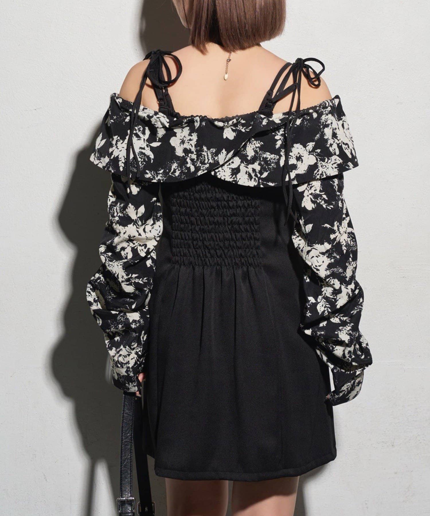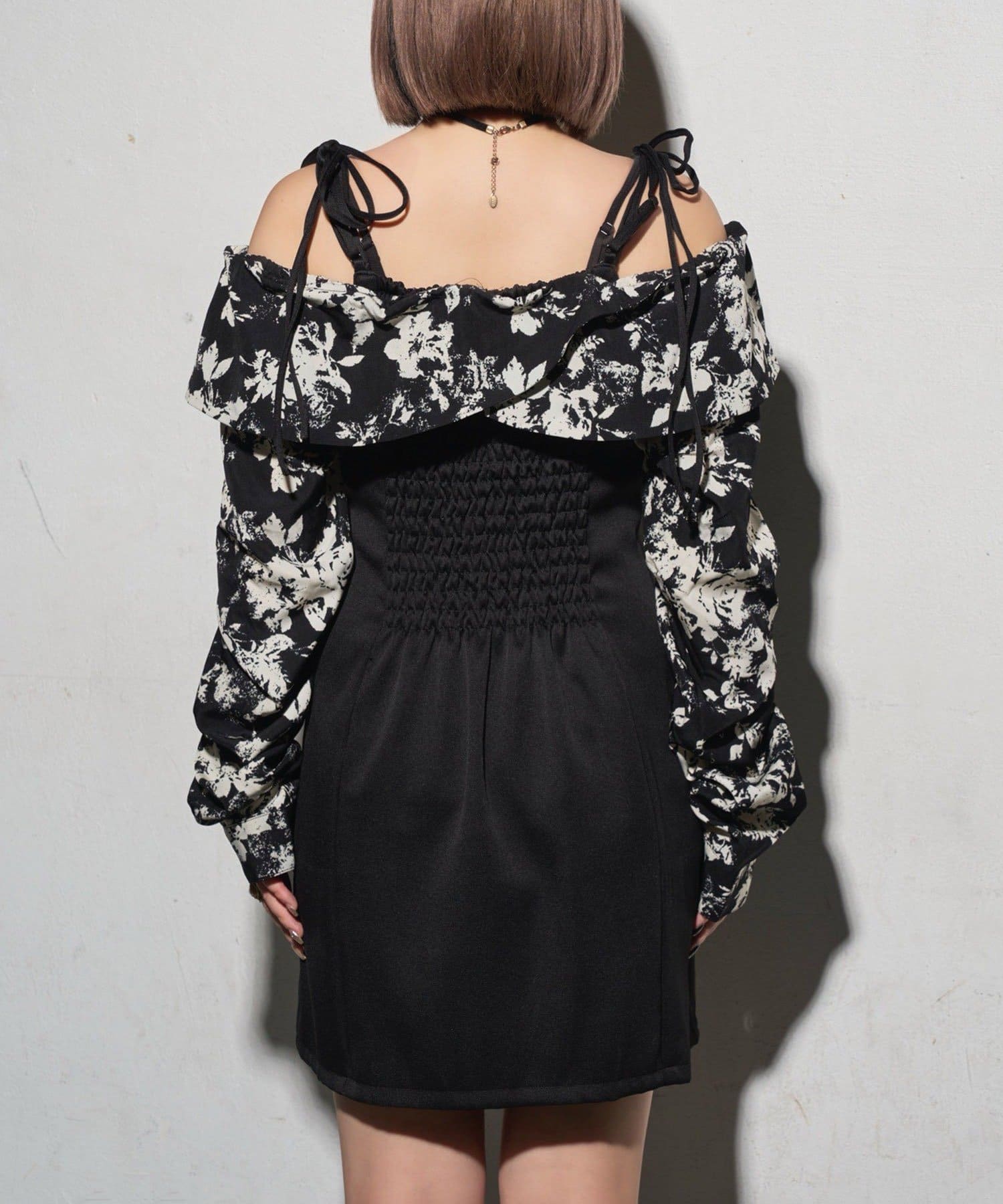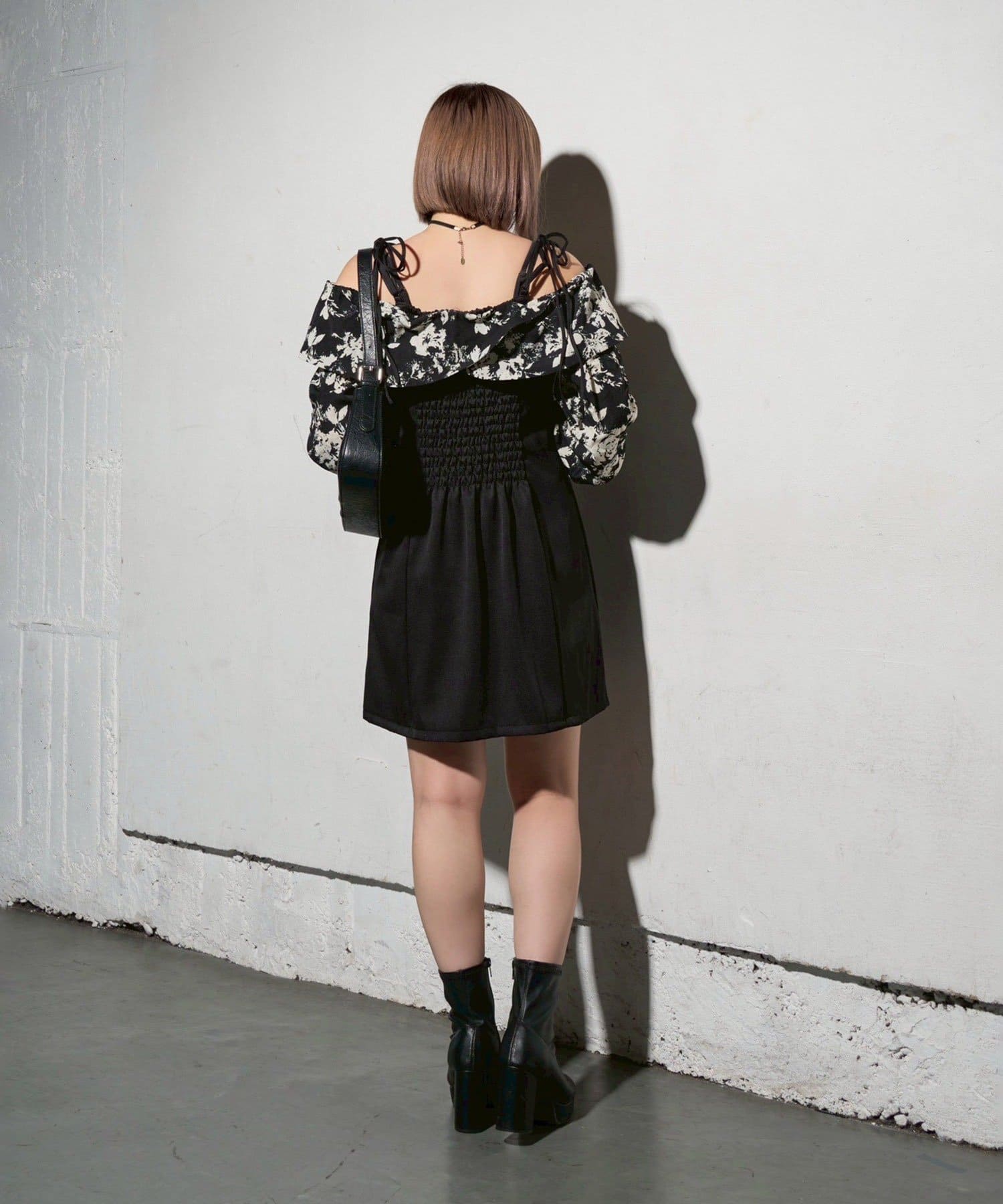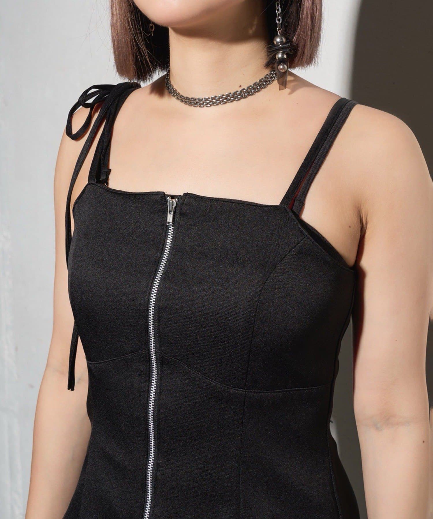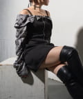 ボレロのオフショルデザインとお袖のギャザーデザインで甘さを出しつつ、ワンピースのフロントジップでスタイリッシュさもプラス。