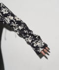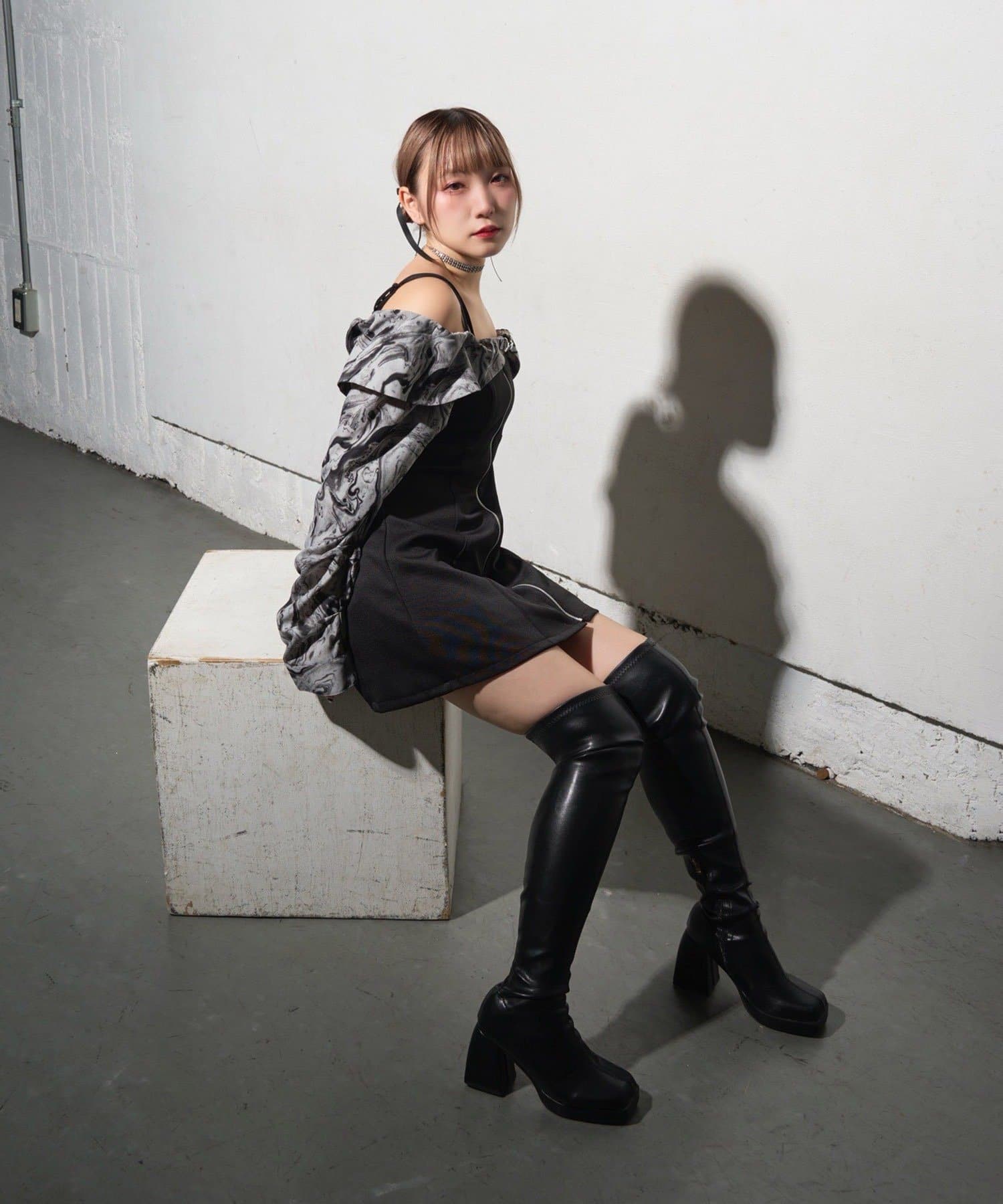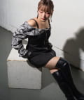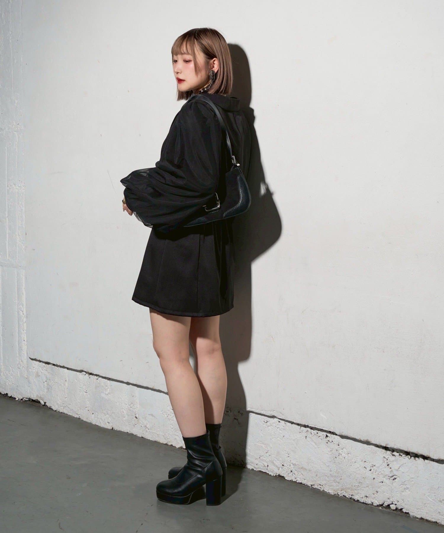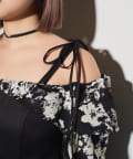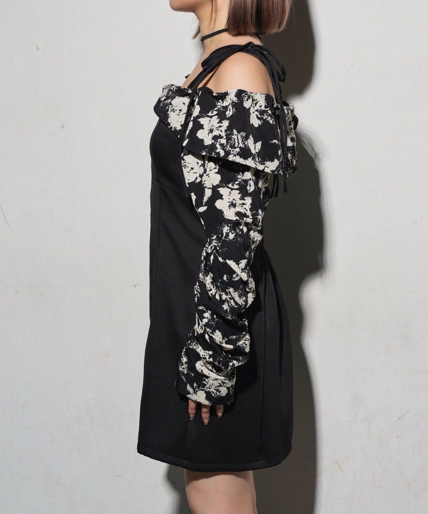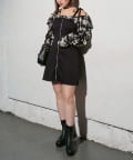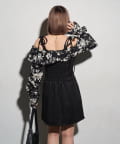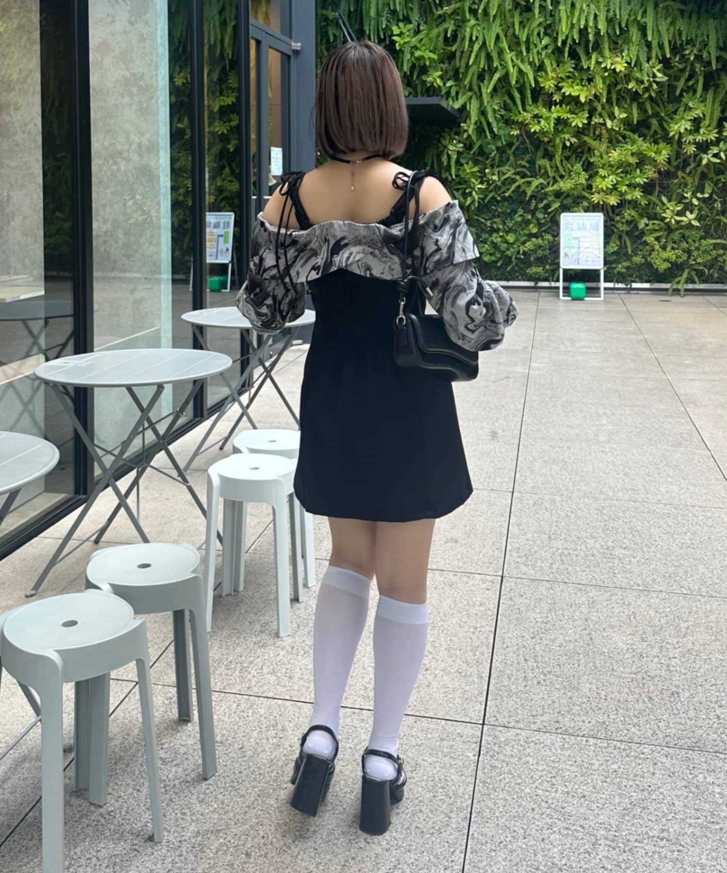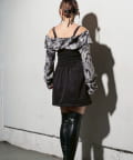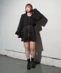 ボレロのオフショルデザインとお袖のギャザーデザインで甘さを出しつつ、ワンピースのフロントジップでスタイリッシュさもプラス。