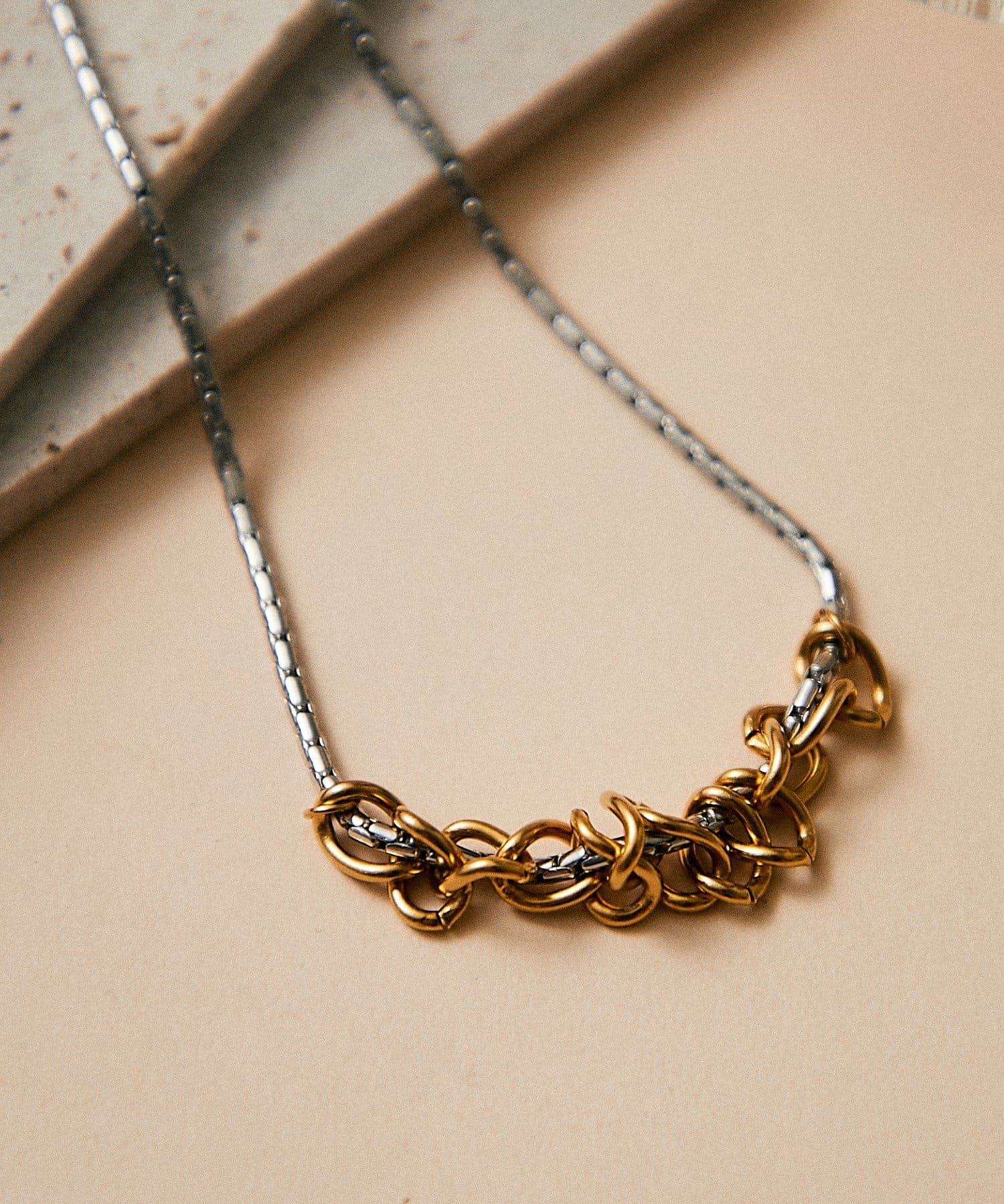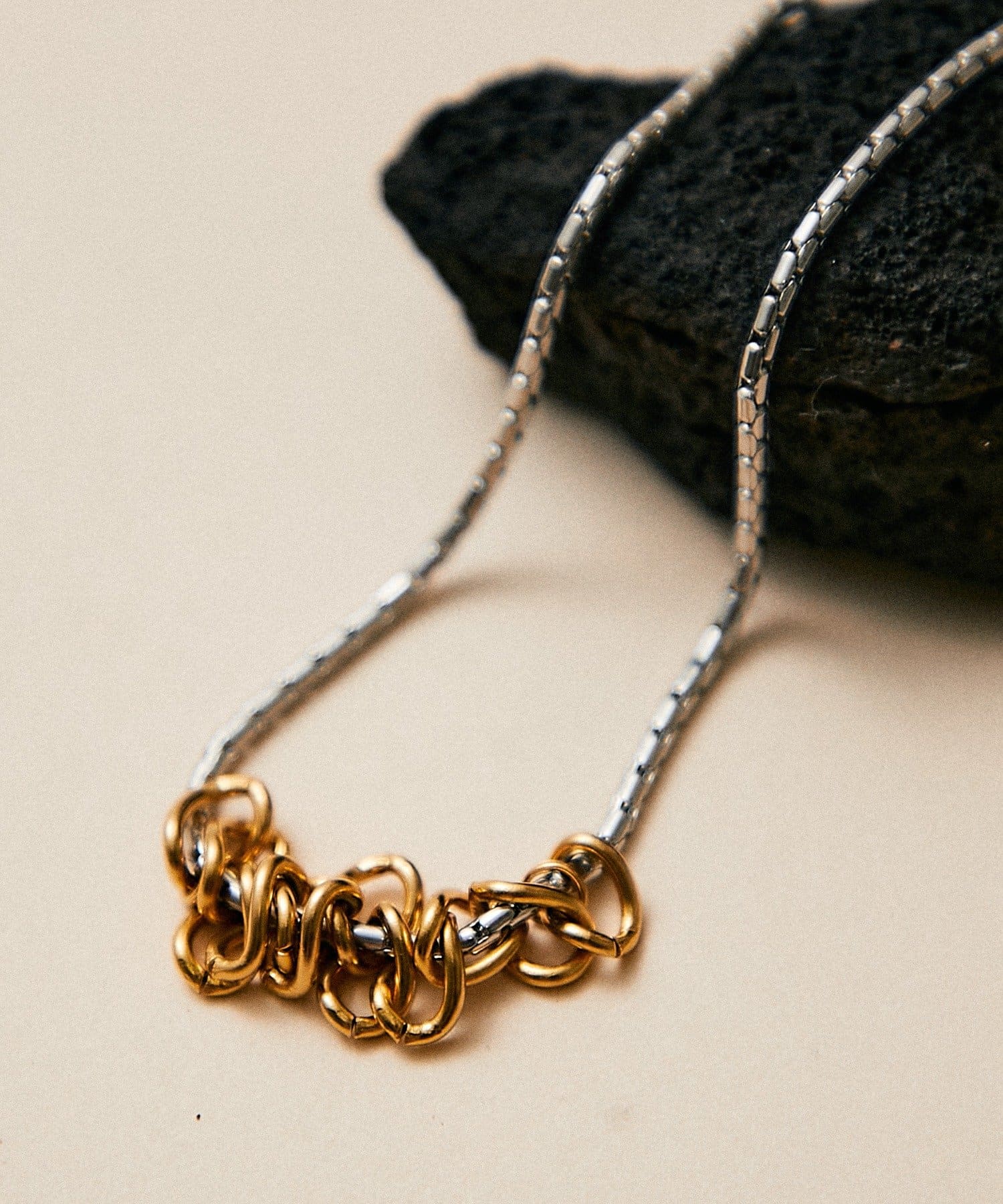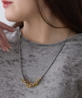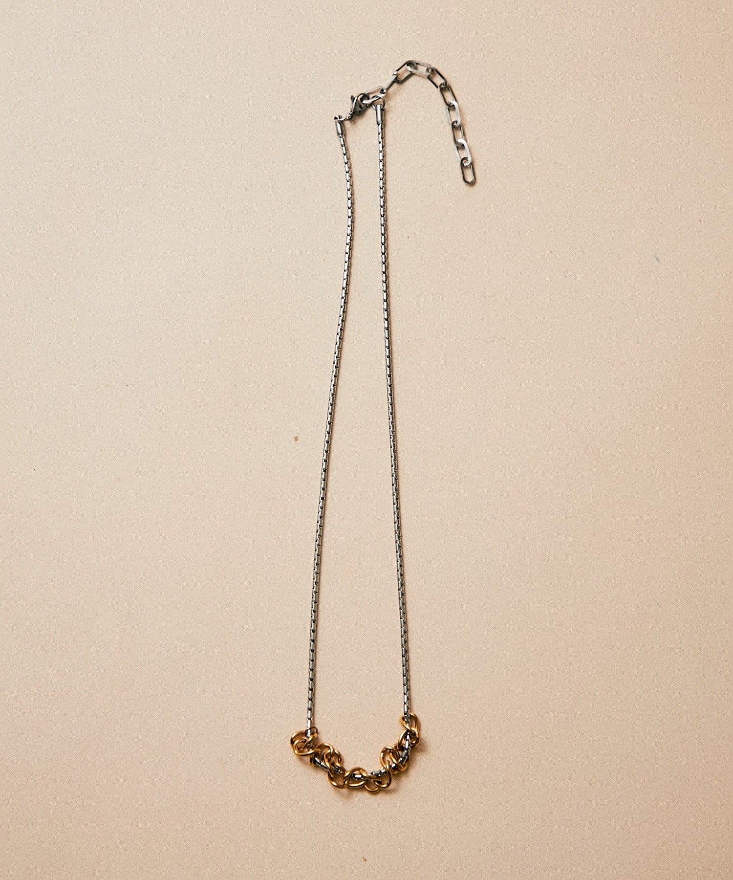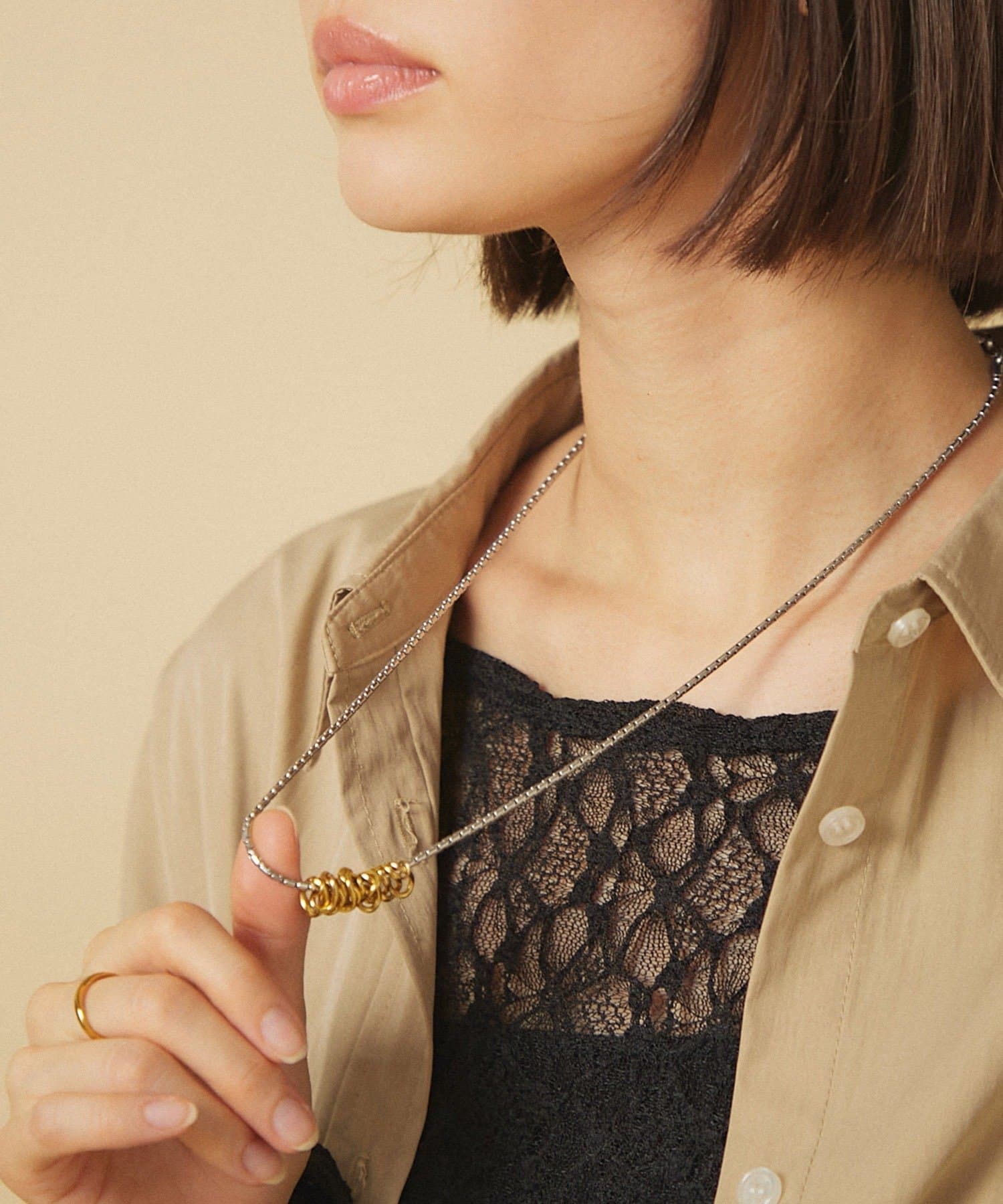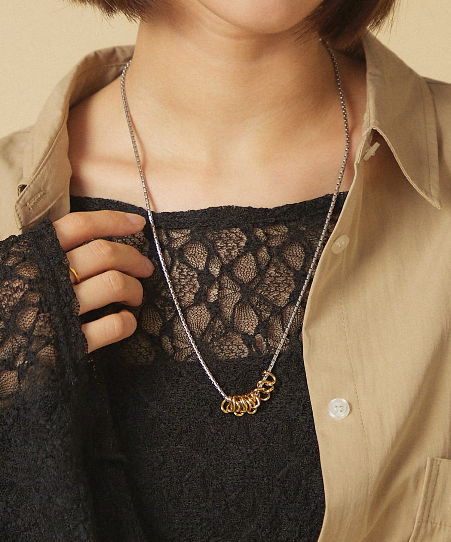 ・シルバーのチェーンにゴールドのサークルパーツが連なったデザインがポイント